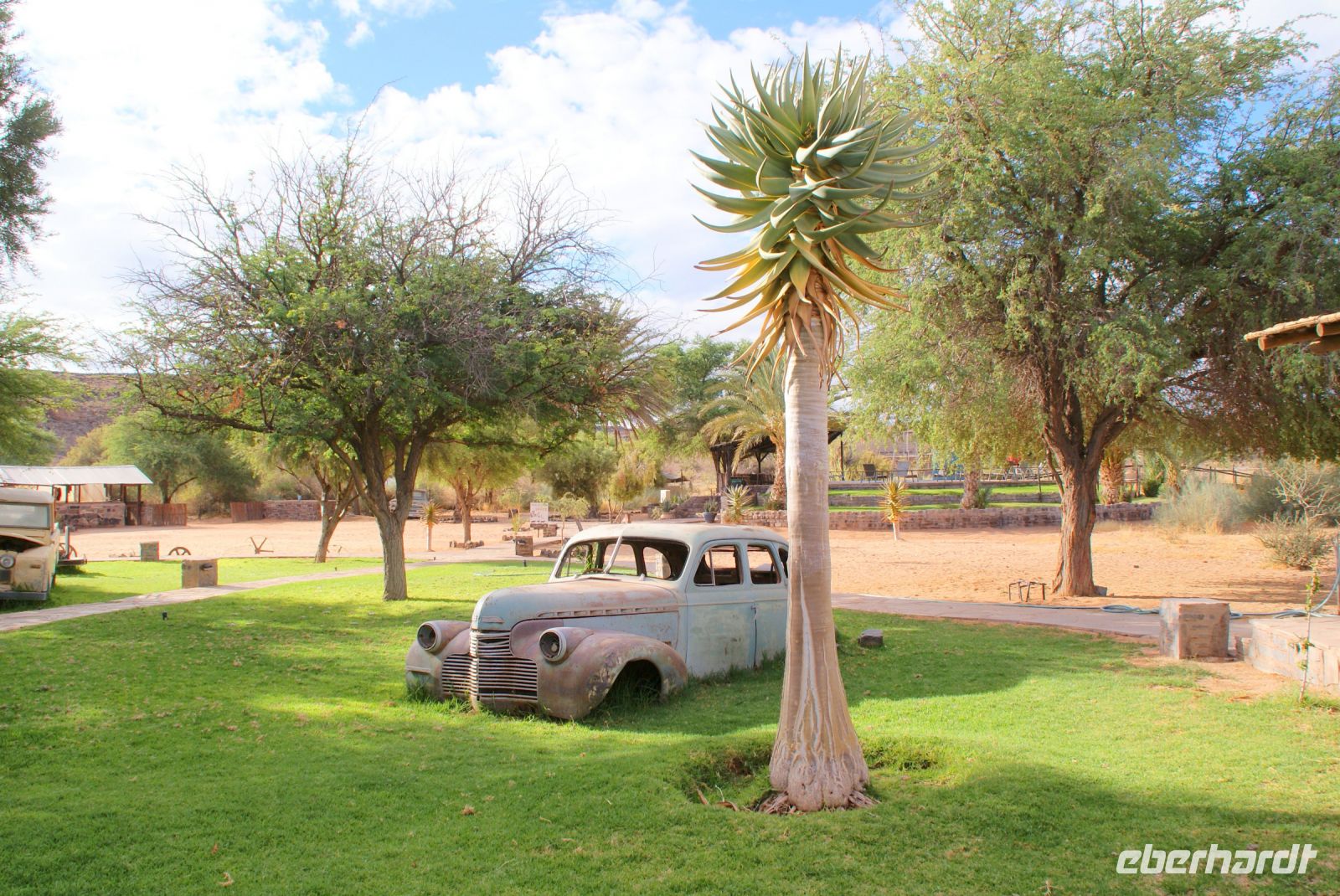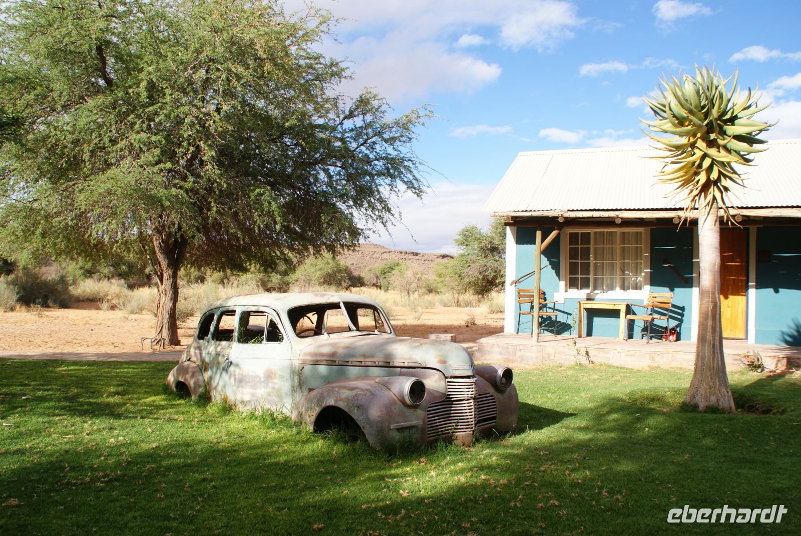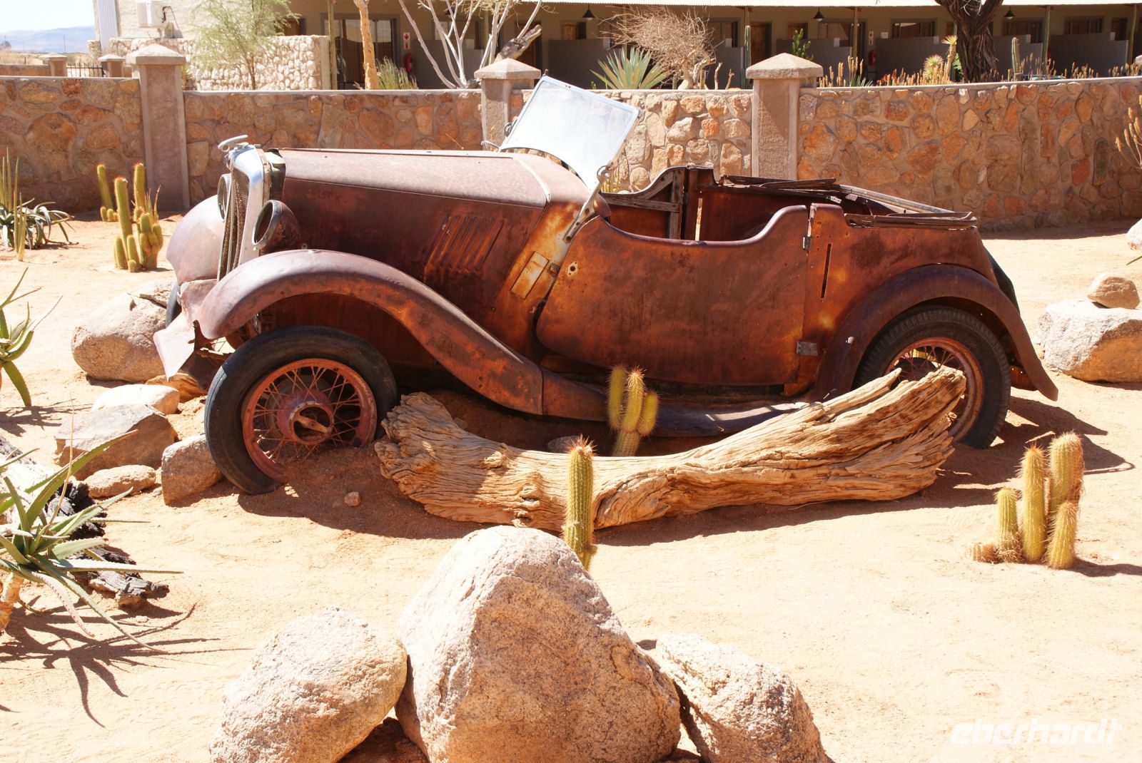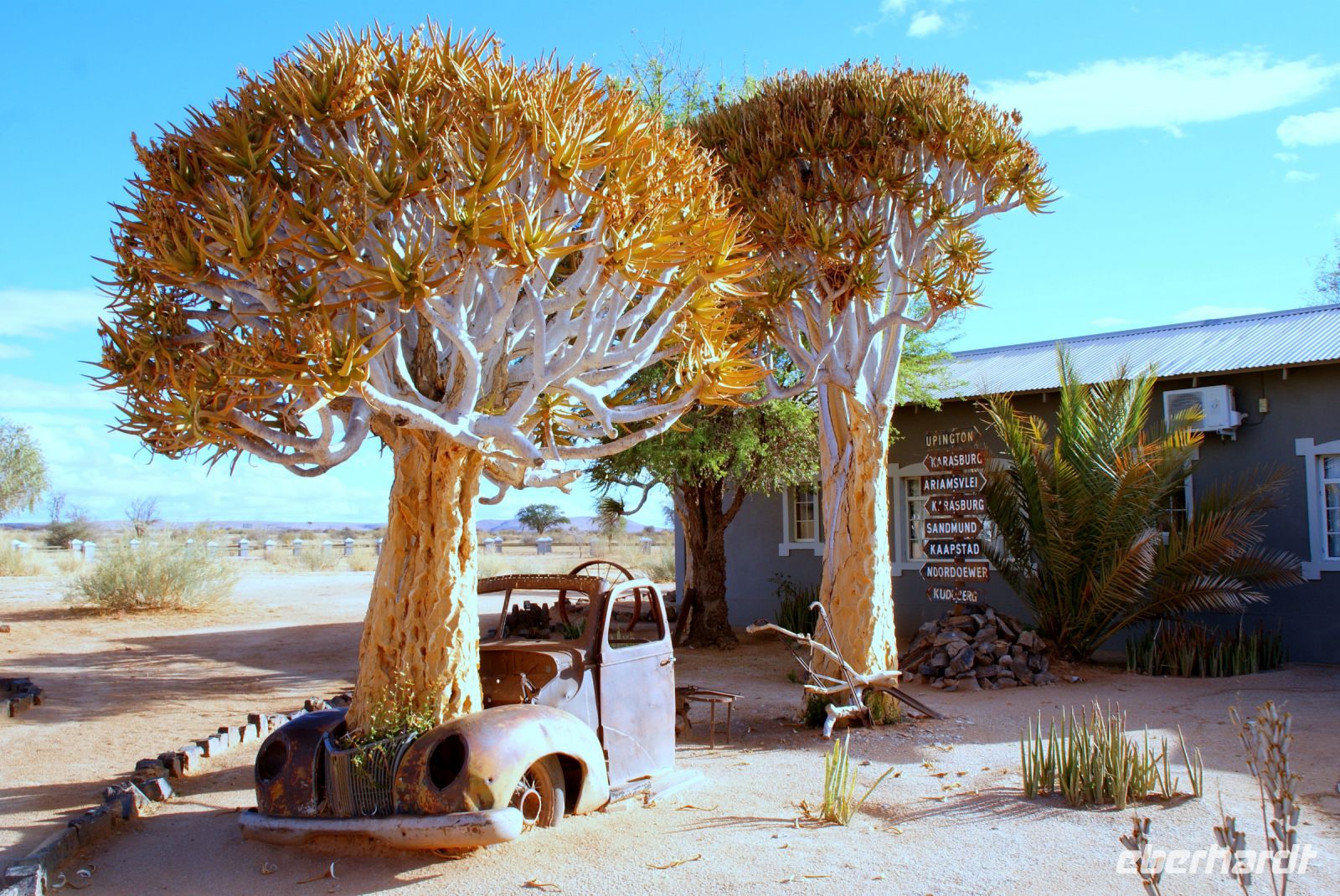 Nach dem ersten erlebnisreichen Tag haben wir alle geschlafen wie die Steine und treffen uns zu einem tollen Frühstück wieder….Gut gestärkt reisen wir weiter Richtung Süden und passieren Mariental, welches 1912 anlässlich des Eisenbahnbaus gegründet wurde. Da Tankstellen in Namibia sehr rar sind, muss man jede Gelegenheit nutzen und so tankt unser Guide das Fahrzeug während wir uns über das Billtong (Trockenfleisch) im Laden amüsieren, welches hier als „Wessies“ verkauft wird. So gibt es hier also die westdeutschen Bürger portionsweise und getrocknet…grins. Kurz vor Keetmanshoop biegen wir ab, um uns die Berühmtheiten dieser Region, den sogenannten „Köcherbaumwald“ (Quiver Tree Forest) und den „Spielplatz der Riesen“(Giants‘ Playground) anzusehen. Die Köcherbäume, eine Art Aloeen erhielten ihre Namen von den San (Buschmännern). Diese nutzen die innen weichen Äste, um hierin wie in einem Köcher Pfeile zu transportieren. Herrliche Fotomotive bieten sich uns mit diesen mitunter schon mehreren jahrhundertealten Bäumen, an denen wir entlang wandern. Die Reise führt uns zum ca. 130 Millionen Jahre alten Spielplatz der Riesen, eine bizarre Felslandschaft. Die aufgetürmten Dolerit-Felsen sehen aus, als seien sie das Werk von Riesen, jedoch sind sie durch Blockverwitterung entstanden. Die Gesteinsblöcke bestehen aus 170 Millionen Jahre altem Basalt vulkanischen Ursprungs, der durch Sandschliff poliert wurde. Wir spazieren durch dieses große Areal und sind mit unserer kleinen Gruppe völlig alleine unterwegs. So sehen wir auch die scheuen Klippschliefer, die vom Körperbau wie große Meerschweinchen aussehen, erstaunlicherweise jedoch zur Gattung der Elefanten gehören. Auf dem Weg zu unserer neuen Unterkunft, dem Canyon Road House, fahren wir entlang einer Eisenbahnstrecke und haben das große Glück, einen Zug zu beobachten. Wir eilen voraus und halten vor einem Bahnübergang. In freudiger Erwartung rauscht dieser heran und wir werden herzlich mit einem lauten Hupen und winkendem Lokführer begrüßt-so ist es hier in Namibia! Am späteren Nachmittag erreichen wir das Canyon Road House und nun ist die Fotosafari eröffnet. Unzählige Kuriositäten warten darauf, von uns aufgenommen zu werden. Zahlreiche Oldtimer eingebettet in die Anlage oder mit Köcherbäumen bieten tolle Motive. Das Haus von innen eine Art Museum mit etlichen Motiven. Am Abend speisen wir wieder gemeinsam, staunen über namibische Vorspeisen (riiiiesig) und lassen diesen gemütlich bei der ein oder anderen Spirituose ausklingen und werden zudem noch vom freundlichen Personal musikalisch unterhalten. Ach ja-hip hip-hurra: Susannes Koffer ist inzwischen endlich da…wurde 680 Km mit einem Transporter vom Flughafen Windhoek gebracht!