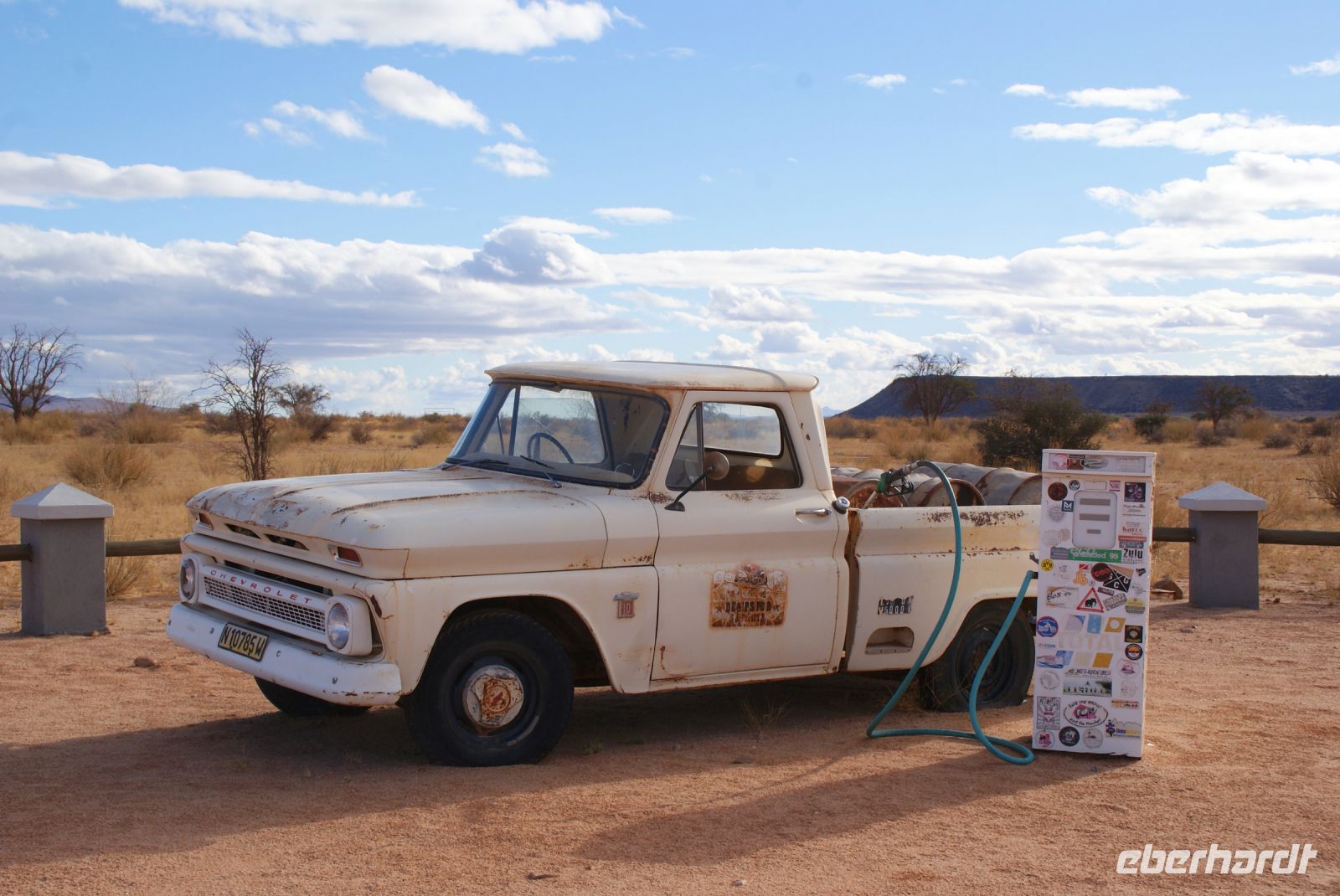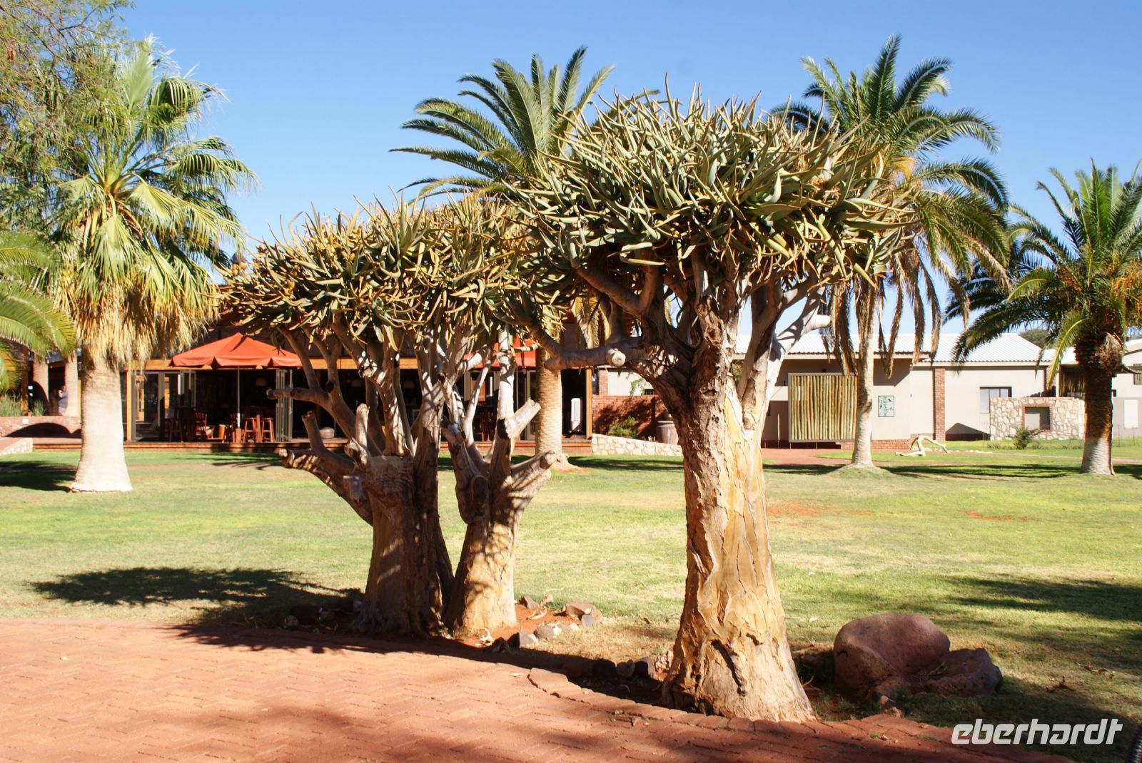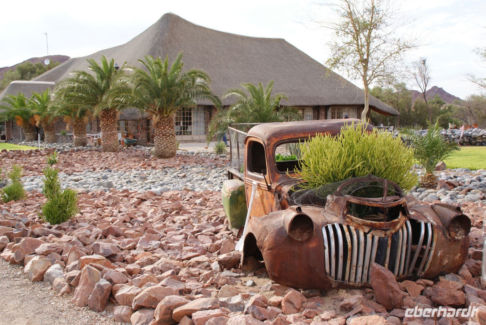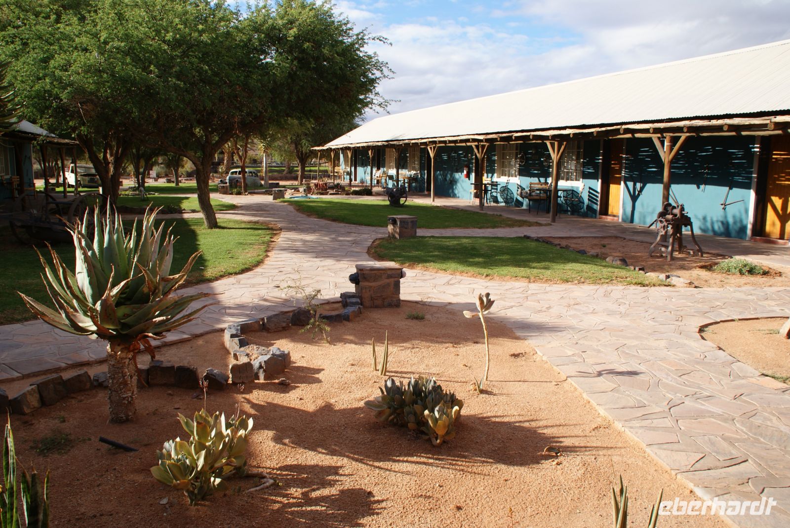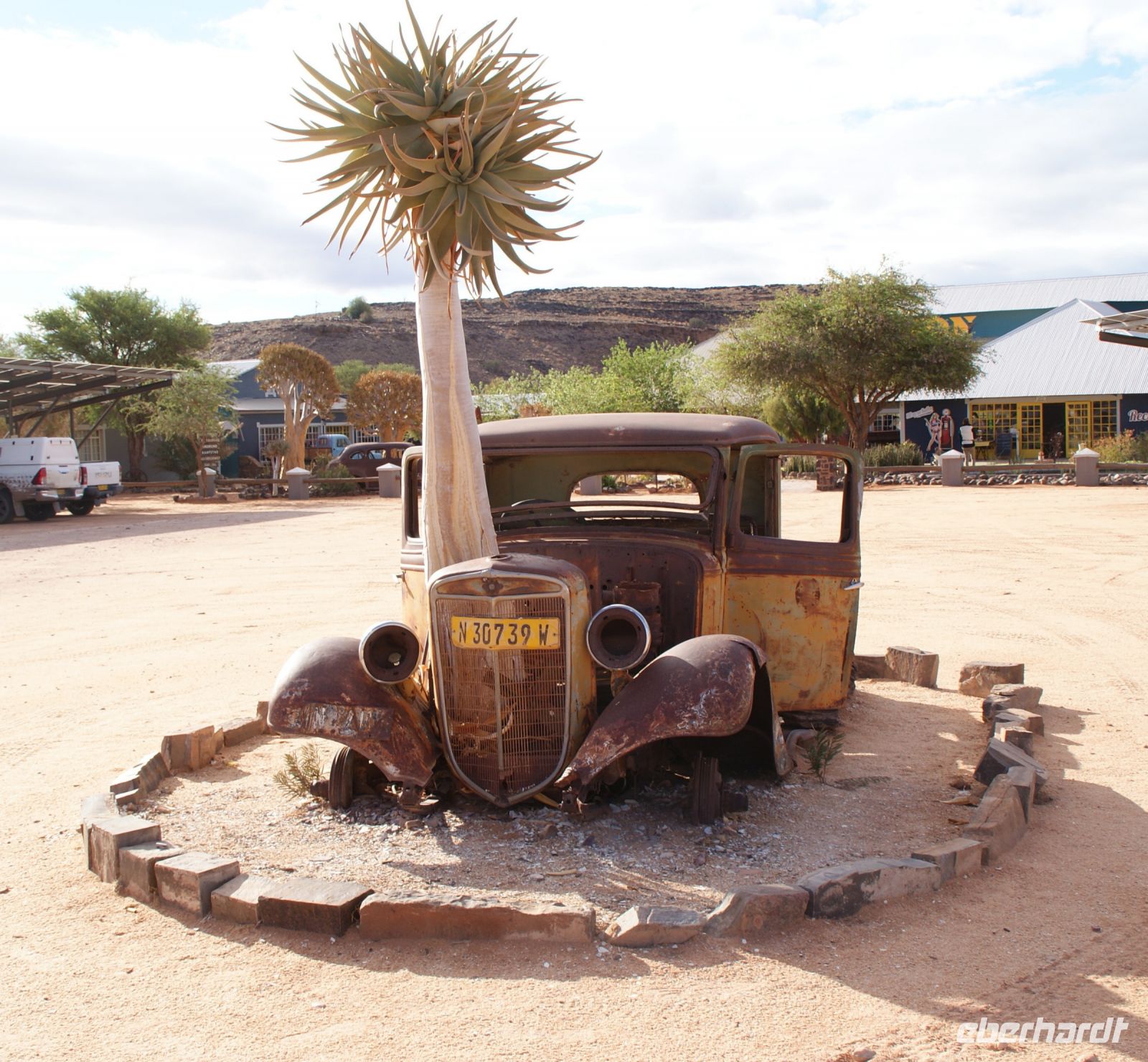 Nach dem ersten erlebnisreichen Tag haben wir alle geschlafen wie die Steine und treffen uns zu einem tollen Frühstück wieder….Gut gestärkt reisen wir weiter Richtung Süden und passieren Mariental, welches 1912 anlässlich des Eisenbahnbaus gegründet wurde. Da Tankstellen in Namibia sehr rar sind, muss man jede Gelegenheit nutzen und so tankt unser Guide das Fahrzeug während wir uns über das Billtong (Trockenfleisch) im Laden amüsieren, welches hier als „Wessies“ verkauft wird. So gibt es hier also die westdeutschen Bürger portionsweise und getrocknet…grins. Kurz vor Keetmanshoop biegen wir ab, um uns die Berühmtheiten dieser Region, den sogenannten „Köcherbaumwald“ (Quiver Tree Forest) und den „Spielplatz der Riesen“(Giants‘ Playground) anzusehen. Die Köcherbäume, eine Art Aloeen erhielten ihre Namen von den San (Buschmännern). Diese nutzen die innen weichen Äste, um hierin wie in einem Köcher Pfeile zu transportieren. Herrliche Fotomotive bieten sich uns mit diesen mitunter schon mehreren jahrhundertealten Bäumen, an denen wir entlang wandern. Die Reise führt uns zum ca. 130 Millionen Jahre alten Spielplatz der Riesen, eine bizarre Felslandschaft. Die aufgetürmten Dolerit-Felsen sehen aus, als seien sie das Werk von Riesen, jedoch sind sie durch Blockverwitterung entstanden. Die Gesteinsblöcke bestehen aus 170 Millionen Jahre altem Basalt vulkanischen Ursprungs, der durch Sandschliff poliert wurde. Wir spazieren durch dieses große Areal und sind mit unserer kleinen Gruppe völlig alleine unterwegs. So sehen wir auch die scheuen Klippschliefer, die vom Körperbau wie große Meerschweinchen aussehen, erstaunlicherweise jedoch zur Gattung der Elefanten gehören. Auf dem Weg zu unserer neuen Unterkunft, dem Canyon Road House, fahren wir entlang einer Eisenbahnstrecke und haben das große Glück, einen Zug zu beobachten. Wir eilen voraus und halten vor einem Bahnübergang. In freudiger Erwartung rauscht dieser heran und wir werden herzlich mit einem lauten Hupen und winkendem Lokführer begrüßt-so ist es hier in Namibia! Am späteren Nachmittag erreichen wir das Canyon Road House und nun ist die Fotosafari eröffnet. Unzählige Kuriositäten warten darauf, von uns aufgenommen zu werden. Zahlreiche Oldtimer eingebettet in die Anlage oder mit Köcherbäumen bieten tolle Motive. Das Haus von innen eine Art Museum mit etlichen Motiven. Am Abend speisen wir wieder gemeinsam, staunen über namibische Vorspeisen (riiiiesig) und lassen diesen gemütlich bei der ein oder anderen Spirituose ausklingen und werden zudem noch vom freundlichen Personal musikalisch unterhalten. Ach ja-hip hip-hurra: Susannes Koffer ist inzwischen endlich da…wurde 680 Km mit einem Transporter vom Flughafen Windhoek gebracht!