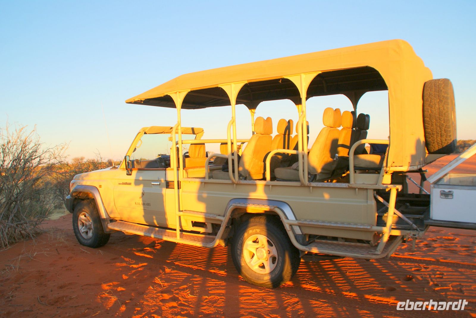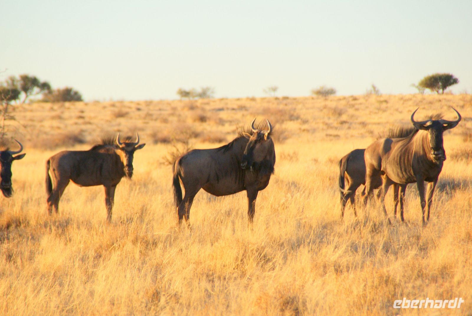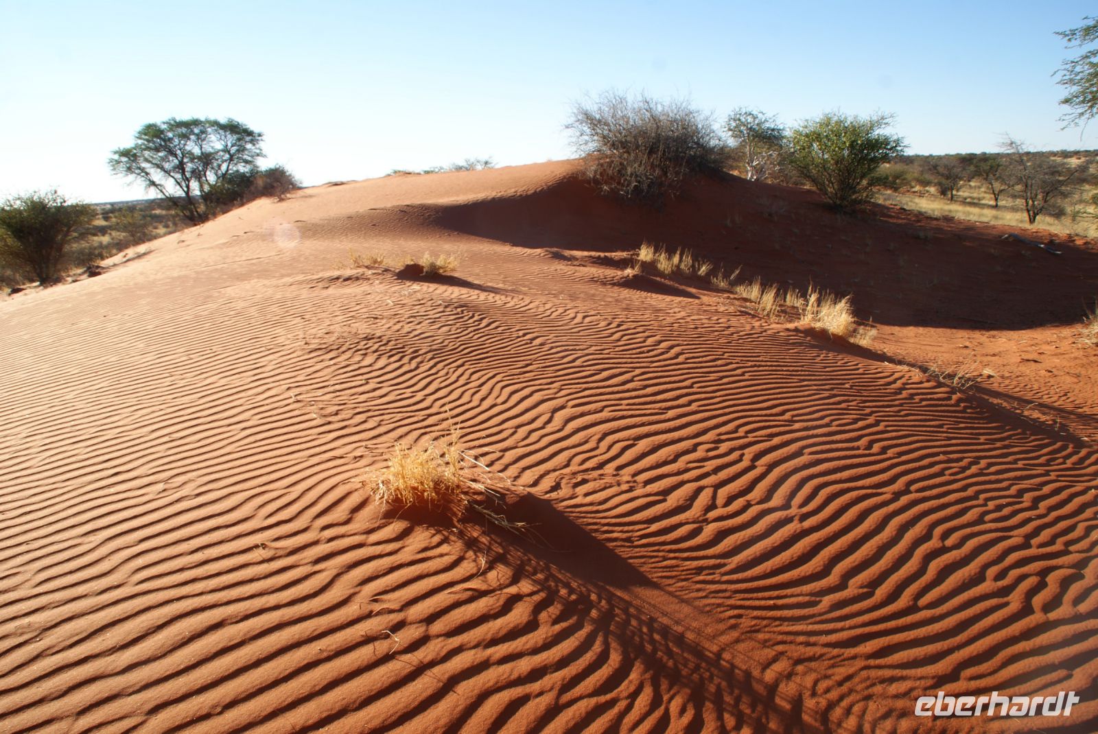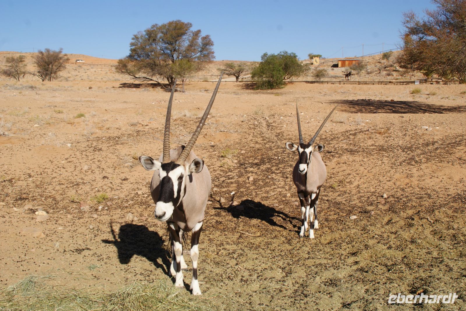 Nachdem wir diverse Einreisekontrollen hinter uns brachten und Reisebegleitung Susanne vergeblich nach ihrem Koffer am Gepäckband sucht, begrüßt uns Reiseleiter Herbert freundlich und kurz darauf starten wir unsere langersehnte Rundreise. Wir befinden uns nun in einem Land, welches einst Deutsch-Südwest, danach Südwestafrika genannt wurde, seit 1990 unabhängig ist und nun Namibia heißt. Das heutige Namibia ist beinahe 2,5x so groß wie Deutschland, hat ca. 2,6 Millionen Einwohner und eine Fläche von 827.000 Km². Wir hören von Herbert schon viele wissenswerte Fakten, während er uns ruhig Richtung Mariental fährt. Er berichtet, dass Namibia mit vielen Produkten von Südafrika abhängig ist, sich jedoch mit Gütern wie Diamanten, Bergbau, Fischfang, Tourismus selbst finanziert. Währenddessen sammeln wir erste landschaftliche Eindrücke und Herbert spendiert ein Gläschen Amarula auf die bevorstehenden Tage mit uns. Vorbei am sogenannten „Heldenacker“, welcher 2006 erbaut wurde und wo zu Ruhm gekommene Menschen begraben werden, fahren wir weiter über Rehoboth nach Mariental. Hier kommen wir am Nachmittag auf der Kalahari Anib Lodge an und begeben uns kurz danach auf einen schönen sogenannten „Naturdrive“. Im offenen Jeep genießen wir die herrliche Luft, das Panorama und schon so einige Tiere, die uns Fahrer John zeigt. Wir befinden uns nun in der Kalahari, die 1 Million km² misst und als Halbwüste bezeichnet wird. Die rote Farbe resultiert aus der eisenhaltigen Erde und somit haben wir ein tolles Farbenspiel aus roter Erde, blauem Himmel, langem, hellem Gras und wir mittendrin. Folgende Tiere dürfen wir bereits am ersten Tag bestaunen: Springböcke, Steinböcke, Webervögel und deren imposante Nester, viele Giraffen, Gnus, Zebras, eine gefleckte Adlereule, die ihr Nest auf einer Webervogelkolonie errichtete, zwei Riesentrappen, die größten flugfähigen Vögel Afrikas. Zum Sonnenuntergang hat die Kalahari-Bar für uns geöffnet und bei Gin Tonic, Bier, Wein und Co. stoßen wir auf einer Düne auf einen wunderbaren ersten Tag an und staunen noch immer, wie toll alles geklappt hat. So viel Abenteuer macht hungrig und wir lassen uns das tolle Buffet der Kalahari Anib Lodge bestens schmecken.