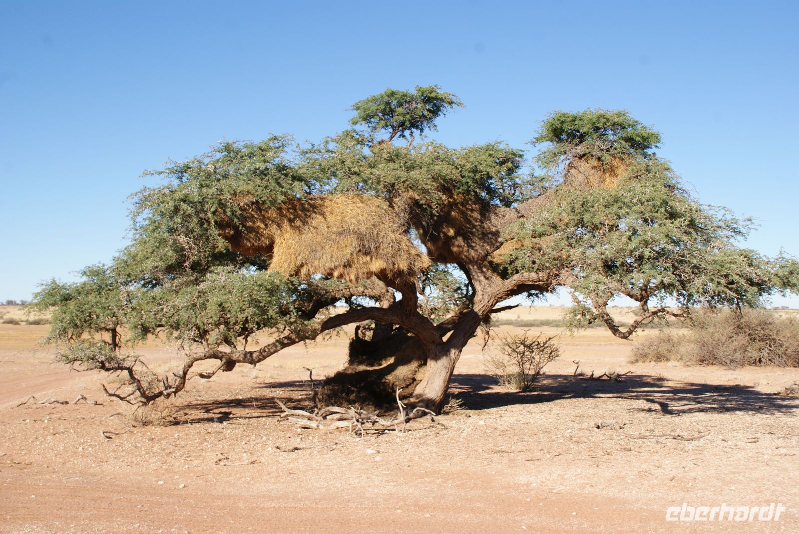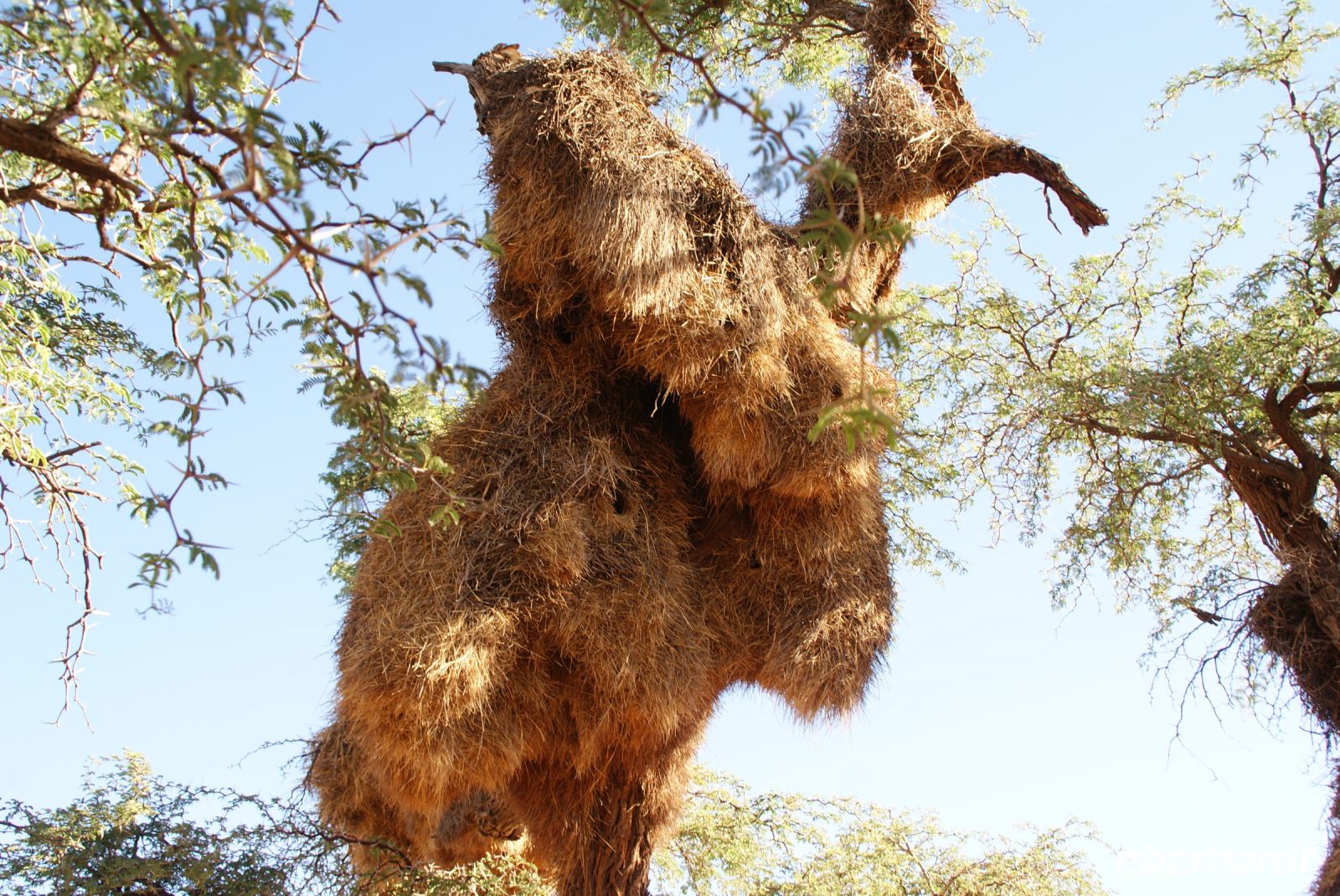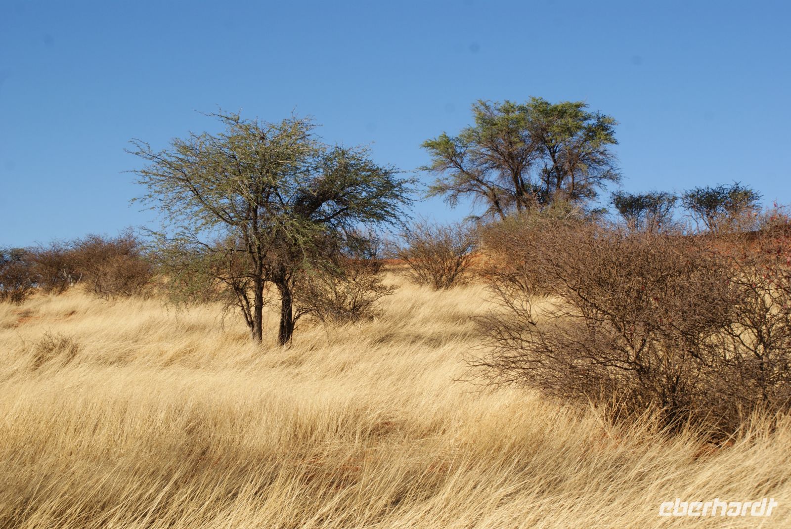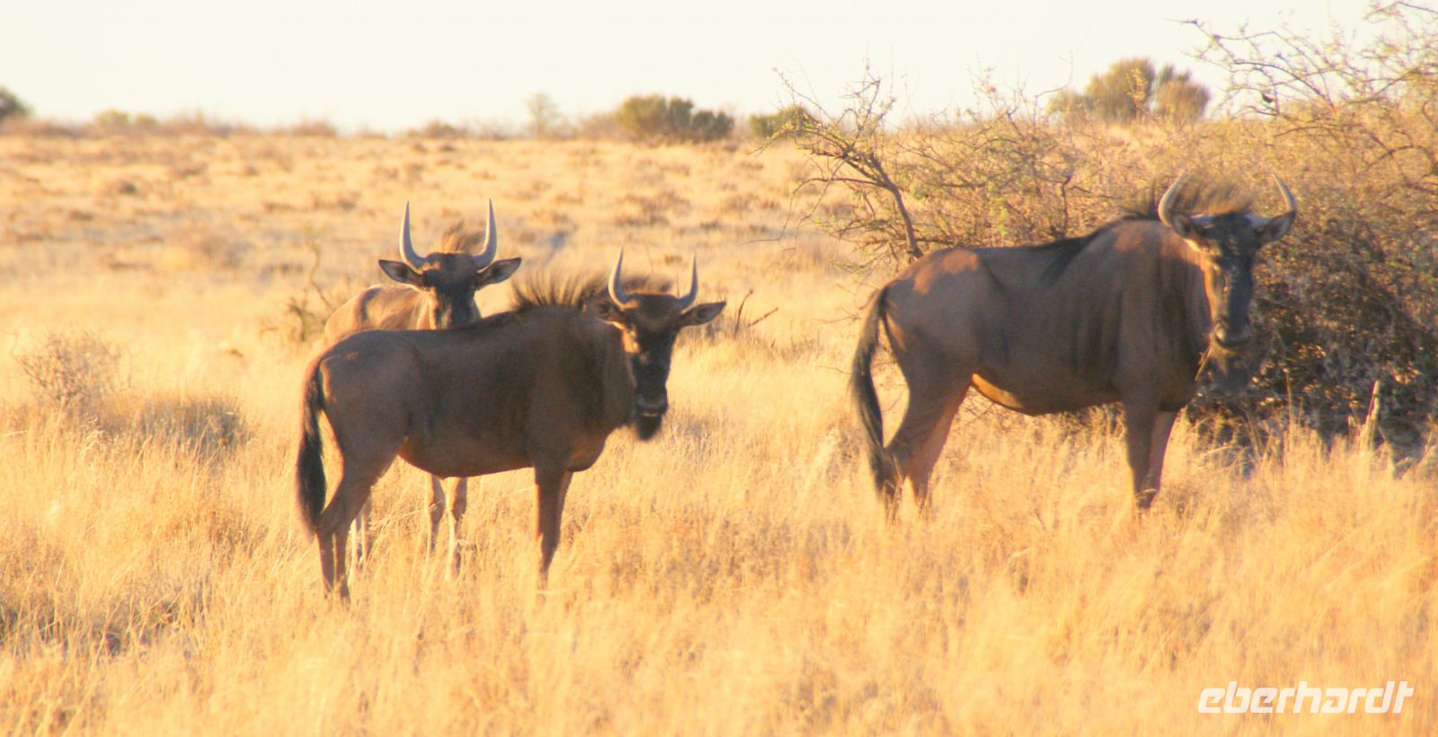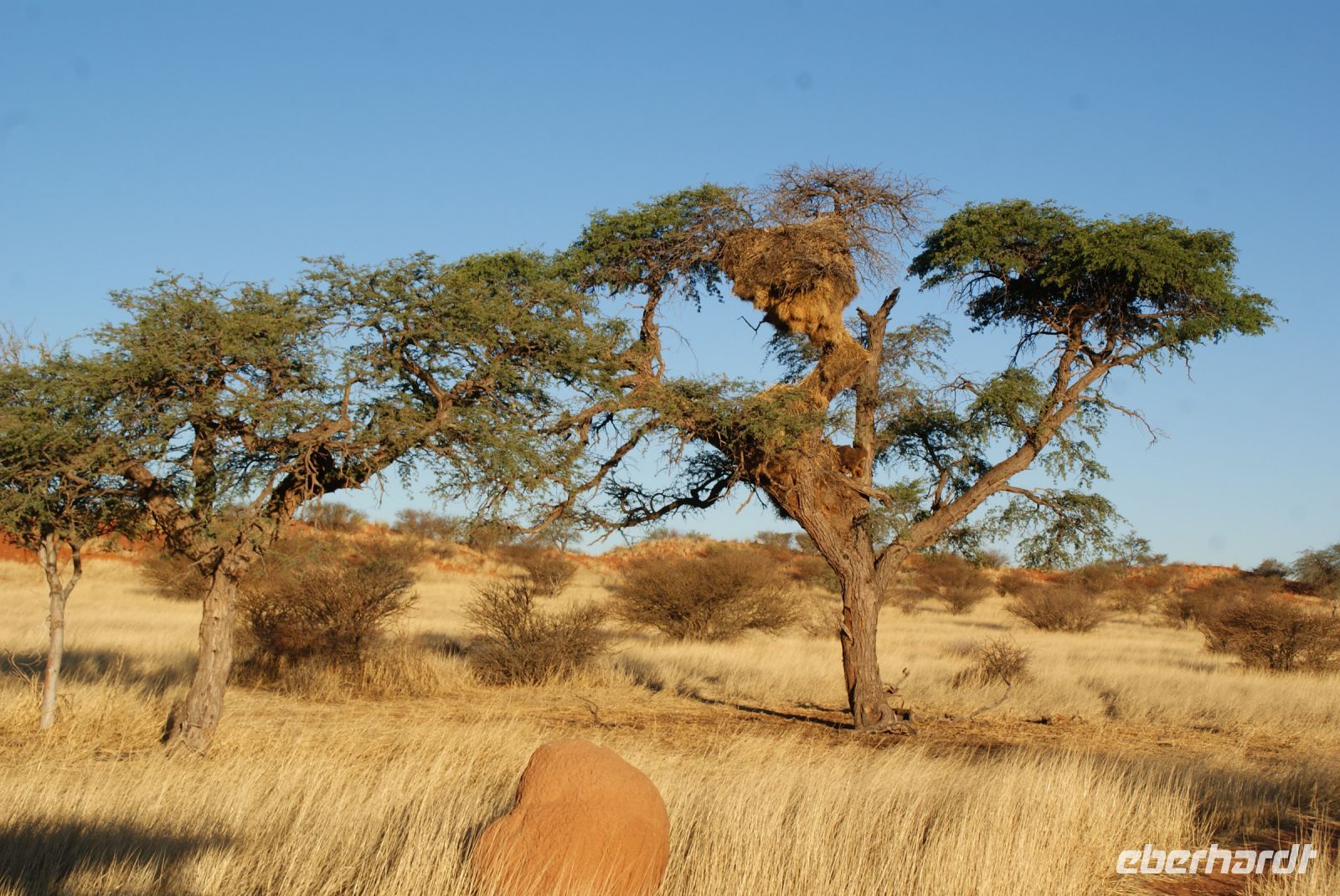 Nachdem wir diverse Einreisekontrollen hinter uns brachten und Reisebegleitung Susanne vergeblich nach ihrem Koffer am Gepäckband sucht, begrüßt uns Reiseleiter Herbert freundlich und kurz darauf starten wir unsere langersehnte Rundreise. Wir befinden uns nun in einem Land, welches einst Deutsch-Südwest, danach Südwestafrika genannt wurde, seit 1990 unabhängig ist und nun Namibia heißt. Das heutige Namibia ist beinahe 2,5x so groß wie Deutschland, hat ca. 2,6 Millionen Einwohner und eine Fläche von 827.000 Km². Wir hören von Herbert schon viele wissenswerte Fakten, während er uns ruhig Richtung Mariental fährt. Er berichtet, dass Namibia mit vielen Produkten von Südafrika abhängig ist, sich jedoch mit Gütern wie Diamanten, Bergbau, Fischfang, Tourismus selbst finanziert. Währenddessen sammeln wir erste landschaftliche Eindrücke und Herbert spendiert ein Gläschen Amarula auf die bevorstehenden Tage mit uns. Vorbei am sogenannten „Heldenacker“, welcher 2006 erbaut wurde und wo zu Ruhm gekommene Menschen begraben werden, fahren wir weiter über Rehoboth nach Mariental. Hier kommen wir am Nachmittag auf der Kalahari Anib Lodge an und begeben uns kurz danach auf einen schönen sogenannten „Naturdrive“. Im offenen Jeep genießen wir die herrliche Luft, das Panorama und schon so einige Tiere, die uns Fahrer John zeigt. Wir befinden uns nun in der Kalahari, die 1 Million km² misst und als Halbwüste bezeichnet wird. Die rote Farbe resultiert aus der eisenhaltigen Erde und somit haben wir ein tolles Farbenspiel aus roter Erde, blauem Himmel, langem, hellem Gras und wir mittendrin. Folgende Tiere dürfen wir bereits am ersten Tag bestaunen: Springböcke, Steinböcke, Webervögel und deren imposante Nester, viele Giraffen, Gnus, Zebras, eine gefleckte Adlereule, die ihr Nest auf einer Webervogelkolonie errichtete, zwei Riesentrappen, die größten flugfähigen Vögel Afrikas. Zum Sonnenuntergang hat die Kalahari-Bar für uns geöffnet und bei Gin Tonic, Bier, Wein und Co. stoßen wir auf einer Düne auf einen wunderbaren ersten Tag an und staunen noch immer, wie toll alles geklappt hat. So viel Abenteuer macht hungrig und wir lassen uns das tolle Buffet der Kalahari Anib Lodge bestens schmecken.
