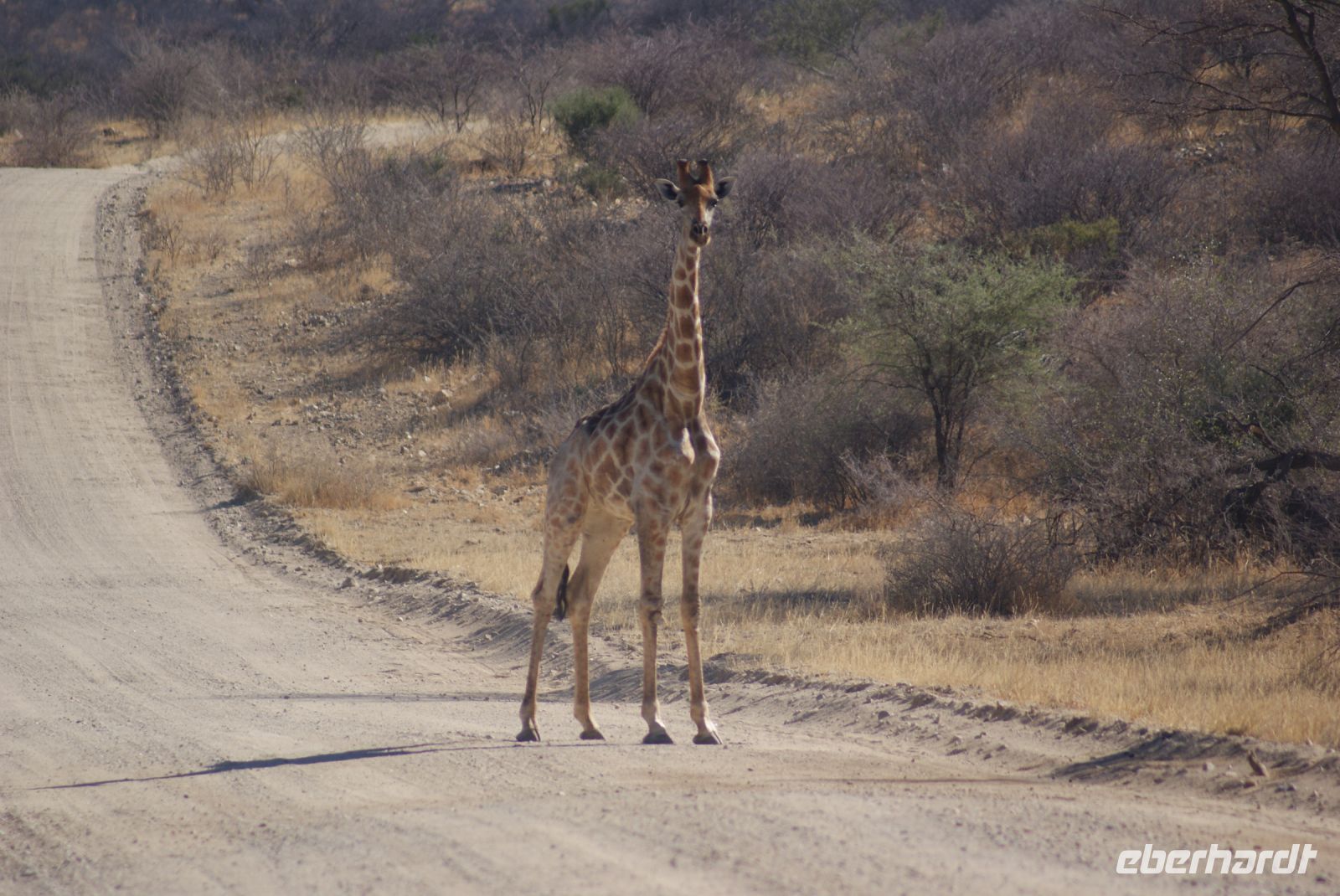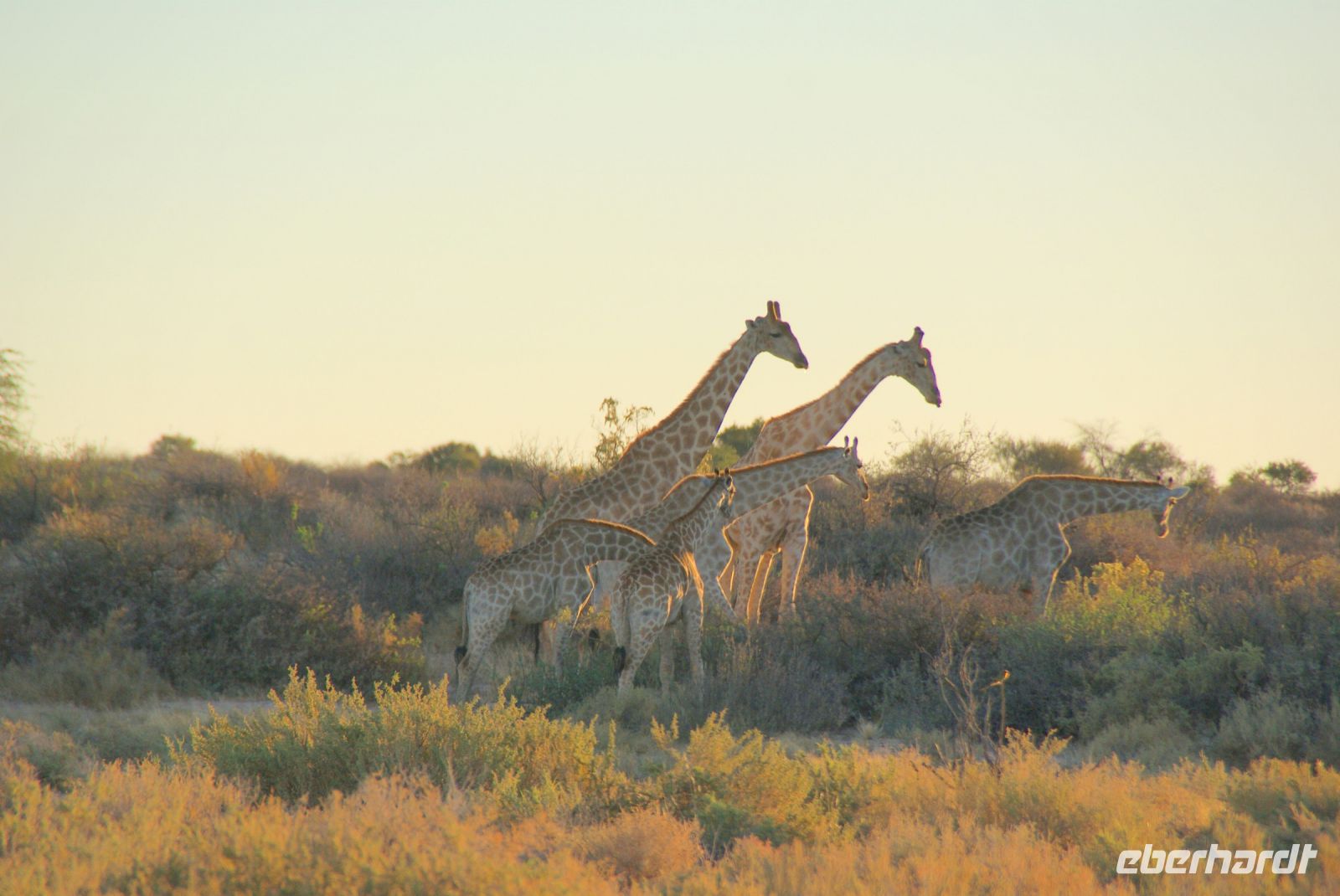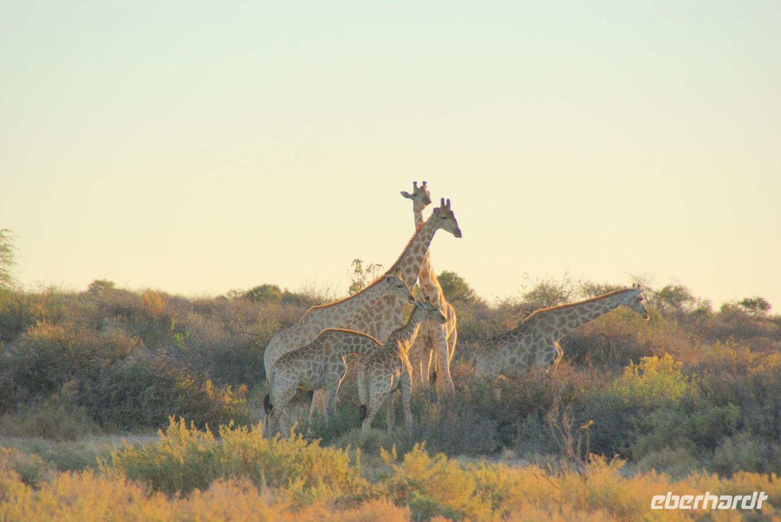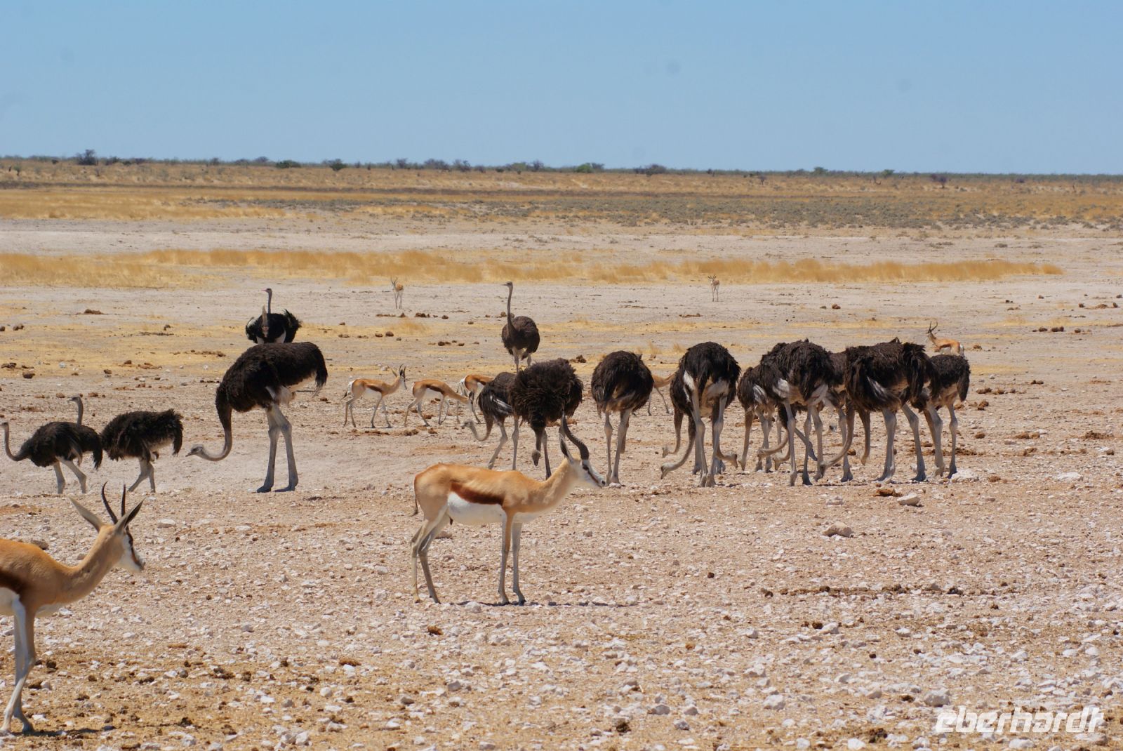 Aufgrund der vielen leckeren Eierspeisen und deren Zubereitung starten wir ein wenig später als geplant und setzen unsere schöne Reise fort. Bereits in den ersten Minuten entdecken wir schon so manche Tiere am Wegesrand. Hierzu zählen Dik Diks, die kleinste Antilopenart Afrikas, Kudus, einen Steinbock und an die acht Giraffen, die unsere Straße passieren. Ein tolles Erlebnis bereits am frühen Morgen. Mittags halten wir in der Kleinstadt Outjo und kehren bei der Schweizer Namibierin Anastasia ein, die uns sehr freundlich mit Schweizer Akzent begrüßt. Bei ihr kosten wir Bratwurst mit Sauerkraut und auch so mancher Wrap wird für sehr köstlich befunden. Wir entscheiden, dass wir direkt von hier aus in den Etosha Nationalpark fahren und uns auf Safari begeben. Der Nationalpark ist mit knapp 23.000 Km² noch etwas größer als der Krüger Park in Südafrika. Am ersten Wasserloch angekommen sehen wir eine größere Anzahl an Giraffen, die sich hier mit dem kühlen Nass versorgen. Weitere Steppenzebras finden sich ebenfalls ein. Herbert ist nicht nur heute wieder ein exzellenter Fahrer, sondern auch unser Späher. So zeigt er uns zwei herrliche Sekretärvögel in der Steppe, die man nicht allzu häufig antrifft. Es vergeht eine herrliche Zeit und wir entdecken noch folgende Tiere: Elefanten, Kudus, Impalas, Zebraherden, etliche Giraffen, Schakale, eine Straussenfamilie mit Nachwuchs und eine Riesentrappe, den größten flugfähigen Vogel Afrikas. Am frühen Abend erreichen wir unsere schöne Toshari Lodge, in der wir zwei Nächte bleiben werden, checken ein und beim Abendessen lassen wir unsere Jubilare hochleben. Viel Spaß haben wir mit den schönen Liedern, die die Lodgecrew für sie singt, eine tolle Torte überreicht wird und wir gemeinsam einen wunderbar fröhlichen Abend verbringen!