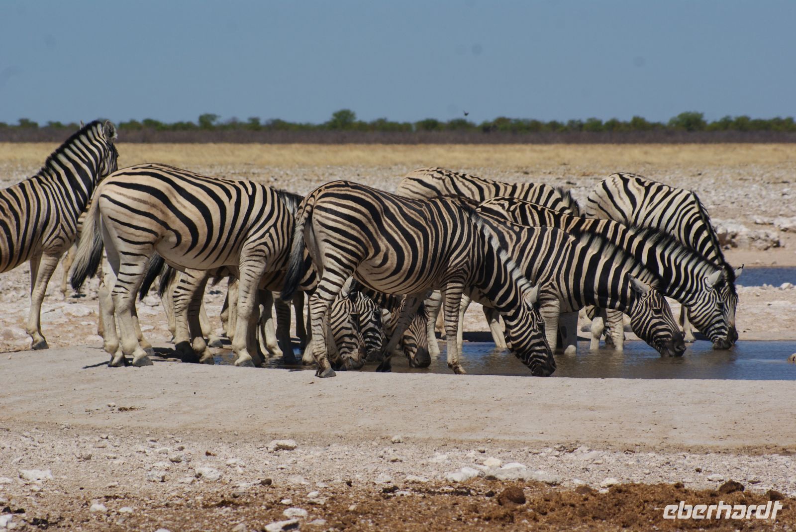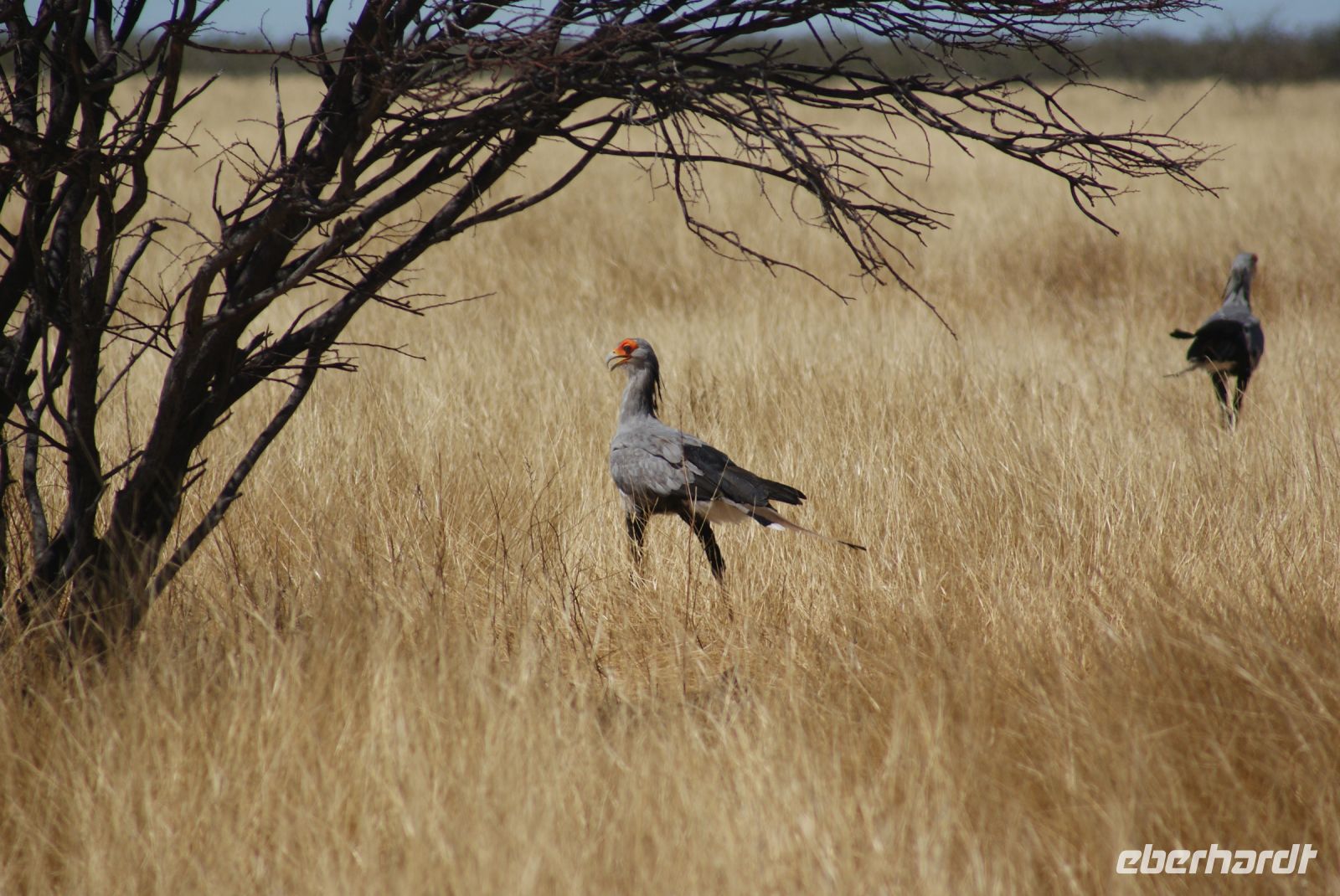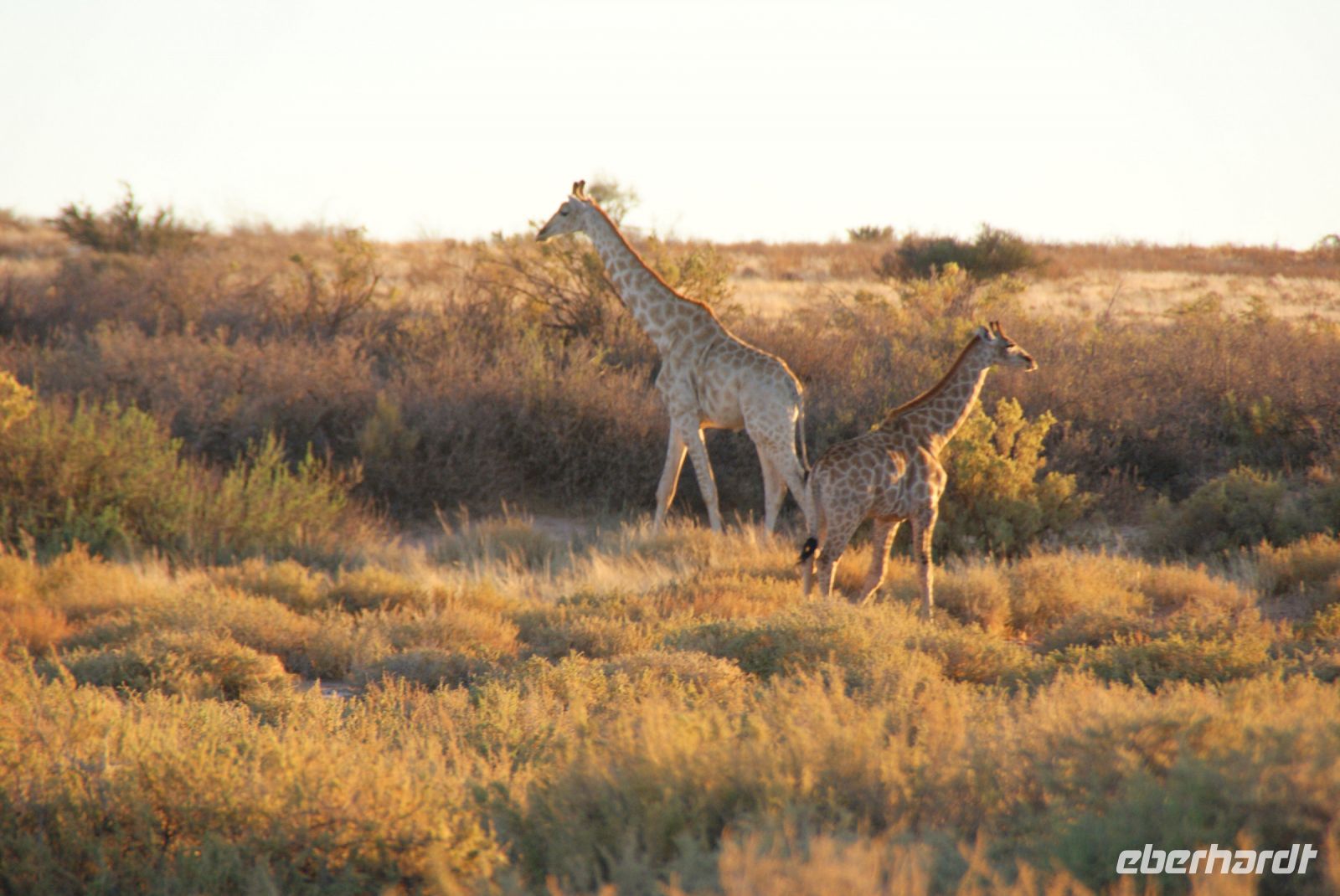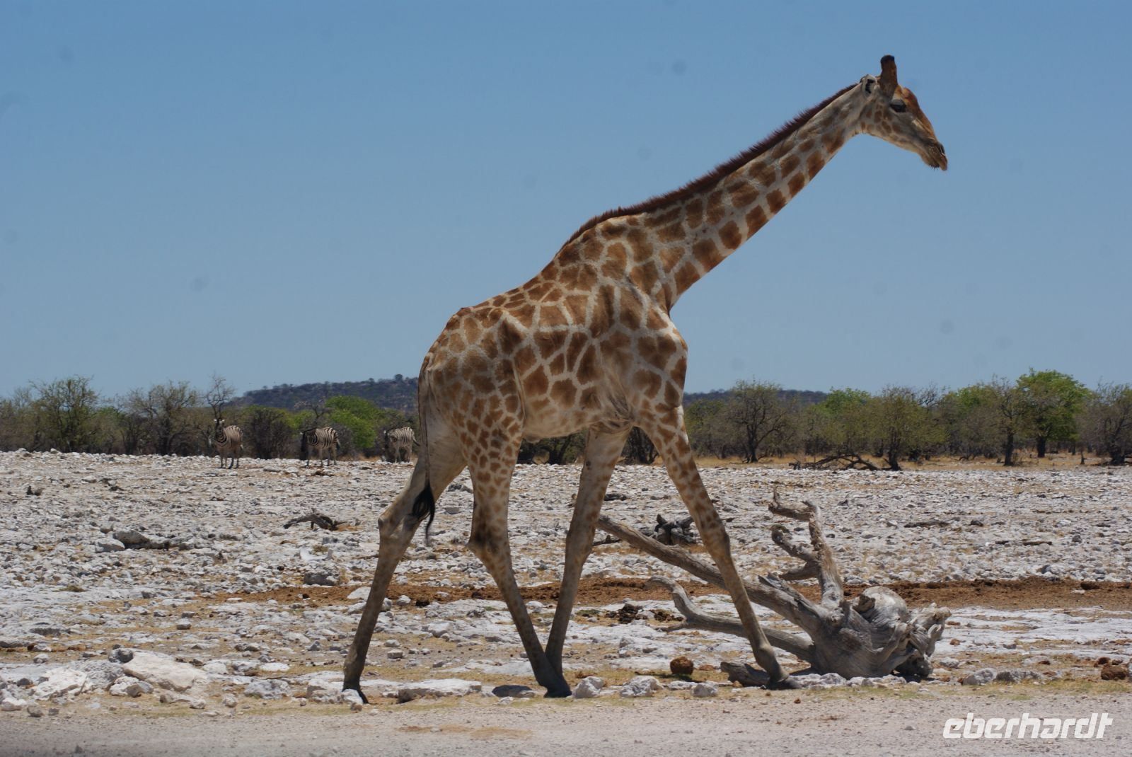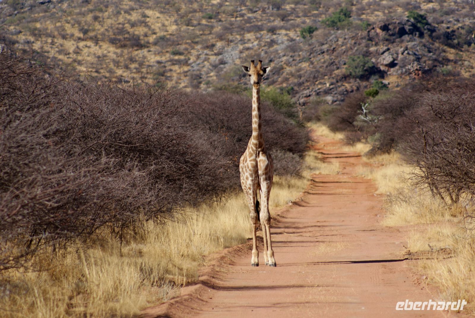 Aufgrund der vielen leckeren Eierspeisen und deren Zubereitung starten wir ein wenig später als geplant und setzen unsere schöne Reise fort. Bereits in den ersten Minuten entdecken wir schon so manche Tiere am Wegesrand. Hierzu zählen Dik Diks, die kleinste Antilopenart Afrikas, Kudus, einen Steinbock und an die acht Giraffen, die unsere Straße passieren. Ein tolles Erlebnis bereits am frühen Morgen. Mittags halten wir in der Kleinstadt Outjo und kehren bei der Schweizer Namibierin Anastasia ein, die uns sehr freundlich mit Schweizer Akzent begrüßt. Bei ihr kosten wir Bratwurst mit Sauerkraut und auch so mancher Wrap wird für sehr köstlich befunden. Wir entscheiden, dass wir direkt von hier aus in den Etosha Nationalpark fahren und uns auf Safari begeben. Der Nationalpark ist mit knapp 23.000 Km² noch etwas größer als der Krüger Park in Südafrika. Am ersten Wasserloch angekommen sehen wir eine größere Anzahl an Giraffen, die sich hier mit dem kühlen Nass versorgen. Weitere Steppenzebras finden sich ebenfalls ein. Herbert ist nicht nur heute wieder ein exzellenter Fahrer, sondern auch unser Späher. So zeigt er uns zwei herrliche Sekretärvögel in der Steppe, die man nicht allzu häufig antrifft. Es vergeht eine herrliche Zeit und wir entdecken noch folgende Tiere: Elefanten, Kudus, Impalas, Zebraherden, etliche Giraffen, Schakale, eine Straussenfamilie mit Nachwuchs und eine Riesentrappe, den größten flugfähigen Vogel Afrikas. Am frühen Abend erreichen wir unsere schöne Toshari Lodge, in der wir zwei Nächte bleiben werden, checken ein und beim Abendessen lassen wir unsere Jubilare hochleben. Viel Spaß haben wir mit den schönen Liedern, die die Lodgecrew für sie singt, eine tolle Torte überreicht wird und wir gemeinsam einen wunderbar fröhlichen Abend verbringen!