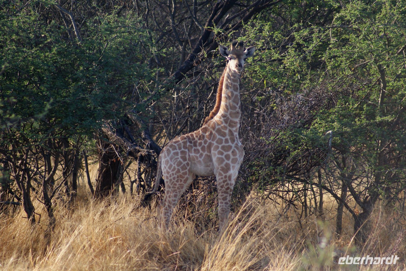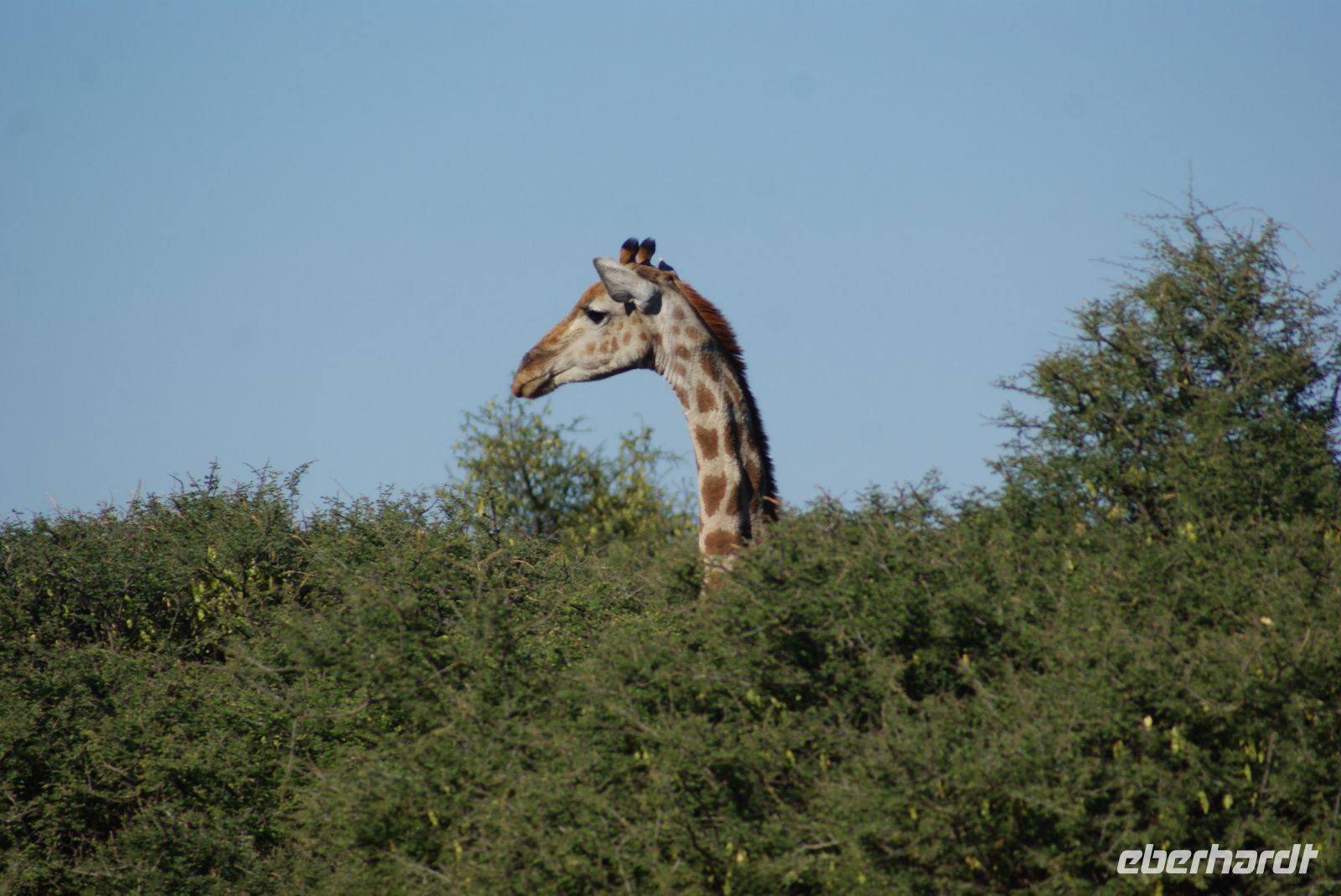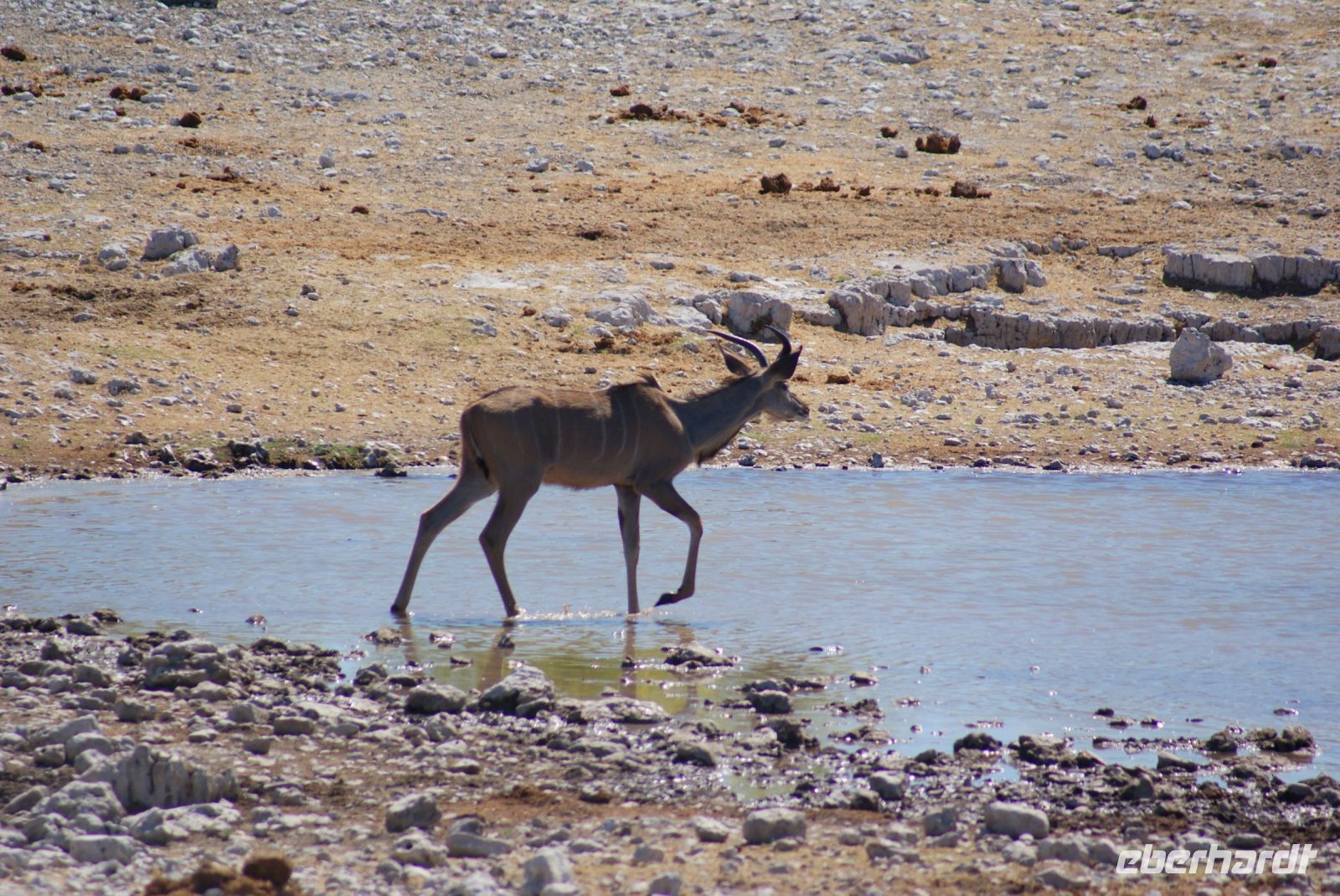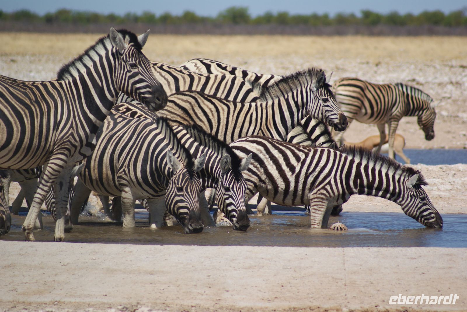 Aufgrund der vielen leckeren Eierspeisen und deren Zubereitung starten wir ein wenig später als geplant und setzen unsere schöne Reise fort. Bereits in den ersten Minuten entdecken wir schon so manche Tiere am Wegesrand. Hierzu zählen Dik Diks, die kleinste Antilopenart Afrikas, Kudus, einen Steinbock und an die acht Giraffen, die unsere Straße passieren. Ein tolles Erlebnis bereits am frühen Morgen. Mittags halten wir in der Kleinstadt Outjo und kehren bei der Schweizer Namibierin Anastasia ein, die uns sehr freundlich mit Schweizer Akzent begrüßt. Bei ihr kosten wir Bratwurst mit Sauerkraut und auch so mancher Wrap wird für sehr köstlich befunden. Wir entscheiden, dass wir direkt von hier aus in den Etosha Nationalpark fahren und uns auf Safari begeben. Der Nationalpark ist mit knapp 23.000 Km² noch etwas größer als der Krüger Park in Südafrika. Am ersten Wasserloch angekommen sehen wir eine größere Anzahl an Giraffen, die sich hier mit dem kühlen Nass versorgen. Weitere Steppenzebras finden sich ebenfalls ein. Herbert ist nicht nur heute wieder ein exzellenter Fahrer, sondern auch unser Späher. So zeigt er uns zwei herrliche Sekretärvögel in der Steppe, die man nicht allzu häufig antrifft. Es vergeht eine herrliche Zeit und wir entdecken noch folgende Tiere: Elefanten, Kudus, Impalas, Zebraherden, etliche Giraffen, Schakale, eine Straussenfamilie mit Nachwuchs und eine Riesentrappe, den größten flugfähigen Vogel Afrikas. Am frühen Abend erreichen wir unsere schöne Toshari Lodge, in der wir zwei Nächte bleiben werden, checken ein und beim Abendessen lassen wir unsere Jubilare hochleben. Viel Spaß haben wir mit den schönen Liedern, die die Lodgecrew für sie singt, eine tolle Torte überreicht wird und wir gemeinsam einen wunderbar fröhlichen Abend verbringen!