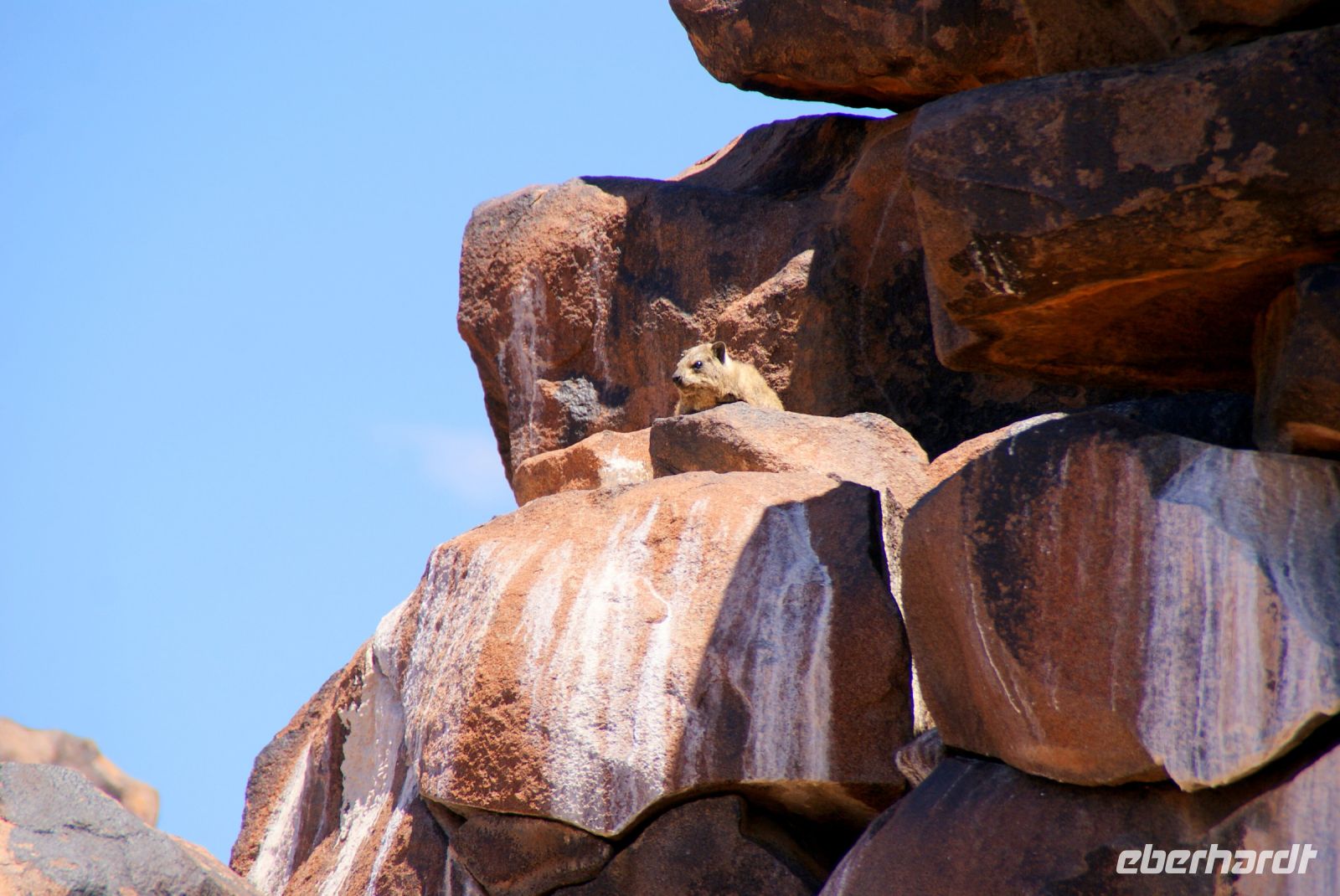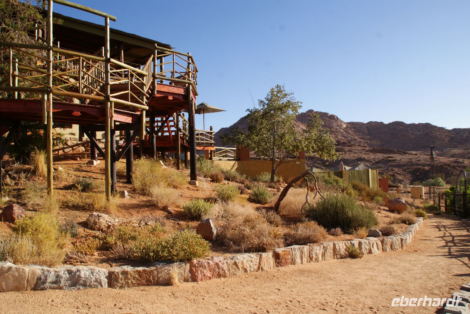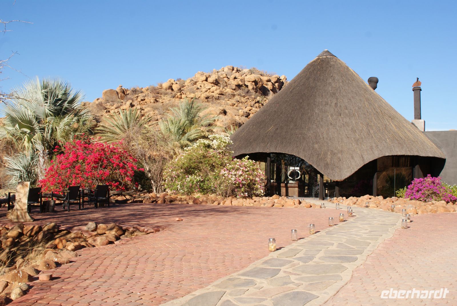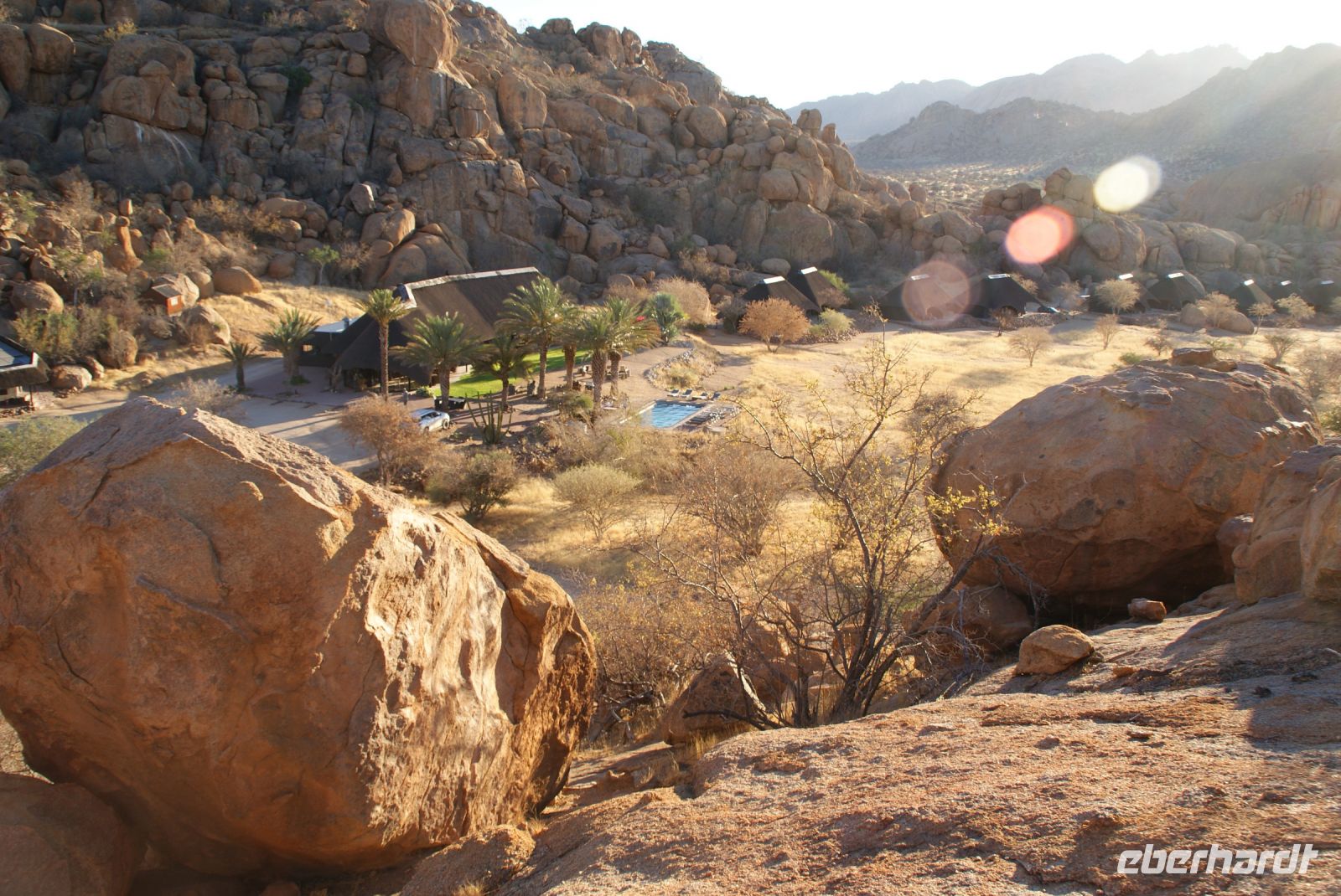 Nach einem erneut fürstlichen Frühstück verlassen wir Swakopmund, welches sich heute wettertechnisch sehr trüb und noch verschlafener als gestern zeigt. Nach einer Stunde Fahrt ist die namibische Wetterwelt wieder in Ordnung mit strahlendem Sonnenschein und wolkenlosem Himmel. In der Ferne ist bereits die Spitzkuppe zu sehen, an die wir heute ganz nah heranfahren werden. Diese ist 1728 m hoch umrahmt von den Pontok Bergen. Zuvor halten wir jedoch zu einer kleinen Klettertour zum Rock Arch, einem bogenartigen Felsen, der mit vielen anderen ein wunderbares Panorama bietet. Hier warten bereits so manche Rotaugen Büll Büll’s und Bergstare auf uns und beglücken uns mit lieblichem Gesang. An der Spitzkuppe angekommen durchfahren wir die Region und stoppen für diverse Fotoaufnahmen. Den Abschluss bildet eine kurze Führung durch Buschmann Dennis, der uns die Jahrtausend alten Felszeichnungen der Buschmänner näher bringt. Wir erfahren viele interessante Dinge, wie einst Informationen ohne Schrift untereinander weitergegeben wurden. Als Farben wurden einst Steine zermahlen und mit Rinderblut vermengt sowie dem klebrigen Saft der Euphorbien, mit Kot der Klippschliefer vermischt. So erhielten die Buschmänner rote, orangefarbene und weiße Farbe für ihre Felszeichnungen. Diese wurden an geschützten Bereichen auf einem Felsen angebracht und dienten der Orientierung darüber, welche Tiere sich in der Region aufhielten und wo Wasser zu finden war. Unsere weitere Tour führt uns zu Usakos, wo wir einen Mittagssnack und ein kühles Getränk zu uns nehmen, bevor wir am Nachmittag in der wunderbar der Natur angepassten Ai Aiba Rock Painting Lodge eintreffen. Wir beziehen unsere riesigen Zimmer, genießen einen Kaffee mit herrlichem Blick in die weite Natur und treffen uns dann zu einem Sundowner Walk wieder. Mit Guide Deon spazieren wir zunächst gemächlich einen schönen Feldweg entlang. Auf diesem zeigt er uns bereits diverse Tierspuren, die wir ohne ihn nie entdeckt hätten. So passieren wir die Fußabdrücke von Ameisenbär, Leopard und Pavianen, vom Spinnennest mal ganz abgesehen. Danach geht es steil nach oben. Auf dem Gipfel angekommen haben wir eine grandiose Aussicht auf die umliegende Umgebung und sehen unsere schöne Lodge vor uns in der Tiefe. Nach einem leckeren Getränk und mit Blick auf die untergehende Sonne begeben wir uns vorsichtig auf den Weg nach unten und wohlbehalten geht es von dort zu einem vorzüglichen Abendessen.