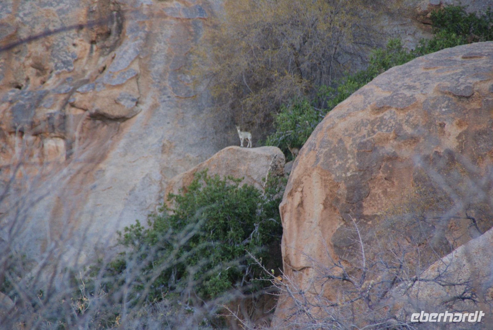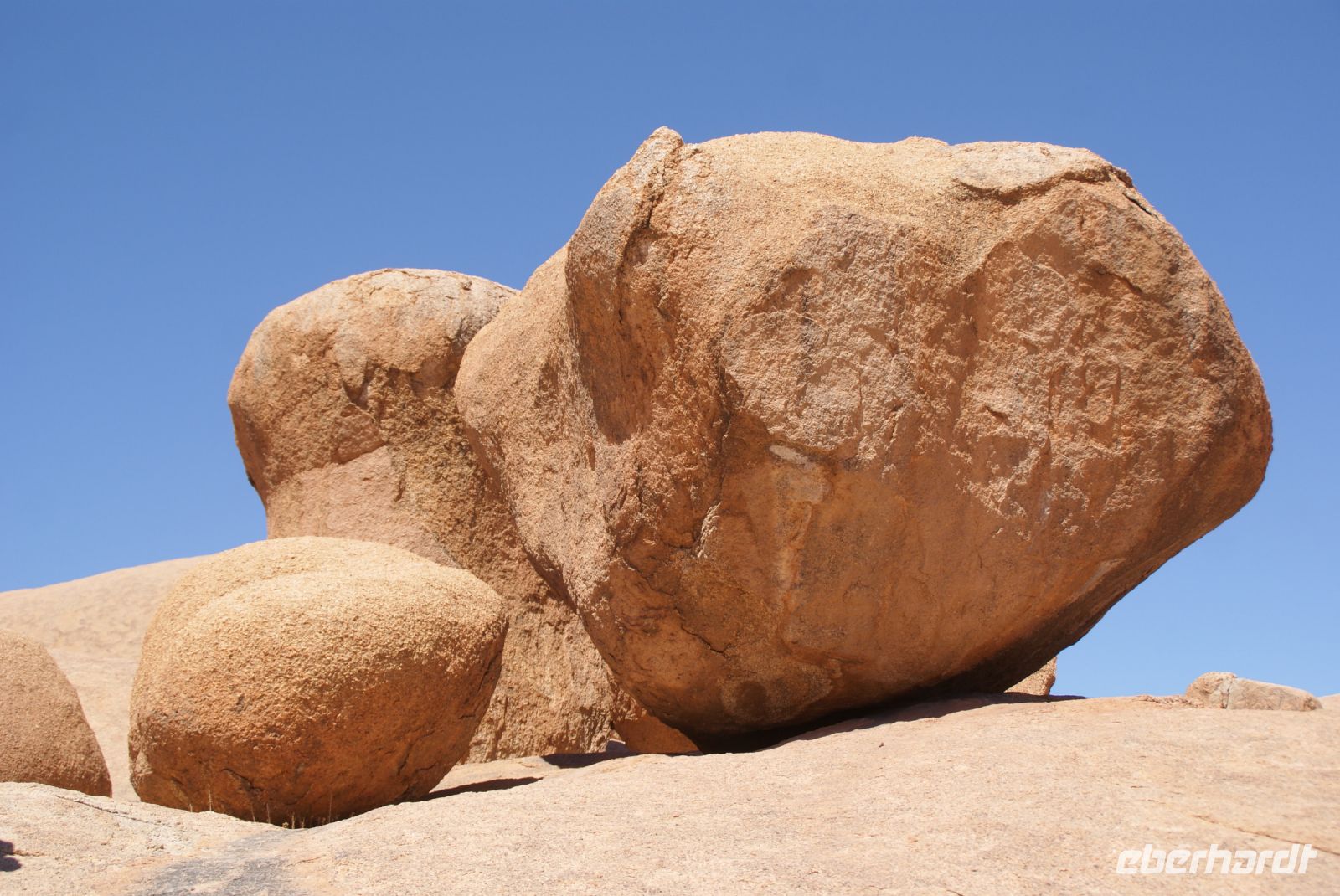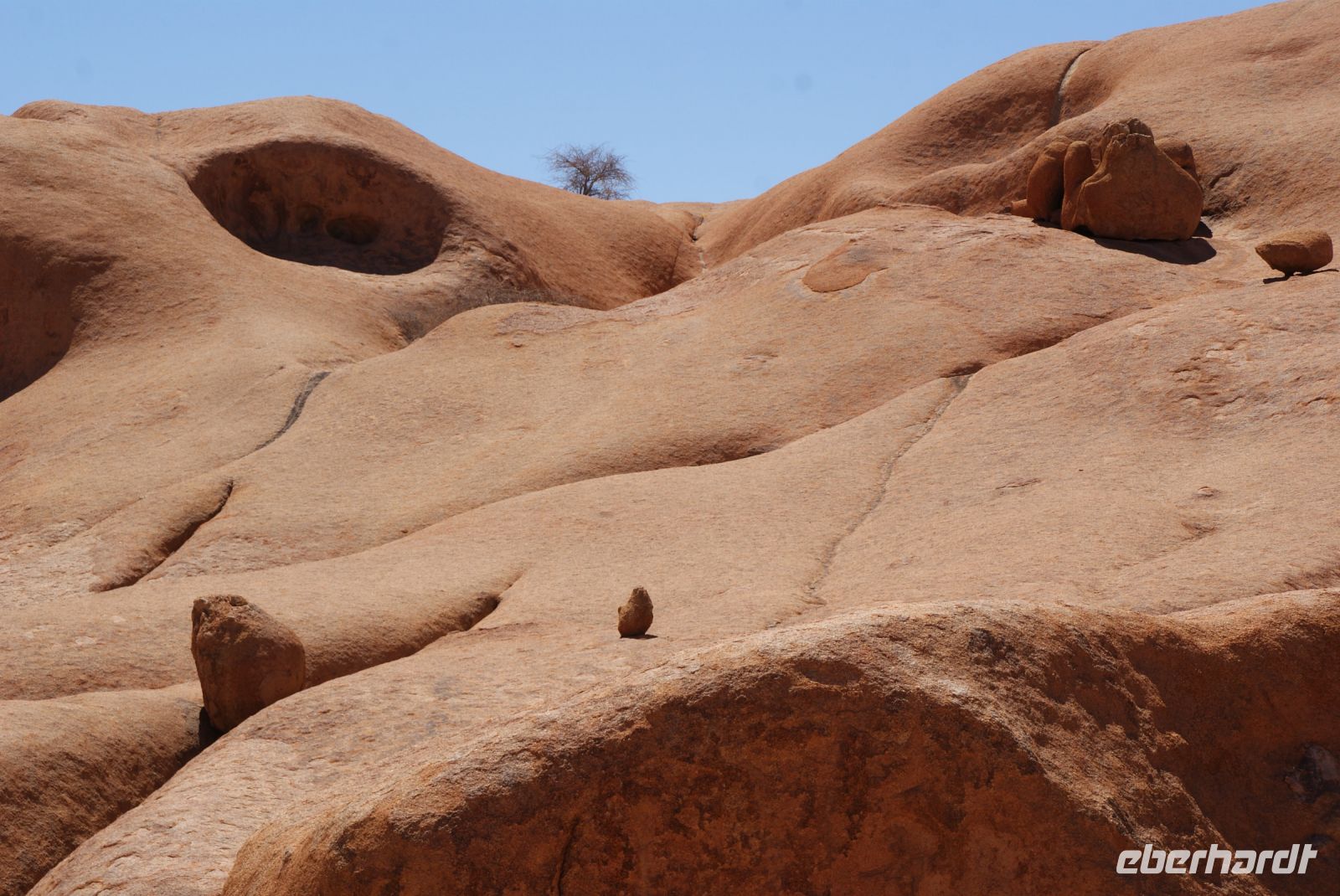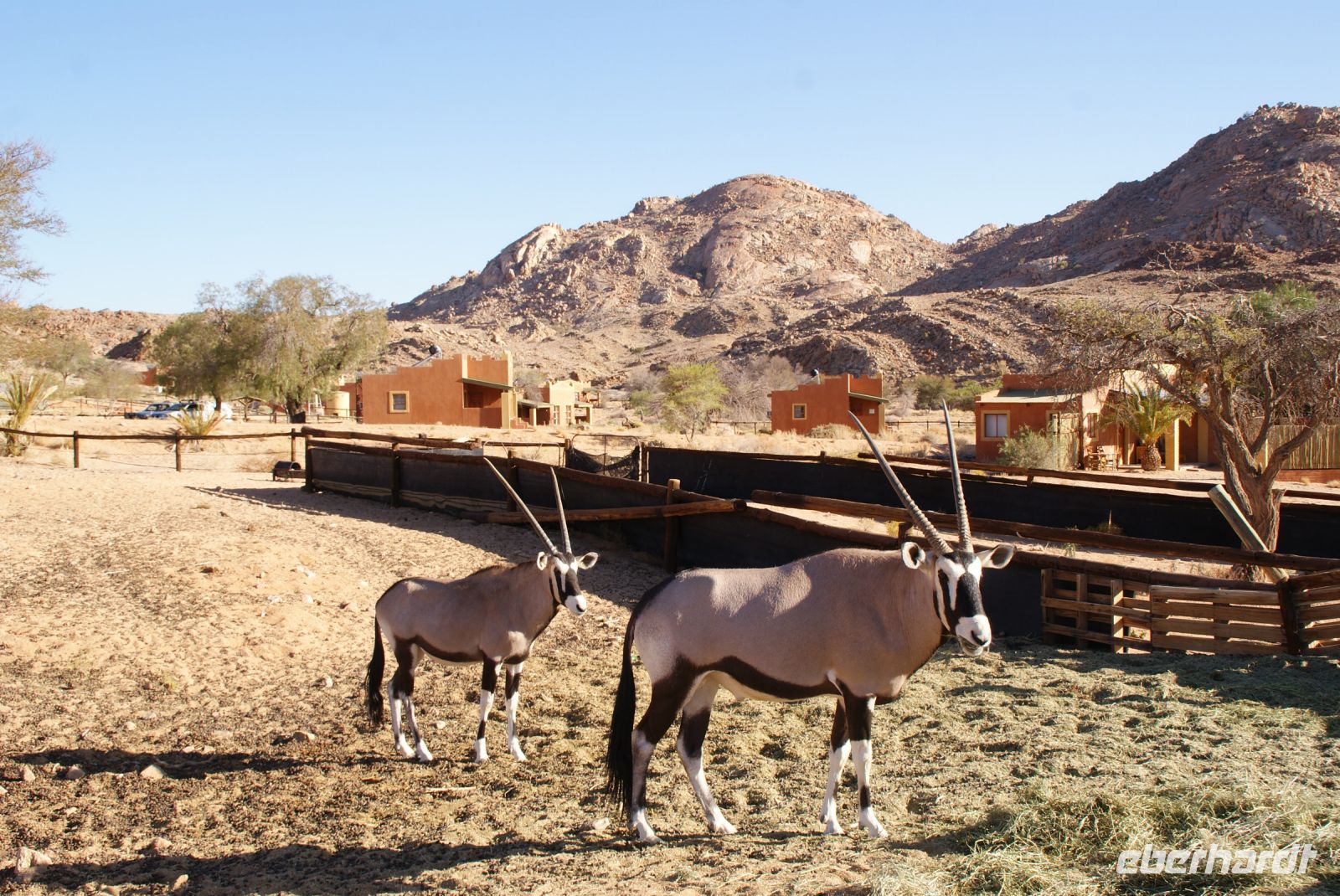 Nach einem erneut fürstlichen Frühstück verlassen wir Swakopmund, welches sich heute wettertechnisch sehr trüb und noch verschlafener als gestern zeigt. Nach einer Stunde Fahrt ist die namibische Wetterwelt wieder in Ordnung mit strahlendem Sonnenschein und wolkenlosem Himmel. In der Ferne ist bereits die Spitzkuppe zu sehen, an die wir heute ganz nah heranfahren werden. Diese ist 1728 m hoch umrahmt von den Pontok Bergen. Zuvor halten wir jedoch zu einer kleinen Klettertour zum Rock Arch, einem bogenartigen Felsen, der mit vielen anderen ein wunderbares Panorama bietet. Hier warten bereits so manche Rotaugen Büll Büll’s und Bergstare auf uns und beglücken uns mit lieblichem Gesang. An der Spitzkuppe angekommen durchfahren wir die Region und stoppen für diverse Fotoaufnahmen. Den Abschluss bildet eine kurze Führung durch Buschmann Dennis, der uns die Jahrtausend alten Felszeichnungen der Buschmänner näher bringt. Wir erfahren viele interessante Dinge, wie einst Informationen ohne Schrift untereinander weitergegeben wurden. Als Farben wurden einst Steine zermahlen und mit Rinderblut vermengt sowie dem klebrigen Saft der Euphorbien, mit Kot der Klippschliefer vermischt. So erhielten die Buschmänner rote, orangefarbene und weiße Farbe für ihre Felszeichnungen. Diese wurden an geschützten Bereichen auf einem Felsen angebracht und dienten der Orientierung darüber, welche Tiere sich in der Region aufhielten und wo Wasser zu finden war. Unsere weitere Tour führt uns zu Usakos, wo wir einen Mittagssnack und ein kühles Getränk zu uns nehmen, bevor wir am Nachmittag in der wunderbar der Natur angepassten Ai Aiba Rock Painting Lodge eintreffen. Wir beziehen unsere riesigen Zimmer, genießen einen Kaffee mit herrlichem Blick in die weite Natur und treffen uns dann zu einem Sundowner Walk wieder. Mit Guide Deon spazieren wir zunächst gemächlich einen schönen Feldweg entlang. Auf diesem zeigt er uns bereits diverse Tierspuren, die wir ohne ihn nie entdeckt hätten. So passieren wir die Fußabdrücke von Ameisenbär, Leopard und Pavianen, vom Spinnennest mal ganz abgesehen. Danach geht es steil nach oben. Auf dem Gipfel angekommen haben wir eine grandiose Aussicht auf die umliegende Umgebung und sehen unsere schöne Lodge vor uns in der Tiefe. Nach einem leckeren Getränk und mit Blick auf die untergehende Sonne begeben wir uns vorsichtig auf den Weg nach unten und wohlbehalten geht es von dort zu einem vorzüglichen Abendessen.