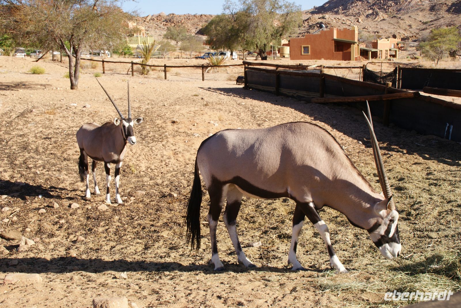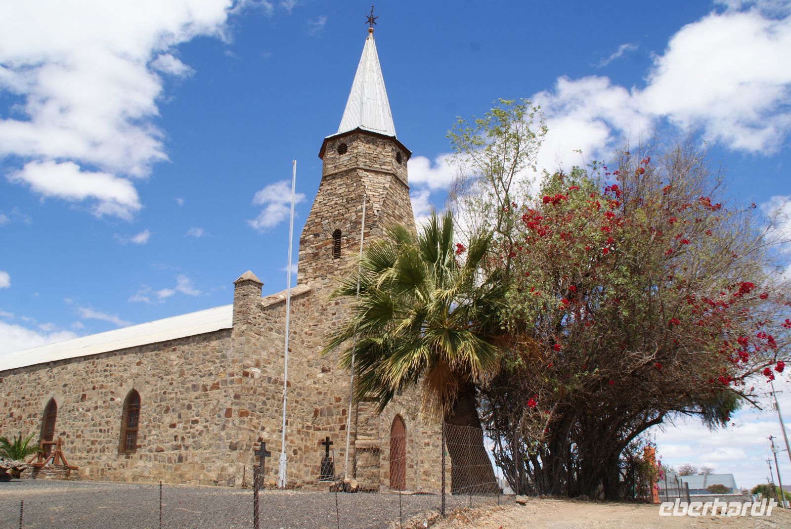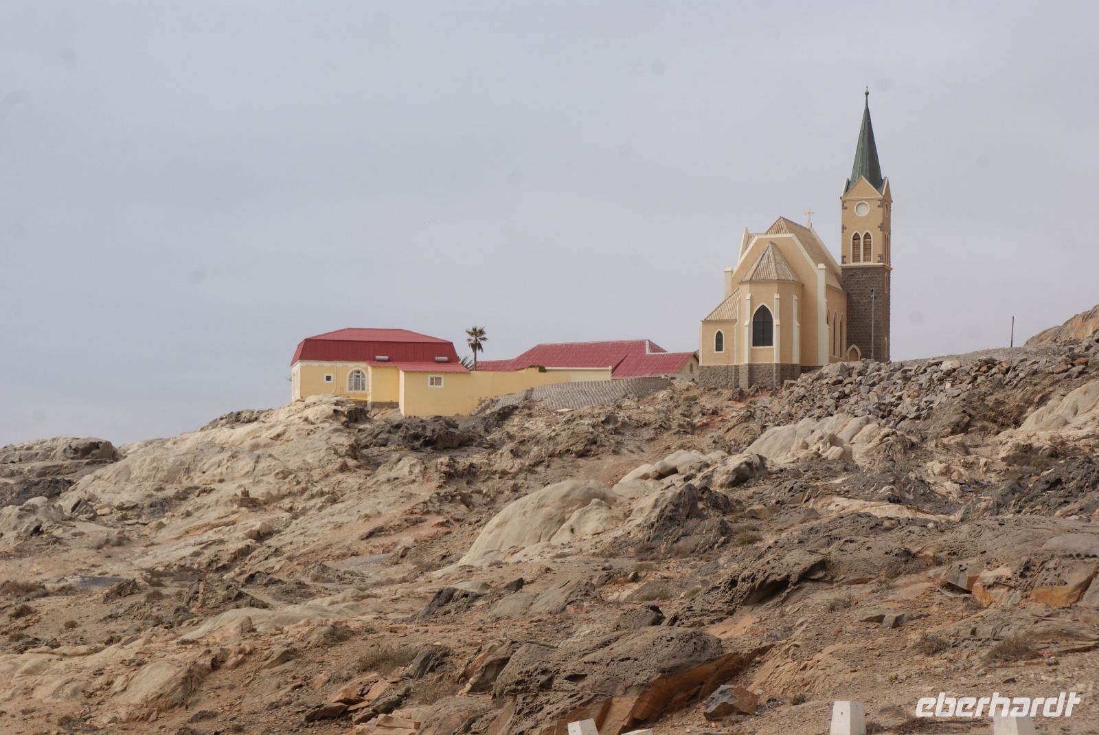 Nach einer herrlichen Nacht mit viel frischer Luft treffen wir uns zum tollen Frühstück mit frisch gebackenem Brot und vielen Köstlichkeiten wieder. Unser heutiger Tagesausflug führt uns zunächst in die Diamantenstadt Kolmanskuppe, bei der wir eine deutsche Führung erhalten. Dieser Ort mit damals ca. 350 Bewohnern existierte von 1908 bis 1958 und hier lebten die Menschen, die vom einstigen Diamantenrausch profitierten. Die Diamanten wurden einst von Südafrika über den Atlantik an Land gespült und sorgten hier für einen wahrlichen Boom. Bereits von 1908 bis 1914 fand man hier 20 % des weltweit existierenden Diamantenvorkommens. Das gesamte Sperrgebiet, auf dem sich die Siedlung befand, ist 115 Km breit und 150 Km lang. Unsere Führerin Fabienne, die als Namibierin fließend Deutsch spricht, zeigt uns diverse Gebäude. Wir starten in der Turnhalle, gefolgt von dem Haus des Ladenbesitzers, welches im Originalstil wieder renoviert wurde. Weiter geht die Führung zur Eisfabrik, wo für so manche Kühlung produziert wurde, zur Räucherei, sie zeigt uns das Haus des Minendirektors, des Ingenieurs, des Quartiermeisters, des Lehrers, des Architekten und des Buchhalters. All diese sind namentlich beschriftet und man kann in die verlassenen Häuser einen Blick hineinwerfen. Es ist sehr imposant, wie sich hier die Natur breit macht und ihr Territorium zurückerobert. Im ehemaligen Speisesaal befindet sich heute ein kleines Museum mit vielen Bildern und sehr interessanten Exponaten. Wir gehen selbst lieber hier nicht auf Diamantensuche, denn wer illegal etwas einsteckt, wird mit 10 Jahren Gefängnis und 1 Million NAD bestraft. Somit lassen wir es… Unseren Mittagsstopp machen wir heute in der Küstenstadt Lüderitz, welche 1886 nach Adolph Lüderitz, dem Gründer, benannt wurde. Zunächst steuern wir jedoch das ca. 17 Km außerhalb liegende Dias-Kreuz an. Dieses stellte im Jahre 1487 Bartholomae Dias, portugiesischer Seefahrer und Entdecker, auf, als er mit seiner Besatzung als erster Europäer an Land ging, um nach Frischwasser zu suchen. Hier weht ein kühles Lüftchen, so ganz anders als im Inland und wir sind froh uns für den Tag warm angezogen zu haben! So erklimmen wir das Dias-Kreuz und lassen die stürmische Küste auf uns wirken. In der unter uns liegenden Bucht tummeln sich Robben und auch so mancher Flamingo ist hier auf Futtersuche. Nochmals halten wir an der großen Bucht zu einem Fotostopp und begeben uns dann in das verschlafene Städtchen Lüderitz. Dieses liegt beschaulich am Atlantik und es finden sich noch so einige wunderschöne Häuser aus vergangener Zeit. So sehen wir das stattliche Haus Goerke aus dem Jahre 1905, welches Leutnant Hans Goerke errichten ließ, das Woermanns Haus, welches einst eine Reederei war und natürlich das Wahrzeichen der Stadt- die 1912 erbaute Felsenkirche. Mittags kosten so manche von uns die hiesigen Fischspezialitäten und bei Austern und Co. genießen wir diesen so anderen Tag hier in Namibia. Auf dem Rückweg nach Aus halten wir nochmals Ausschau nach den Wildpferden, die sich heute jedoch auch nicht blicken lassen. Dafür werden wir mit einer Oryx Familie in unserer Anlage entschädigt, die hier völlig zahm auf einer Weide stehen und wir herrlich nah fotografieren können.