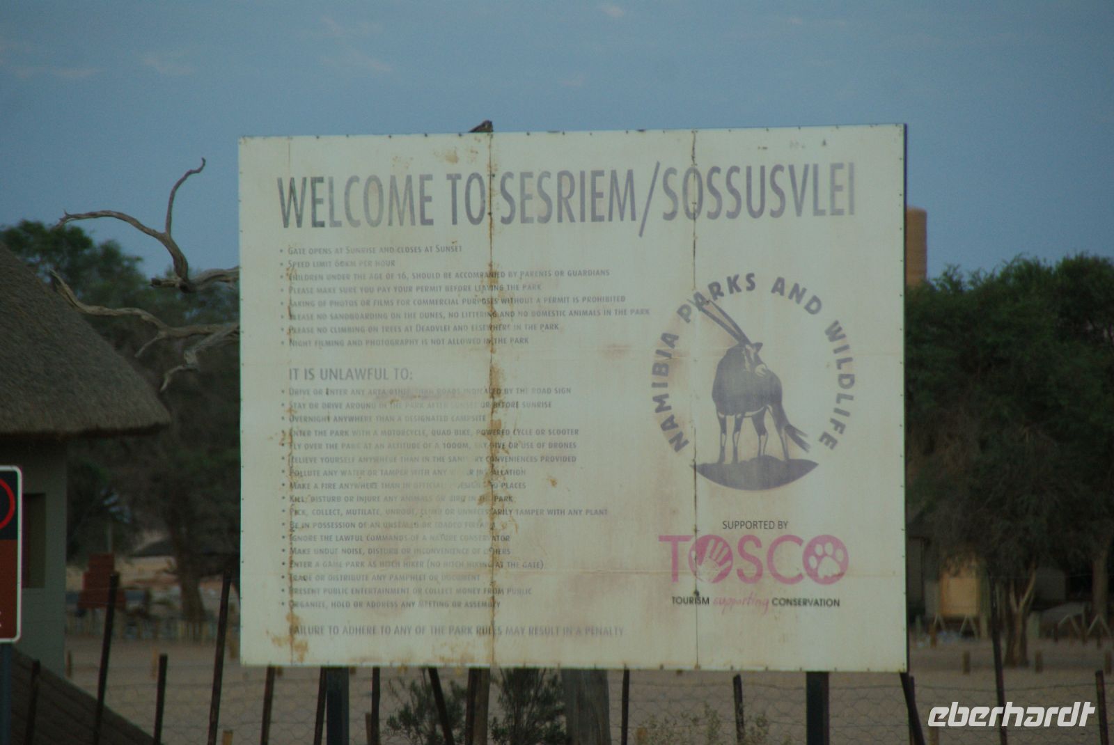 Heute heißt es zeitig aufstehen und mit gepackten Frühstückspaketen verlassen wir um 05.45 Uhr unsere Unterkunft. Ziel ist es, das tolle Licht und Schattenspiel der Dünen und somit des Weltnaturerbes im Namib Naukluft Nationalpark zu erleben. Um 06.15 Uhr öffnet das Gate des Parks und wir fahren als 6. Fahrzeug hinein. Durch den Sonnenaufgang sieht man nun die Dünen mit einer Seite der Sonne zugewandt und die andere Seite im Schatten liegend. Daher ergibt sich eine zweifarbige Sicht auf dieses Wunder der Natur. Von Herbert hören wir, dass die Dünen der Namib rot gefärbt sind, da diese Metallbestandteile enthalten, die im Grunde verrosten. Dieses Phänomen ist einzigartig auf der Welt und wir haben die Ehre, dies heute live zu erleben. Der Sand in diesem Wüstenbereich kommt über die Strömung des Oranje Flusses hierher und wird wiederum vom Wind an Land gespült. Einen Teil unserer heutigen Strecke legen wir im Park auch mit unserem Fahrzeug zurück, steigen jedoch an einem Parkplatz in einen Allrad-Jeep um, der uns die letzten Kilometer in die Nähe des Dead Vleis bringt. Von hier an geht es zu Fuß für uns weiter… Die höchste der hiesigen Dünen, genannt „Big Daddy“ misst stattliche 300 m, von denen wir ca. 150 m der vorgelagerten Düne erklimmen. Eine wunderbare Wanderung, deren Abgang uns wie die Astronauten nach unten stapfend ins „Dead Vlei“, die tote Senke, führt. Die Gegend hier ist beinahe unwirklich und besitzt einen ganz eigenen Zauber. Auf dem Rückweg werden wir sogar von einem kurzen Regenschauer überrascht, der für uns so gar nicht in die Wüste passt. Am Ausgangspunkt angekommen sind wir längst wieder getrocknet und fahren per Jeep nochmals zum Fotostopp zum sogenannten Sossusvlei, welches so viel wie „wo sich Wasser sammelt und längere Zeit steht“ bedeutet. Der weitere Programmverlauf führt uns zum Sesriem Canyon. Dieser ist ca. 30 Millionen Jahre alt, 1,6 Km lang und ca. 30 m tief. Den Namen erhielt er von den damaligen Ochsenwagenfahrern, die hierherkamen, um Wasser zu holen. Sie ließen sechs Riemen (sesriem auf afrikaans) in die Schlucht, um Kübel mit Wasser nach oben zu schaffen. Einige von uns machen sich auf den Weg, um dieses Naturphänomen zu Fuß zu erkunden. Es bietet sich eine auch hier unwirkliche Kulisse, in der wir ganz für uns alleine unterwegs sind. Nachmittags erreichen wir wieder unsere Unterkunft und können wieder in Ruhe den restlichen Tag beim kühlen Bier, am schön gelegenen Swimmingpool und natürlich später bei einem sehr leckeren Abendessen genießen.