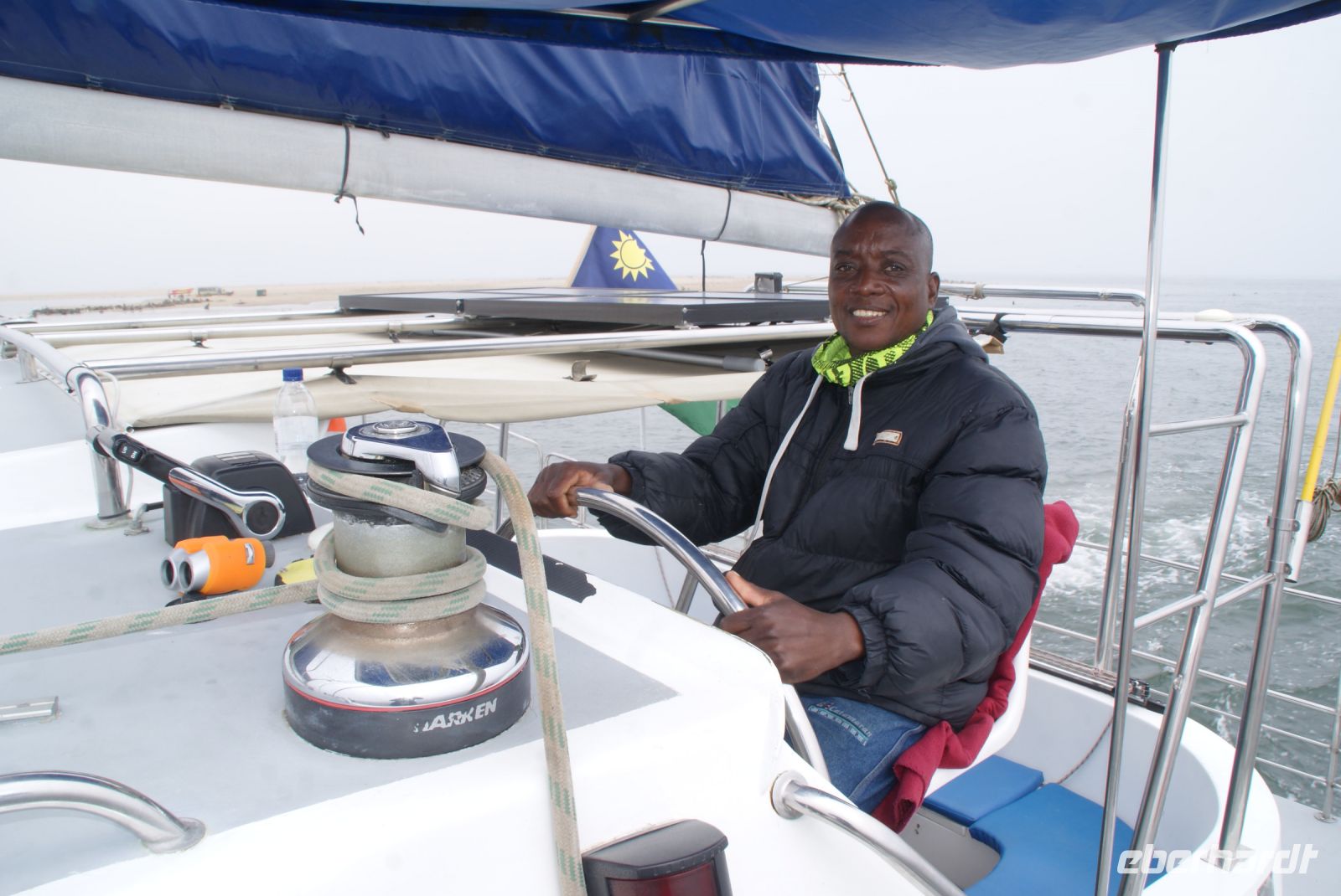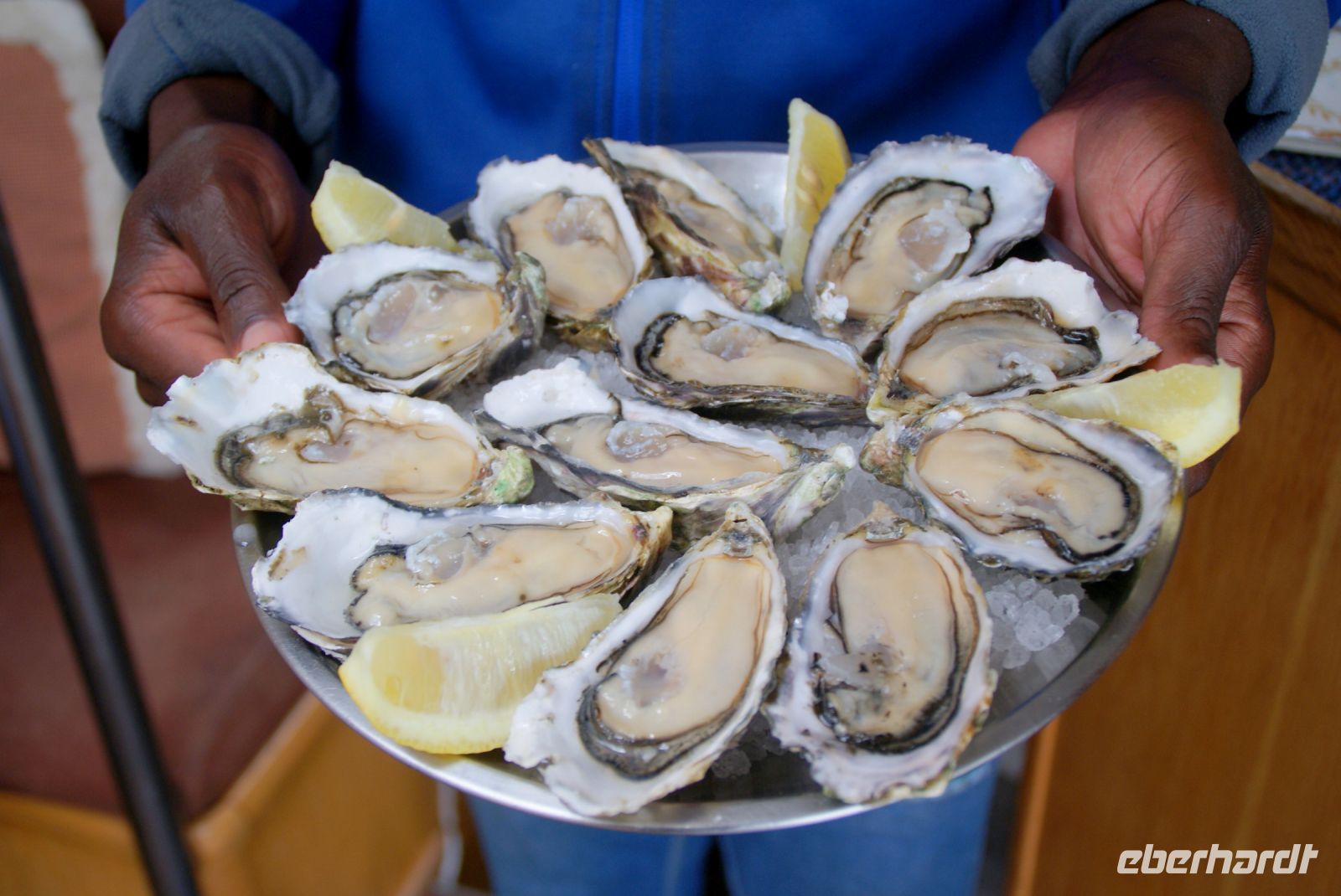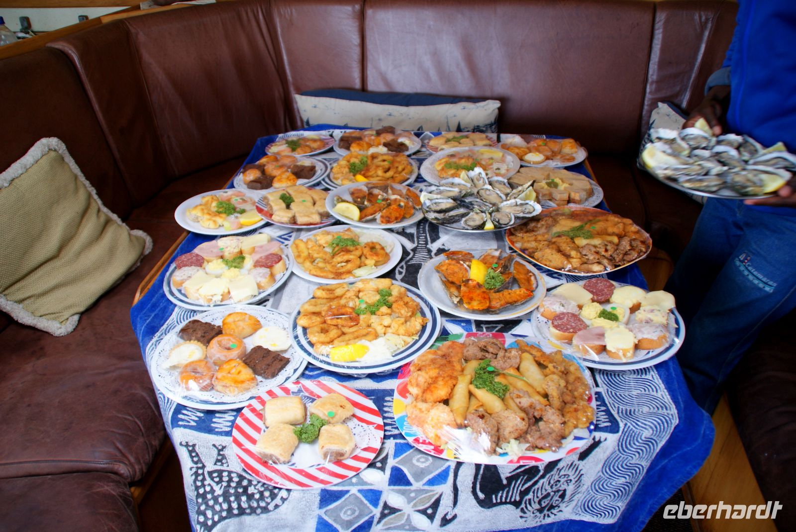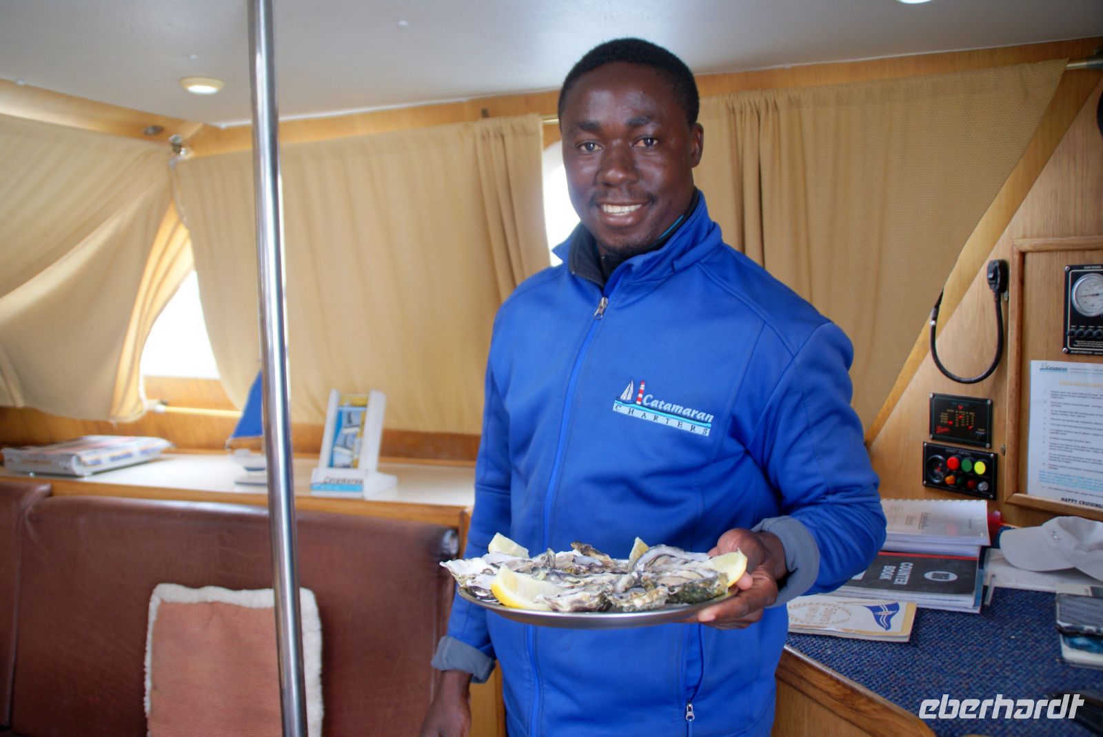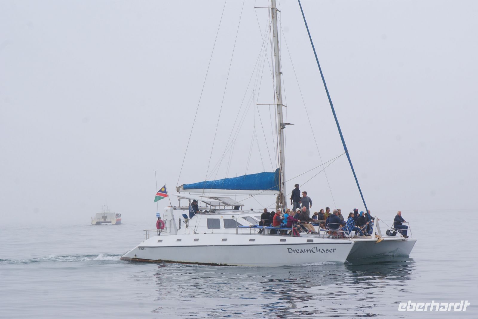 Man kann es nicht anders sagen, es geht uns hier in Namibia auf der Reise so richtig gut. Wieder ein tolles, sehr modernes Hotel mit einem gigantischen Frühstück. So lassen wir es uns mit Sekt und Austern, frisch gebackenem Brot, Käse-und Wurstspezialitäten so richtig gut schmecken… Anschließend fährt uns Herbert nach Walvis Bay, wo wir heute die Bootstour in die Bucht von Walvis Bay gebucht haben. Dank der Pandemie herrscht hier nicht so viel Betrieb wie sonst und so starten wir mit nur insgesamt 18 Personen+ 4-köpfiger Crew hinaus aufs Meer. Zu Beginn finden sich „die üblichen Verdächtigen“ an Bord ein. Ein Seelöwe und mehrere Pelikane warten bereits sehnsüchtig auf die versprochene Portion Fisch und so haben wir viel Spaß diese tollen Tiere aus nächster Nähe an Bord beobachten zu können. Unser Guide auf dem Katamaran heißt Ernst, ein sehr rüstiger mit 78 Jahren älterer Herr, der uns in bestem Deutsch unterhaltsam viele Informationen über das Erlebte und die Bewohner des Meeres nahebringt. Bei ruhiger See sehen wir zunächst viele Seelöwen im Wasser, bis sich der erste Buckelwal zeigt-was für ein Erlebnis! Dieser taucht diverse Male schnaufend auf und großes Oohhh und Aaaaah macht die Runde. Danach lernen wir die (wie Ernst uns vorher scherzhaft erklärte) „Da-Da-Da’s“ und „Wo-Wo-Wo’s“ kennen, gemeint sind nun die Belunguela Delphine, die sich vor und unter unserem Schiff aufhalten. Wir steuern noch eine neue Art hinzu, die „Hier-Hier-Hier’s“…grins. Ein ganzes Stück schwimmen sie mit uns und lassen sich vom Schub unseres Gefährts treiben. Wir steuern eine Landzunge mit einer großen Seelöwenkolonie an und beobachten die possierlichen Tiere und ihr Treiben. Gegen Mittag wird ein tolles Meeresfrüchte-Buffet für uns vorbereitet. So sitzen wir in gemütlicher Runde bei Austern, Calamari, Fisch und Co., dazu ein Glas Sekt-besser kann es nicht gehen. Kurz vor unserer Rückkehr der 3,5-stündigen Tour sehen wir sogar noch den äußerst selten anzutreffenden Mola (Mondfisch), der ganz an unser Boot heranschwimmt-ein unvergessliches Erlebnis. Zurück an Land werden wir bereits von Herbert erwartet, der uns anschließend wieder zurück nach Swakopmund bringt. Am Nachmittag haben wir viel Freizeit, um die heute am Samstag beinahe leere Stadt auf uns wirken zu lassen. So fotografieren wir die schönen Prachtbauten aus der damaligen deutschen Zeit, kehren im berühmten Café Anton ein, probieren die im Land bekannte Schwarzwälder Kirschtorte und schlendern gemächlich durch die Stadt. Abends geht es in ein weiteres tolles Restaurant außer Haus- das „Blue Grass“, wo wir herrlich essen und unseren Aufenthalt im gepflegten Städtchen Swakopmund abschließen.