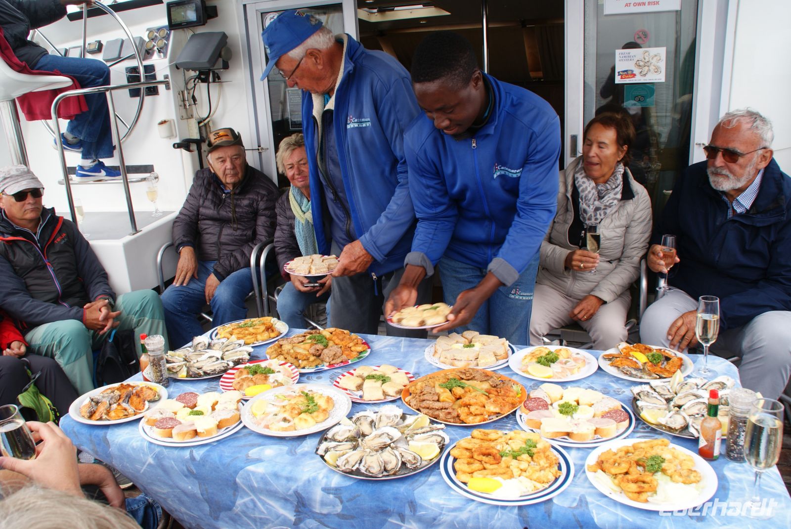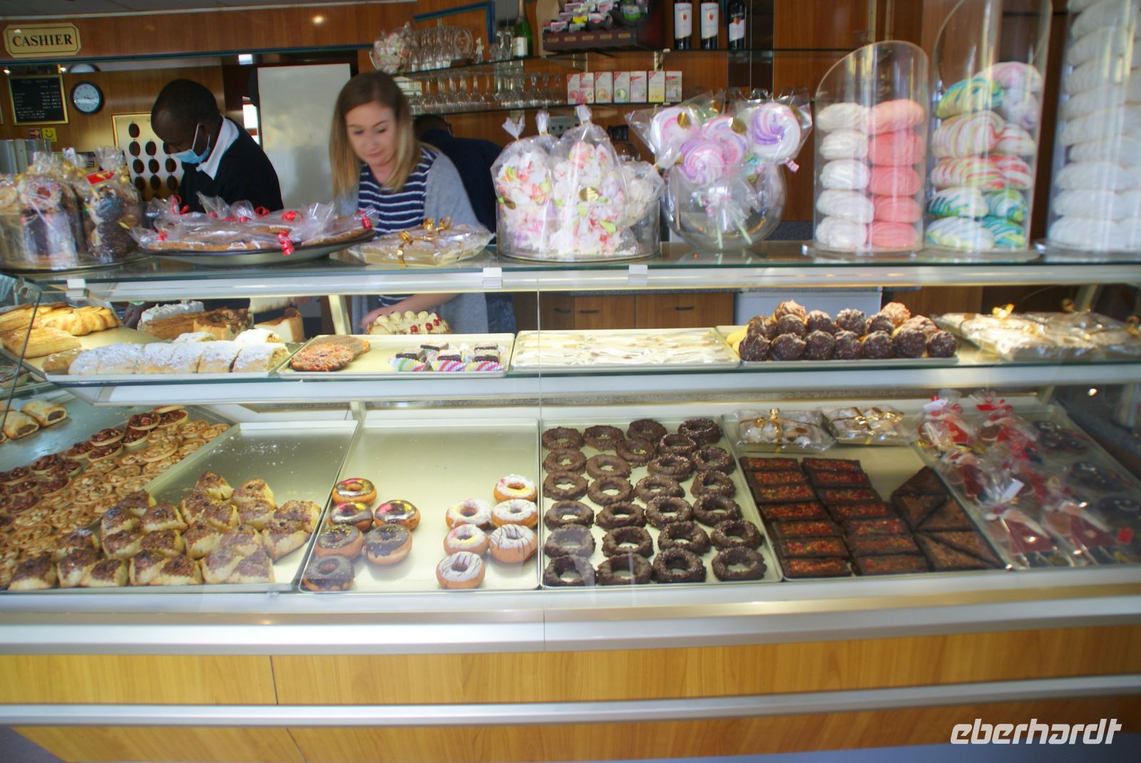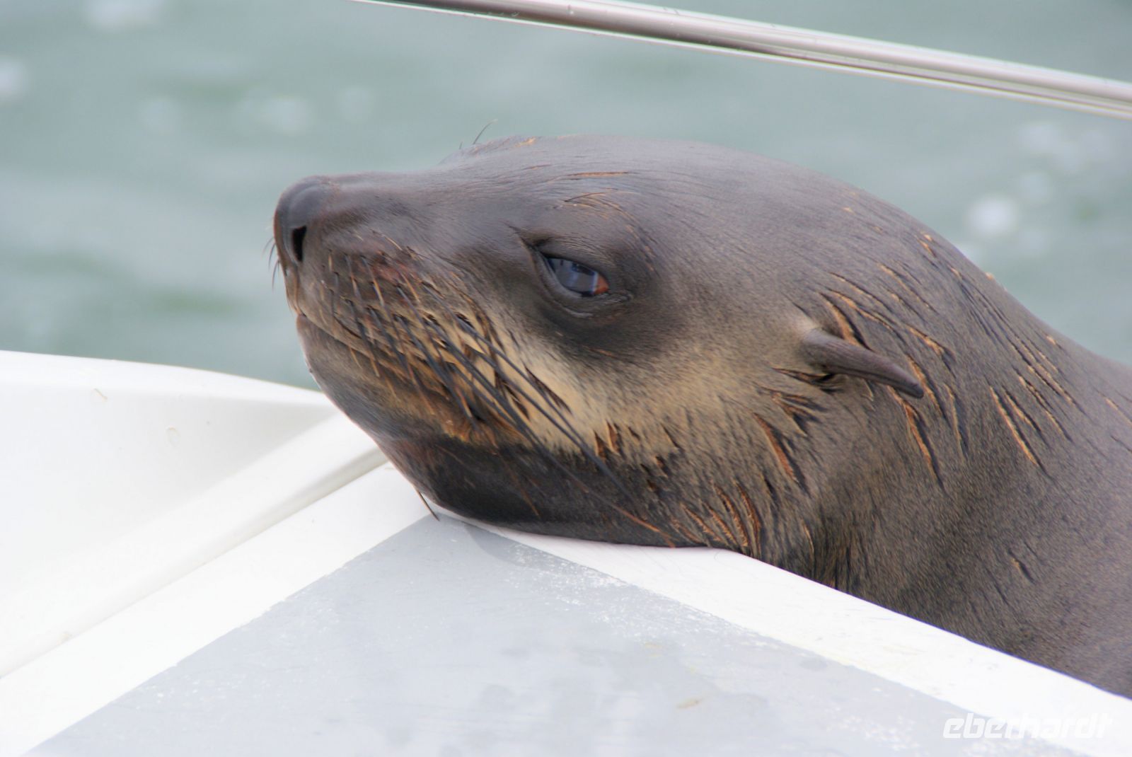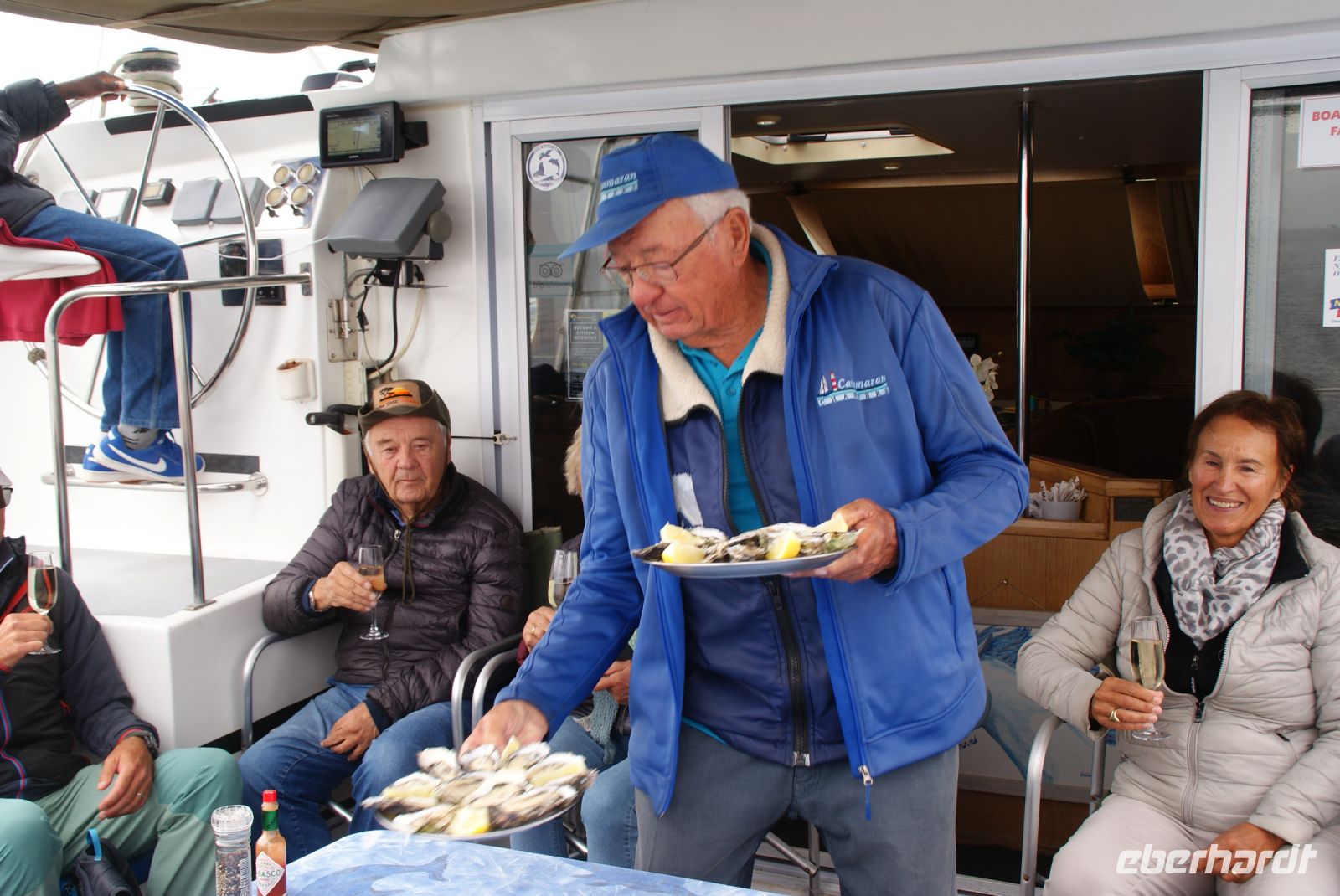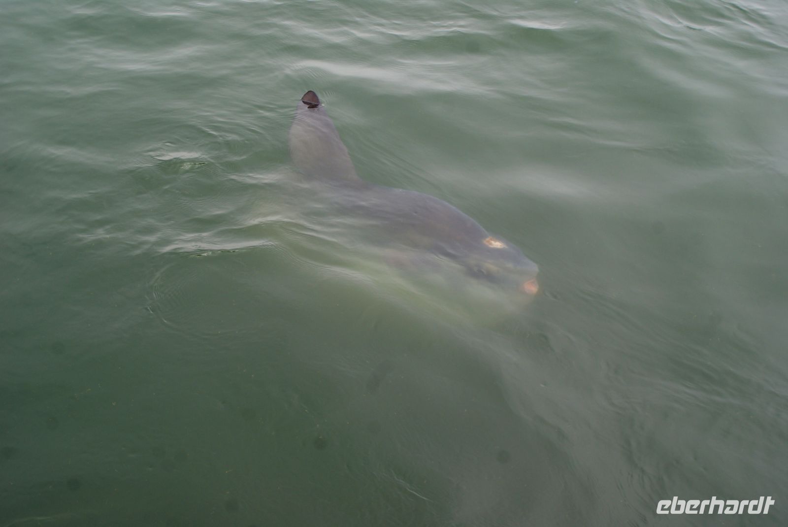 Man kann es nicht anders sagen, es geht uns hier in Namibia auf der Reise so richtig gut. Wieder ein tolles, sehr modernes Hotel mit einem gigantischen Frühstück. So lassen wir es uns mit Sekt und Austern, frisch gebackenem Brot, Käse-und Wurstspezialitäten so richtig gut schmecken… Anschließend fährt uns Herbert nach Walvis Bay, wo wir heute die Bootstour in die Bucht von Walvis Bay gebucht haben. Dank der Pandemie herrscht hier nicht so viel Betrieb wie sonst und so starten wir mit nur insgesamt 18 Personen+ 4-köpfiger Crew hinaus aufs Meer. Zu Beginn finden sich „die üblichen Verdächtigen“ an Bord ein. Ein Seelöwe und mehrere Pelikane warten bereits sehnsüchtig auf die versprochene Portion Fisch und so haben wir viel Spaß diese tollen Tiere aus nächster Nähe an Bord beobachten zu können. Unser Guide auf dem Katamaran heißt Ernst, ein sehr rüstiger mit 78 Jahren älterer Herr, der uns in bestem Deutsch unterhaltsam viele Informationen über das Erlebte und die Bewohner des Meeres nahebringt. Bei ruhiger See sehen wir zunächst viele Seelöwen im Wasser, bis sich der erste Buckelwal zeigt-was für ein Erlebnis! Dieser taucht diverse Male schnaufend auf und großes Oohhh und Aaaaah macht die Runde. Danach lernen wir die (wie Ernst uns vorher scherzhaft erklärte) „Da-Da-Da’s“ und „Wo-Wo-Wo’s“ kennen, gemeint sind nun die Belunguela Delphine, die sich vor und unter unserem Schiff aufhalten. Wir steuern noch eine neue Art hinzu, die „Hier-Hier-Hier’s“…grins. Ein ganzes Stück schwimmen sie mit uns und lassen sich vom Schub unseres Gefährts treiben. Wir steuern eine Landzunge mit einer großen Seelöwenkolonie an und beobachten die possierlichen Tiere und ihr Treiben. Gegen Mittag wird ein tolles Meeresfrüchte-Buffet für uns vorbereitet. So sitzen wir in gemütlicher Runde bei Austern, Calamari, Fisch und Co., dazu ein Glas Sekt-besser kann es nicht gehen. Kurz vor unserer Rückkehr der 3,5-stündigen Tour sehen wir sogar noch den äußerst selten anzutreffenden Mola (Mondfisch), der ganz an unser Boot heranschwimmt-ein unvergessliches Erlebnis. Zurück an Land werden wir bereits von Herbert erwartet, der uns anschließend wieder zurück nach Swakopmund bringt. Am Nachmittag haben wir viel Freizeit, um die heute am Samstag beinahe leere Stadt auf uns wirken zu lassen. So fotografieren wir die schönen Prachtbauten aus der damaligen deutschen Zeit, kehren im berühmten Café Anton ein, probieren die im Land bekannte Schwarzwälder Kirschtorte und schlendern gemächlich durch die Stadt. Abends geht es in ein weiteres tolles Restaurant außer Haus- das „Blue Grass“, wo wir herrlich essen und unseren Aufenthalt im gepflegten Städtchen Swakopmund abschließen.