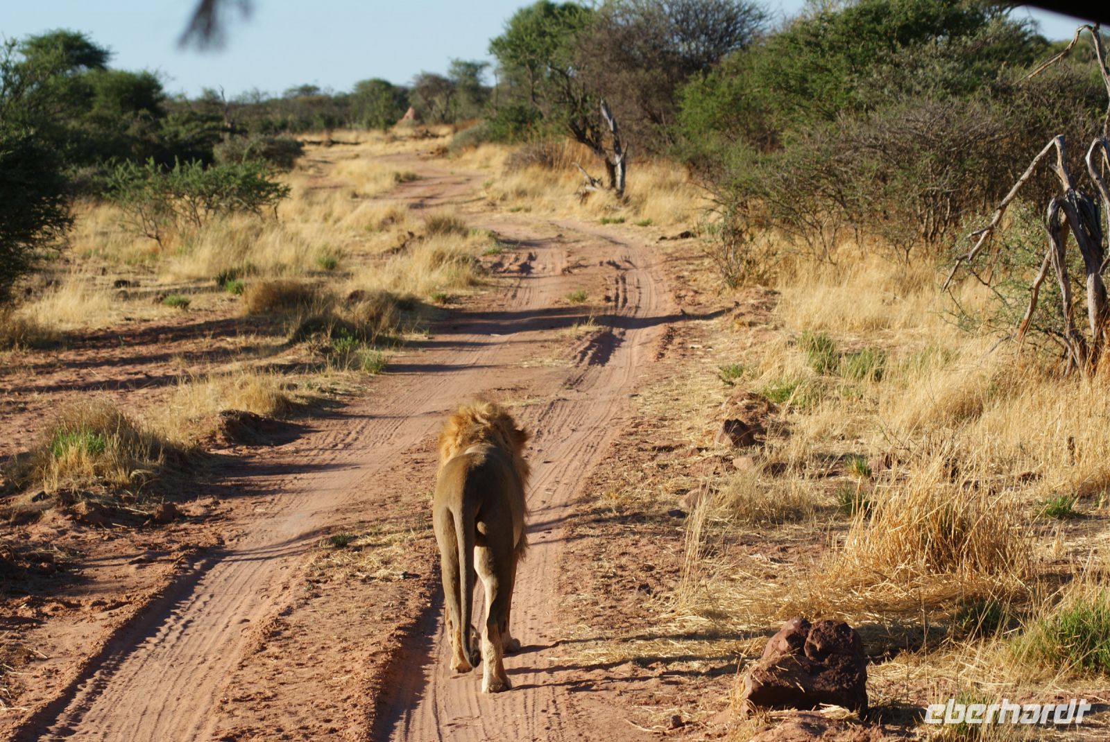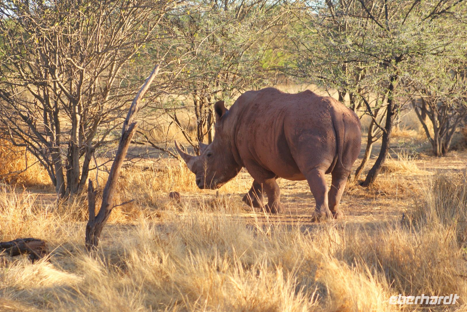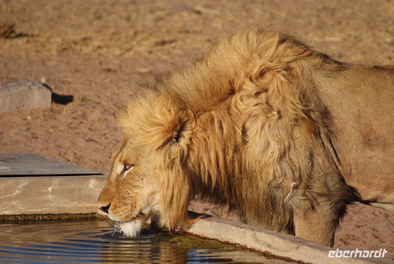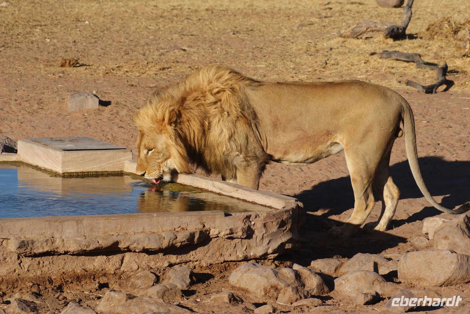 Heute lassen wir es etwas gemütlicher angehen, schlafen eine Stunde länger, frühstücken nochmals fürstlich und begeben uns dann auf den Weg Richtung Mount Etjo. Natürlich müssen wir noch zu besonderen Missionen in Outjo halten, die einen wollen shoppen, andere in die Bäckerei und natürlich zieht Anastasia’s Biergarten magisch an. Letztendlich kommt jeder zu seinem Genuss und alle finden sich im Biergarten zu einem kühlen Getränk ein. Mittags erreichen wir die wunderschöne Mount Etjo Lodge, die malerisch im Okonvati Wildreservat gelegen ist. Der einstige Gründer und Naturschützer Jan Oelofse benannte sie als Ort der Zuflucht (Etjo). Gelegen am weitläufigen sandsteinhaltigen Tafelberg Etjo befinden wir uns nun mitten im Paradies. Zunächst sind wir zu hausgemachtem Kuchen und Kaffee eingeladen, bevor es für uns alle am Nachmittag zu einer letzten Safari in das Reservat geht. Wir haben nochmals wunderbare Tierbeobachtungen, die wir in vollen Zügen genießen und die sich für immer in unser Gedächtnis einbrennen. Abgesehen von der herrlichen Landschaft des Okonvati Wildreservats genießen wir es mit unserem offenen Fahrzeug exklusiv für uns die kleinen Feldwege zu fahren und freuen uns über viele Giraffen, Impalas, Springböcke, Kudus, Vögel etc. Unser Highlight soll natürlich die plötzliche Löwenbegegnung sein, den wir um seinen Mittagsschlaf bringen. Wir wissen nicht, wer mehr erschreckt wurde, er oder wir! So beobachten wir ihn einige Zeit, bis er sich gemütlich auf den Weg zu einem Wasserloch macht. Wir folgen in gebührendem Abstand, wohlgemerkt IN unserem Gefährt. Anschließend das nächste Highlight-wir sehen ein Breitmaulnashorn und dieses ist genauso überrascht wie wir. Eine wunderschöne, wenn auch kurze Begegnung. Ein genüsslicher Sundowner an einem See erfolgt und die Sonne verabschiedet sich vor unseren Augen und wir genießen die friedliche Atmosphäre. Am Abend soll ein besonderes Essen erfolgen. Wir speisen in einer klassischen Boma, einer Rundhütte mit Feuerstelle in der Mitte. Köstliche Wildspezialitäten werden hier für uns exklusiv zubereitet und wir sitzen in rustikaler und gemütlicher Runde beieinander. Einige aus unserer Runde ziehen später noch los zur organisierten Löwenfütterung in der Nähe der Lodge, wo diese für die Besucher gesichert genüsslich ein Warzenschwein verspeisen.