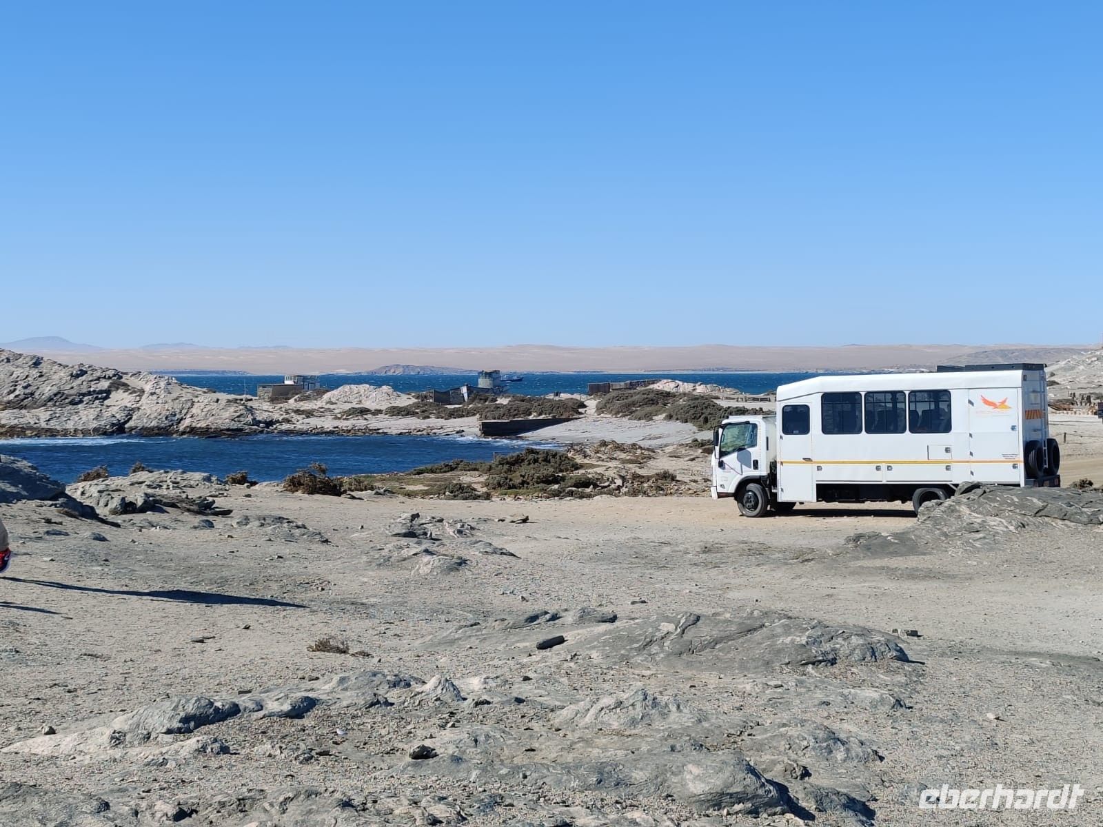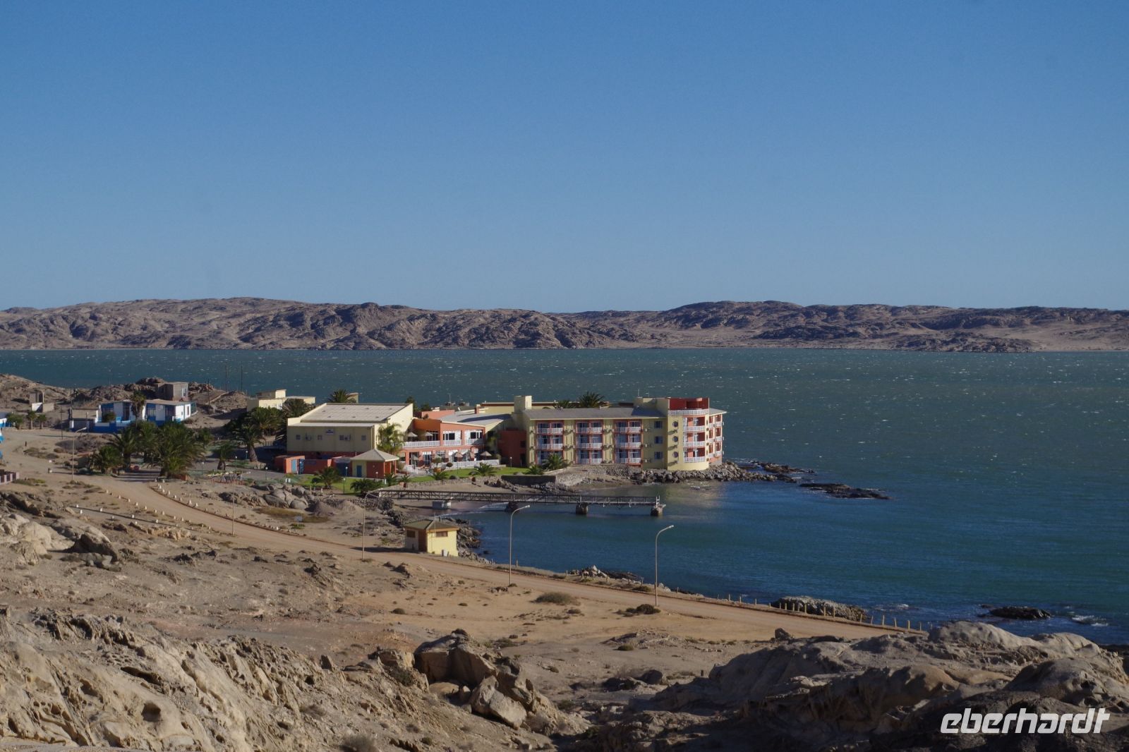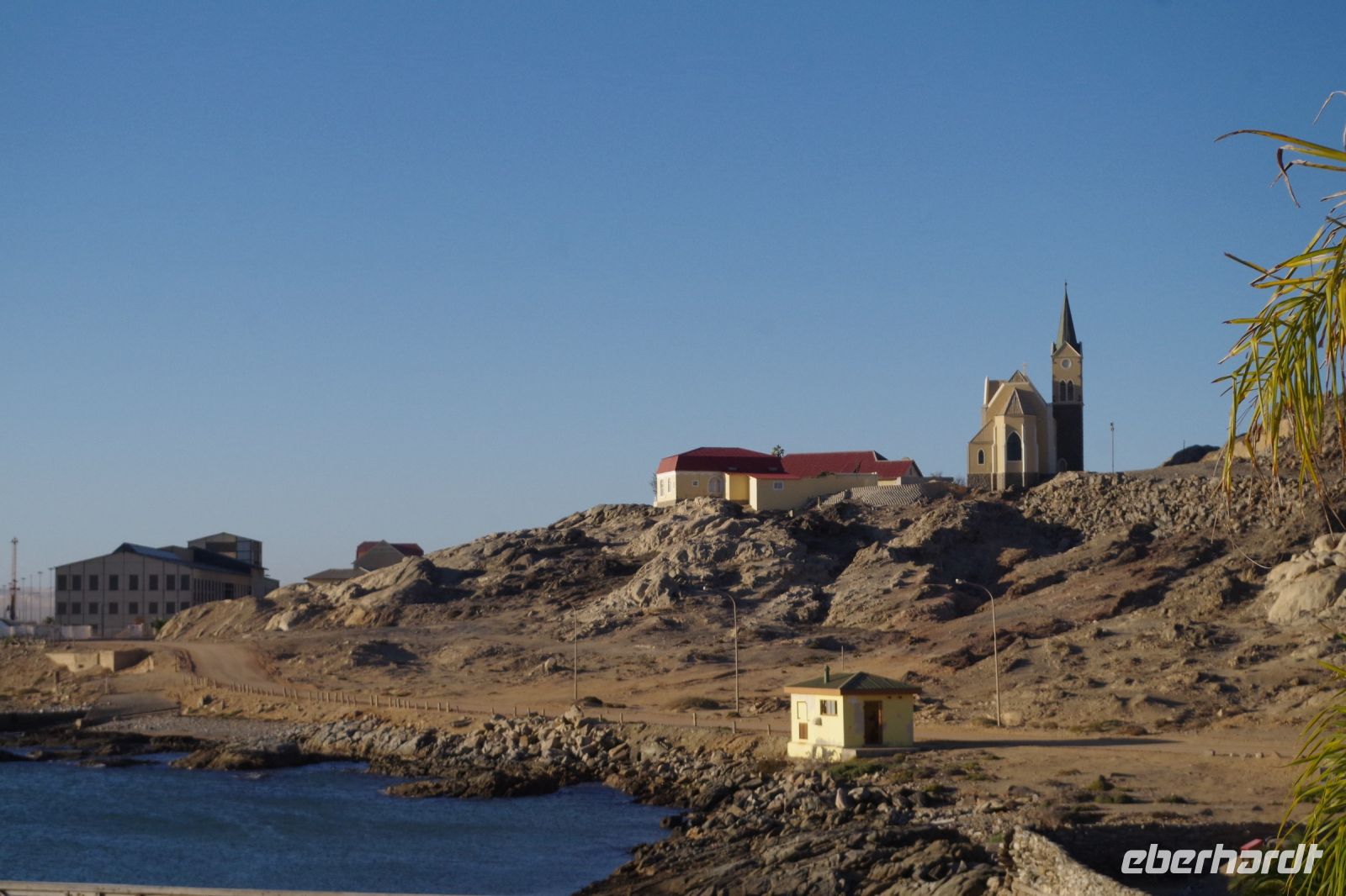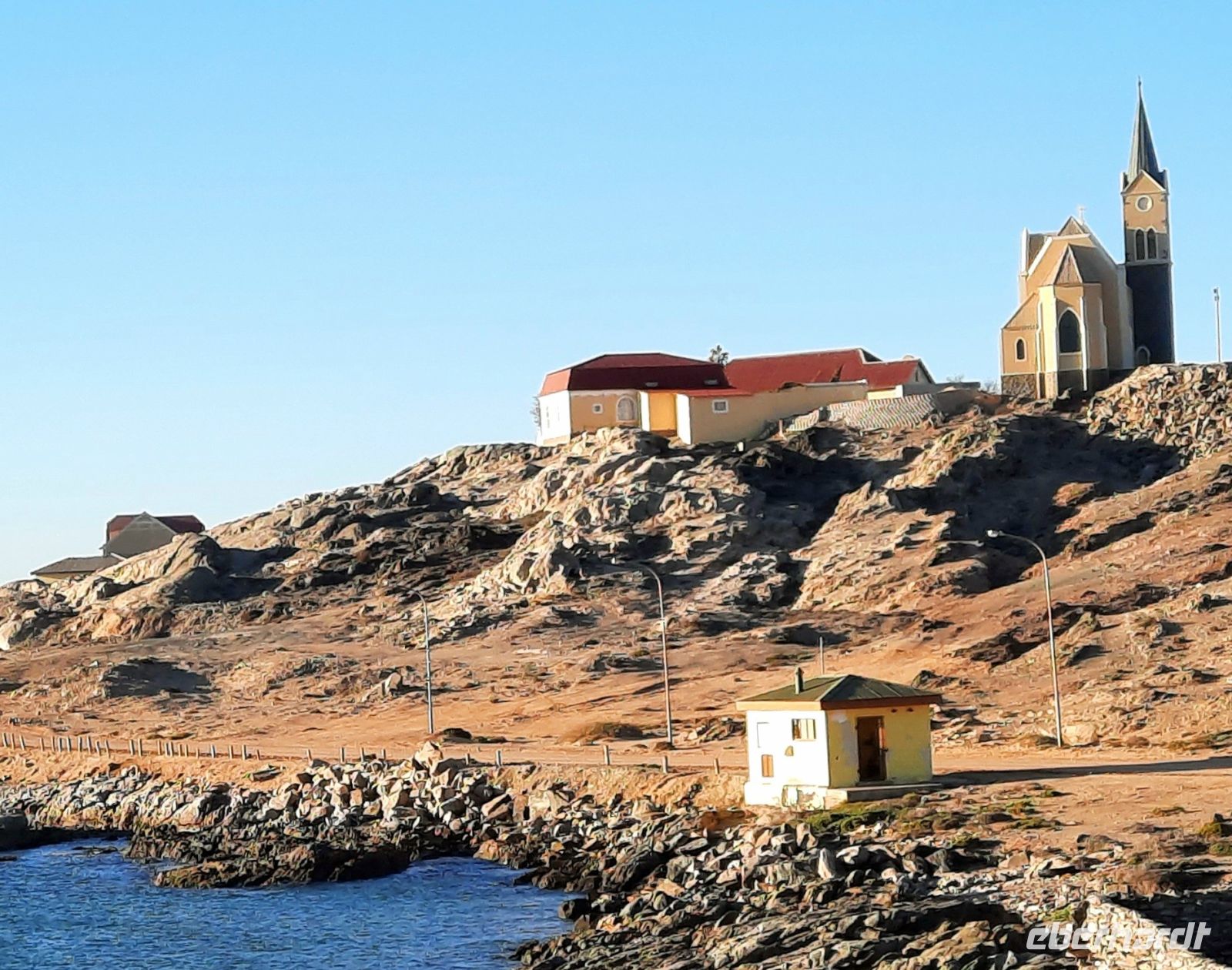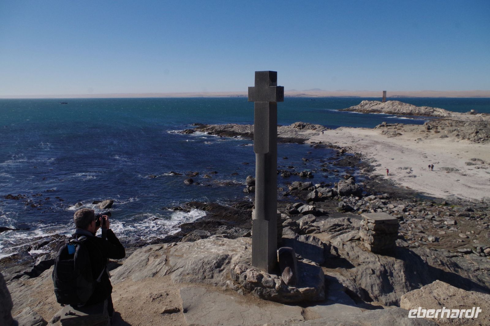 Nach einem guten Frühstück und kurzer Besichtigung der Farm fuhren wir nach Aus Aus raus (schönes Wortspiel). Im alten Bahnhofshotel konnten wir der süßen Versuchung der mächtigen Kuchen nicht widerstehen. Gut gestärkt fuhren wir weiter, unser Ziel Lüderitzbucht. Ein fast schnurgerader Asphaltstreifen mitten durch die Wüste, zu beiden Seiten erstreckt sich eine karge, weite Landschaft, die nur durch ein paar Inselberge durchbrochen wird, links das Diamantensperrgebiet und rechts die Randstufe. Später sahen wir die alte Bahnstation Grasplatz, wo die Eisenbahnmitarbeiter Stauch und Lewala den ersten Diamanten fanden. Danach brach in dieser Gegend ein regelrechter Diamantenrausch aus, ähnlich wie das Klondike-Fieber in Alaska. Es folgte eine Rundfahrt entlang der Buchten durch eine raue Region aus Stein und Wasser. Wir sahen einzelne Flamingos. Unser Ziel war das Diaz-Kreuz, das sich auf einem Felsen befindet. Die Brücke zum Diaz- Kreuz ist nun schon seit Jahren zerstört (durch eine Flut). 1488 ging hier portugiesische Seefahrer Diaz bei seiner Erkundung des Seeweges nach dem Osten als erster Europäer an Land. Das oben aufgestellte Diaz Kreuz ist nur eine Kopie, Teile des Original Kreuzes befinden sich im Deutschen Historischen Museum in Berlin. Danach erkundeten wir das übersichtliche, farbenfrohe und fast Menschen leere Lüderitz (es war Sonntag). Wir erklommen den Diamantberg (fanden aber keine), sahen das Goerke-Haus, die Felsenkirche, die als Wahrzeichen der Stadt gilt und bummelten zum Hafen. Danach checkten wir im Lüderitz Nest Hotel ein. Das Abendessen wurde uns im Hotel serviert.