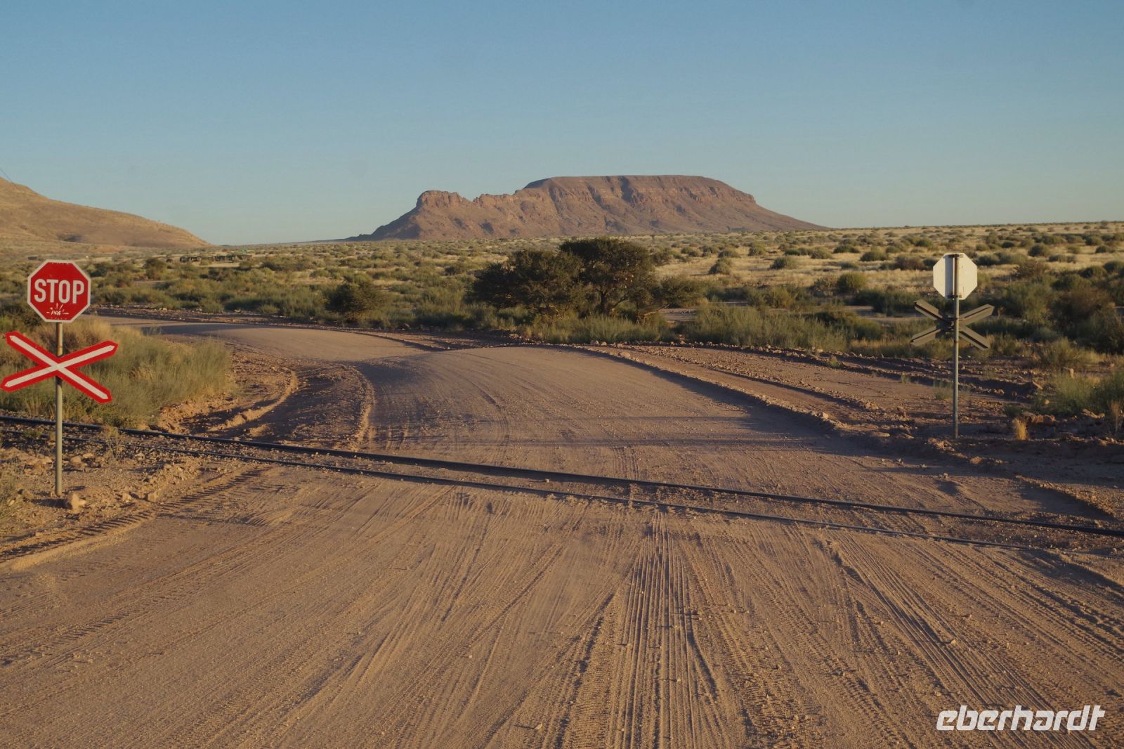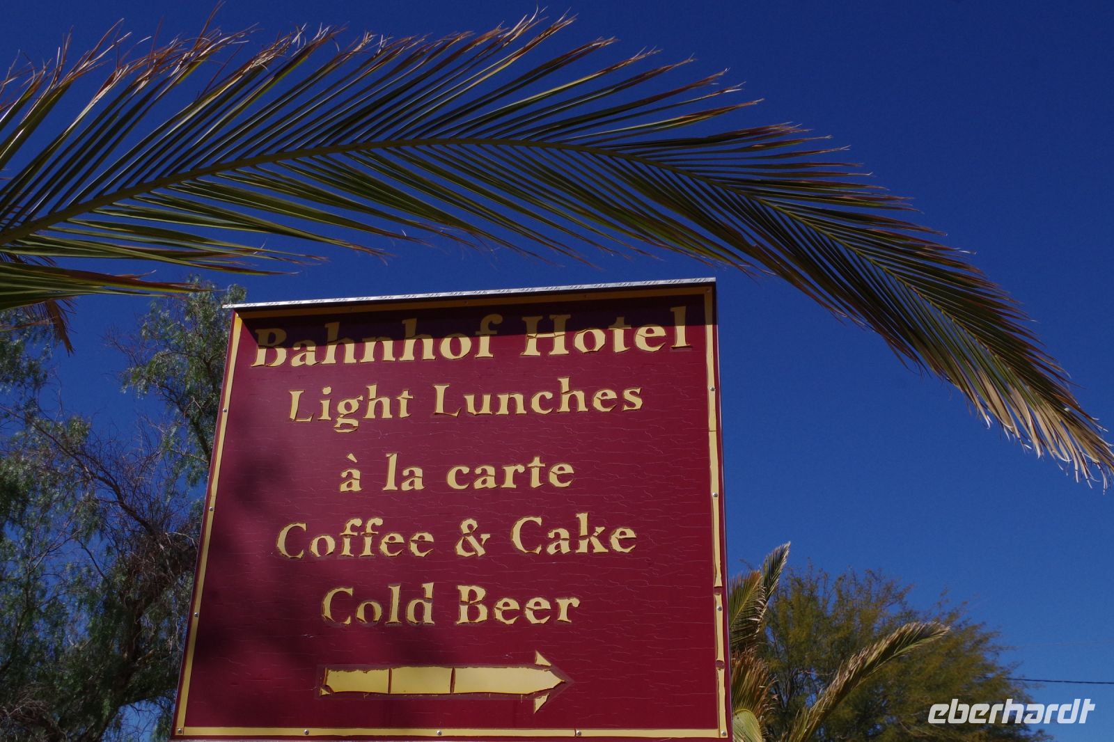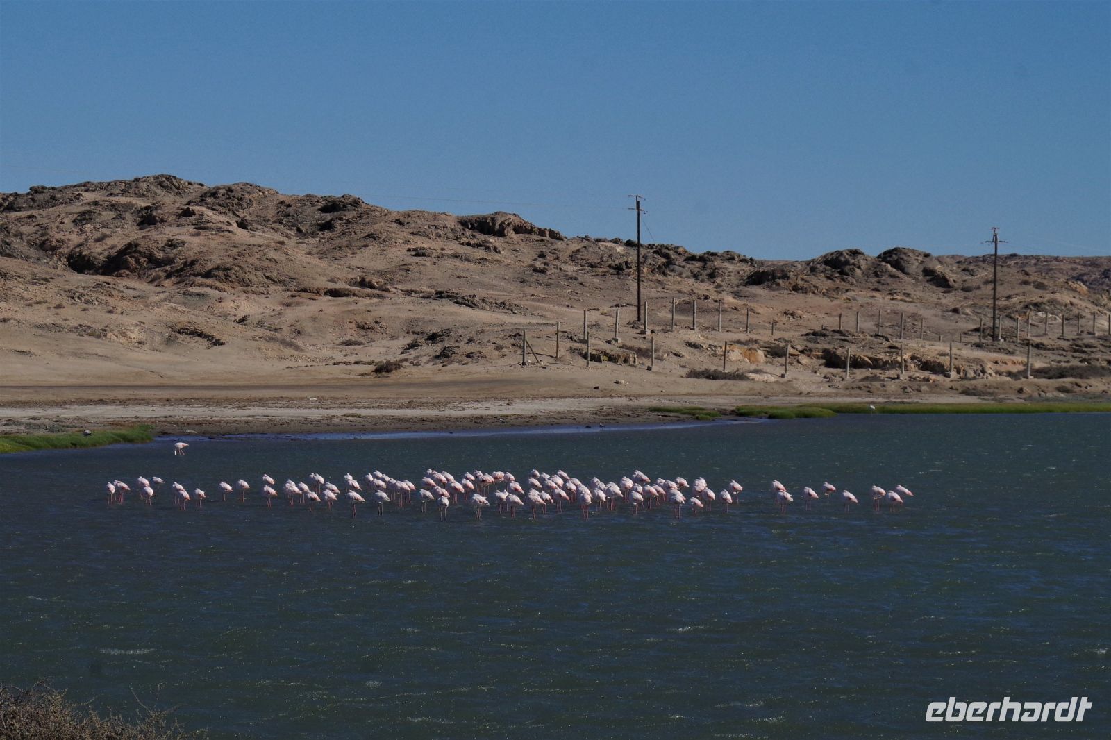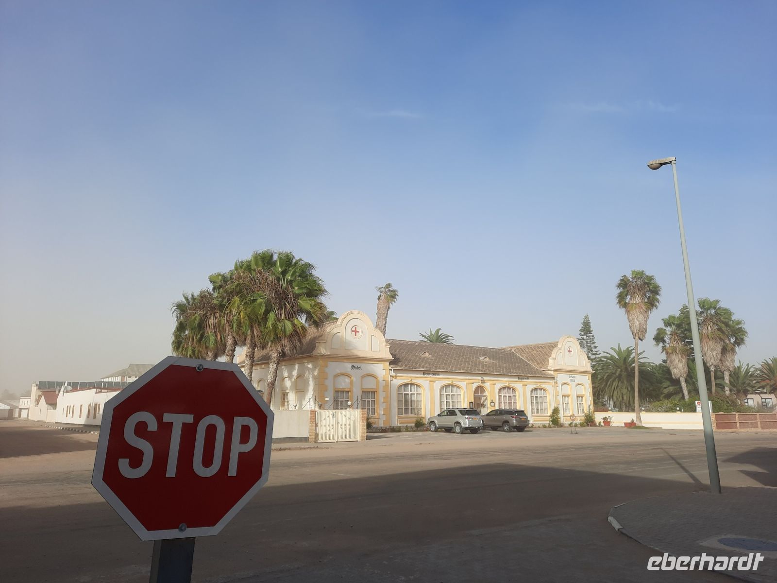 Nach einem guten Frühstück und kurzer Besichtigung der Farm fuhren wir nach Aus Aus raus (schönes Wortspiel). Im alten Bahnhofshotel konnten wir der süßen Versuchung der mächtigen Kuchen nicht widerstehen. Gut gestärkt fuhren wir weiter, unser Ziel Lüderitzbucht. Ein fast schnurgerader Asphaltstreifen mitten durch die Wüste, zu beiden Seiten erstreckt sich eine karge, weite Landschaft, die nur durch ein paar Inselberge durchbrochen wird, links das Diamantensperrgebiet und rechts die Randstufe. Später sahen wir die alte Bahnstation Grasplatz, wo die Eisenbahnmitarbeiter Stauch und Lewala den ersten Diamanten fanden. Danach brach in dieser Gegend ein regelrechter Diamantenrausch aus, ähnlich wie das Klondike-Fieber in Alaska. Es folgte eine Rundfahrt entlang der Buchten durch eine raue Region aus Stein und Wasser. Wir sahen einzelne Flamingos. Unser Ziel war das Diaz-Kreuz, das sich auf einem Felsen befindet. Die Brücke zum Diaz- Kreuz ist nun schon seit Jahren zerstört (durch eine Flut). 1488 ging hier portugiesische Seefahrer Diaz bei seiner Erkundung des Seeweges nach dem Osten als erster Europäer an Land. Das oben aufgestellte Diaz Kreuz ist nur eine Kopie, Teile des Original Kreuzes befinden sich im Deutschen Historischen Museum in Berlin. Danach erkundeten wir das übersichtliche, farbenfrohe und fast Menschen leere Lüderitz (es war Sonntag). Wir erklommen den Diamantberg (fanden aber keine), sahen das Goerke-Haus, die Felsenkirche, die als Wahrzeichen der Stadt gilt und bummelten zum Hafen. Danach checkten wir im Lüderitz Nest Hotel ein. Das Abendessen wurde uns im Hotel serviert.