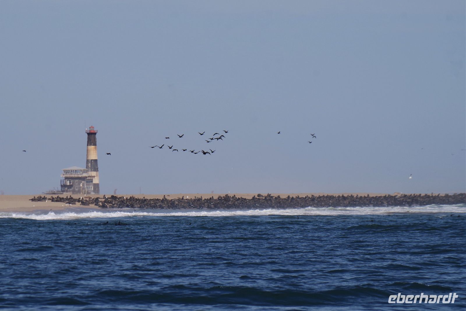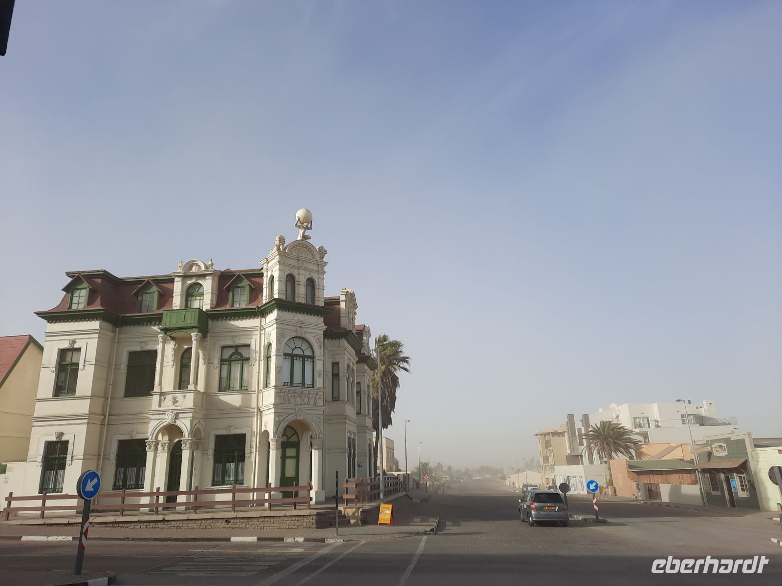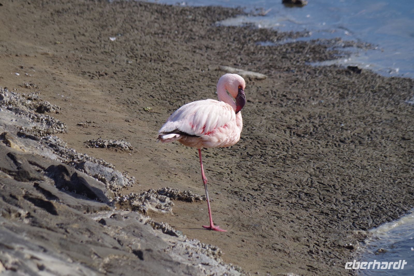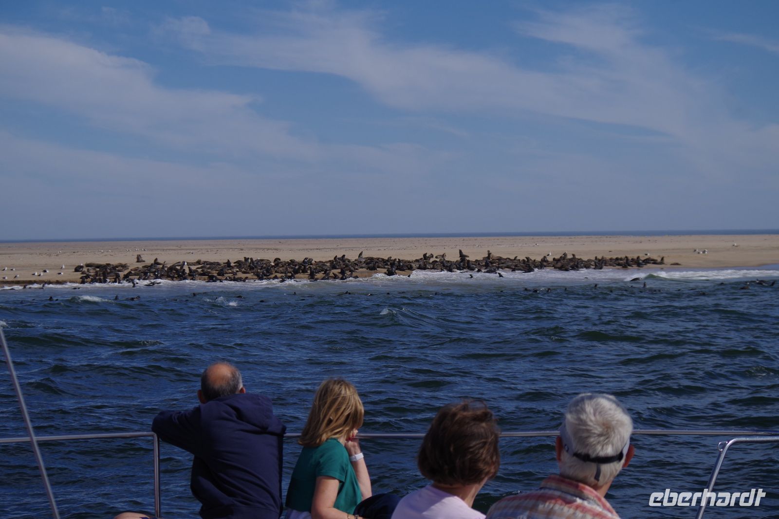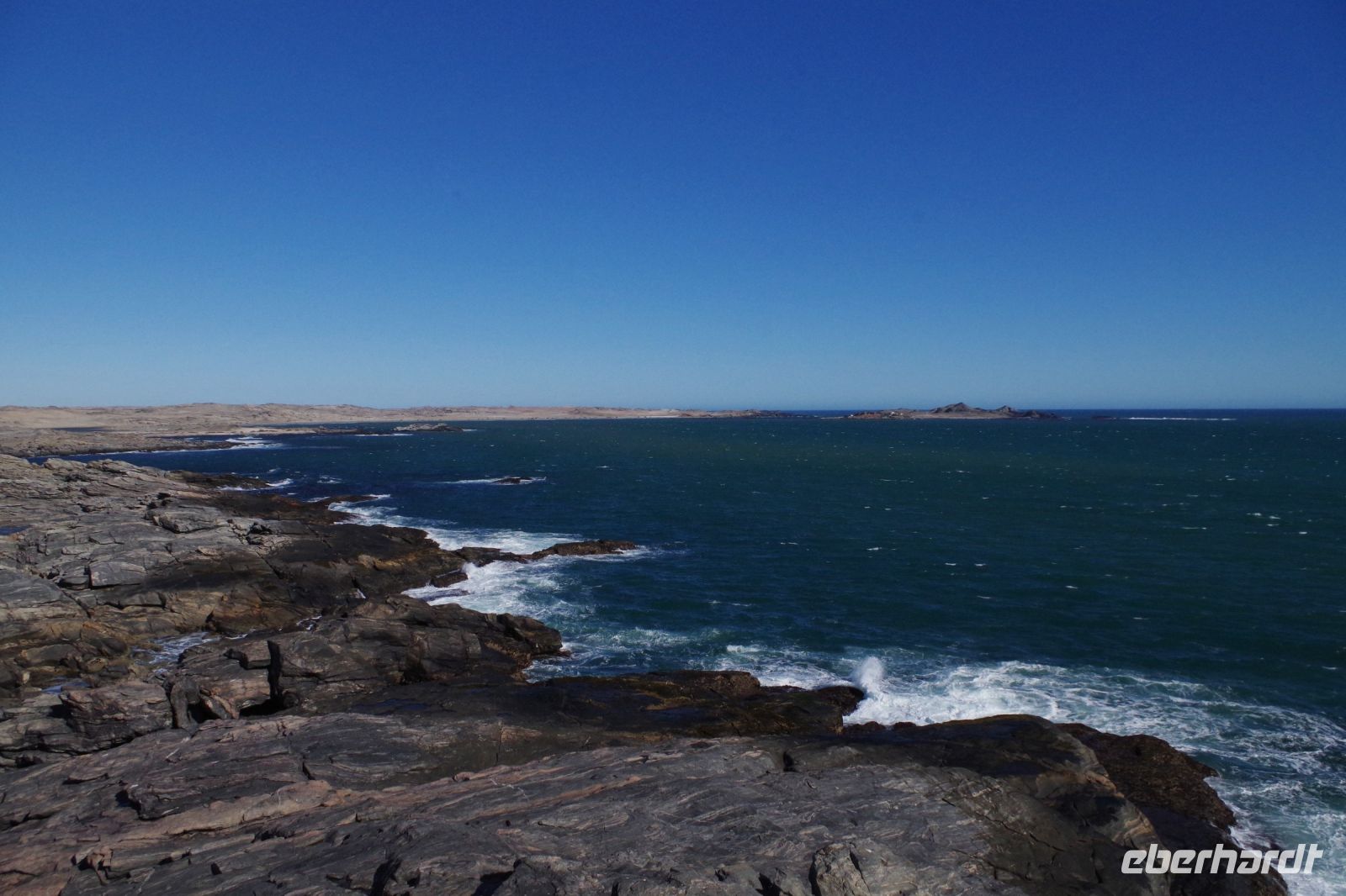 Nach einem guten Frühstück und kurzer Besichtigung der Farm fuhren wir nach Aus Aus raus (schönes Wortspiel). Im alten Bahnhofshotel konnten wir der süßen Versuchung der mächtigen Kuchen nicht widerstehen. Gut gestärkt fuhren wir weiter, unser Ziel Lüderitzbucht. Ein fast schnurgerader Asphaltstreifen mitten durch die Wüste, zu beiden Seiten erstreckt sich eine karge, weite Landschaft, die nur durch ein paar Inselberge durchbrochen wird, links das Diamantensperrgebiet und rechts die Randstufe. Später sahen wir die alte Bahnstation Grasplatz, wo die Eisenbahnmitarbeiter Stauch und Lewala den ersten Diamanten fanden. Danach brach in dieser Gegend ein regelrechter Diamantenrausch aus, ähnlich wie das Klondike-Fieber in Alaska. Es folgte eine Rundfahrt entlang der Buchten durch eine raue Region aus Stein und Wasser. Wir sahen einzelne Flamingos. Unser Ziel war das Diaz-Kreuz, das sich auf einem Felsen befindet. Die Brücke zum Diaz- Kreuz ist nun schon seit Jahren zerstört (durch eine Flut). 1488 ging hier portugiesische Seefahrer Diaz bei seiner Erkundung des Seeweges nach dem Osten als erster Europäer an Land. Das oben aufgestellte Diaz Kreuz ist nur eine Kopie, Teile des Original Kreuzes befinden sich im Deutschen Historischen Museum in Berlin. Danach erkundeten wir das übersichtliche, farbenfrohe und fast Menschen leere Lüderitz (es war Sonntag). Wir erklommen den Diamantberg (fanden aber keine), sahen das Goerke-Haus, die Felsenkirche, die als Wahrzeichen der Stadt gilt und bummelten zum Hafen. Danach checkten wir im Lüderitz Nest Hotel ein. Das Abendessen wurde uns im Hotel serviert.