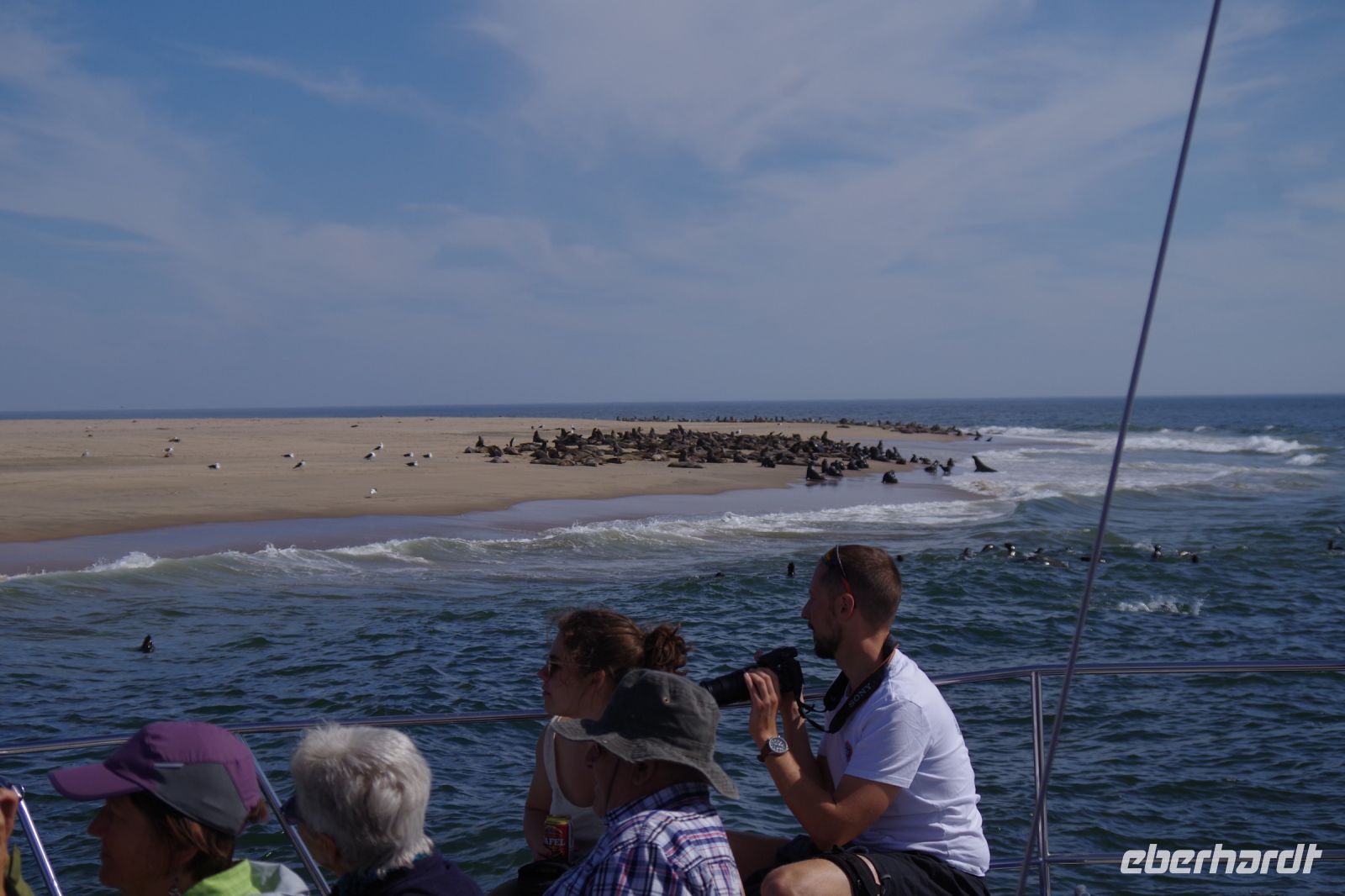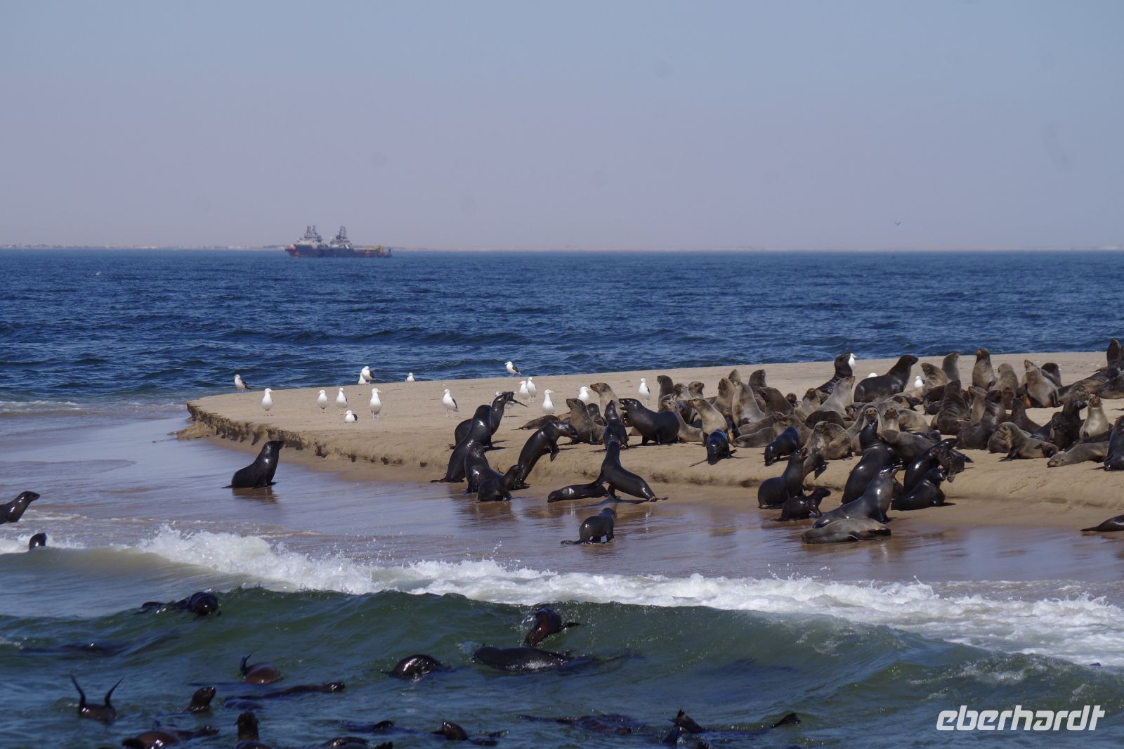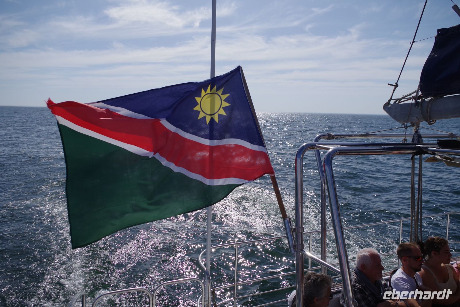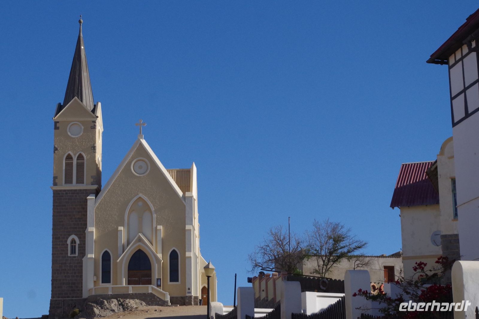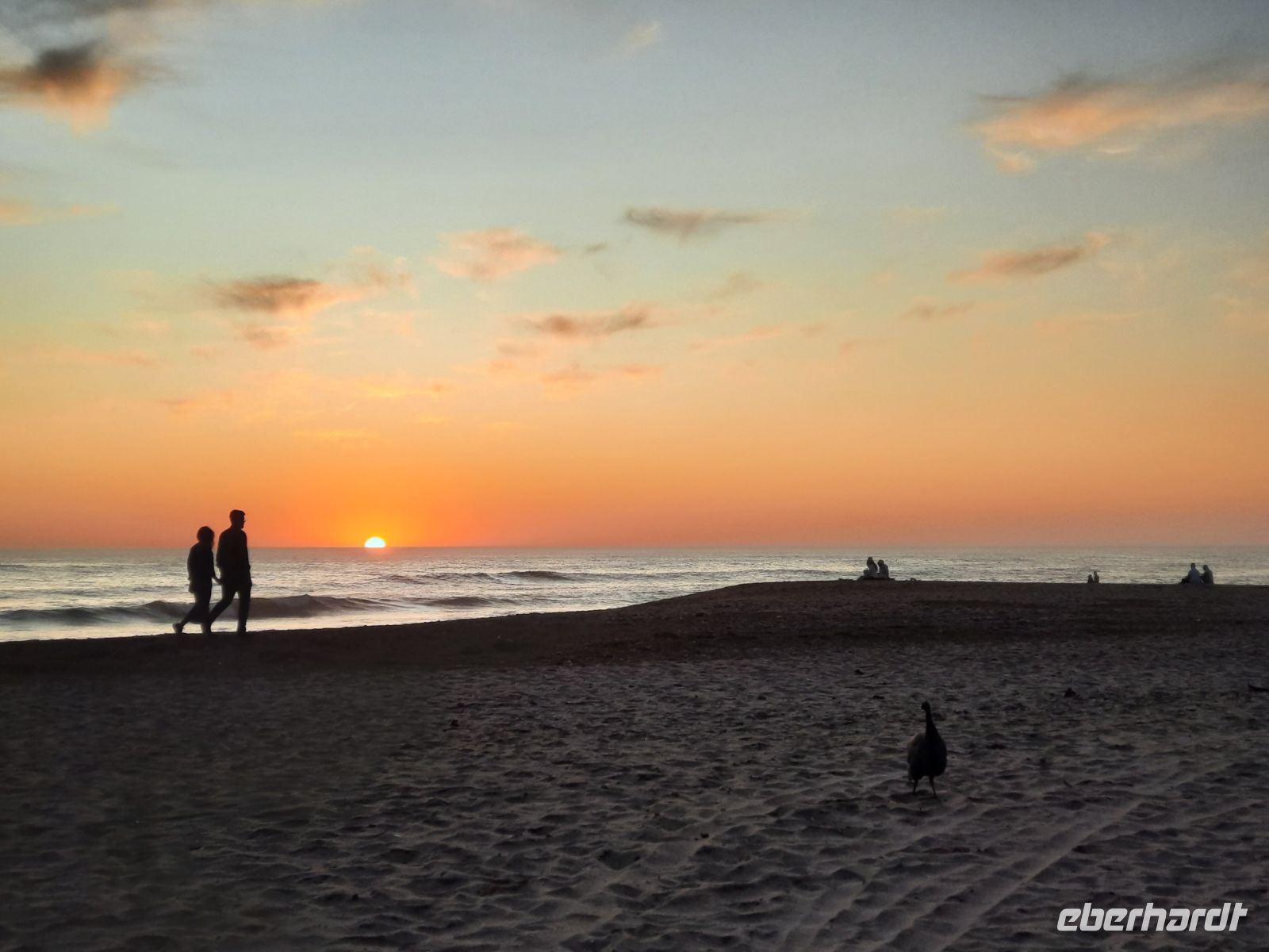 Nach einem guten Frühstück und kurzer Besichtigung der Farm fuhren wir nach Aus Aus raus (schönes Wortspiel). Im alten Bahnhofshotel konnten wir der süßen Versuchung der mächtigen Kuchen nicht widerstehen. Gut gestärkt fuhren wir weiter, unser Ziel Lüderitzbucht. Ein fast schnurgerader Asphaltstreifen mitten durch die Wüste, zu beiden Seiten erstreckt sich eine karge, weite Landschaft, die nur durch ein paar Inselberge durchbrochen wird, links das Diamantensperrgebiet und rechts die Randstufe. Später sahen wir die alte Bahnstation Grasplatz, wo die Eisenbahnmitarbeiter Stauch und Lewala den ersten Diamanten fanden. Danach brach in dieser Gegend ein regelrechter Diamantenrausch aus, ähnlich wie das Klondike-Fieber in Alaska. Es folgte eine Rundfahrt entlang der Buchten durch eine raue Region aus Stein und Wasser. Wir sahen einzelne Flamingos. Unser Ziel war das Diaz-Kreuz, das sich auf einem Felsen befindet. Die Brücke zum Diaz- Kreuz ist nun schon seit Jahren zerstört (durch eine Flut). 1488 ging hier portugiesische Seefahrer Diaz bei seiner Erkundung des Seeweges nach dem Osten als erster Europäer an Land. Das oben aufgestellte Diaz Kreuz ist nur eine Kopie, Teile des Original Kreuzes befinden sich im Deutschen Historischen Museum in Berlin. Danach erkundeten wir das übersichtliche, farbenfrohe und fast Menschen leere Lüderitz (es war Sonntag). Wir erklommen den Diamantberg (fanden aber keine), sahen das Goerke-Haus, die Felsenkirche, die als Wahrzeichen der Stadt gilt und bummelten zum Hafen. Danach checkten wir im Lüderitz Nest Hotel ein. Das Abendessen wurde uns im Hotel serviert.