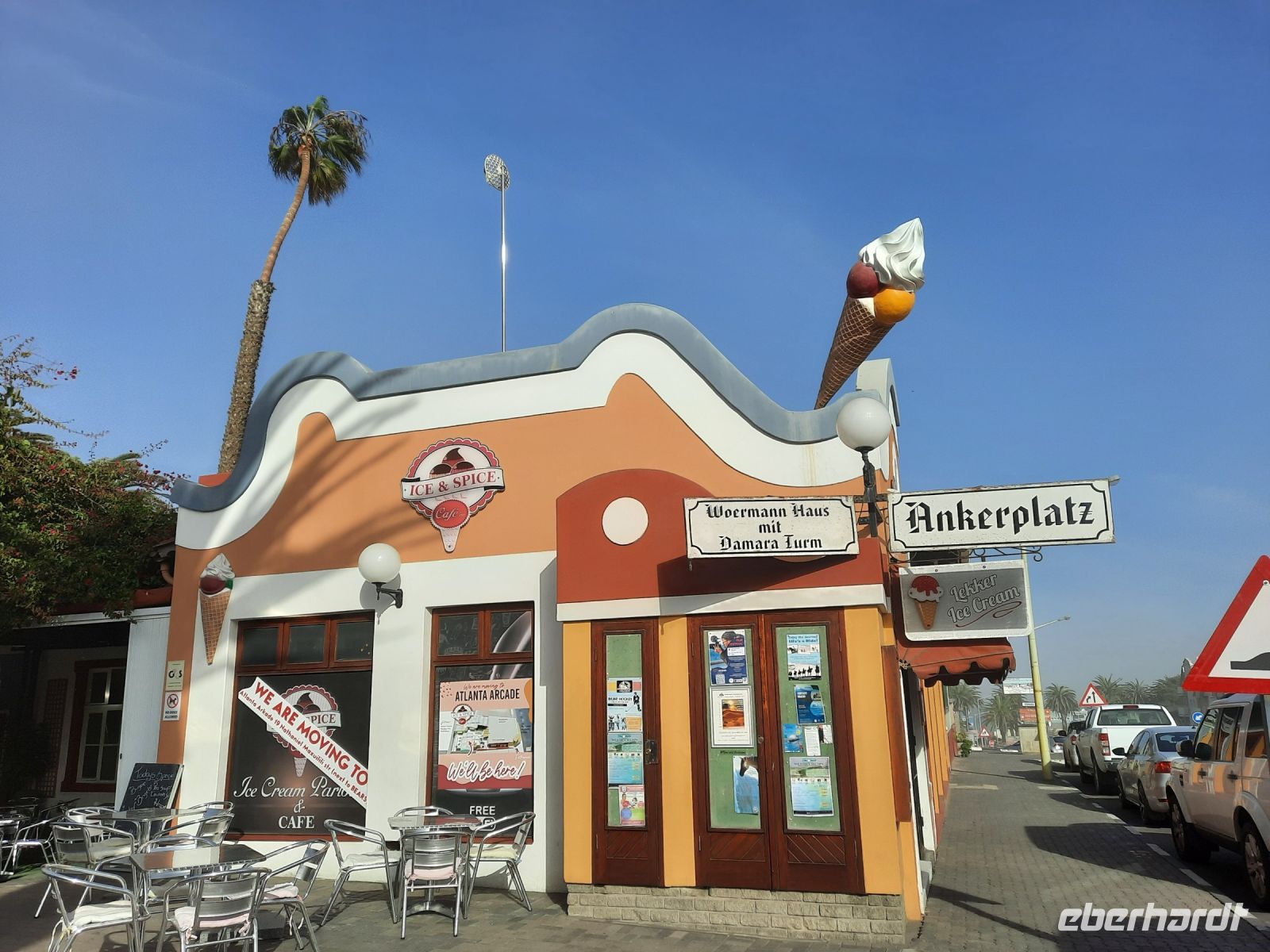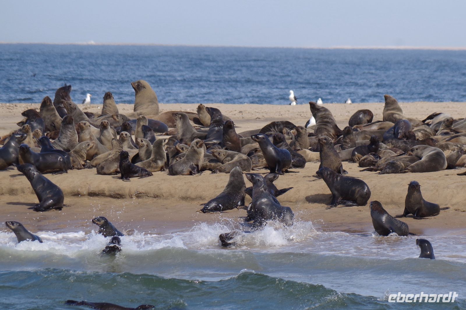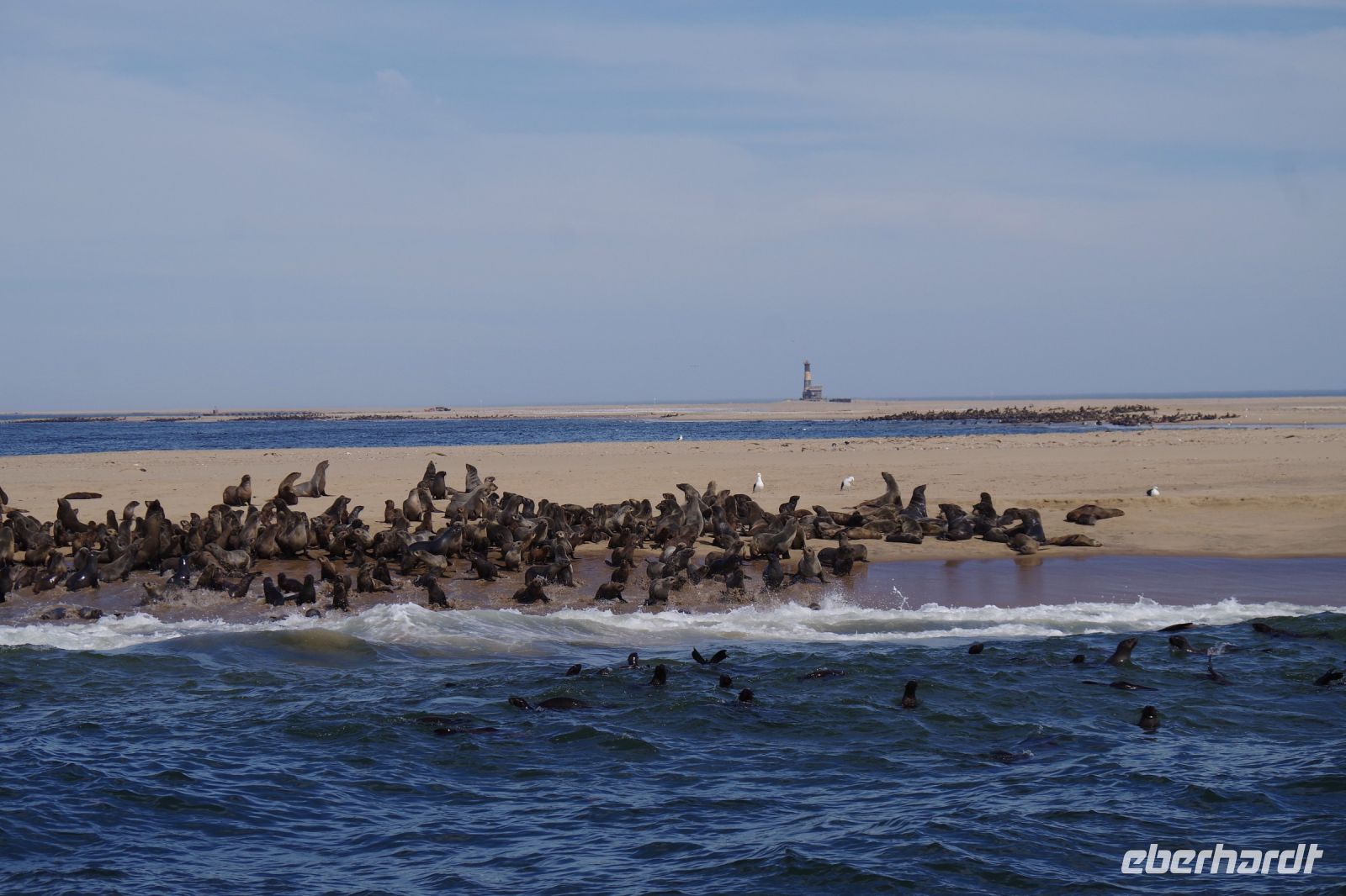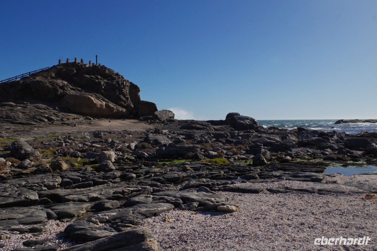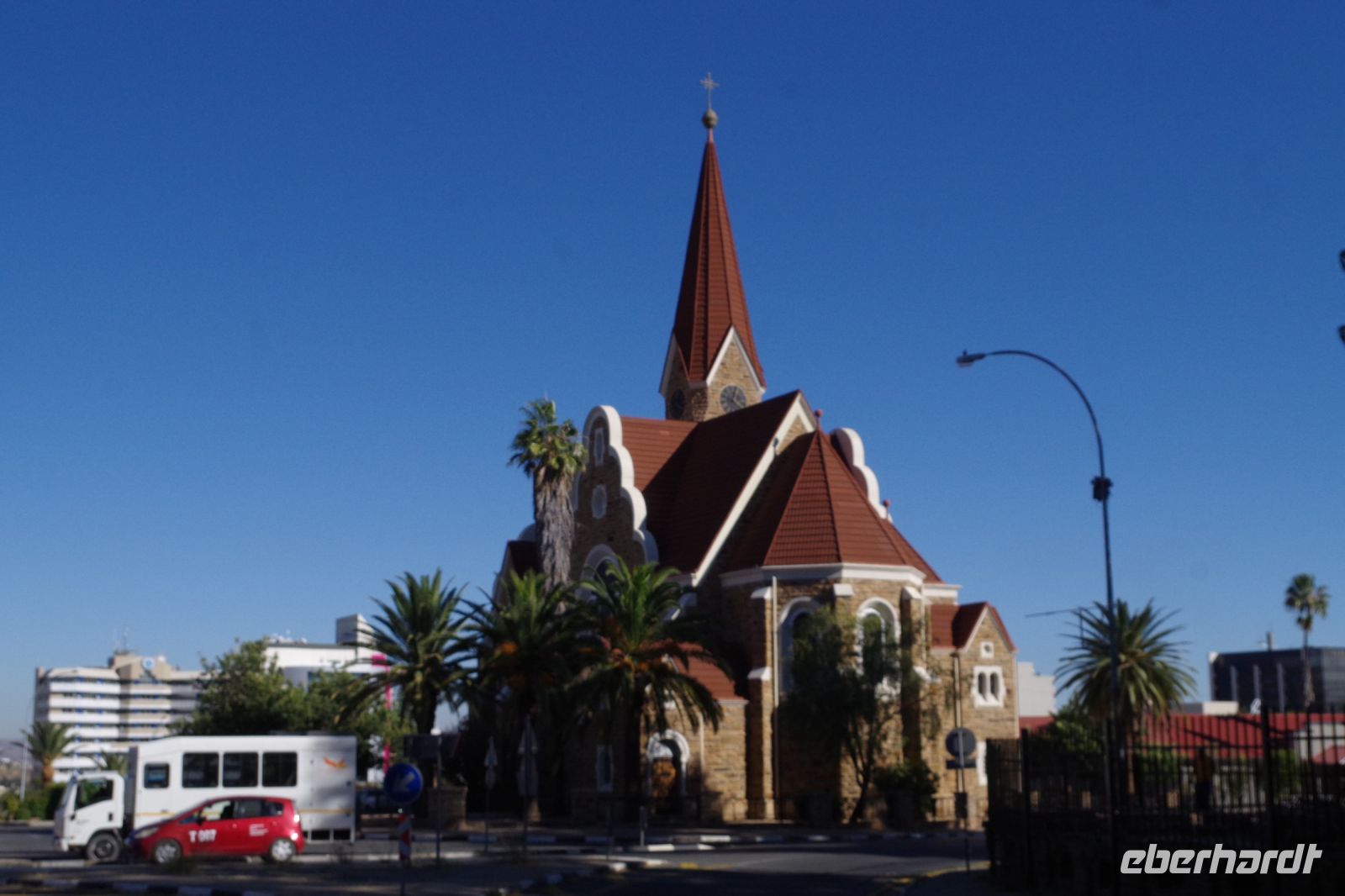 Nach einem guten Frühstück und kurzer Besichtigung der Farm fuhren wir nach Aus Aus raus (schönes Wortspiel). Im alten Bahnhofshotel konnten wir der süßen Versuchung der mächtigen Kuchen nicht widerstehen. Gut gestärkt fuhren wir weiter, unser Ziel Lüderitzbucht. Ein fast schnurgerader Asphaltstreifen mitten durch die Wüste, zu beiden Seiten erstreckt sich eine karge, weite Landschaft, die nur durch ein paar Inselberge durchbrochen wird, links das Diamantensperrgebiet und rechts die Randstufe. Später sahen wir die alte Bahnstation Grasplatz, wo die Eisenbahnmitarbeiter Stauch und Lewala den ersten Diamanten fanden. Danach brach in dieser Gegend ein regelrechter Diamantenrausch aus, ähnlich wie das Klondike-Fieber in Alaska. Es folgte eine Rundfahrt entlang der Buchten durch eine raue Region aus Stein und Wasser. Wir sahen einzelne Flamingos. Unser Ziel war das Diaz-Kreuz, das sich auf einem Felsen befindet. Die Brücke zum Diaz- Kreuz ist nun schon seit Jahren zerstört (durch eine Flut). 1488 ging hier portugiesische Seefahrer Diaz bei seiner Erkundung des Seeweges nach dem Osten als erster Europäer an Land. Das oben aufgestellte Diaz Kreuz ist nur eine Kopie, Teile des Original Kreuzes befinden sich im Deutschen Historischen Museum in Berlin. Danach erkundeten wir das übersichtliche, farbenfrohe und fast Menschen leere Lüderitz (es war Sonntag). Wir erklommen den Diamantberg (fanden aber keine), sahen das Goerke-Haus, die Felsenkirche, die als Wahrzeichen der Stadt gilt und bummelten zum Hafen. Danach checkten wir im Lüderitz Nest Hotel ein. Das Abendessen wurde uns im Hotel serviert.