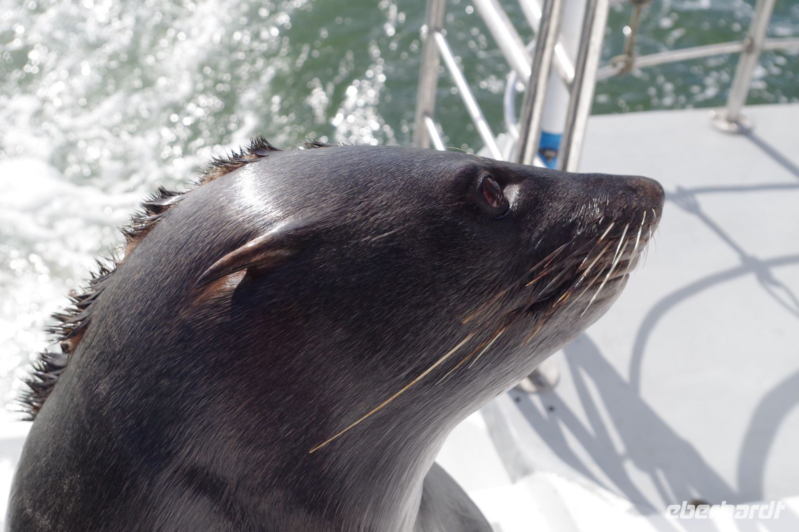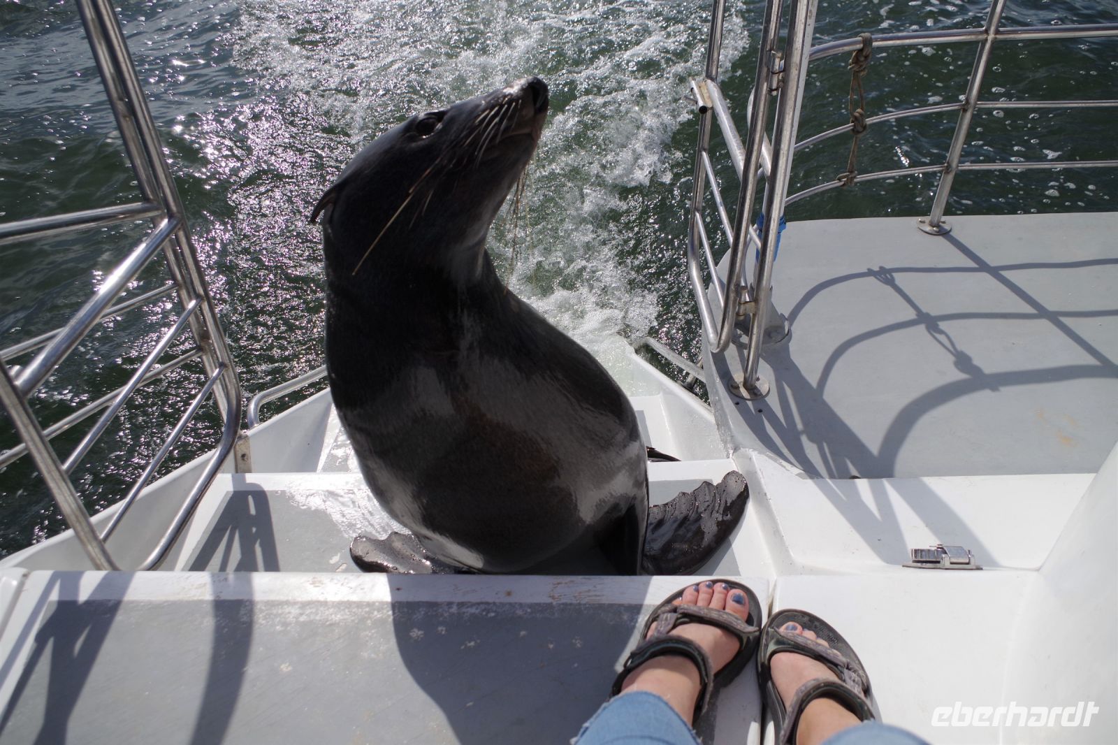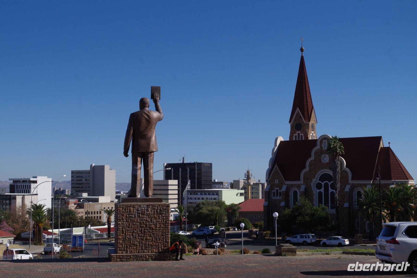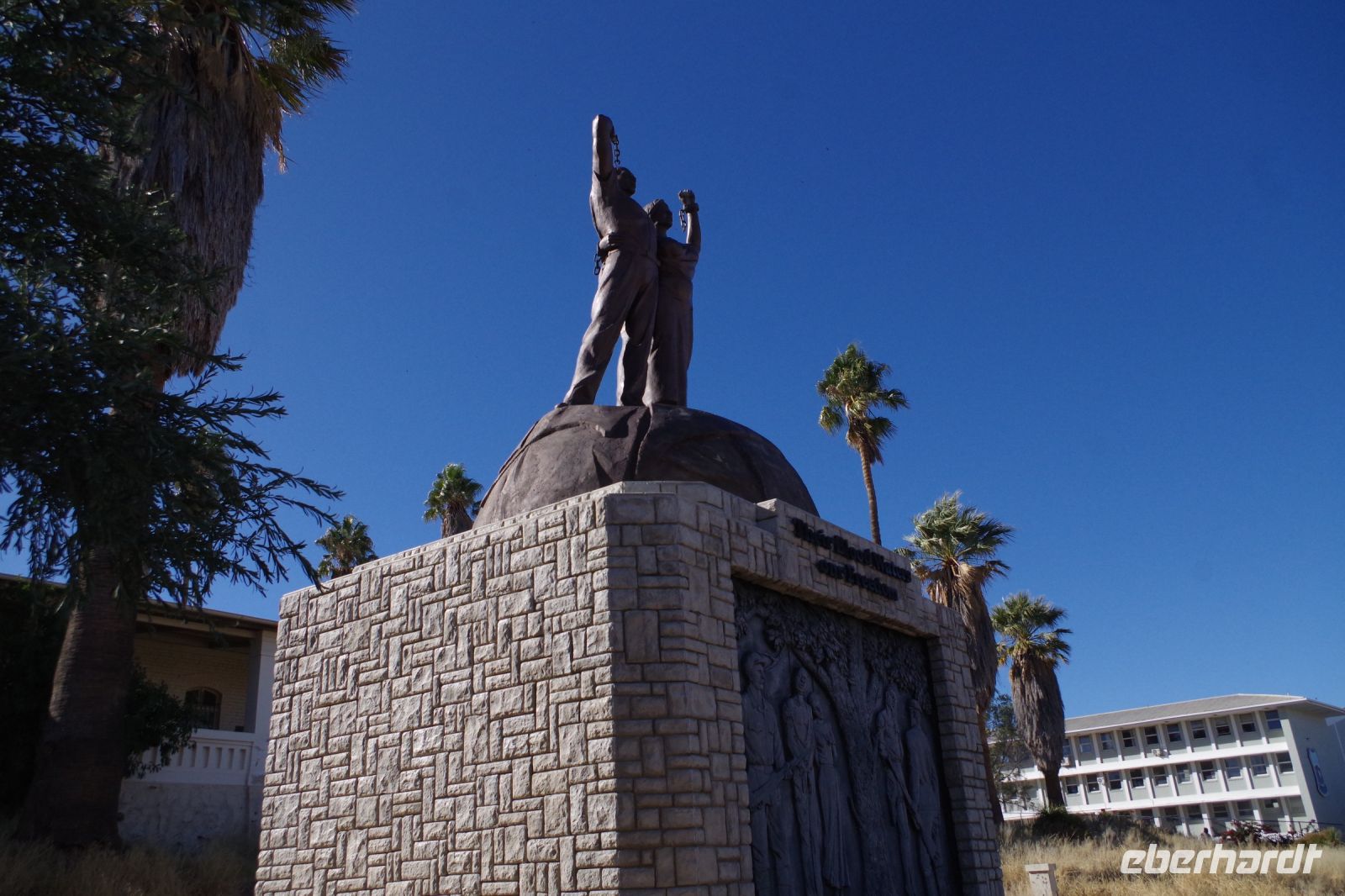 Nach einem guten Frühstück und kurzer Besichtigung der Farm fuhren wir nach Aus Aus raus (schönes Wortspiel). Im alten Bahnhofshotel konnten wir der süßen Versuchung der mächtigen Kuchen nicht widerstehen. Gut gestärkt fuhren wir weiter, unser Ziel Lüderitzbucht. Ein fast schnurgerader Asphaltstreifen mitten durch die Wüste, zu beiden Seiten erstreckt sich eine karge, weite Landschaft, die nur durch ein paar Inselberge durchbrochen wird, links das Diamantensperrgebiet und rechts die Randstufe. Später sahen wir die alte Bahnstation Grasplatz, wo die Eisenbahnmitarbeiter Stauch und Lewala den ersten Diamanten fanden. Danach brach in dieser Gegend ein regelrechter Diamantenrausch aus, ähnlich wie das Klondike-Fieber in Alaska. Es folgte eine Rundfahrt entlang der Buchten durch eine raue Region aus Stein und Wasser. Wir sahen einzelne Flamingos. Unser Ziel war das Diaz-Kreuz, das sich auf einem Felsen befindet. Die Brücke zum Diaz- Kreuz ist nun schon seit Jahren zerstört (durch eine Flut). 1488 ging hier portugiesische Seefahrer Diaz bei seiner Erkundung des Seeweges nach dem Osten als erster Europäer an Land. Das oben aufgestellte Diaz Kreuz ist nur eine Kopie, Teile des Original Kreuzes befinden sich im Deutschen Historischen Museum in Berlin. Danach erkundeten wir das übersichtliche, farbenfrohe und fast Menschen leere Lüderitz (es war Sonntag). Wir erklommen den Diamantberg (fanden aber keine), sahen das Goerke-Haus, die Felsenkirche, die als Wahrzeichen der Stadt gilt und bummelten zum Hafen. Danach checkten wir im Lüderitz Nest Hotel ein. Das Abendessen wurde uns im Hotel serviert.