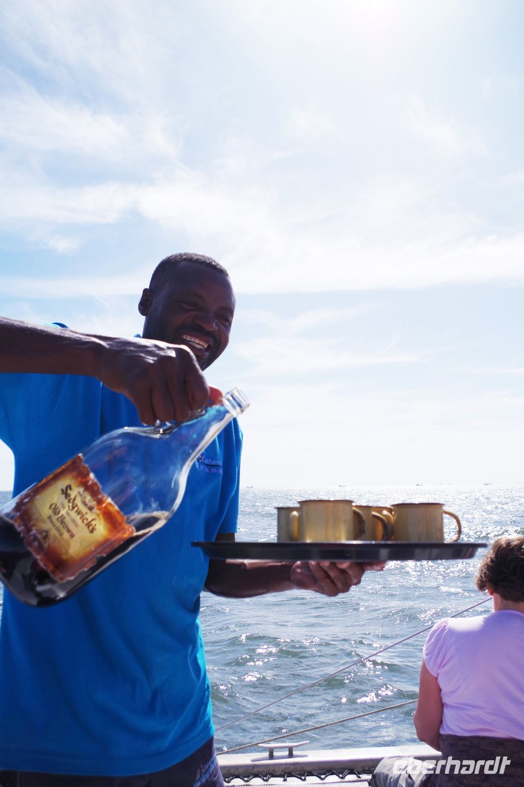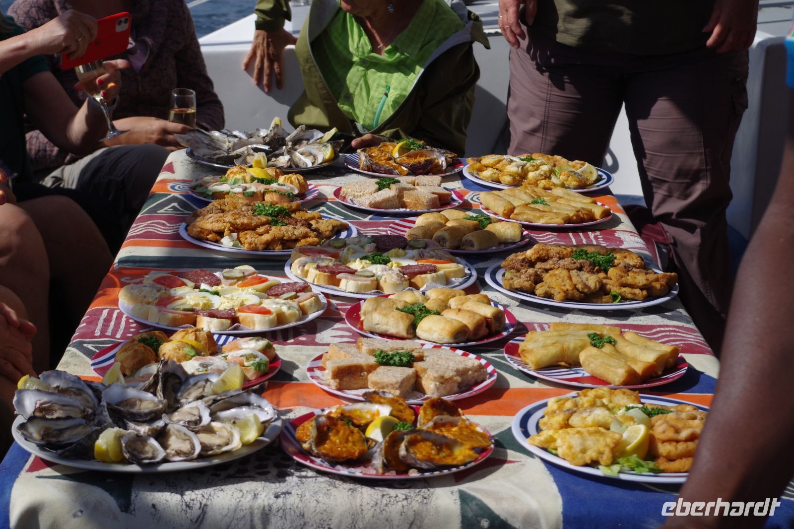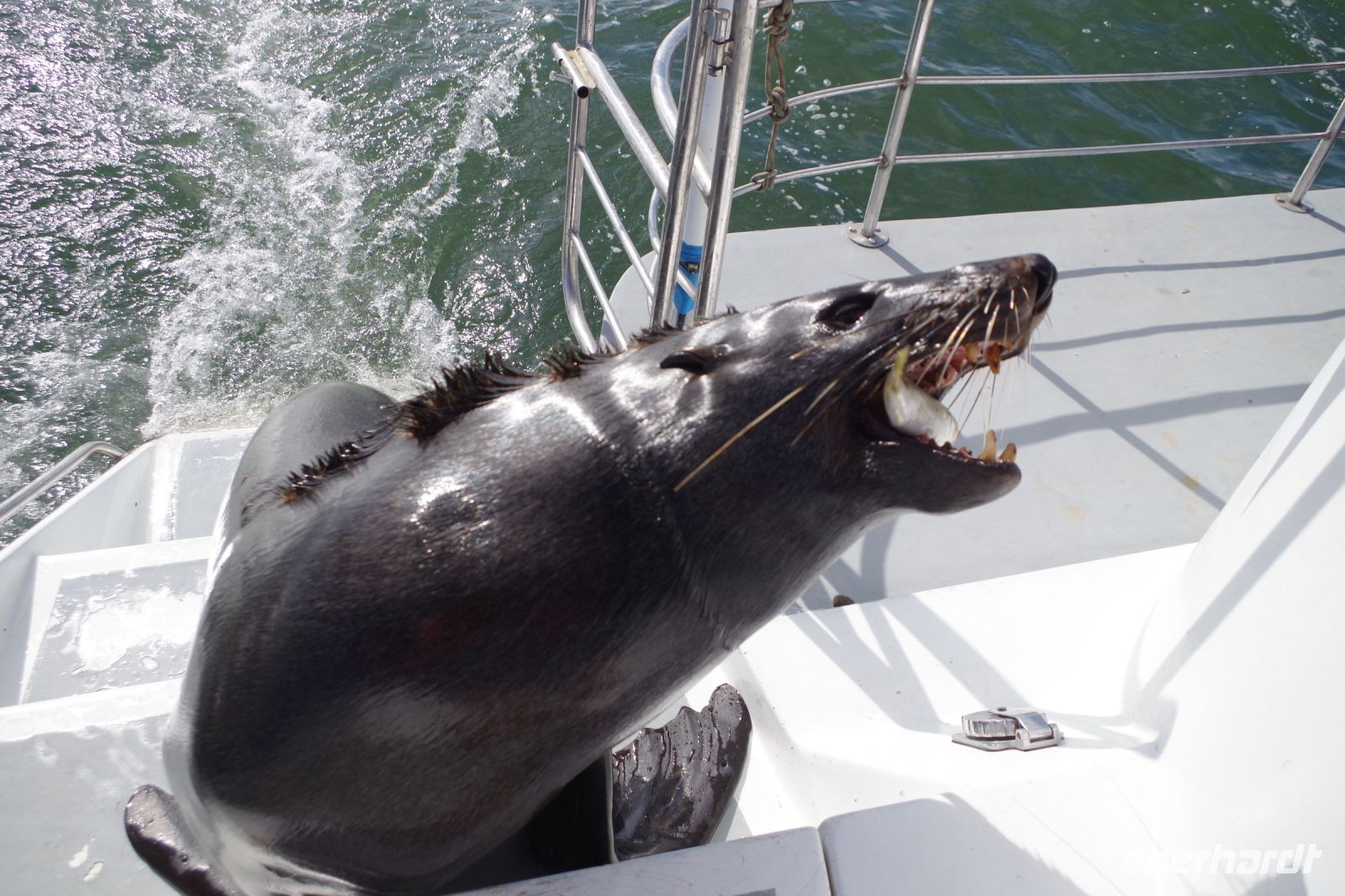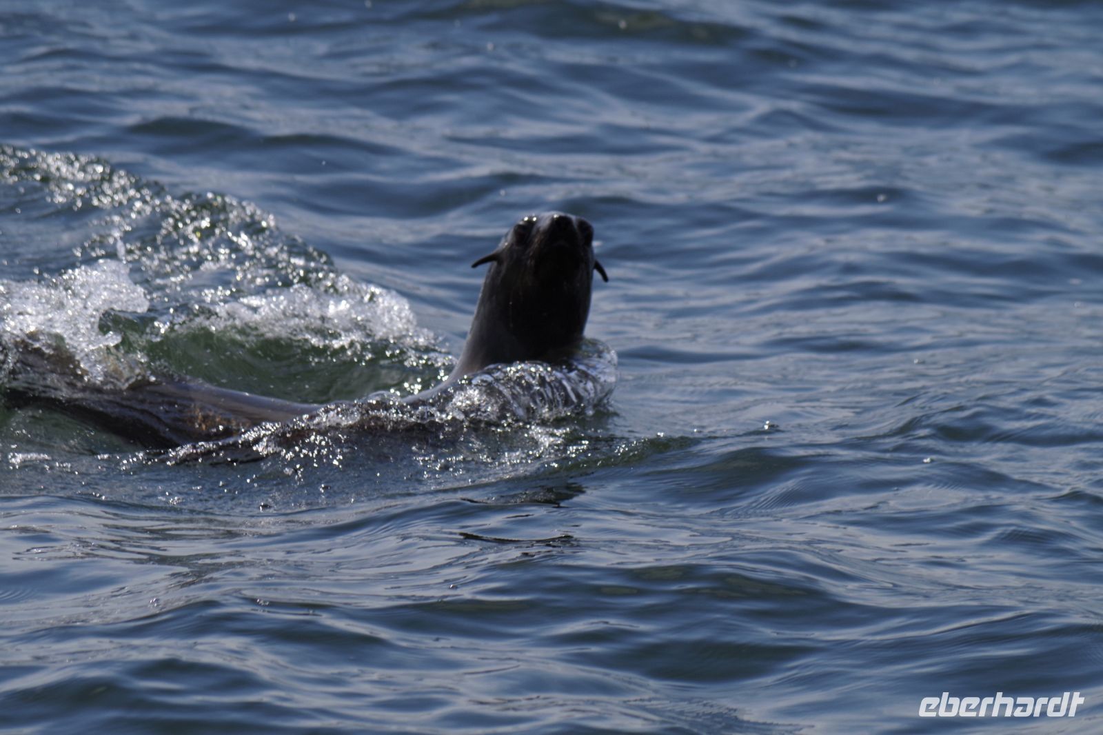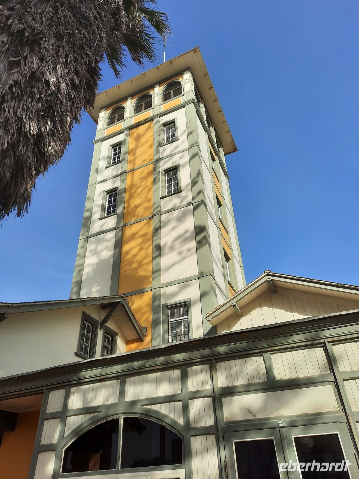 Nach einem guten Frühstück und kurzer Besichtigung der Farm fuhren wir nach Aus Aus raus (schönes Wortspiel). Im alten Bahnhofshotel konnten wir der süßen Versuchung der mächtigen Kuchen nicht widerstehen. Gut gestärkt fuhren wir weiter, unser Ziel Lüderitzbucht. Ein fast schnurgerader Asphaltstreifen mitten durch die Wüste, zu beiden Seiten erstreckt sich eine karge, weite Landschaft, die nur durch ein paar Inselberge durchbrochen wird, links das Diamantensperrgebiet und rechts die Randstufe. Später sahen wir die alte Bahnstation Grasplatz, wo die Eisenbahnmitarbeiter Stauch und Lewala den ersten Diamanten fanden. Danach brach in dieser Gegend ein regelrechter Diamantenrausch aus, ähnlich wie das Klondike-Fieber in Alaska. Es folgte eine Rundfahrt entlang der Buchten durch eine raue Region aus Stein und Wasser. Wir sahen einzelne Flamingos. Unser Ziel war das Diaz-Kreuz, das sich auf einem Felsen befindet. Die Brücke zum Diaz- Kreuz ist nun schon seit Jahren zerstört (durch eine Flut). 1488 ging hier portugiesische Seefahrer Diaz bei seiner Erkundung des Seeweges nach dem Osten als erster Europäer an Land. Das oben aufgestellte Diaz Kreuz ist nur eine Kopie, Teile des Original Kreuzes befinden sich im Deutschen Historischen Museum in Berlin. Danach erkundeten wir das übersichtliche, farbenfrohe und fast Menschen leere Lüderitz (es war Sonntag). Wir erklommen den Diamantberg (fanden aber keine), sahen das Goerke-Haus, die Felsenkirche, die als Wahrzeichen der Stadt gilt und bummelten zum Hafen. Danach checkten wir im Lüderitz Nest Hotel ein. Das Abendessen wurde uns im Hotel serviert.