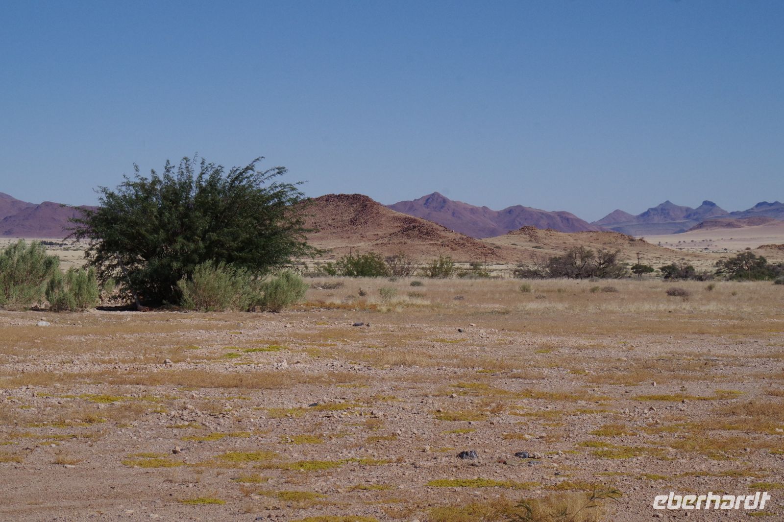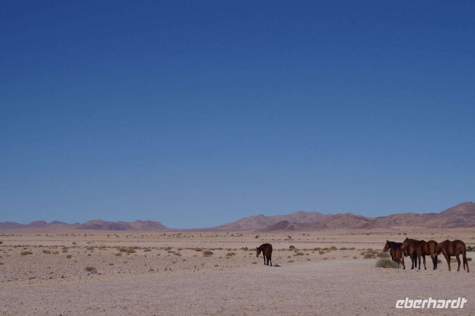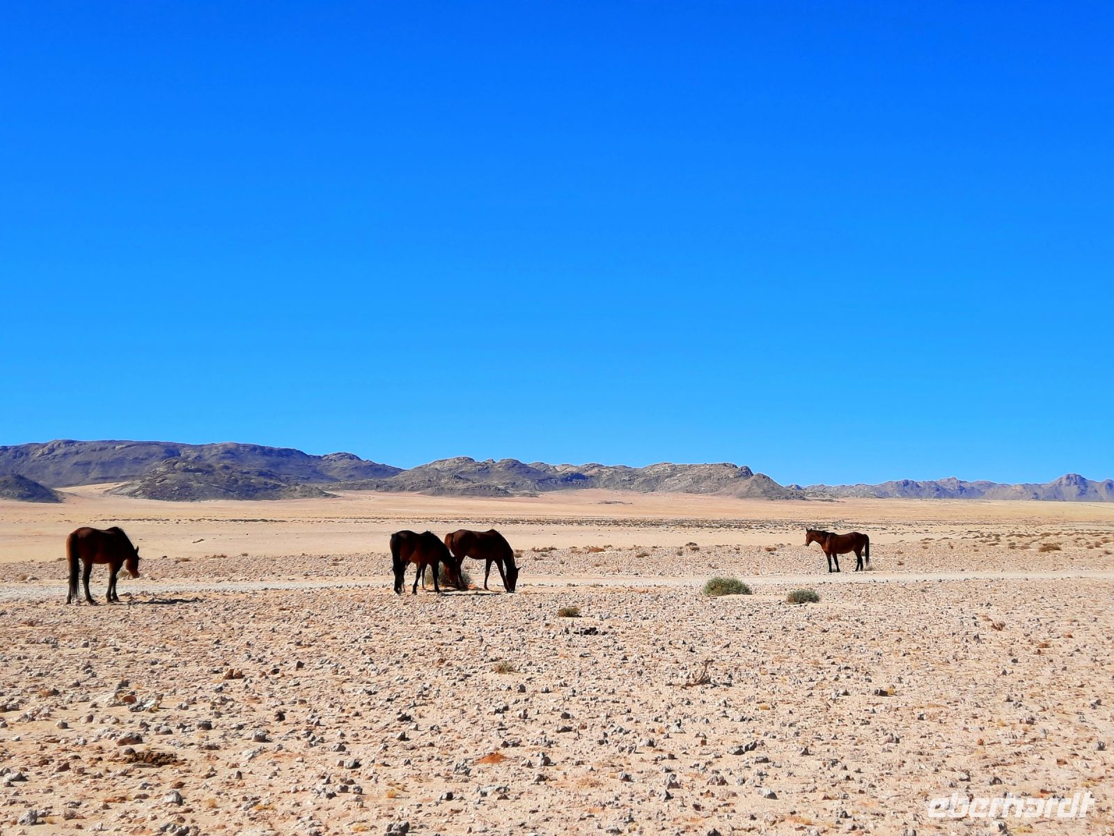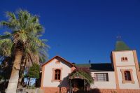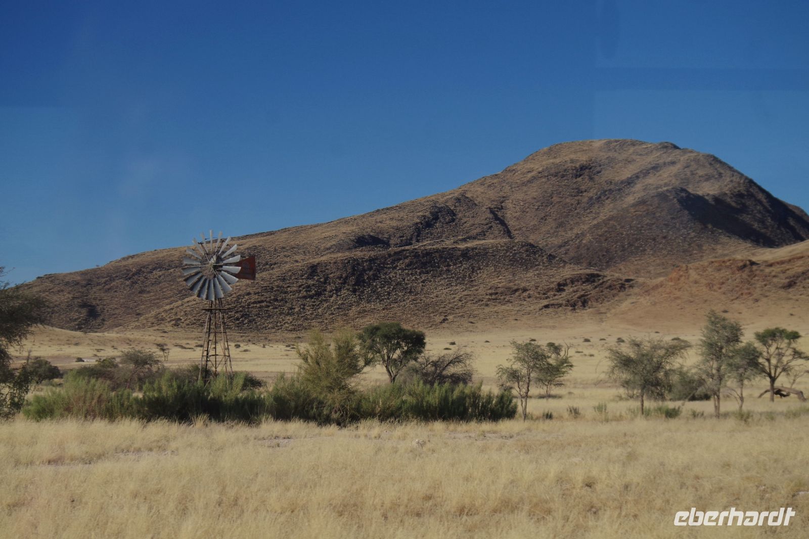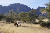 Am Morgen besichtigten wir die Geisterstadt Kolmanskop (Kolmannskuppe). Im Jahr 1908 lebten damals 1.200 Menschen. Bei einer kurzweiligen Führung mit Ramon, der in Lüderitz geboren ist, viel über die Geschichte. Er erzählte sehr anschaulich wie sich die deutsche Siedlung weitgehend autark versorgte: Wohnungen, Läden, Schlachterei, Wurstfabrik, Eisfabrik, Krankenhaus, sogar ein Schwimmbad ... alles war vorhanden! Damals war Kolmanskop eine der fortschrittlichsten Siedlungen. Heute ist Kolmanskop nur noch eine Geisterstadt, die sich der Wüstensand langsam zurückholt. Der letzte Bewohner lebte hier bis Ende der 60ziger Jahre. Wir stapften durch den Wüstensand und erkundeten restaurierte Gebäude wie die Kegelbahn, die Turnhalle und das Haus der Verwalterin sowie verfallene Villen auf der Kaiserstraße. Danach fuhren wir zunächst nach Aus zurück. Am Garub-Wasserloch hatten wir diesmal Glück und sahen die Wildpferde, sogar mit Fohlen.. Die vergangenen, sehr trockenen Jahre hatten die Zahl der Wildpferde stark dezimiert. Kurz nach Aus verließen wir die Asphaltstraße und bogen auf Schotterpad gen Norden ab. Rechts und links alles Farmland. Die Landschaft wirkte nach dem guten Regen frisch und das Gras stand hoch. Einsam truckten wir auf der trotzdem staubigen Pad. Wieder zeigte sich, wie dünn das Land besiedelt ist, Einsamkeit pur. Vereinzelt sahen wir Strauße und Oryxe. Entlang der Schwarzrandbergkette und der Tirasberge gelangten wir nach Helmeringhausen. Zwei Handvoll Einwohner leben hier vorrangig von der Rinder- und Schafszucht. Wie erfuhren, woher der Name stammt. 1908 kam die deutsche Schutztruppe an diesen Ort. Ein Soldat stammte aus einer gleichnamigen Ortschaft aus Deutschland. Später kaufte dieser Herr hier Farmland und nannte es nach seinem Geburtsort. In Betta machten wir eine Pause, bevor wir zur Duwisib Guest Farm fuhren. Die deutschsprachigen Farmer (Vater und Sohn) begrüßten uns herzlich. Bei netten und interessanten Gesprächen mit dem Senior über die Farmarbeit und das Leben verging die Zeit schnell.