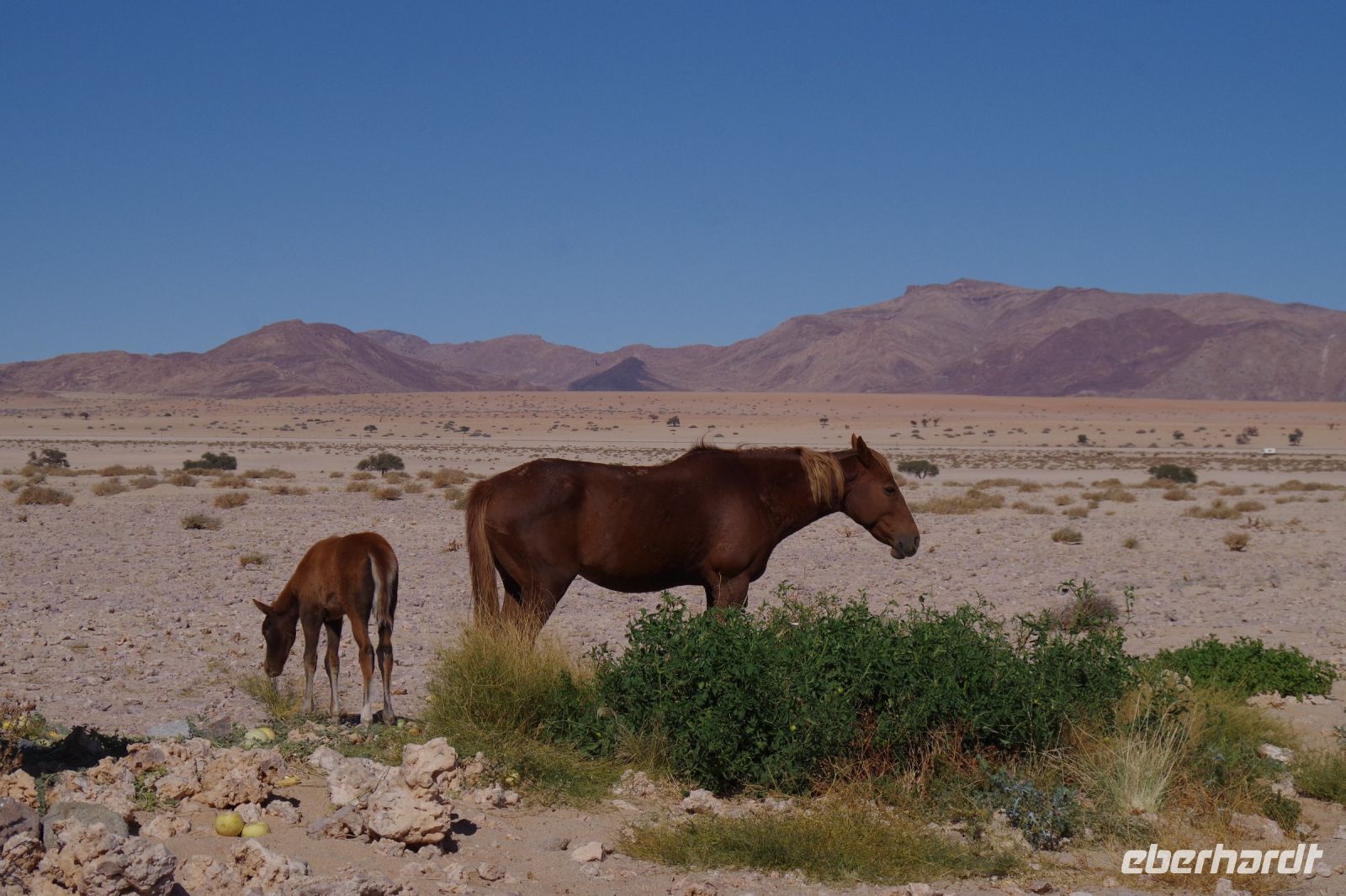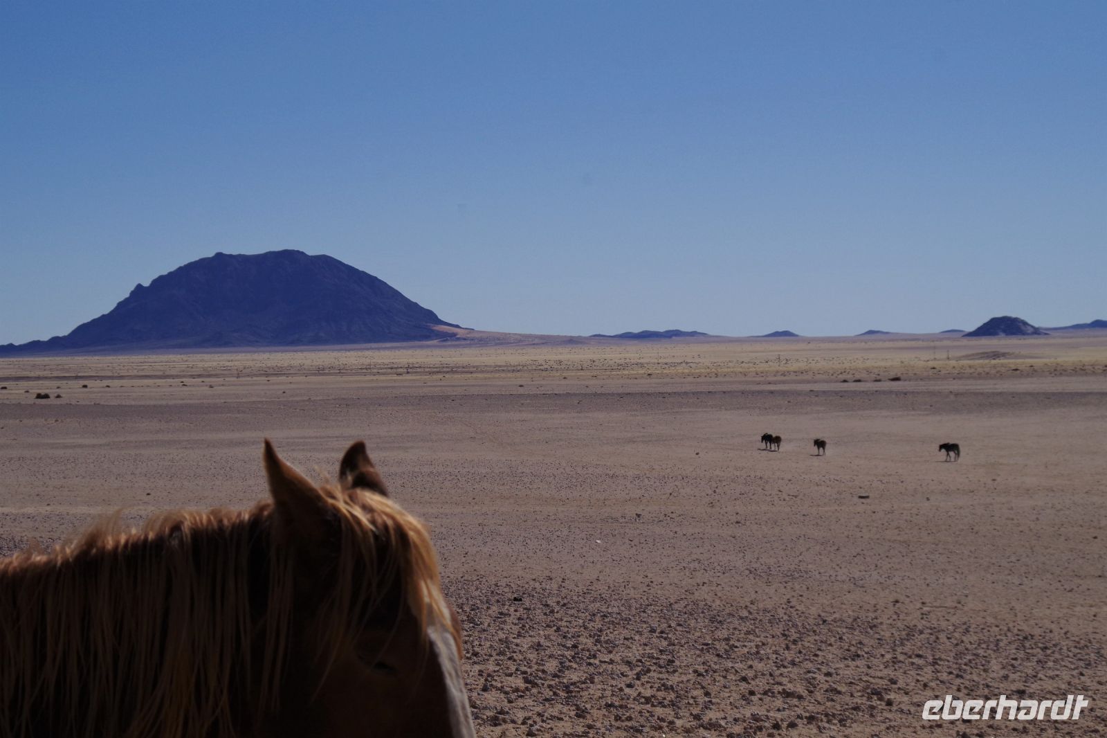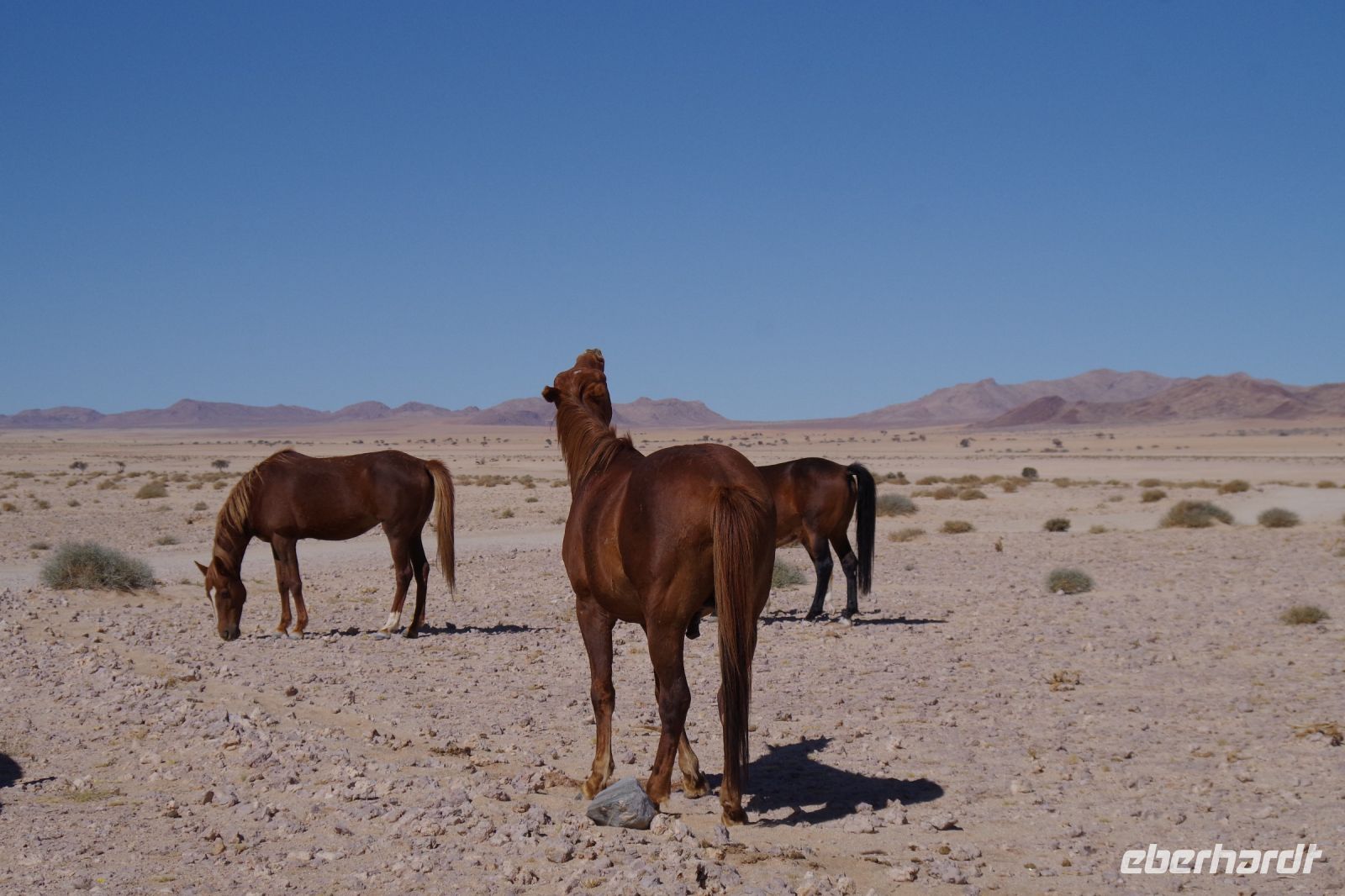 Am Morgen besichtigten wir die Geisterstadt Kolmanskop (Kolmannskuppe). Im Jahr 1908 lebten damals 1.200 Menschen. Bei einer kurzweiligen Führung mit Ramon, der in Lüderitz geboren ist, viel über die Geschichte. Er erzählte sehr anschaulich wie sich die deutsche Siedlung weitgehend autark versorgte: Wohnungen, Läden, Schlachterei, Wurstfabrik, Eisfabrik, Krankenhaus, sogar ein Schwimmbad ... alles war vorhanden! Damals war Kolmanskop eine der fortschrittlichsten Siedlungen. Heute ist Kolmanskop nur noch eine Geisterstadt, die sich der Wüstensand langsam zurückholt. Der letzte Bewohner lebte hier bis Ende der 60ziger Jahre. Wir stapften durch den Wüstensand und erkundeten restaurierte Gebäude wie die Kegelbahn, die Turnhalle und das Haus der Verwalterin sowie verfallene Villen auf der Kaiserstraße. Danach fuhren wir zunächst nach Aus zurück. Am Garub-Wasserloch hatten wir diesmal Glück und sahen die Wildpferde, sogar mit Fohlen.. Die vergangenen, sehr trockenen Jahre hatten die Zahl der Wildpferde stark dezimiert. Kurz nach Aus verließen wir die Asphaltstraße und bogen auf Schotterpad gen Norden ab. Rechts und links alles Farmland. Die Landschaft wirkte nach dem guten Regen frisch und das Gras stand hoch. Einsam truckten wir auf der trotzdem staubigen Pad. Wieder zeigte sich, wie dünn das Land besiedelt ist, Einsamkeit pur. Vereinzelt sahen wir Strauße und Oryxe. Entlang der Schwarzrandbergkette und der Tirasberge gelangten wir nach Helmeringhausen. Zwei Handvoll Einwohner leben hier vorrangig von der Rinder- und Schafszucht. Wie erfuhren, woher der Name stammt. 1908 kam die deutsche Schutztruppe an diesen Ort. Ein Soldat stammte aus einer gleichnamigen Ortschaft aus Deutschland. Später kaufte dieser Herr hier Farmland und nannte es nach seinem Geburtsort. In Betta machten wir eine Pause, bevor wir zur Duwisib Guest Farm fuhren. Die deutschsprachigen Farmer (Vater und Sohn) begrüßten uns herzlich. Bei netten und interessanten Gesprächen mit dem Senior über die Farmarbeit und das Leben verging die Zeit schnell.