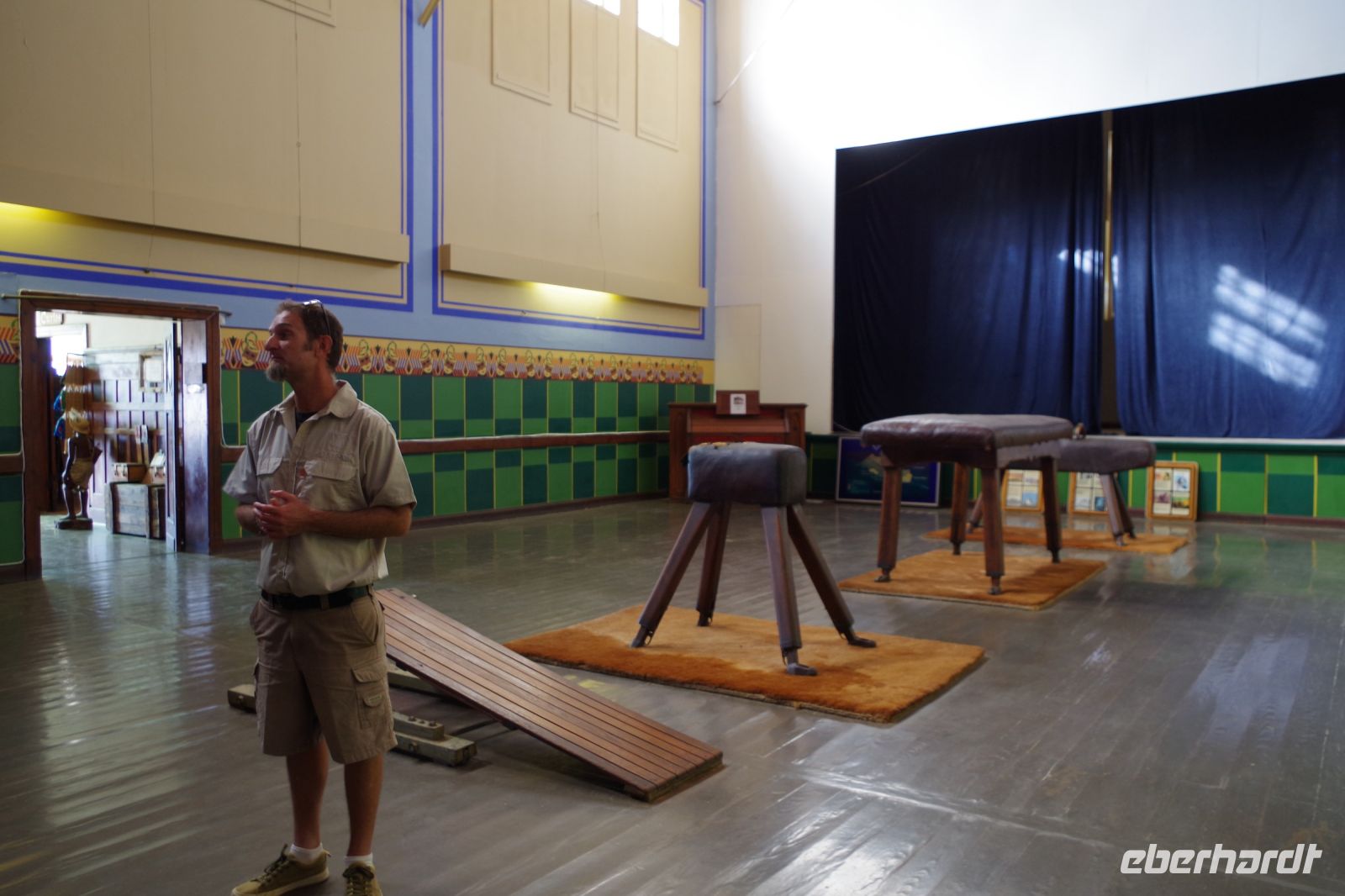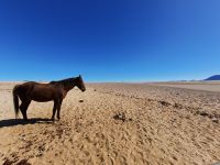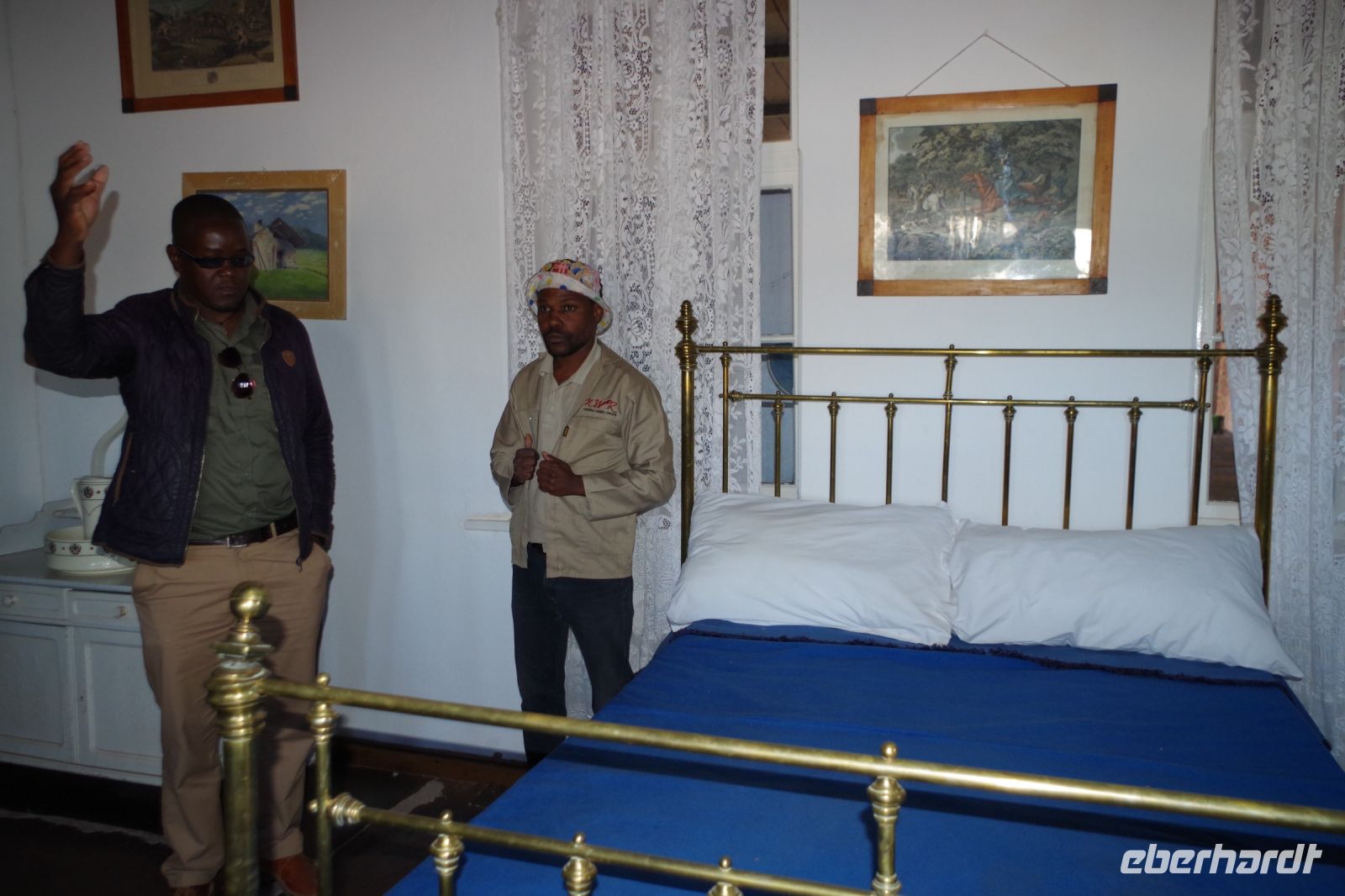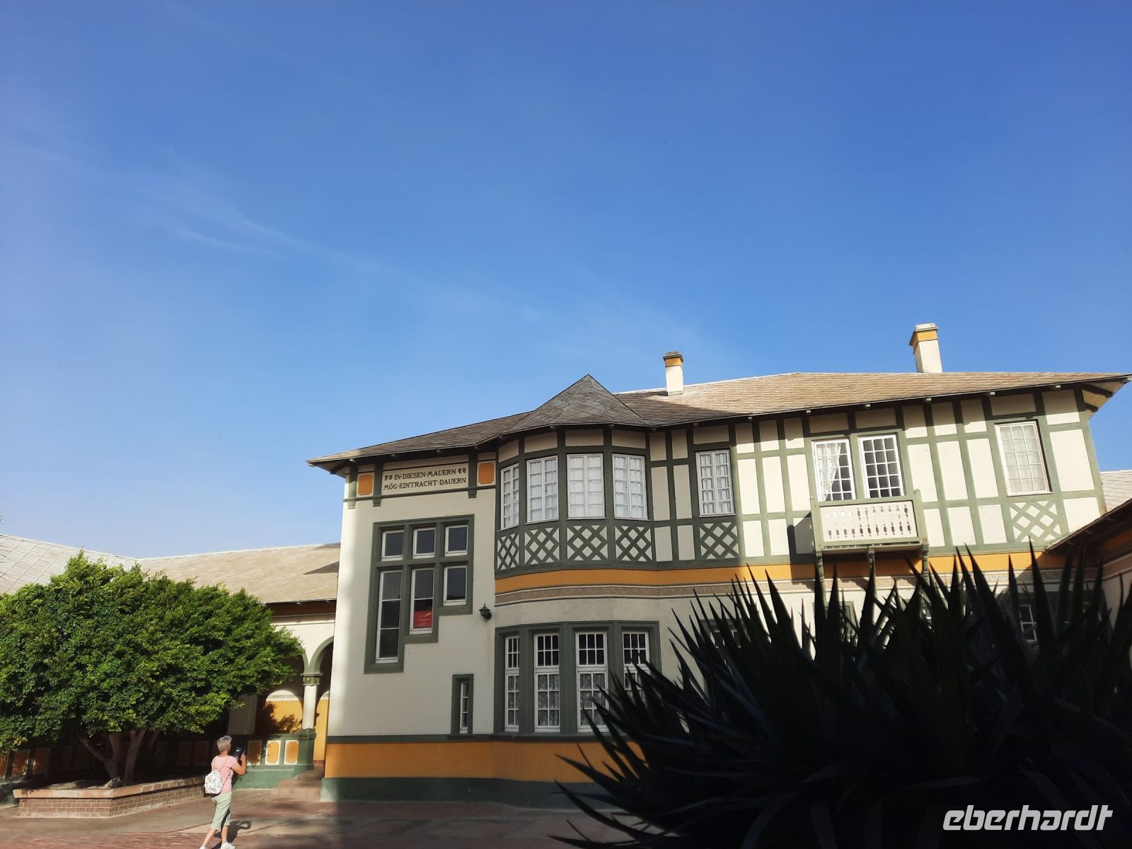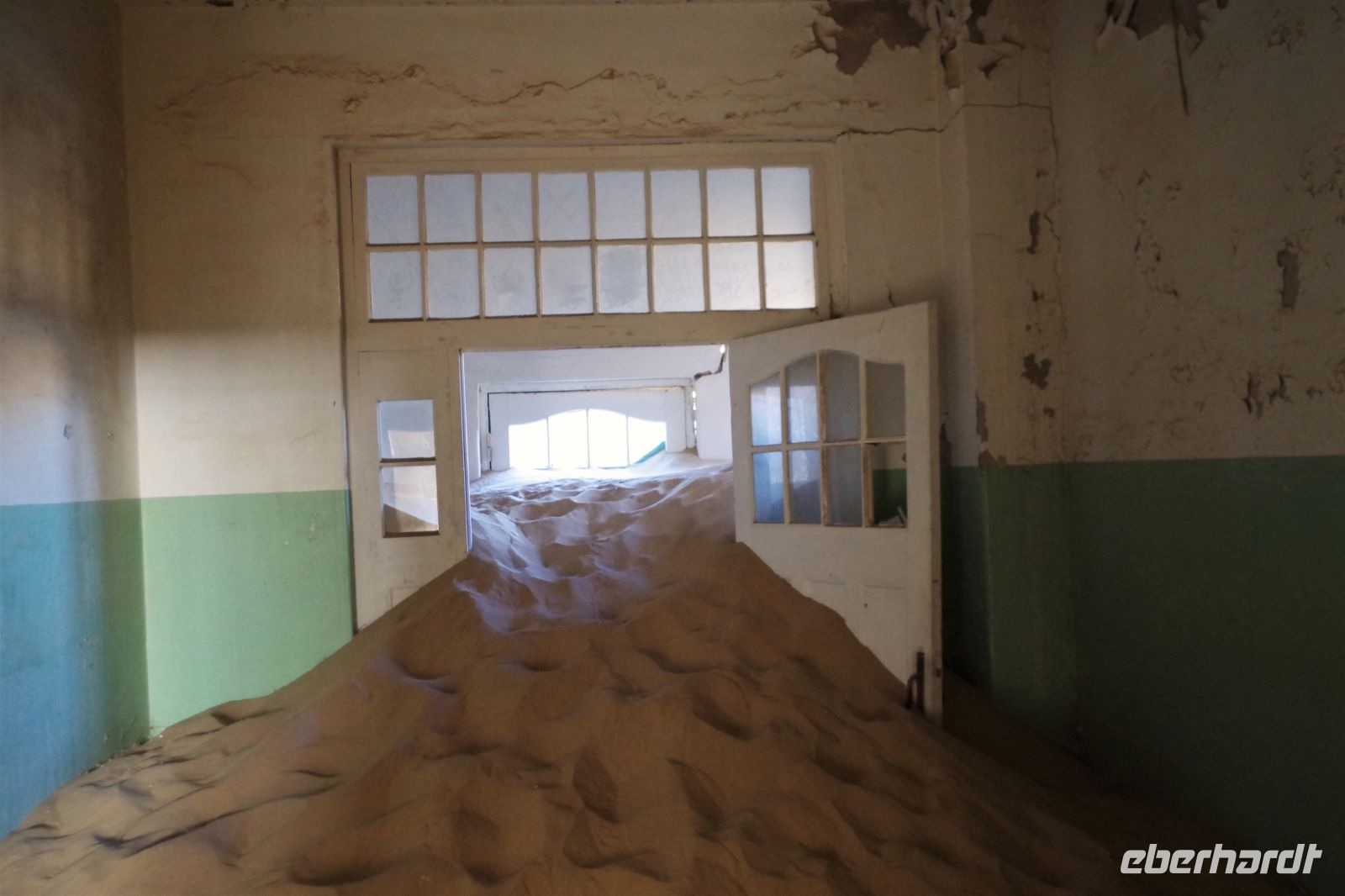 Am Morgen besichtigten wir die Geisterstadt Kolmanskop (Kolmannskuppe). Im Jahr 1908 lebten damals 1.200 Menschen. Bei einer kurzweiligen Führung mit Ramon, der in Lüderitz geboren ist, viel über die Geschichte. Er erzählte sehr anschaulich wie sich die deutsche Siedlung weitgehend autark versorgte: Wohnungen, Läden, Schlachterei, Wurstfabrik, Eisfabrik, Krankenhaus, sogar ein Schwimmbad ... alles war vorhanden! Damals war Kolmanskop eine der fortschrittlichsten Siedlungen. Heute ist Kolmanskop nur noch eine Geisterstadt, die sich der Wüstensand langsam zurückholt. Der letzte Bewohner lebte hier bis Ende der 60ziger Jahre. Wir stapften durch den Wüstensand und erkundeten restaurierte Gebäude wie die Kegelbahn, die Turnhalle und das Haus der Verwalterin sowie verfallene Villen auf der Kaiserstraße. Danach fuhren wir zunächst nach Aus zurück. Am Garub-Wasserloch hatten wir diesmal Glück und sahen die Wildpferde, sogar mit Fohlen.. Die vergangenen, sehr trockenen Jahre hatten die Zahl der Wildpferde stark dezimiert. Kurz nach Aus verließen wir die Asphaltstraße und bogen auf Schotterpad gen Norden ab. Rechts und links alles Farmland. Die Landschaft wirkte nach dem guten Regen frisch und das Gras stand hoch. Einsam truckten wir auf der trotzdem staubigen Pad. Wieder zeigte sich, wie dünn das Land besiedelt ist, Einsamkeit pur. Vereinzelt sahen wir Strauße und Oryxe. Entlang der Schwarzrandbergkette und der Tirasberge gelangten wir nach Helmeringhausen. Zwei Handvoll Einwohner leben hier vorrangig von der Rinder- und Schafszucht. Wie erfuhren, woher der Name stammt. 1908 kam die deutsche Schutztruppe an diesen Ort. Ein Soldat stammte aus einer gleichnamigen Ortschaft aus Deutschland. Später kaufte dieser Herr hier Farmland und nannte es nach seinem Geburtsort. In Betta machten wir eine Pause, bevor wir zur Duwisib Guest Farm fuhren. Die deutschsprachigen Farmer (Vater und Sohn) begrüßten uns herzlich. Bei netten und interessanten Gesprächen mit dem Senior über die Farmarbeit und das Leben verging die Zeit schnell.
