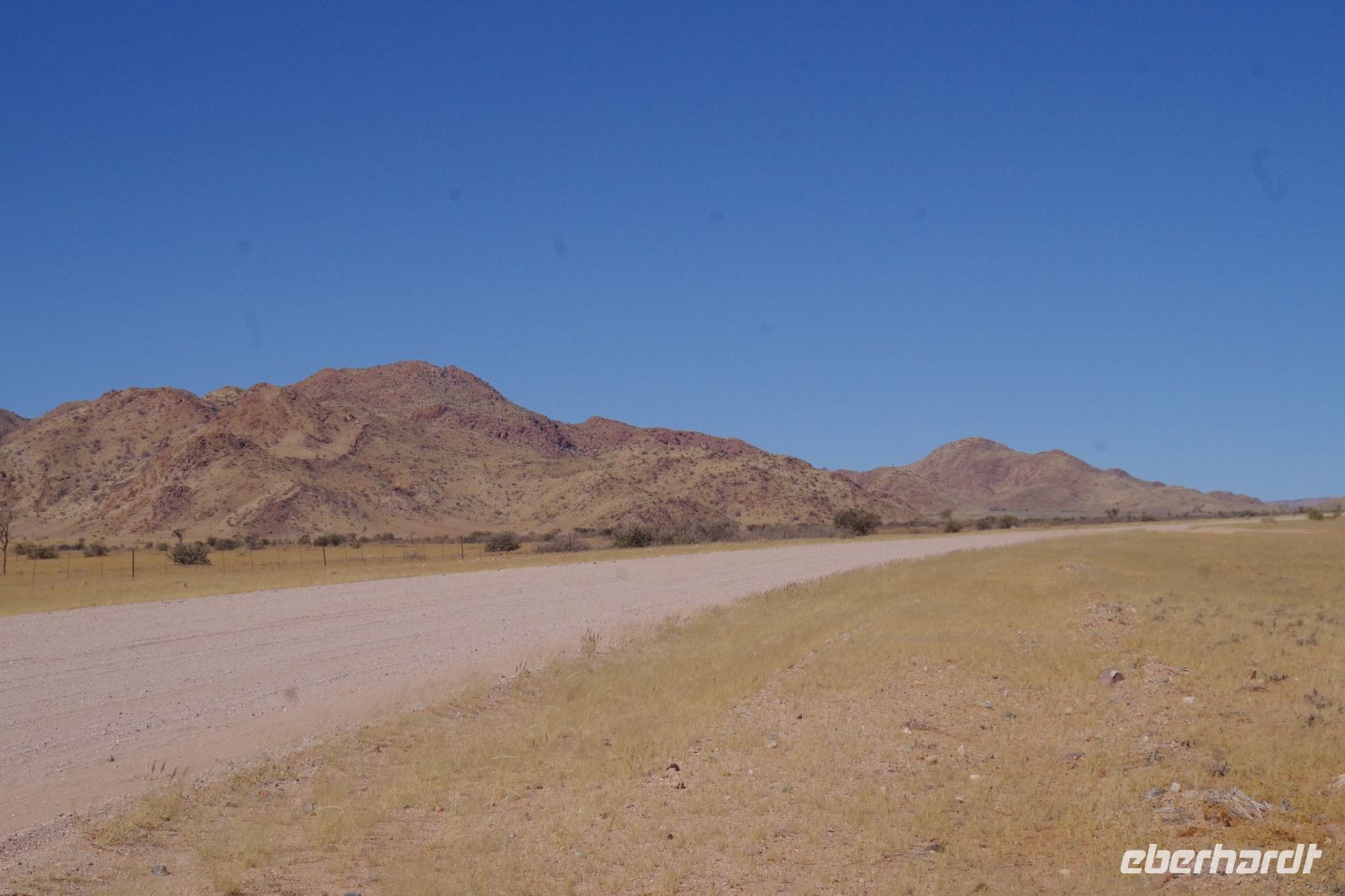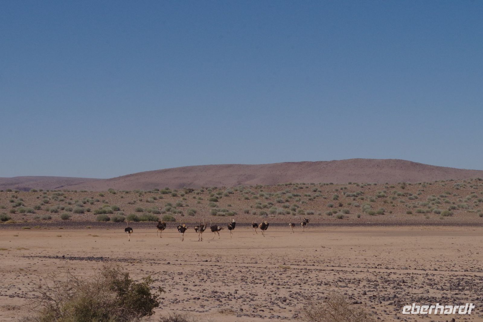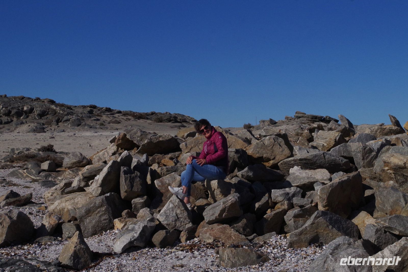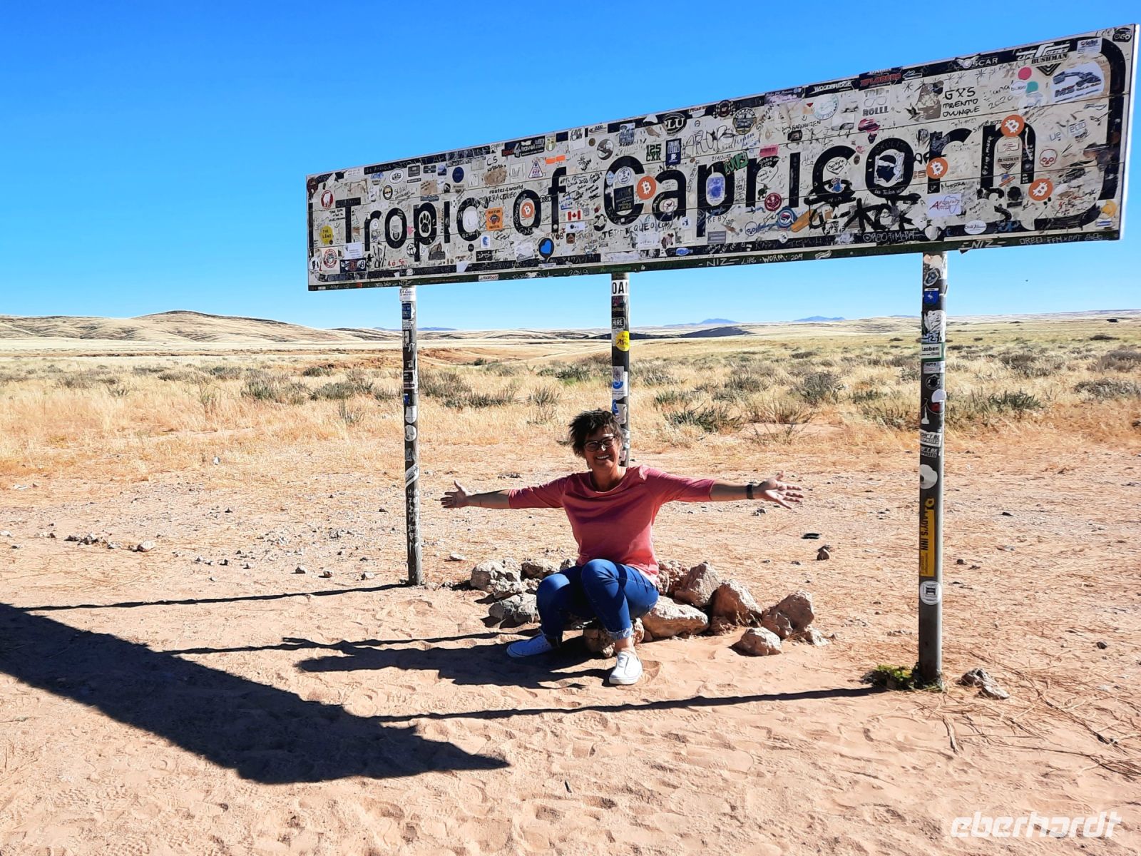 Wir verließen die Wüste und fuhren weiter durch das karge Naukluft Gebirge (über 1.000 m hoch). In Solitaire, einem weiteren wichtigen und bekannten Verkehrsknotenpunkt, machten wir noch einen Tankstopp. Dort befindet sich die bekannte Bäckerei von Moose Mc Gregor, der vor einigen Jahren verstarb. Doch die Tradition der Bäckerei wird fortgeführt. Hier gibt es neben dem über die Landesgrenzen hinaus bekannten Apfelkuchen, auch Schweinsohren und andere, süße Leckereien, den wir als Proviant für unser Picknick mitnahmen. Über den Gaub Pass (ca. 800 m hoch) passierten wir abermals den südlichen Wendekreis des Steinbocks (Tropic of capricorn). Landschaftlich rauh, aber wunderschön empfanden wir diese Strecke, die wir mit verschiedenen Fotostopps auflockerten. Später passierten wir Kuiseb Canyon und fuhren über die kleine Brücke über den ausgetrockneten Kuiseb. Hier in dieser Region hielt sich Prof. Dr. Henno Martin (Geologe und Autor des Bestsellers "Wenn es Krieg gibt, gehen wir in die Wüste") mit seinem Freund während des 2. Weltkriegs versteckt. Unterwegs picknickten wir, bevor wir am frühen Nachmittag die Teerstraße in Walvis Bay erreichten. Nach der Hitze der Wüste freuten wir uns nun auf etwas Frische.
