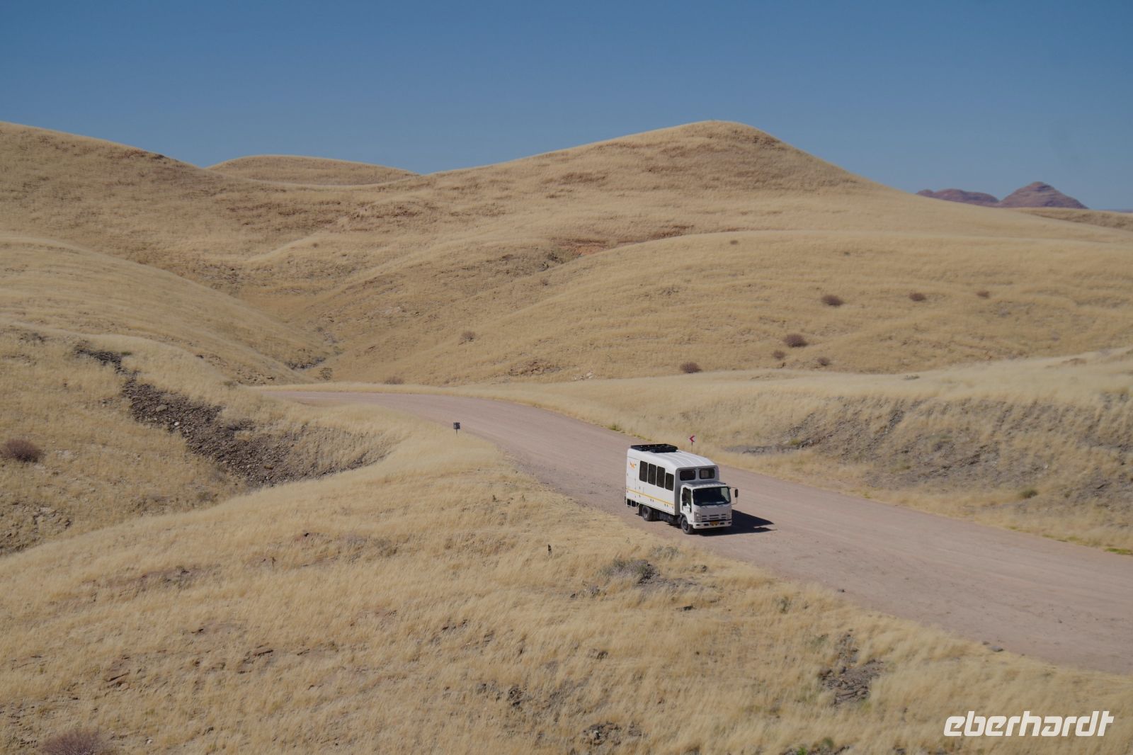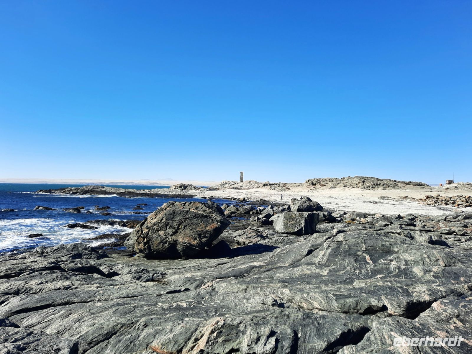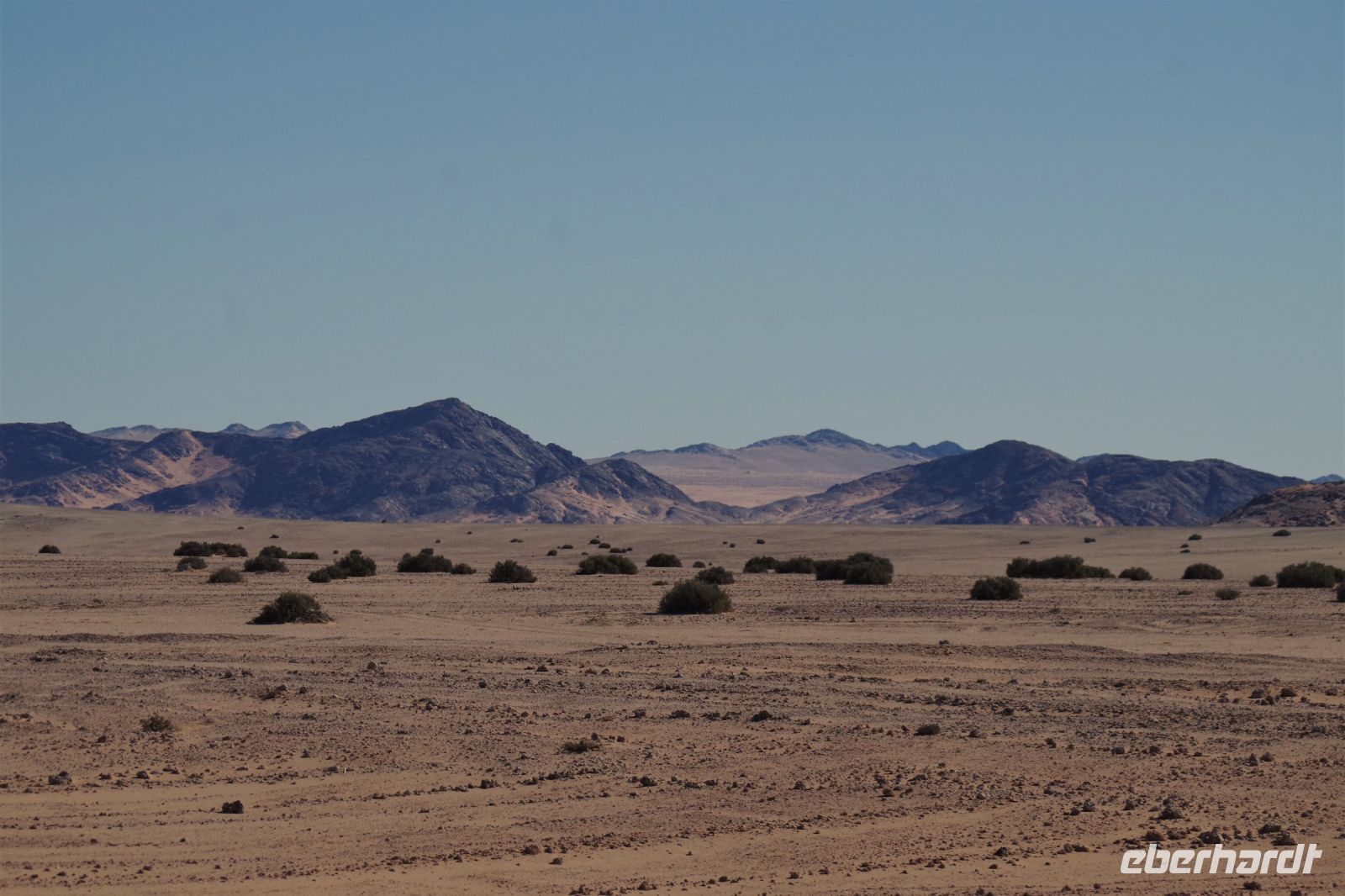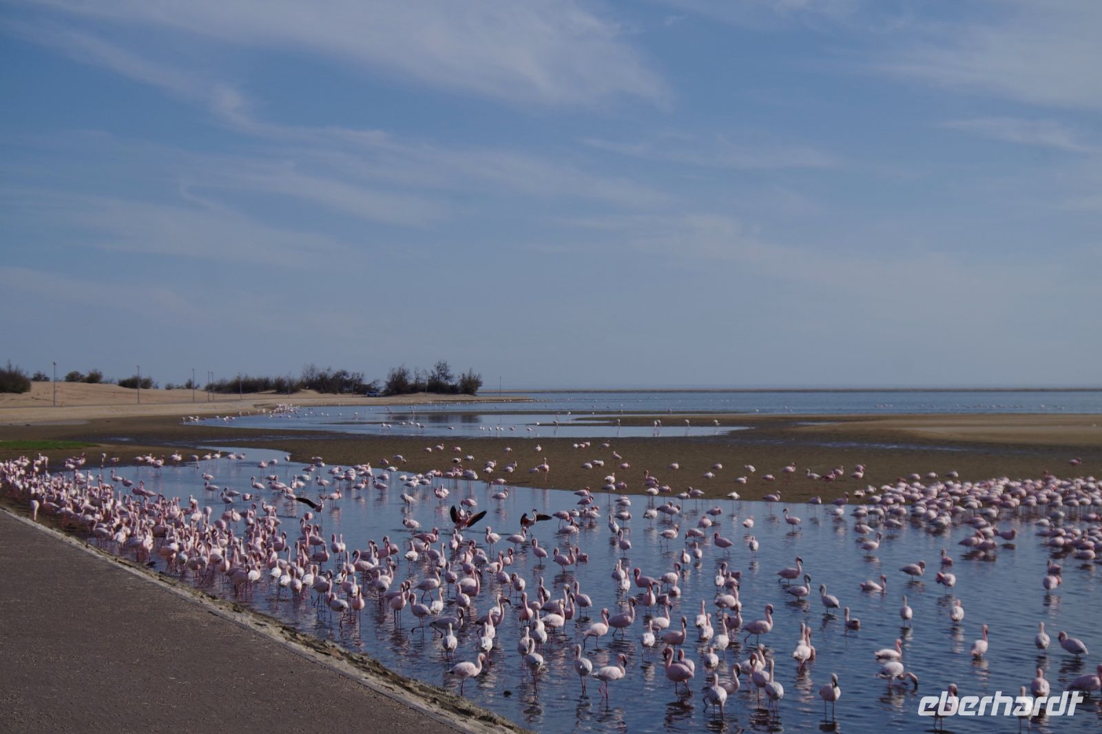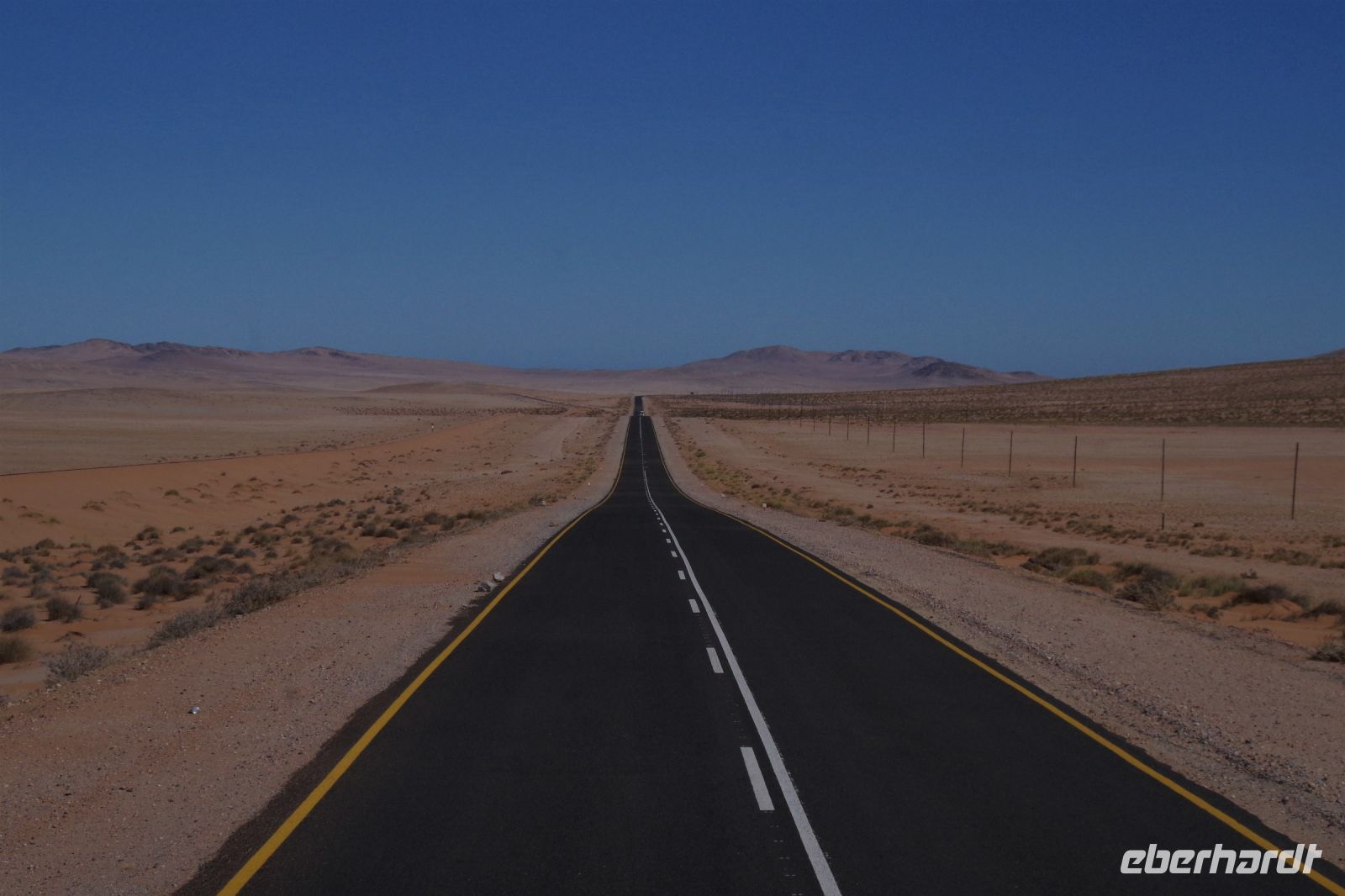 Wir verließen die Wüste und fuhren weiter durch das karge Naukluft Gebirge (über 1.000 m hoch). In Solitaire, einem weiteren wichtigen und bekannten Verkehrsknotenpunkt, machten wir noch einen Tankstopp. Dort befindet sich die bekannte Bäckerei von Moose Mc Gregor, der vor einigen Jahren verstarb. Doch die Tradition der Bäckerei wird fortgeführt. Hier gibt es neben dem über die Landesgrenzen hinaus bekannten Apfelkuchen, auch Schweinsohren und andere, süße Leckereien, den wir als Proviant für unser Picknick mitnahmen. Über den Gaub Pass (ca. 800 m hoch) passierten wir abermals den südlichen Wendekreis des Steinbocks (Tropic of capricorn). Landschaftlich rauh, aber wunderschön empfanden wir diese Strecke, die wir mit verschiedenen Fotostopps auflockerten. Später passierten wir Kuiseb Canyon und fuhren über die kleine Brücke über den ausgetrockneten Kuiseb. Hier in dieser Region hielt sich Prof. Dr. Henno Martin (Geologe und Autor des Bestsellers "Wenn es Krieg gibt, gehen wir in die Wüste") mit seinem Freund während des 2. Weltkriegs versteckt. Unterwegs picknickten wir, bevor wir am frühen Nachmittag die Teerstraße in Walvis Bay erreichten. Nach der Hitze der Wüste freuten wir uns nun auf etwas Frische.