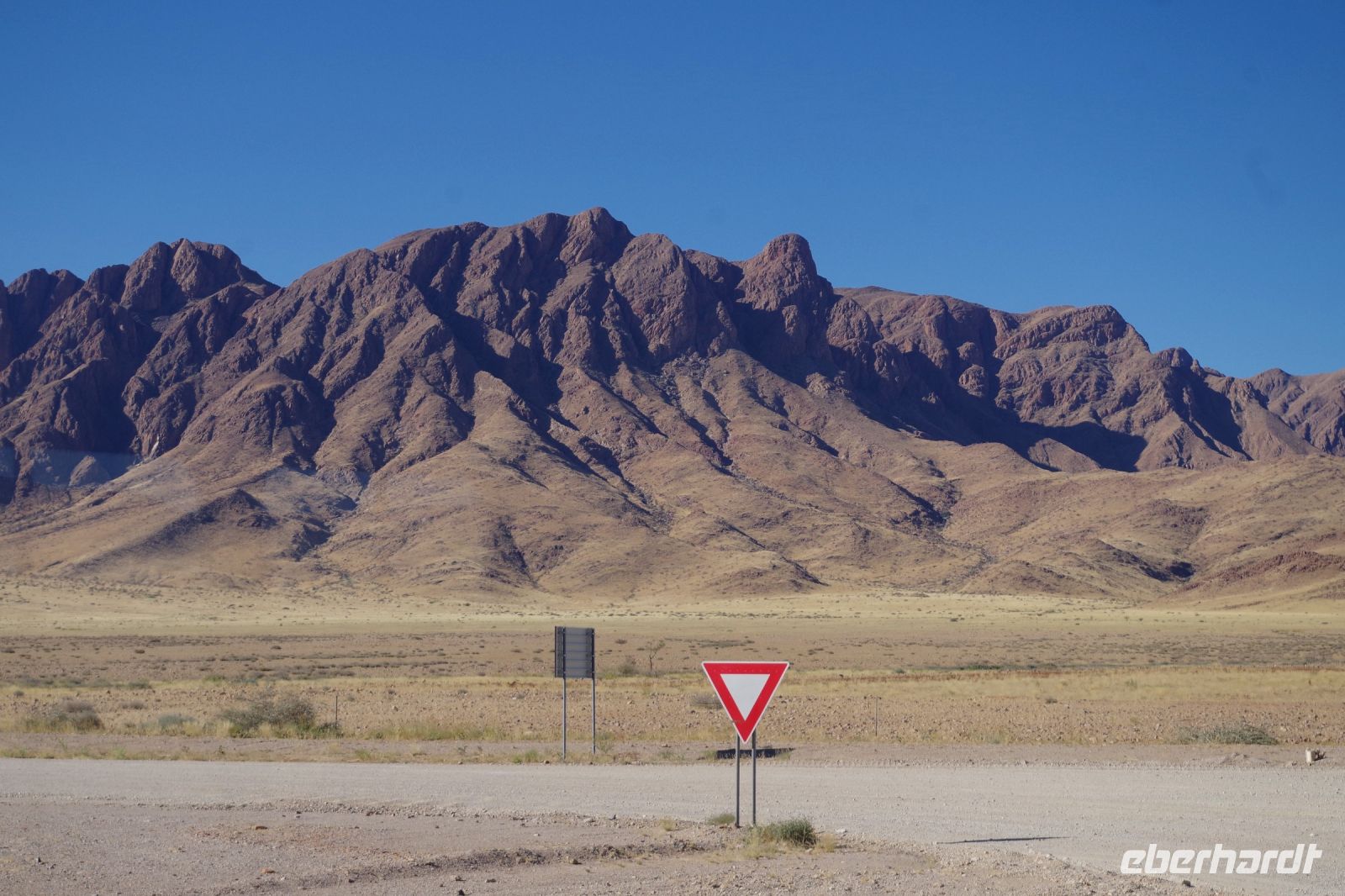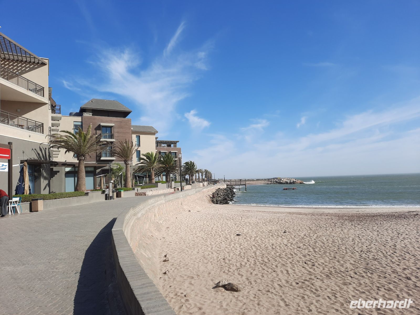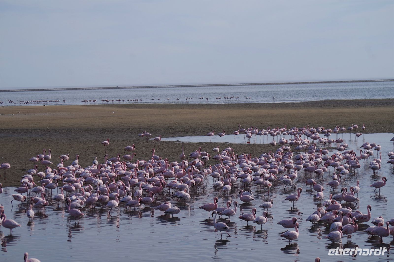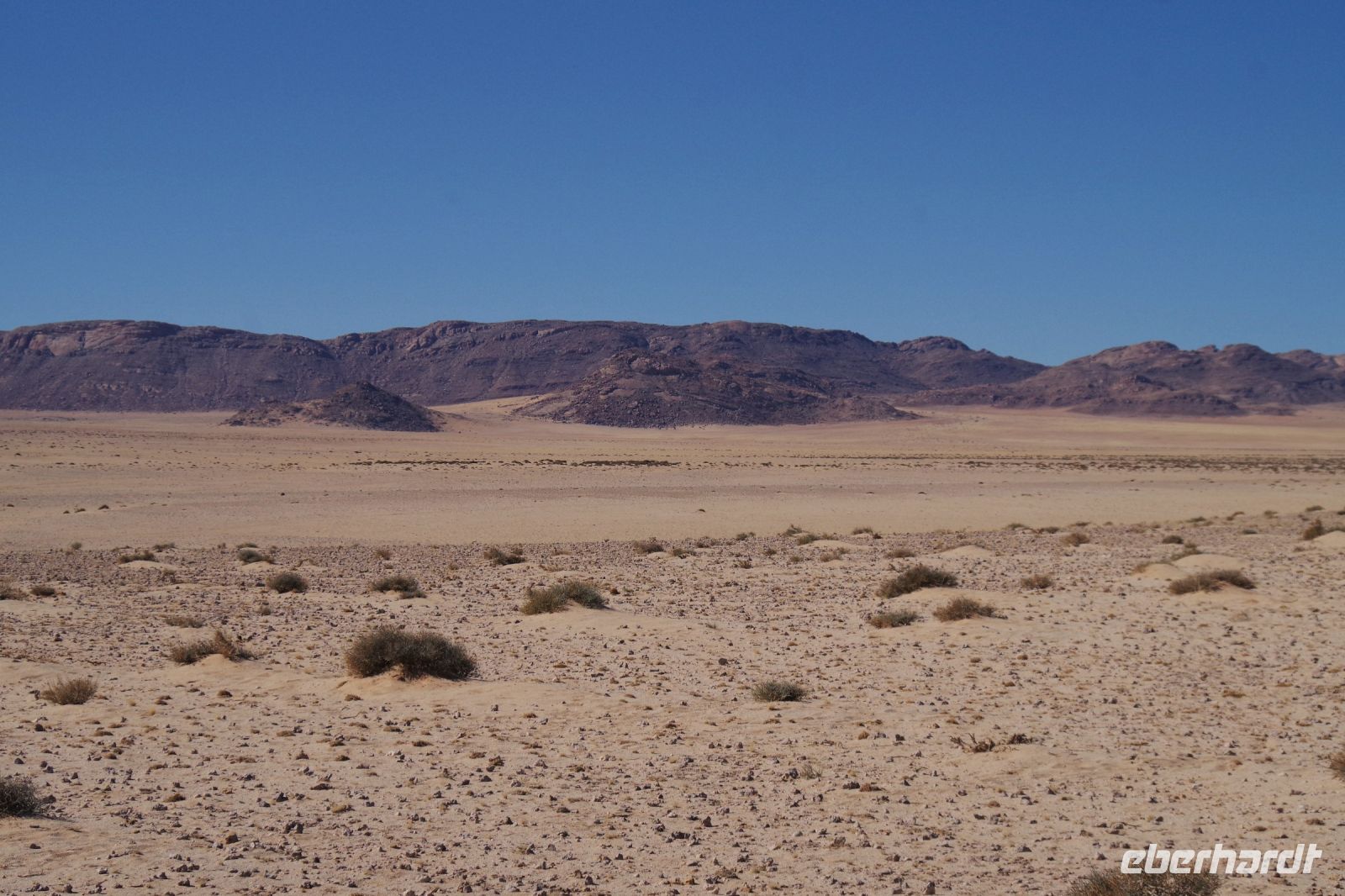Wir verließen die Wüste und fuhren weiter durch das karge Naukluft Gebirge (über 1.000 m hoch). In Solitaire, einem weiteren wichtigen und bekannten Verkehrsknotenpunkt, machten wir noch einen Tankstopp. Dort befindet sich die bekannte Bäckerei von Moose Mc Gregor, der vor einigen Jahren verstarb. Doch die Tradition der Bäckerei wird fortgeführt. Hier gibt es neben dem über die Landesgrenzen hinaus bekannten Apfelkuchen, auch Schweinsohren und andere, süße Leckereien, den wir als Proviant für unser Picknick mitnahmen. Über den Gaub Pass (ca. 800 m hoch) passierten wir abermals den südlichen Wendekreis des Steinbocks (Tropic of capricorn). Landschaftlich rauh, aber wunderschön empfanden wir diese Strecke, die wir mit verschiedenen Fotostopps auflockerten. Später passierten wir Kuiseb Canyon und fuhren über die kleine Brücke über den ausgetrockneten Kuiseb. Hier in dieser Region hielt sich Prof. Dr. Henno Martin (Geologe und Autor des Bestsellers "Wenn es Krieg gibt, gehen wir in die Wüste") mit seinem Freund während des 2. Weltkriegs versteckt. Unterwegs picknickten wir, bevor wir am frühen Nachmittag die Teerstraße in Walvis Bay erreichten. Nach der Hitze der Wüste freuten wir uns nun auf etwas Frische.