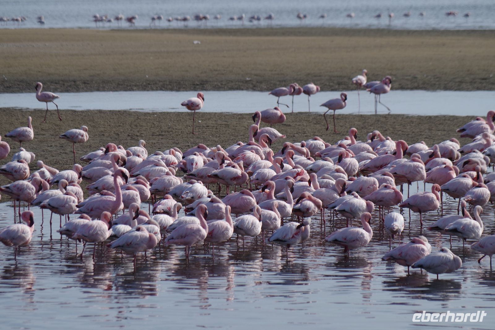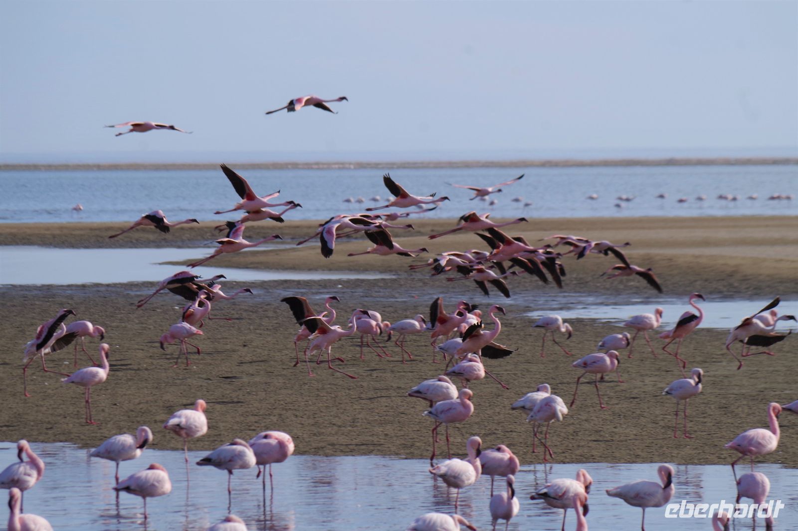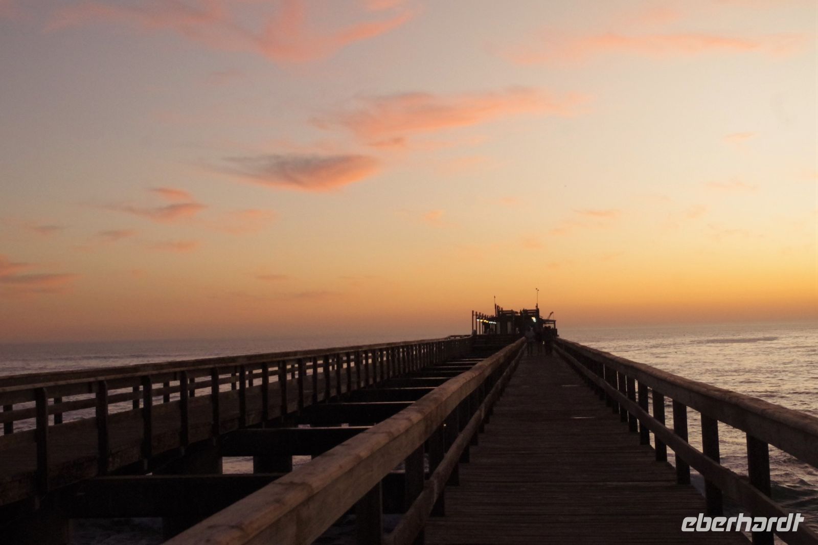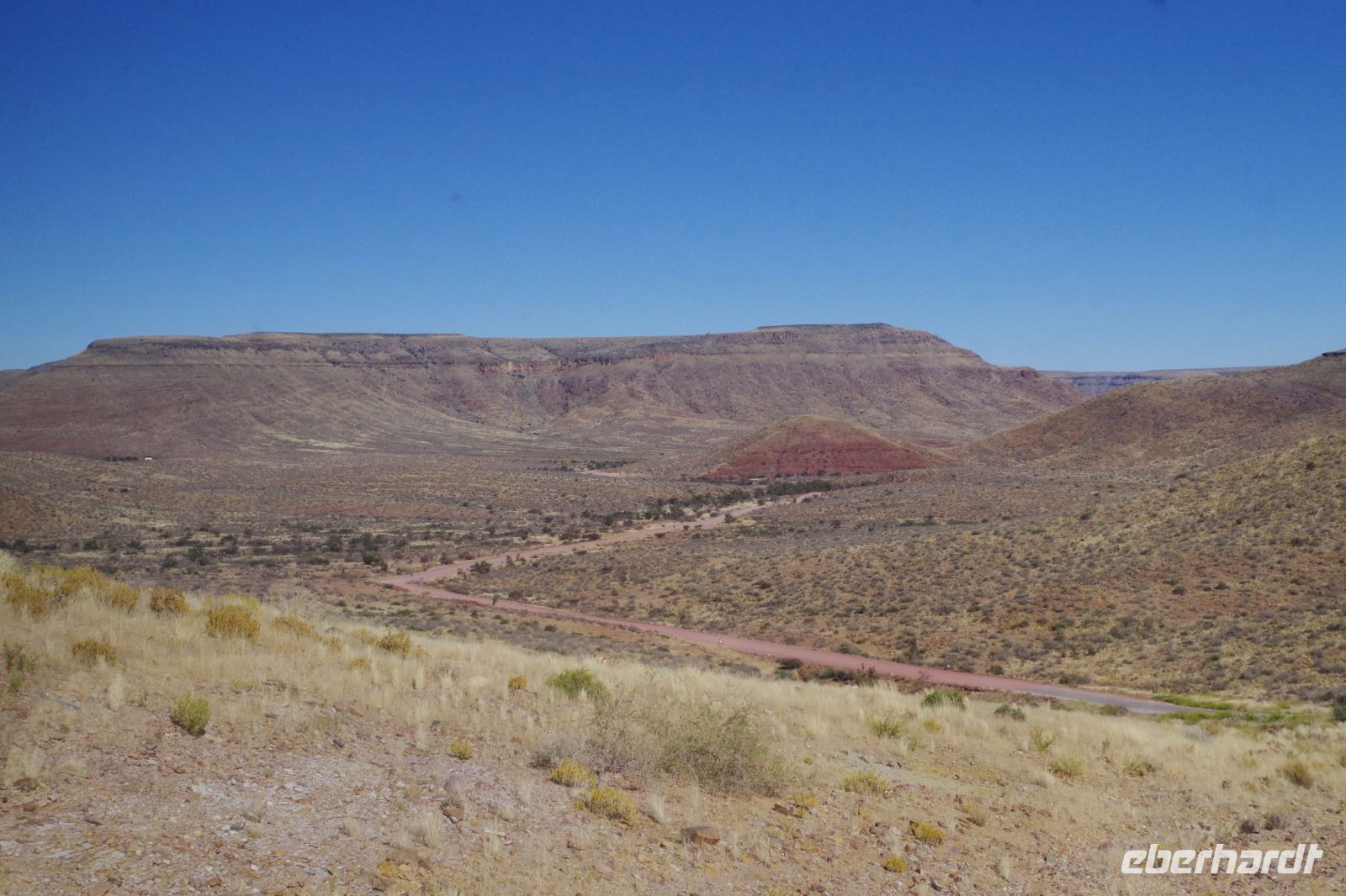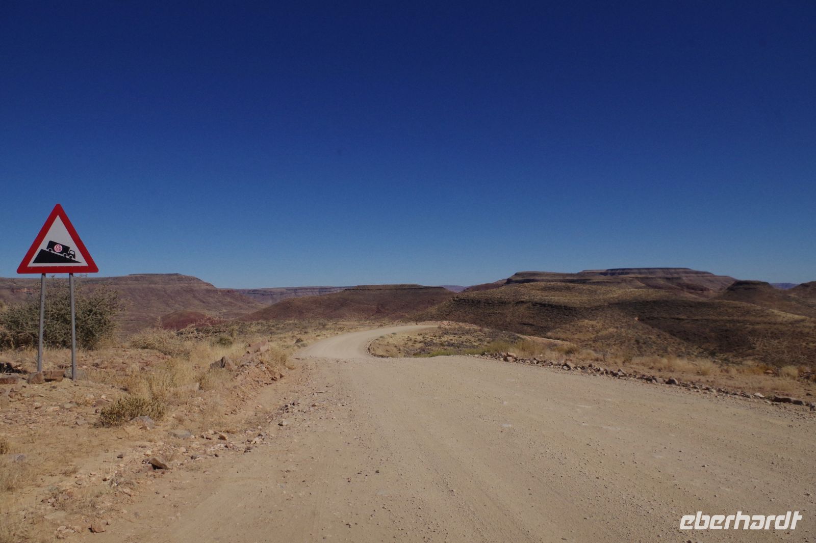 Wir verließen die Wüste und fuhren weiter durch das karge Naukluft Gebirge (über 1.000 m hoch). In Solitaire, einem weiteren wichtigen und bekannten Verkehrsknotenpunkt, machten wir noch einen Tankstopp. Dort befindet sich die bekannte Bäckerei von Moose Mc Gregor, der vor einigen Jahren verstarb. Doch die Tradition der Bäckerei wird fortgeführt. Hier gibt es neben dem über die Landesgrenzen hinaus bekannten Apfelkuchen, auch Schweinsohren und andere, süße Leckereien, den wir als Proviant für unser Picknick mitnahmen. Über den Gaub Pass (ca. 800 m hoch) passierten wir abermals den südlichen Wendekreis des Steinbocks (Tropic of capricorn). Landschaftlich rauh, aber wunderschön empfanden wir diese Strecke, die wir mit verschiedenen Fotostopps auflockerten. Später passierten wir Kuiseb Canyon und fuhren über die kleine Brücke über den ausgetrockneten Kuiseb. Hier in dieser Region hielt sich Prof. Dr. Henno Martin (Geologe und Autor des Bestsellers "Wenn es Krieg gibt, gehen wir in die Wüste") mit seinem Freund während des 2. Weltkriegs versteckt. Unterwegs picknickten wir, bevor wir am frühen Nachmittag die Teerstraße in Walvis Bay erreichten. Nach der Hitze der Wüste freuten wir uns nun auf etwas Frische.