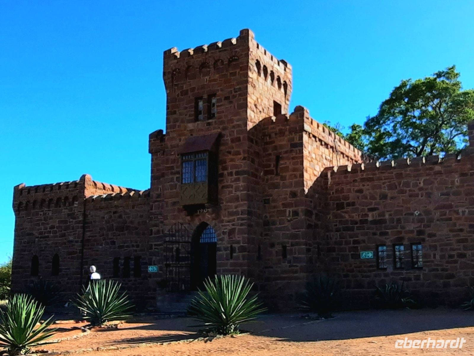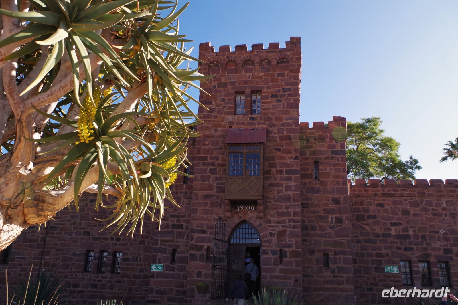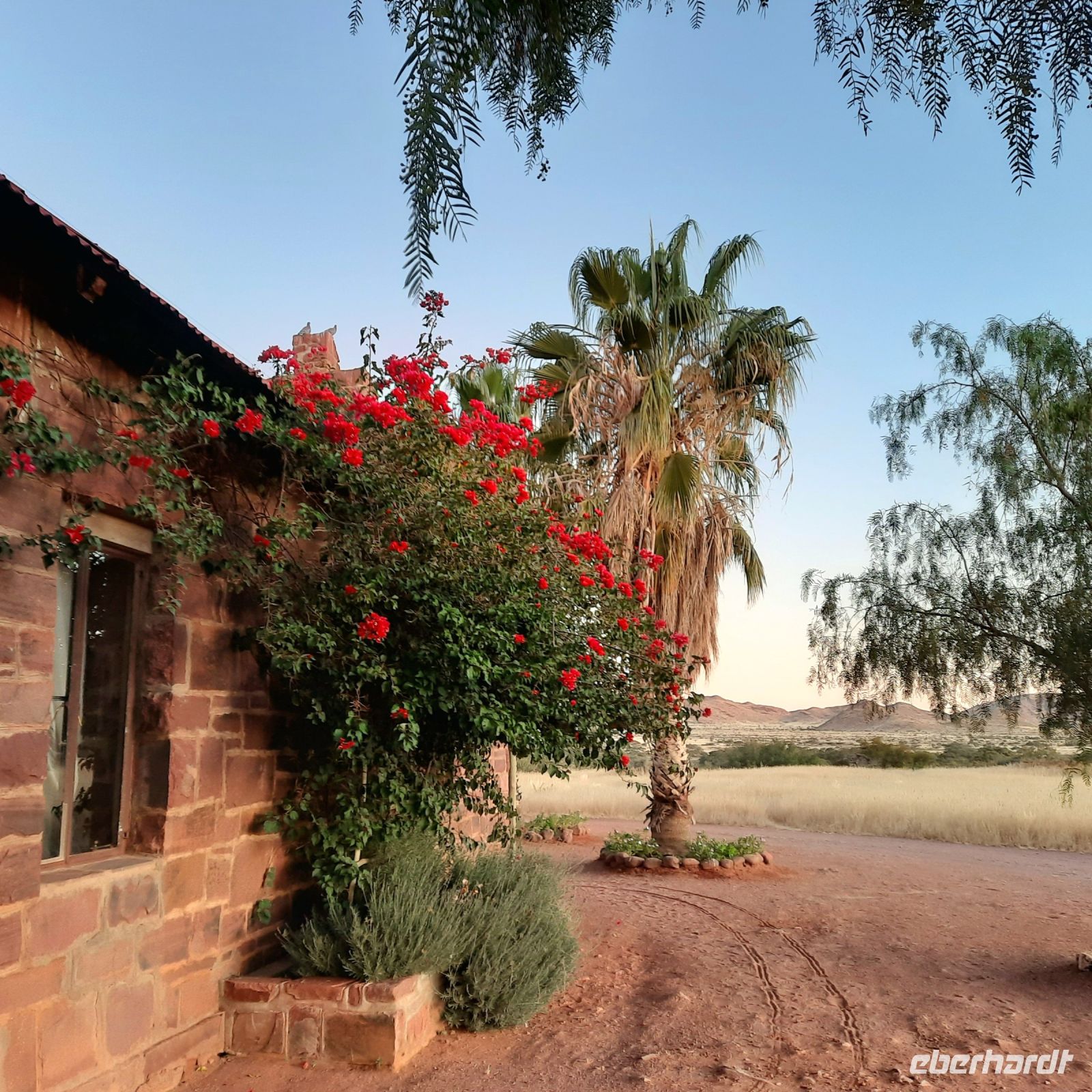 Gleich neben der Gästefarm, auf deren Gelände früher die Wirtschaftsgebäude des Schlosses waren, thront das skurrile Schloss Duwisib. Dank der Beziehungen der Farmerfamilie konnten wir das Schloss auch von Innen besichtigen. Eigentlich hat es seit langem geschlossen. Das Schloss wurde 1979 vom namibischen erworben und restauriert. Zur Geschichte: Der deutsche Aristokrat Baron Hansheinrich von Wolf - er hatte zuvor in der Schutztruppe gedient - und seine begüterte amerikanische Ehefrau Jayta ließen Schloss Duwisib um 1908 von einem Berliner Architekten erbauen. Das Schloss ist aus rotem Sandstein und hat 22 Zimmer, einen Rittersaal und einen schattigen Innenhof mit Springbrunnen. Von Wolf kaufte mehrere umliegende Farmen auf und begann auf seinem über 50.000 Hektar großen Anwesen eine Pferdezucht im großen Stil. Bei Ausbruch des 1. Weltkriegs befanden sich die Wolfs auf einer Seereise, und Baron von Wolf meldete sich sogleich als Offizier. Er fiel 1916 in den Schützengräben in Frankreich. Seine Frau kehrte nie wieder nach Duwisib zurück. Nach der Besichtigung nahmen wir Abschied von unseren Gastgebern. Unser nächstes Ziel war die Namib Wüste. Auf unserer Fahrt begleiteten uns die malerischen Bergketten der Nubibberge, ein Bergmassiv sah aus wie ein Gesicht. Unterwegs entdeckte Harold mit seinen Späheraugen eine winzige Schlange unter einem Baum, eine Sandviper oder so. Auch erzählte er uns Unterhaltsames aus dem Herero-Leben. Am Nachmittag erreichten wir unsere Lodge am Rande des Nationalparks Sossusvlei. Kaffee und Kuchen standen schon bereit. In der schattigen Gartenlounge verbrachten wir die Zeit bis zum Abendessen bei netten Gesprächen und einem kühlen Getränk. Beim Abendessen feierten wir den runden Geburtstag eines Gastes, der mit rythmischen Gesangs- und Tanzeinlagen und einer Geburtstagstorte überrascht wurde. Der Song Amararula schmetterte aus unseren Kehlen und später erfrischte dieser unsere Gaumen.