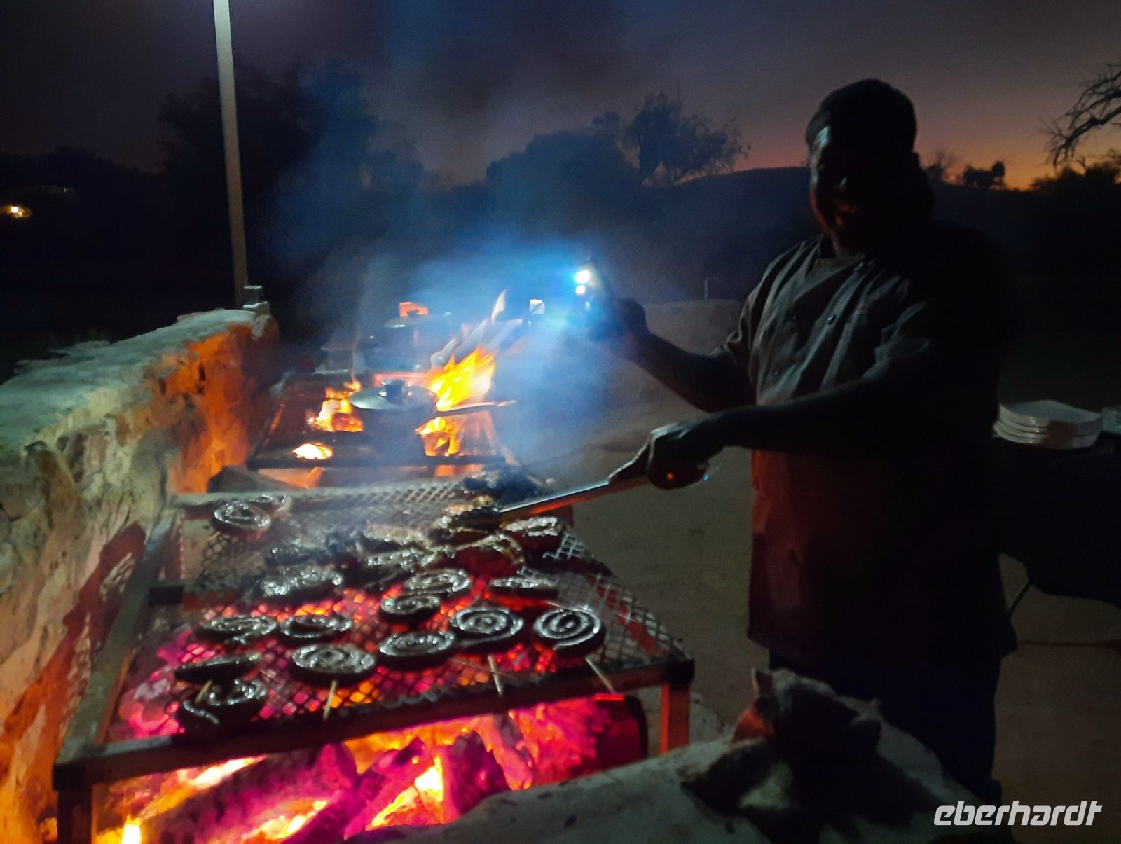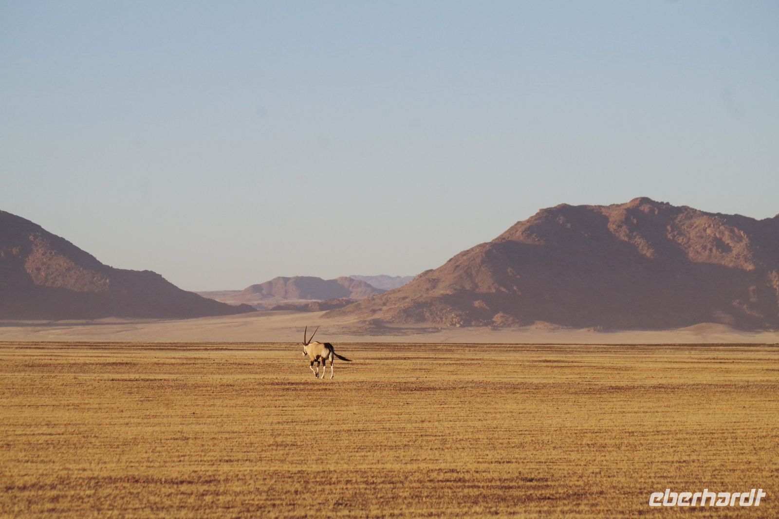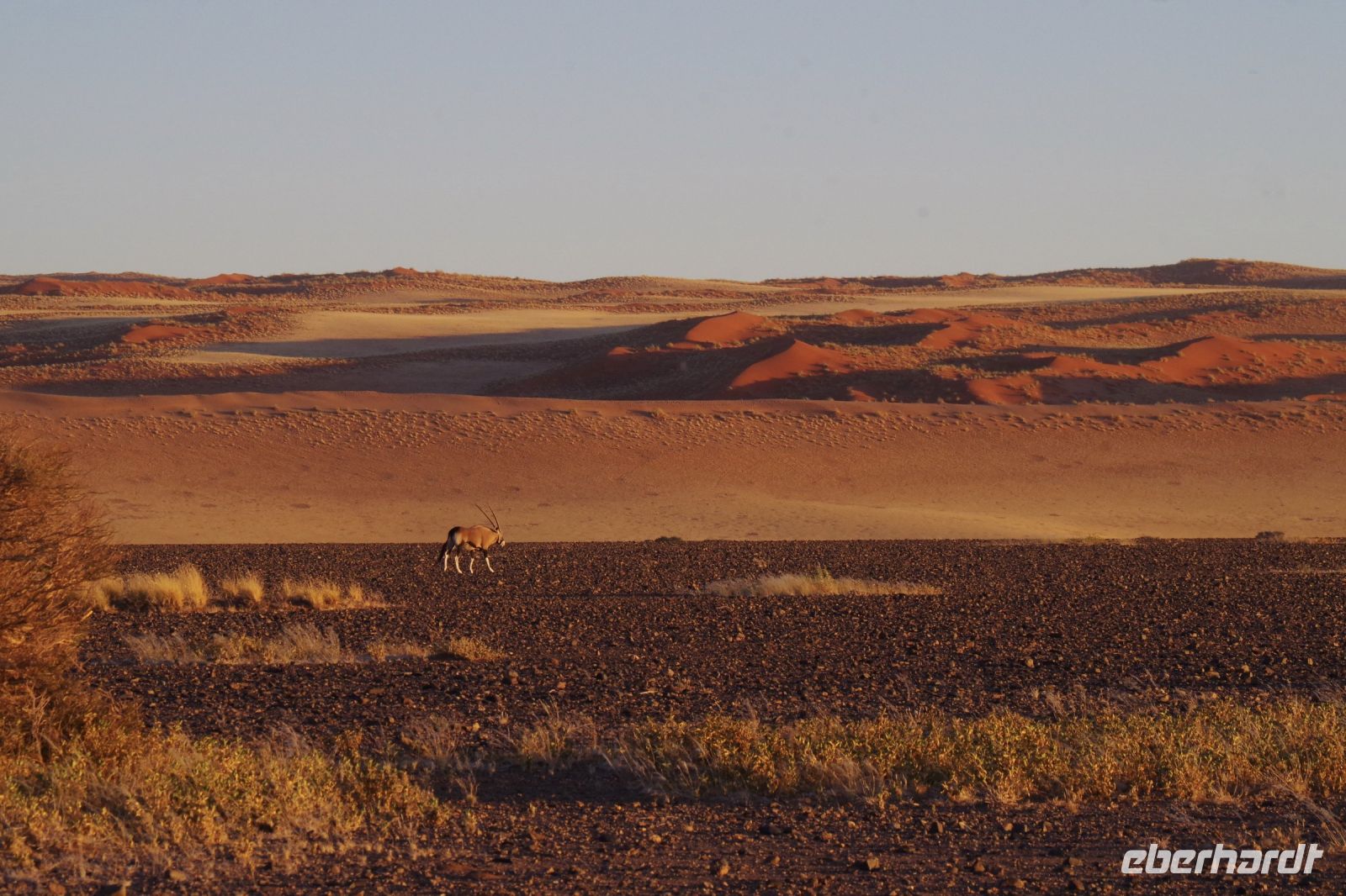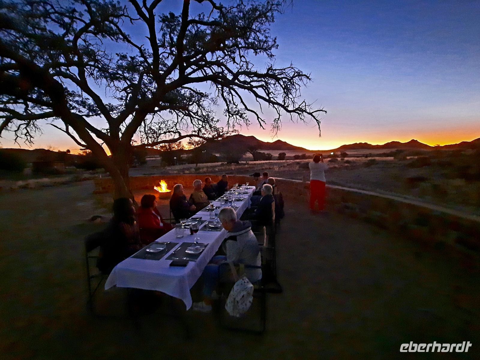 Die Sonne stand mittlerweile im Zenit und brannte doch recht heftig. Im klimatisierten Truck fuhren wir zurück. Unterwegs sichteten wir große Springbock- und Oryxherden, denen die Hitze nichts auszumachen schien. Der letzte Programmpunkt unseres Wüstentages war der Sesriem Canyon. Sesriem bedeutet 6 Riemen. Der durch den Tsauchab entstandene Canyon ist ungefähr 6 Ochsenriemen tief. Einige Gäste stiegen mit Annett hinab. Der Canyon war trocken, unten erstaunlich kühl. In einer kleinen Pfütze am Beginn des Canyons spiegelten sich eindrucksvoll die interessanten Formationen aus Sedimentgestein. Zurück in der Lodge machten wir es uns am Pool gemütlich und ließen die Seele baumeln. Kaffee, Kuchen und ein kühles Bier gehörten auch zur Geniesserzeit. Die Lodgemitarbeiter überraschten uns diesmal mit einem besonderen Abendessen. Romantisch brasselte ein Lagerfeuer, die Tische waren für uns outside eingedeckt. Bei Kerzenschein genossen wir einen angenehmes Braai unter den Sternen. Die untergehende Sonne faszinierte uns und wir sahen das Kreuz des Südens.