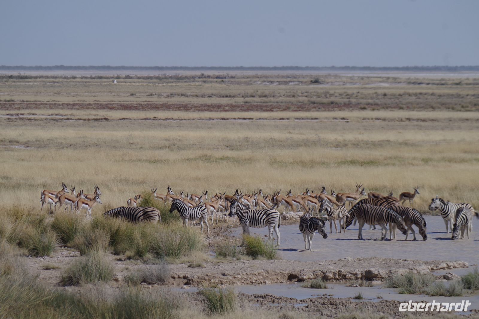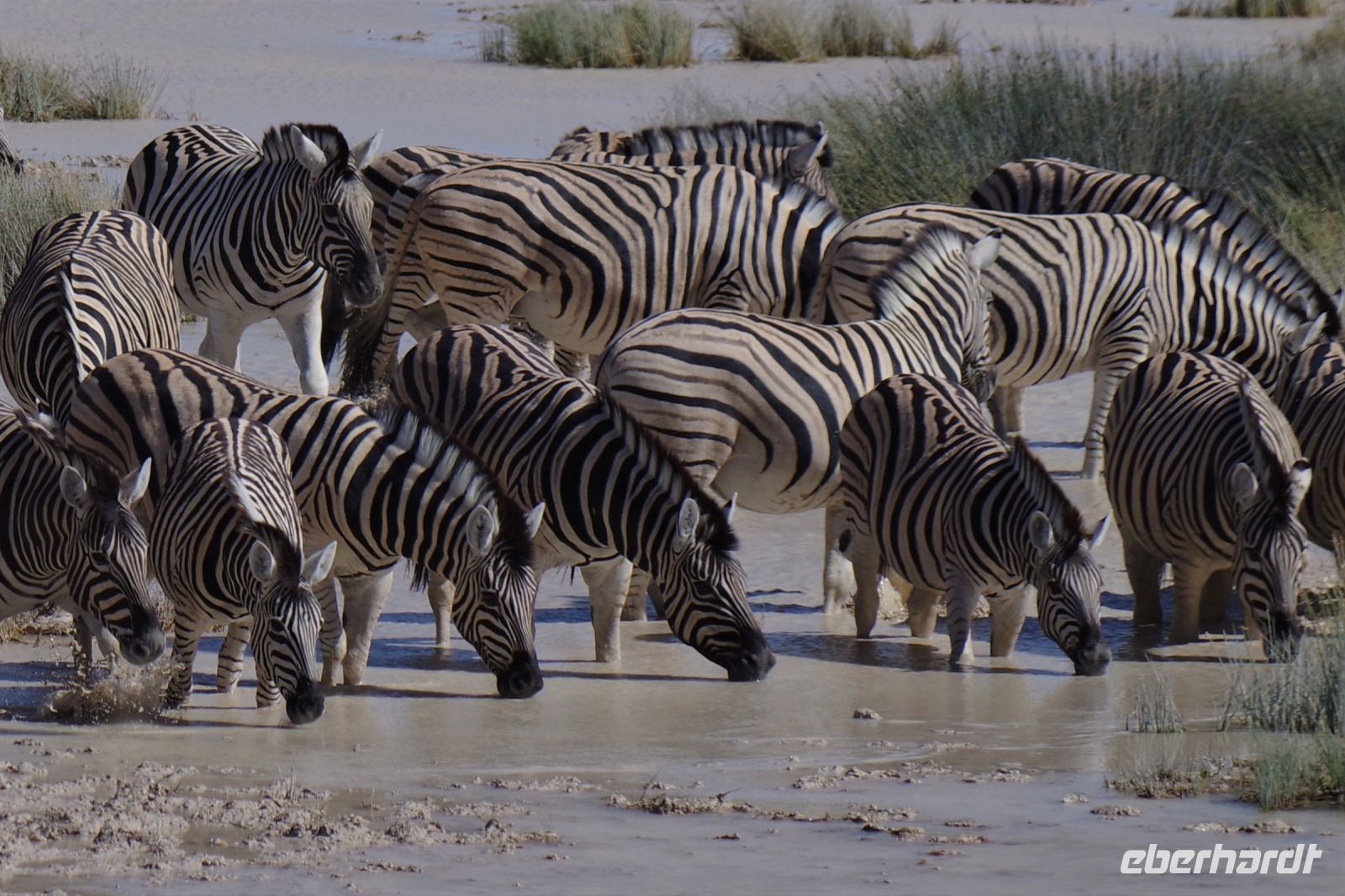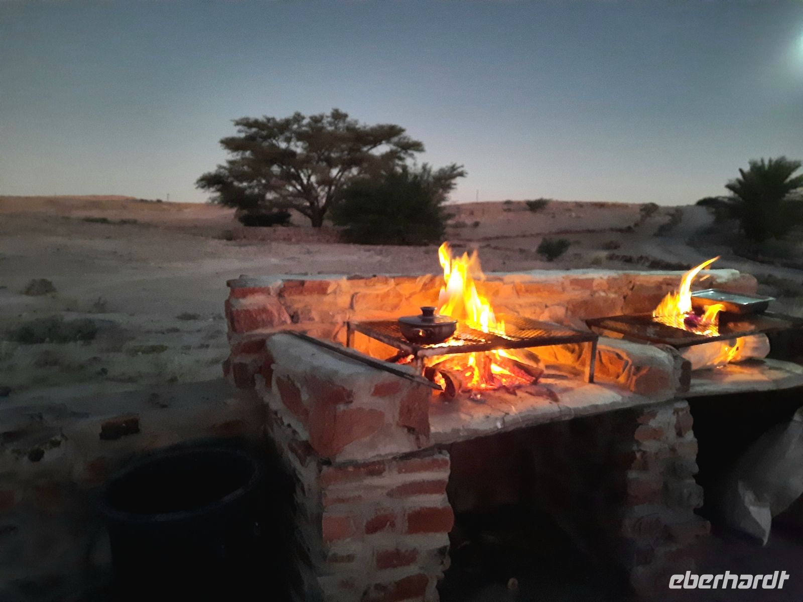 Die Sonne stand mittlerweile im Zenit und brannte doch recht heftig. Im klimatisierten Truck fuhren wir zurück. Unterwegs sichteten wir große Springbock- und Oryxherden, denen die Hitze nichts auszumachen schien. Der letzte Programmpunkt unseres Wüstentages war der Sesriem Canyon. Sesriem bedeutet 6 Riemen. Der durch den Tsauchab entstandene Canyon ist ungefähr 6 Ochsenriemen tief. Einige Gäste stiegen mit Annett hinab. Der Canyon war trocken, unten erstaunlich kühl. In einer kleinen Pfütze am Beginn des Canyons spiegelten sich eindrucksvoll die interessanten Formationen aus Sedimentgestein. Zurück in der Lodge machten wir es uns am Pool gemütlich und ließen die Seele baumeln. Kaffee, Kuchen und ein kühles Bier gehörten auch zur Geniesserzeit. Die Lodgemitarbeiter überraschten uns diesmal mit einem besonderen Abendessen. Romantisch brasselte ein Lagerfeuer, die Tische waren für uns outside eingedeckt. Bei Kerzenschein genossen wir einen angenehmes Braai unter den Sternen. Die untergehende Sonne faszinierte uns und wir sahen das Kreuz des Südens.