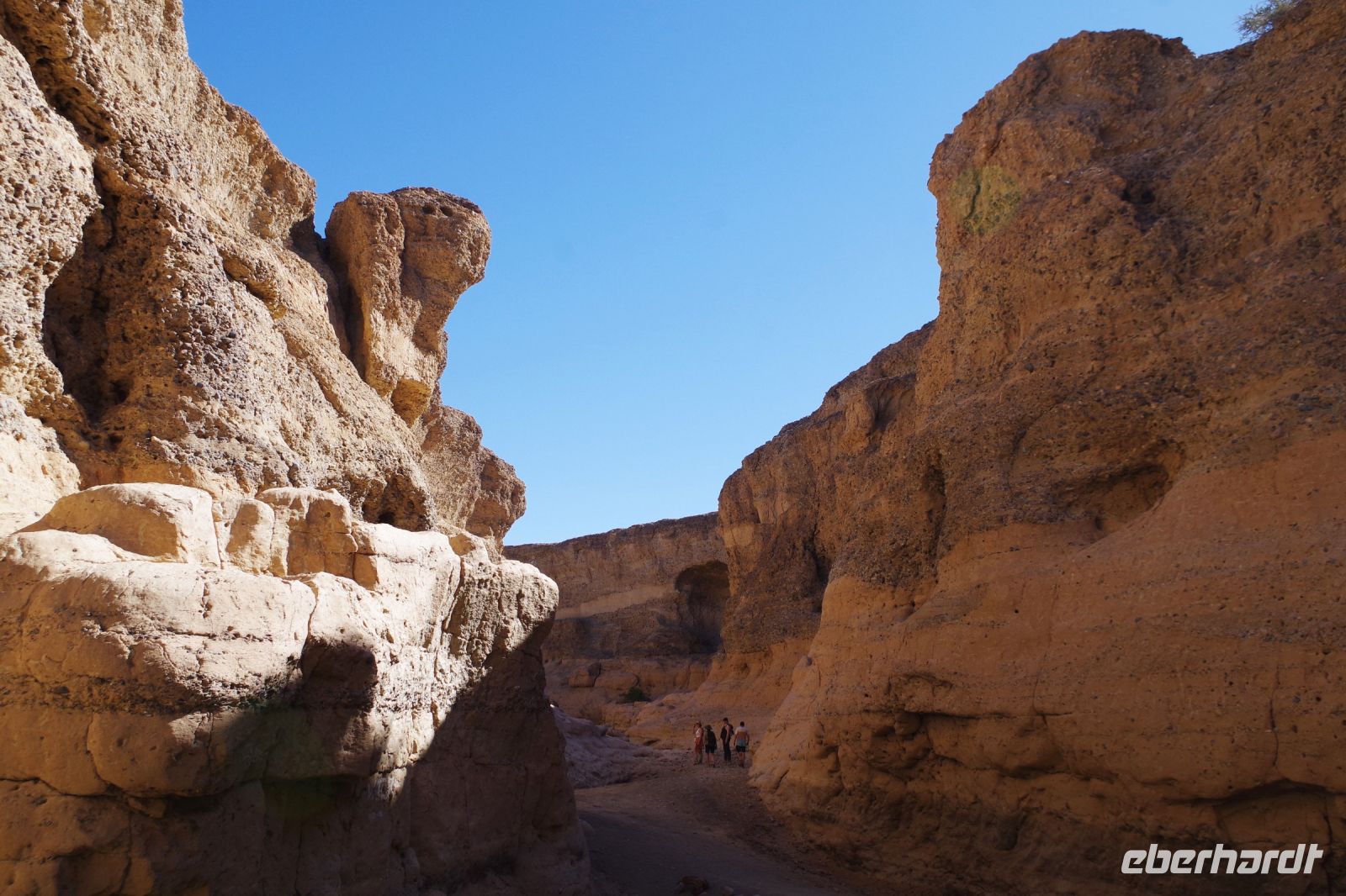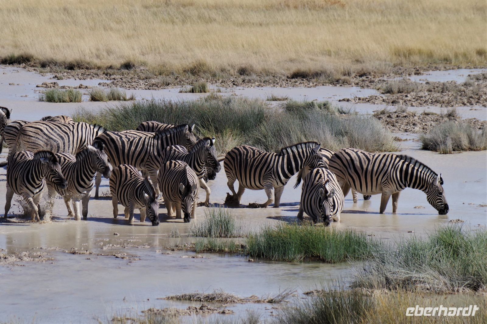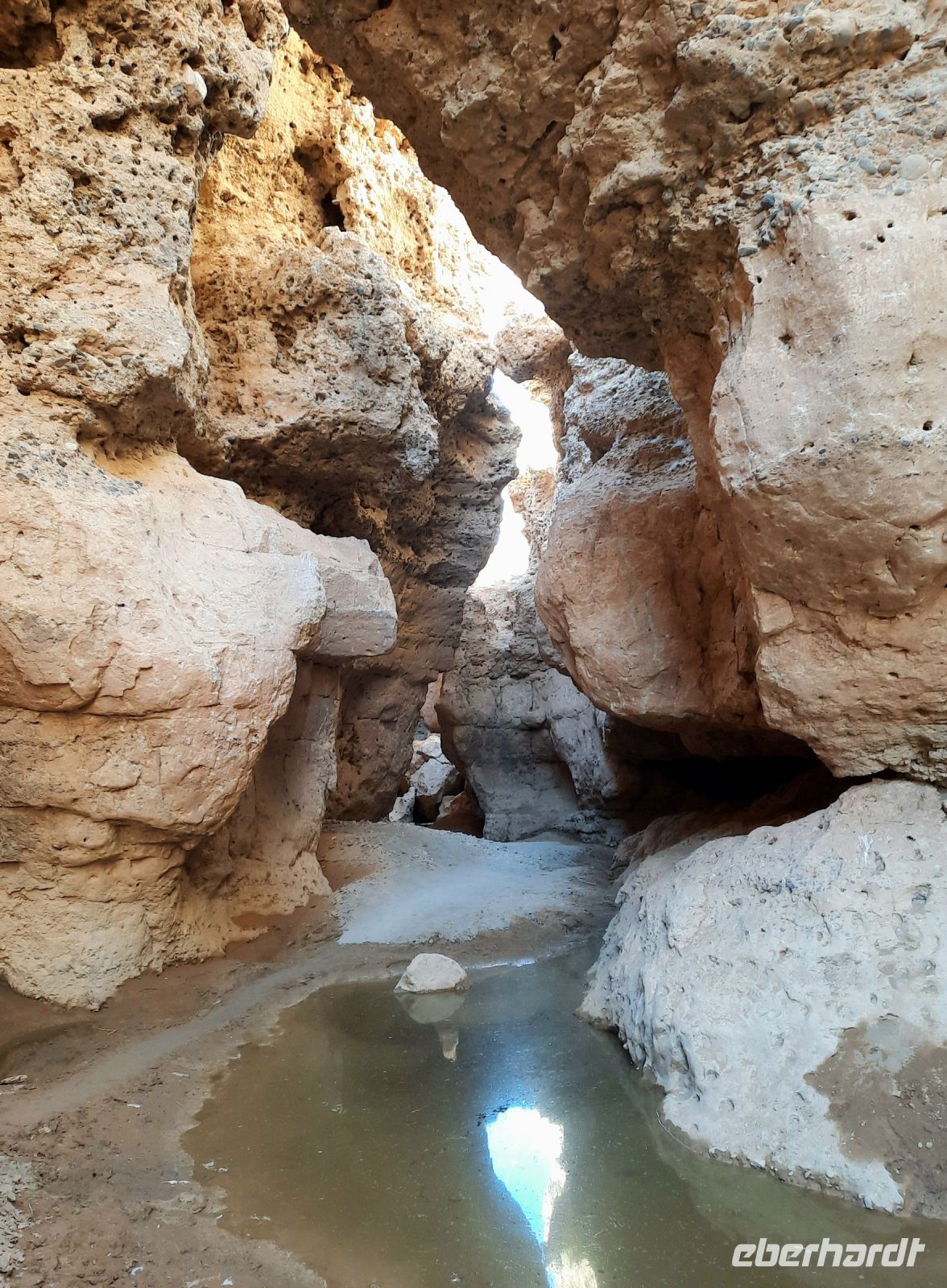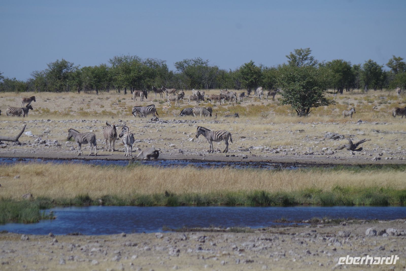 Die Sonne stand mittlerweile im Zenit und brannte doch recht heftig. Im klimatisierten Truck fuhren wir zurück. Unterwegs sichteten wir große Springbock- und Oryxherden, denen die Hitze nichts auszumachen schien. Der letzte Programmpunkt unseres Wüstentages war der Sesriem Canyon. Sesriem bedeutet 6 Riemen. Der durch den Tsauchab entstandene Canyon ist ungefähr 6 Ochsenriemen tief. Einige Gäste stiegen mit Annett hinab. Der Canyon war trocken, unten erstaunlich kühl. In einer kleinen Pfütze am Beginn des Canyons spiegelten sich eindrucksvoll die interessanten Formationen aus Sedimentgestein. Zurück in der Lodge machten wir es uns am Pool gemütlich und ließen die Seele baumeln. Kaffee, Kuchen und ein kühles Bier gehörten auch zur Geniesserzeit. Die Lodgemitarbeiter überraschten uns diesmal mit einem besonderen Abendessen. Romantisch brasselte ein Lagerfeuer, die Tische waren für uns outside eingedeckt. Bei Kerzenschein genossen wir einen angenehmes Braai unter den Sternen. Die untergehende Sonne faszinierte uns und wir sahen das Kreuz des Südens.