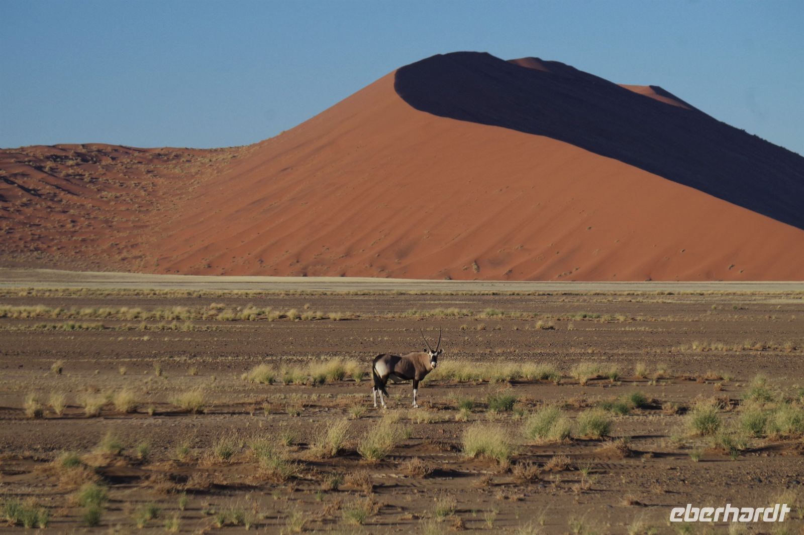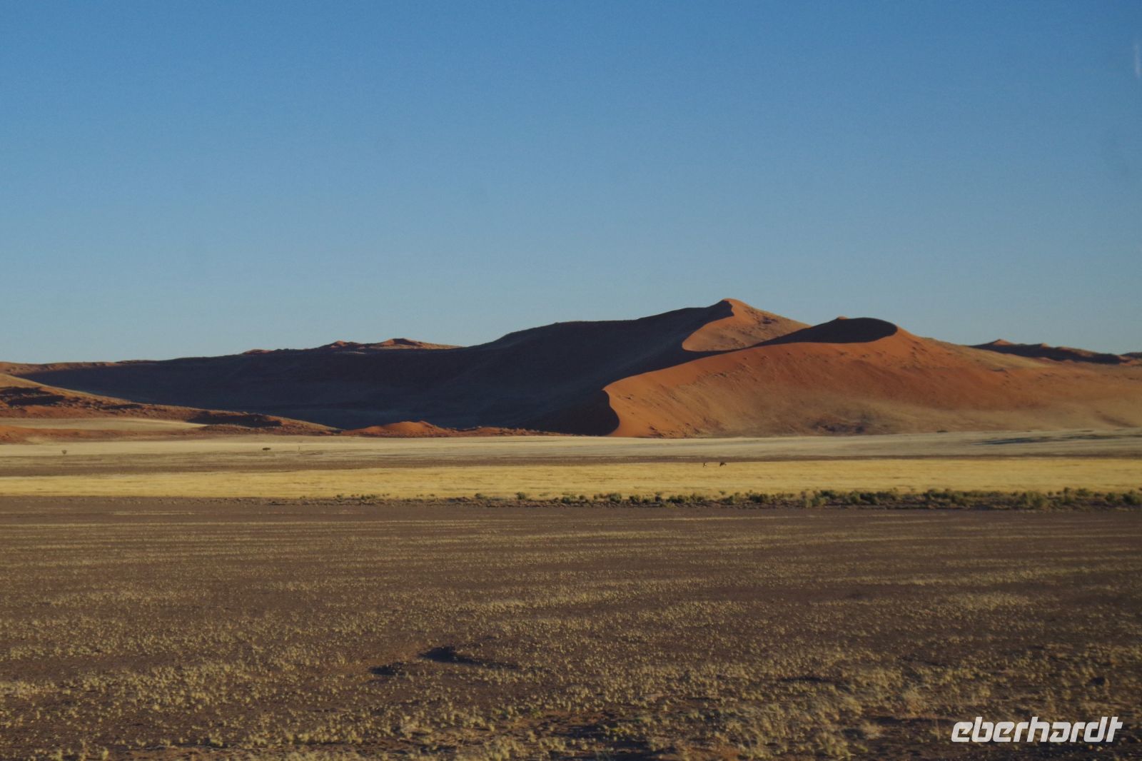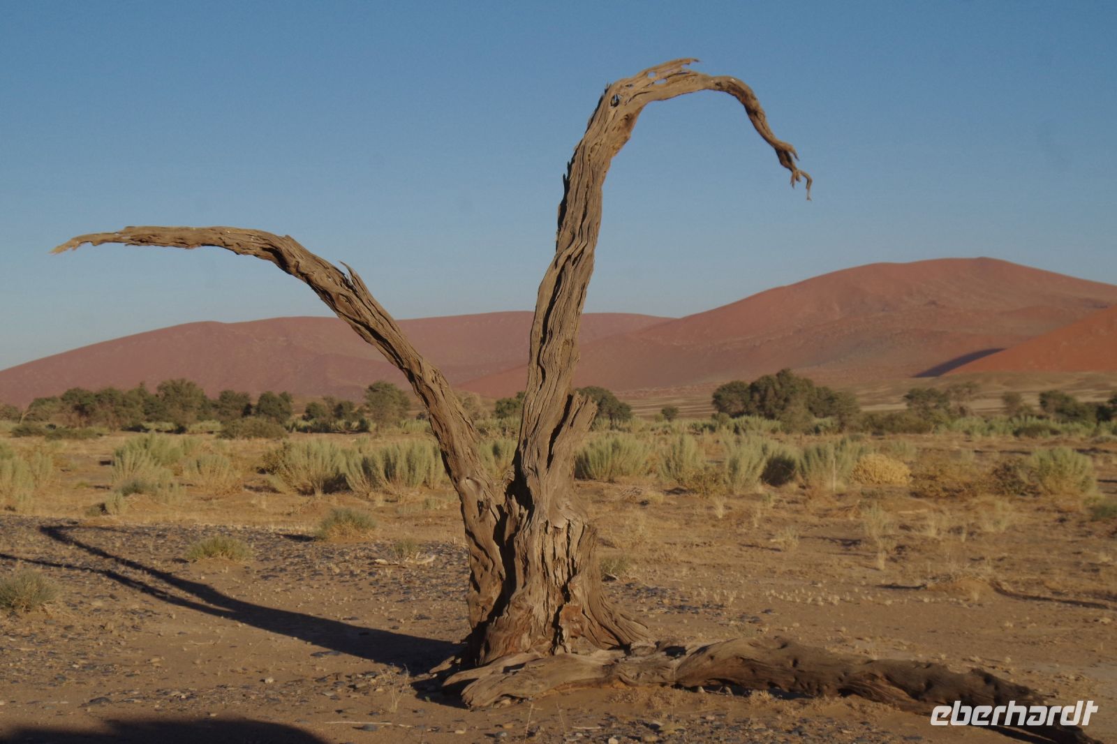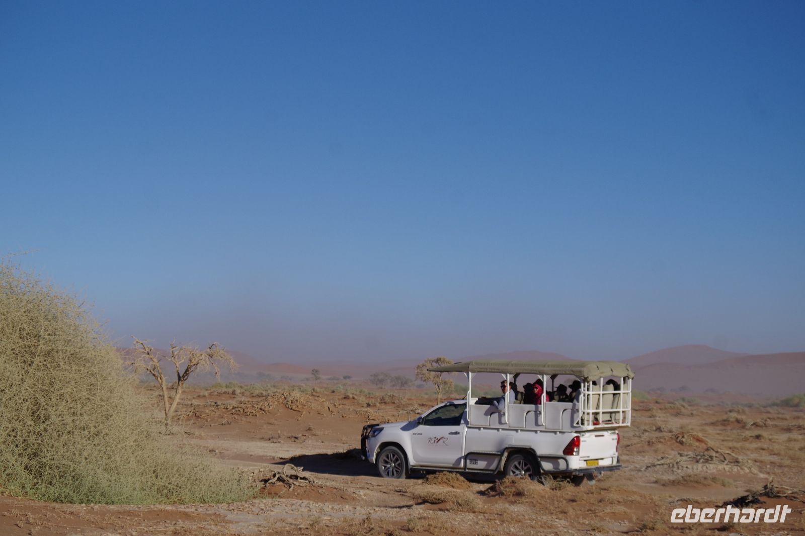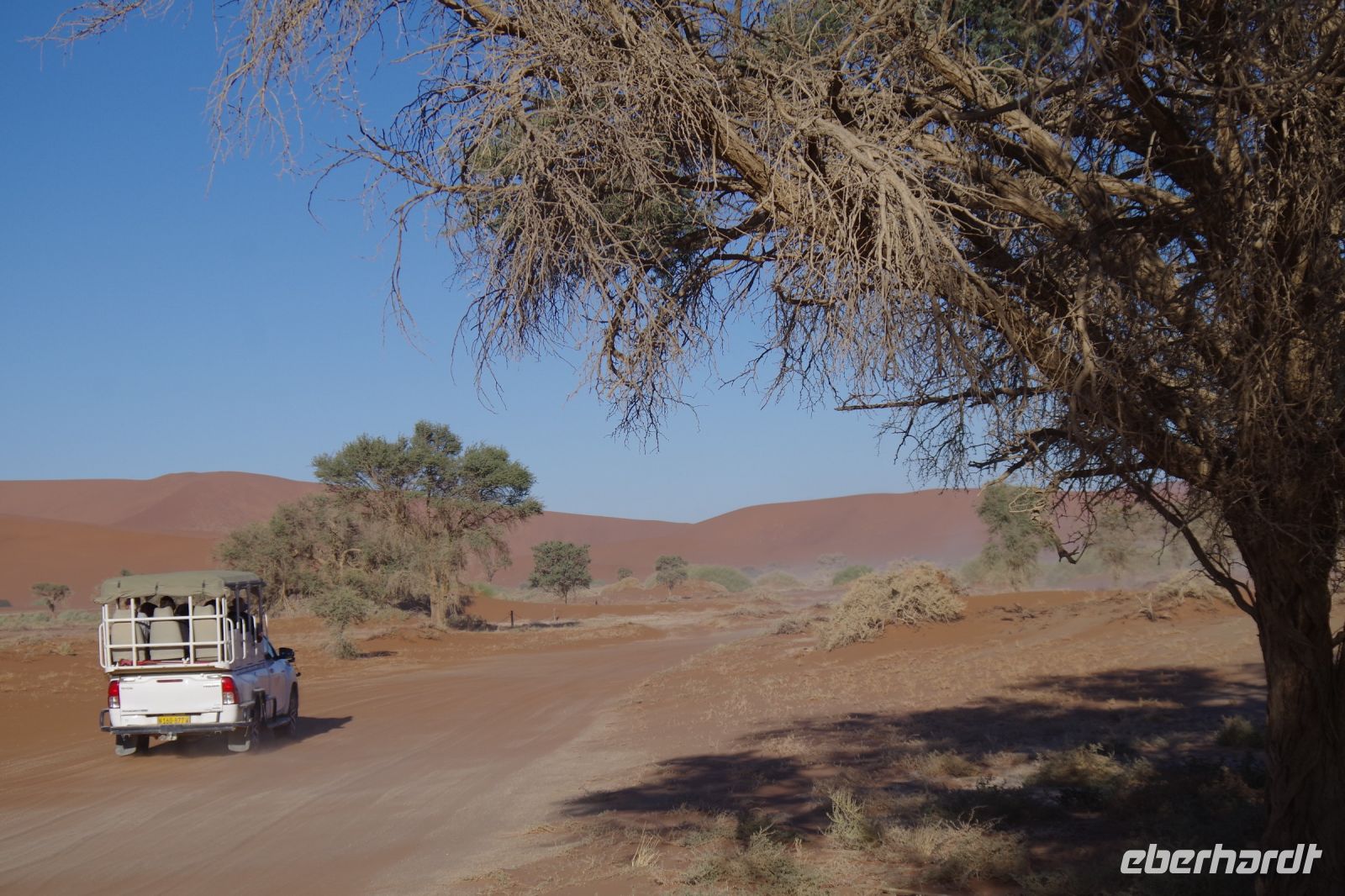 Die Lodge liegt relativ nah am Eingang des Nationalparks und so konnten wir doch etwas länger schlafen als in anderen Lodges und in unserer Lodge frühstücken. Die Tore öffnen bei Sonnenaufgang. Noch sind wenige Touristen im Land unterwegs, aber das wird sich hoffentlich bald ändern. Umso schöner für uns. Unterwegs hielten wir an und schauten der Sonne beim Aufstehen zu. Langsam formte sich die Dünenlandschaft. Das Stimmung am kühleren Morgen ist besonders toll - das Farbenspiel einmalig. Klick, Klick, unsere Kameras hatten viel zu tun. Man sah das tiefgrüne Band des Tsauchab Rivier, das sich durch die karge Wüste schlängelte. In der Regenzeit, Anfang diesen Jahres ist das Rivier abgekommen (ist geflossen) und hat das Sossusvlei (Lehmsenke) am Ende mit Wasser gefüllt. Es war alles noch sehr grün und wir sahen erstaunlich viele Tiere unterwegs: Oryxe und Springböcke. Obligatorischer erster Stopp war an Düne 45, wo einige hinauf stiegen. Am 4x4 Parkplatz (Ende der Teerstraße) angekommen, stiegen wir in 4x4-Shuttle um und schlitterten durch das sandige Rivier. Neben 4x4 sind optimaler Reifendruck und entsprechende Fahrkünste erforderlich, um nicht mit Schaufel und Eimerchen im großen Namib-Sandkasten buddeln zu müssen. Der Shuttle brachte uns zum Sossusvlei, zur Lehmsenke, deren Namen der Nationalpark trägt. Wenn der Tsauchab abkommt und genügend Wasser hat (wie während unserer Reise), fließt er bis hier her und füllt die Lehmsenke mit Wasser, das dann hier versickert und verdunstet. Weiter kommt der Fluss nicht, die Dünen versperren ihm den Weg zum ca. 50 km entfernten Atlantik. Sandsturm setzte ein. Gut verhüllt erklommen wir die SossusDüne, die weiter zur Big Mama führt. Die Lehmsenke war gut mit Waser gefüllt, wie ein kleiner See sah sie aus. Ringsum alles grüne, auch die grünen Nara-Büsche mit ihren kleinen, Melonen ähnlichen Früchten (nur die weiblichen tragen Früchte). Die endemische, geschützte Pflanze wächst nur da, wo ihre Wurzeln Grundwasser erreichen. Oryx & Co verspeisen die Früchte gern und auch die Namas nutzen die Heilkraft der Melone. Danach gings es zum Boxenstopp Dead Vlei. Von den schattigen Kameldornbäumen läuft man ca. 30 min, am besten auf den harten Lehmplatten, die sich bilden. Durch Wind und Klima verändern sich diese ständig, wie auch die Dünen. Also stiefelten wir los. Das Dead Vlei ist das Fotomotiv der Namib! Man muss sich mal vorstellen, dass es an dieser Stelle, vor Millionen Jahren, unendlich viel Wasser gab. Und heute: Die von hohen Sanddünen umschlossene Lehmsenke trocken und karg: alte, abgestorbene Kameldornbäume; harter, weißer Lehmboden und ringsherum das rote Dünenmeer. Darauf ein Schluck Wasser! Schatten fanden wir erst wieder, als wir am Parkplatz unterm großen Kameldornbaum auf unseren Shuttle warteten.