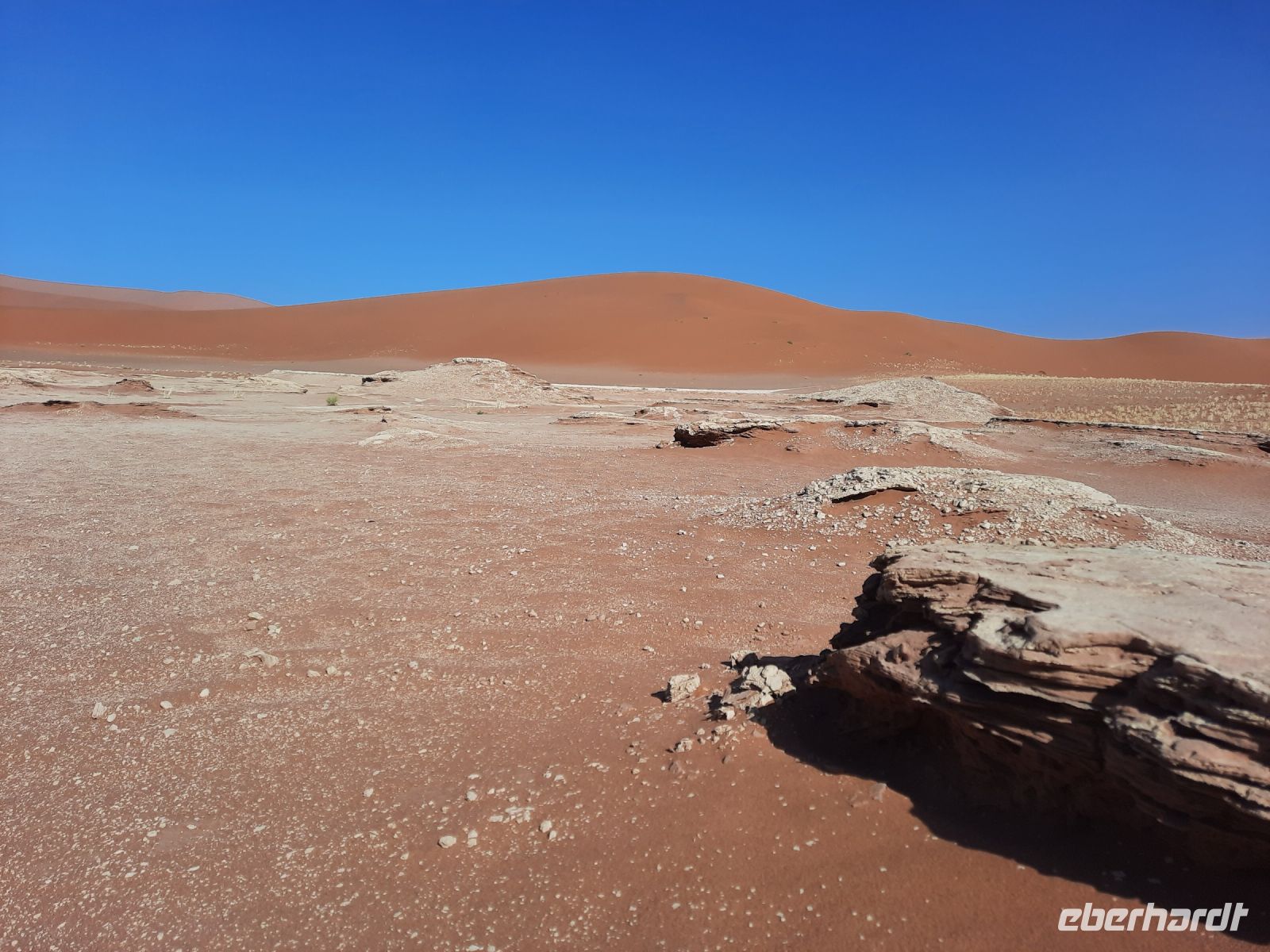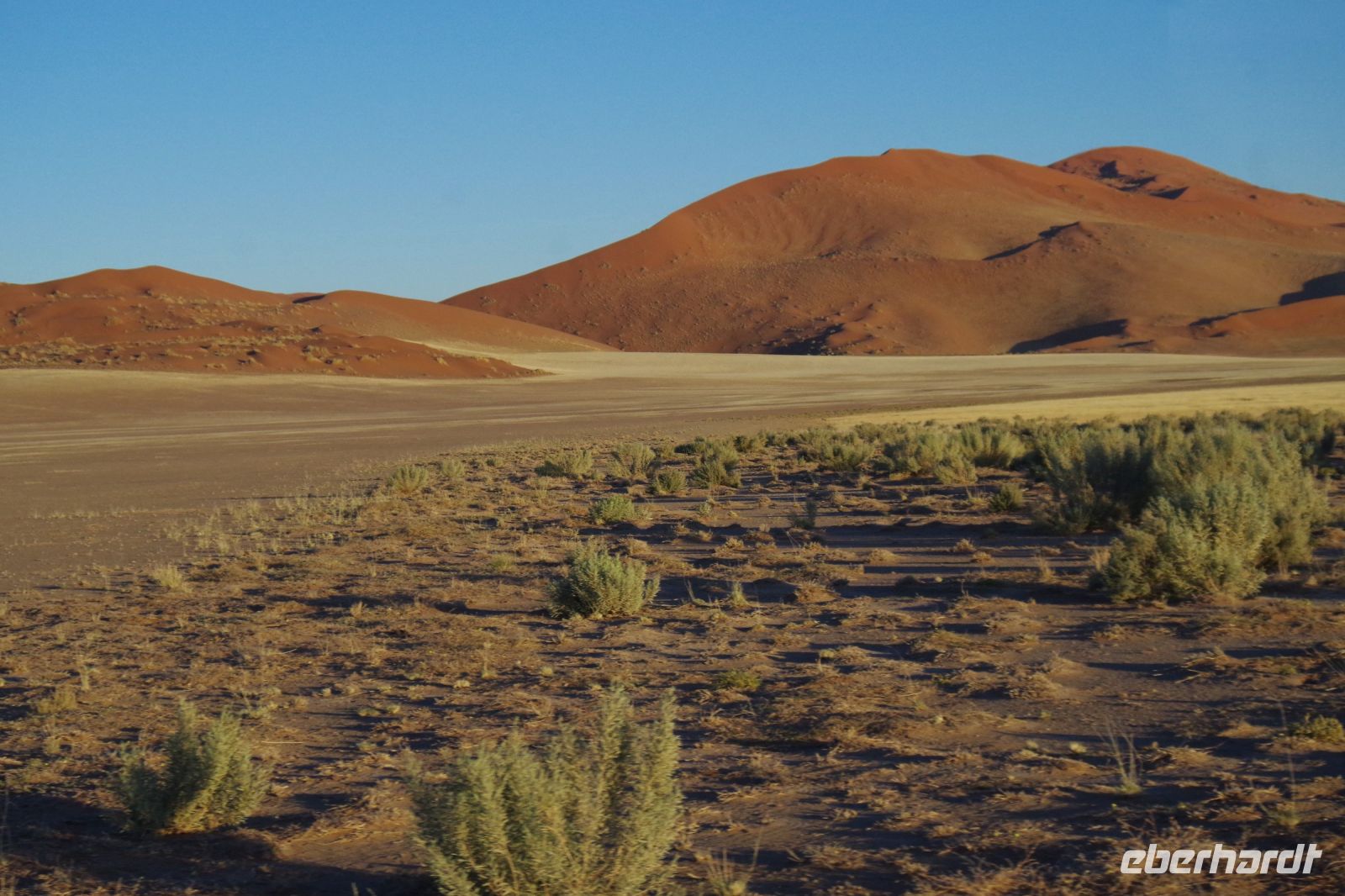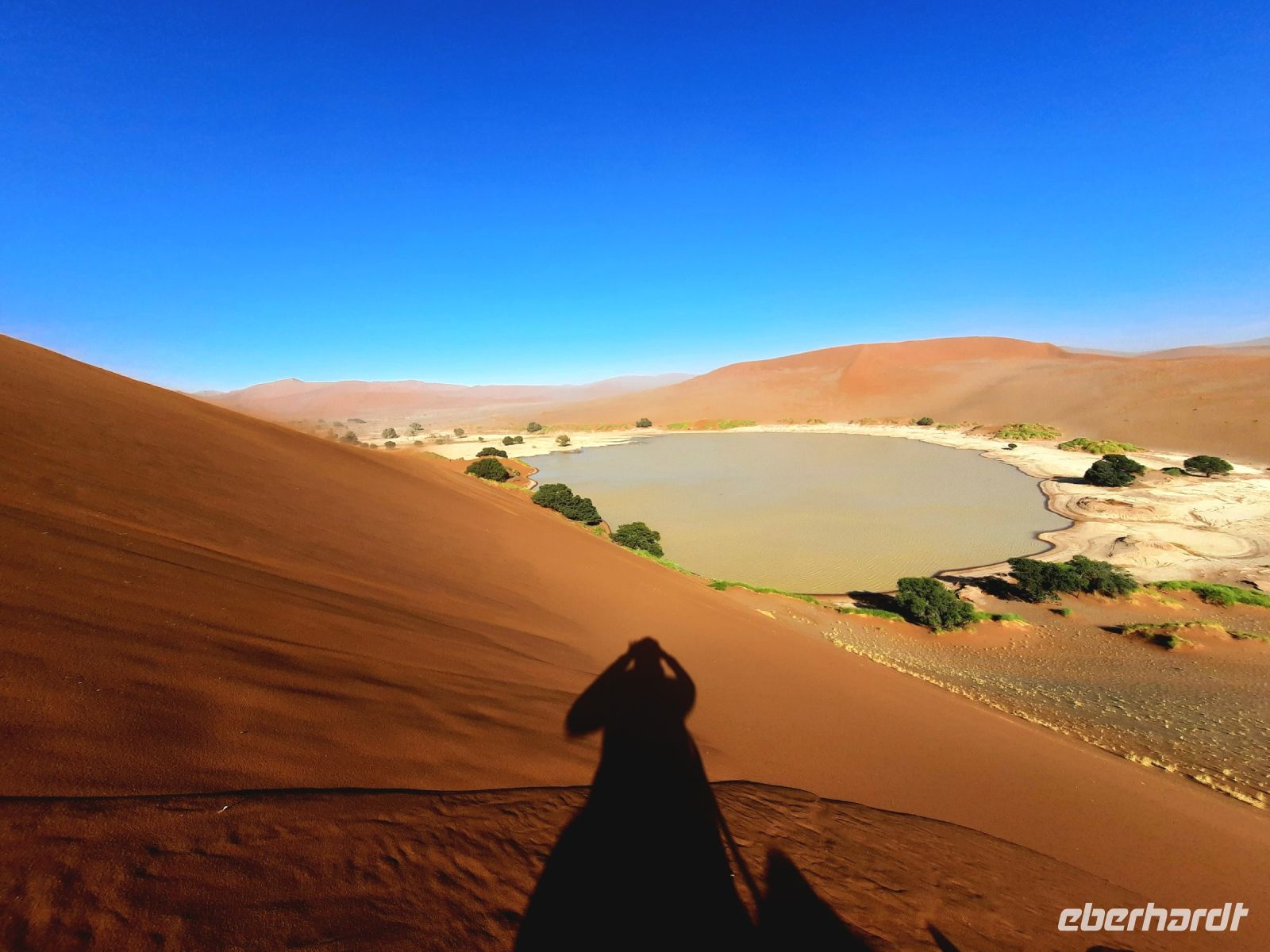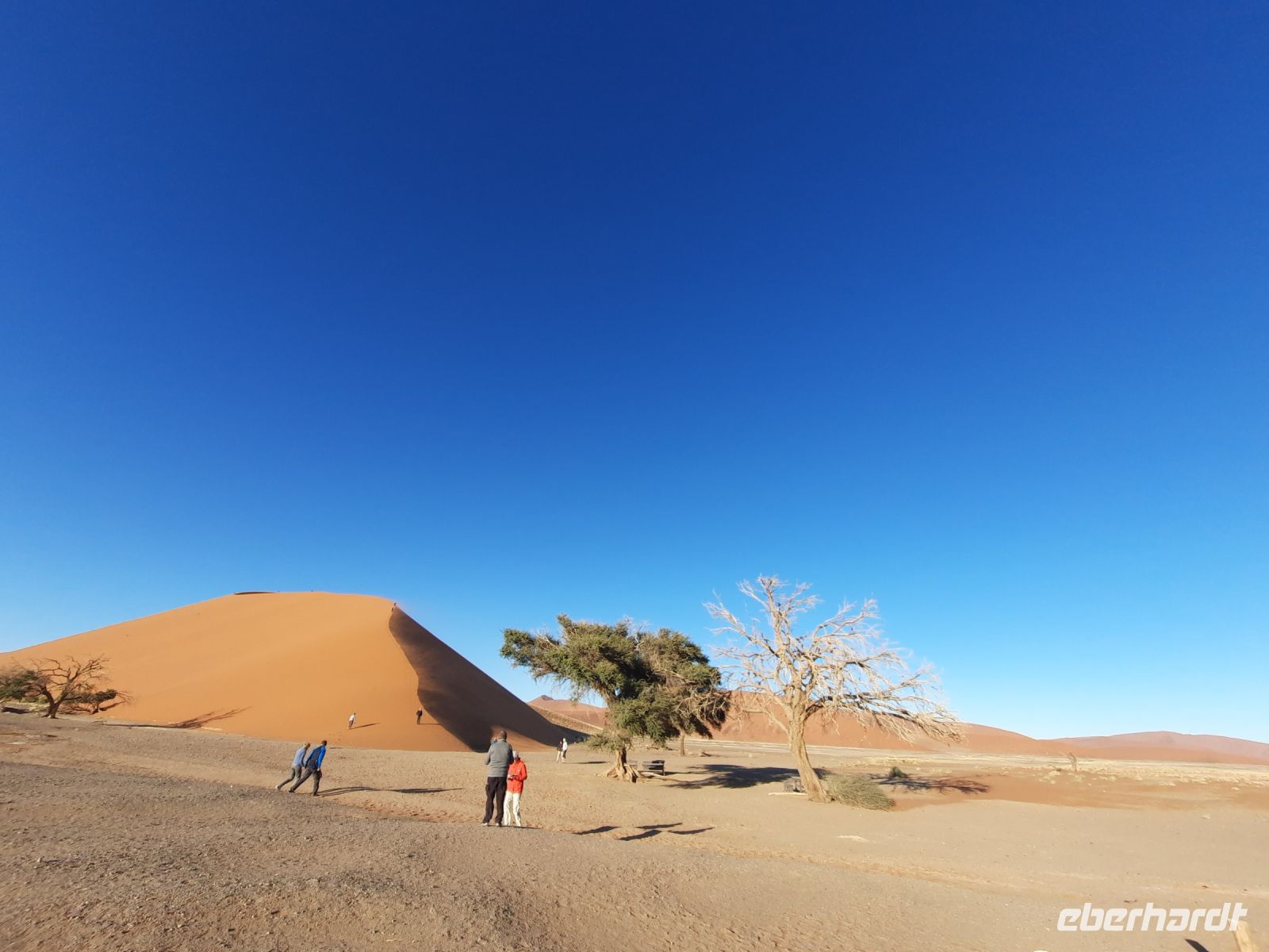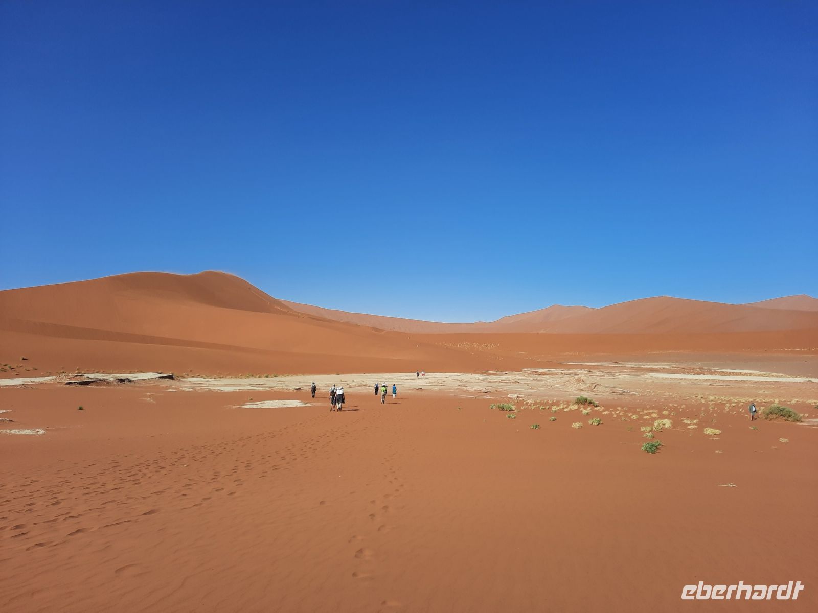 Die Lodge liegt relativ nah am Eingang des Nationalparks und so konnten wir doch etwas länger schlafen als in anderen Lodges und in unserer Lodge frühstücken. Die Tore öffnen bei Sonnenaufgang. Noch sind wenige Touristen im Land unterwegs, aber das wird sich hoffentlich bald ändern. Umso schöner für uns. Unterwegs hielten wir an und schauten der Sonne beim Aufstehen zu. Langsam formte sich die Dünenlandschaft. Das Stimmung am kühleren Morgen ist besonders toll - das Farbenspiel einmalig. Klick, Klick, unsere Kameras hatten viel zu tun. Man sah das tiefgrüne Band des Tsauchab Rivier, das sich durch die karge Wüste schlängelte. In der Regenzeit, Anfang diesen Jahres ist das Rivier abgekommen (ist geflossen) und hat das Sossusvlei (Lehmsenke) am Ende mit Wasser gefüllt. Es war alles noch sehr grün und wir sahen erstaunlich viele Tiere unterwegs: Oryxe und Springböcke. Obligatorischer erster Stopp war an Düne 45, wo einige hinauf stiegen. Am 4x4 Parkplatz (Ende der Teerstraße) angekommen, stiegen wir in 4x4-Shuttle um und schlitterten durch das sandige Rivier. Neben 4x4 sind optimaler Reifendruck und entsprechende Fahrkünste erforderlich, um nicht mit Schaufel und Eimerchen im großen Namib-Sandkasten buddeln zu müssen. Der Shuttle brachte uns zum Sossusvlei, zur Lehmsenke, deren Namen der Nationalpark trägt. Wenn der Tsauchab abkommt und genügend Wasser hat (wie während unserer Reise), fließt er bis hier her und füllt die Lehmsenke mit Wasser, das dann hier versickert und verdunstet. Weiter kommt der Fluss nicht, die Dünen versperren ihm den Weg zum ca. 50 km entfernten Atlantik. Sandsturm setzte ein. Gut verhüllt erklommen wir die SossusDüne, die weiter zur Big Mama führt. Die Lehmsenke war gut mit Waser gefüllt, wie ein kleiner See sah sie aus. Ringsum alles grüne, auch die grünen Nara-Büsche mit ihren kleinen, Melonen ähnlichen Früchten (nur die weiblichen tragen Früchte). Die endemische, geschützte Pflanze wächst nur da, wo ihre Wurzeln Grundwasser erreichen. Oryx & Co verspeisen die Früchte gern und auch die Namas nutzen die Heilkraft der Melone. Danach gings es zum Boxenstopp Dead Vlei. Von den schattigen Kameldornbäumen läuft man ca. 30 min, am besten auf den harten Lehmplatten, die sich bilden. Durch Wind und Klima verändern sich diese ständig, wie auch die Dünen. Also stiefelten wir los. Das Dead Vlei ist das Fotomotiv der Namib! Man muss sich mal vorstellen, dass es an dieser Stelle, vor Millionen Jahren, unendlich viel Wasser gab. Und heute: Die von hohen Sanddünen umschlossene Lehmsenke trocken und karg: alte, abgestorbene Kameldornbäume; harter, weißer Lehmboden und ringsherum das rote Dünenmeer. Darauf ein Schluck Wasser! Schatten fanden wir erst wieder, als wir am Parkplatz unterm großen Kameldornbaum auf unseren Shuttle warteten.