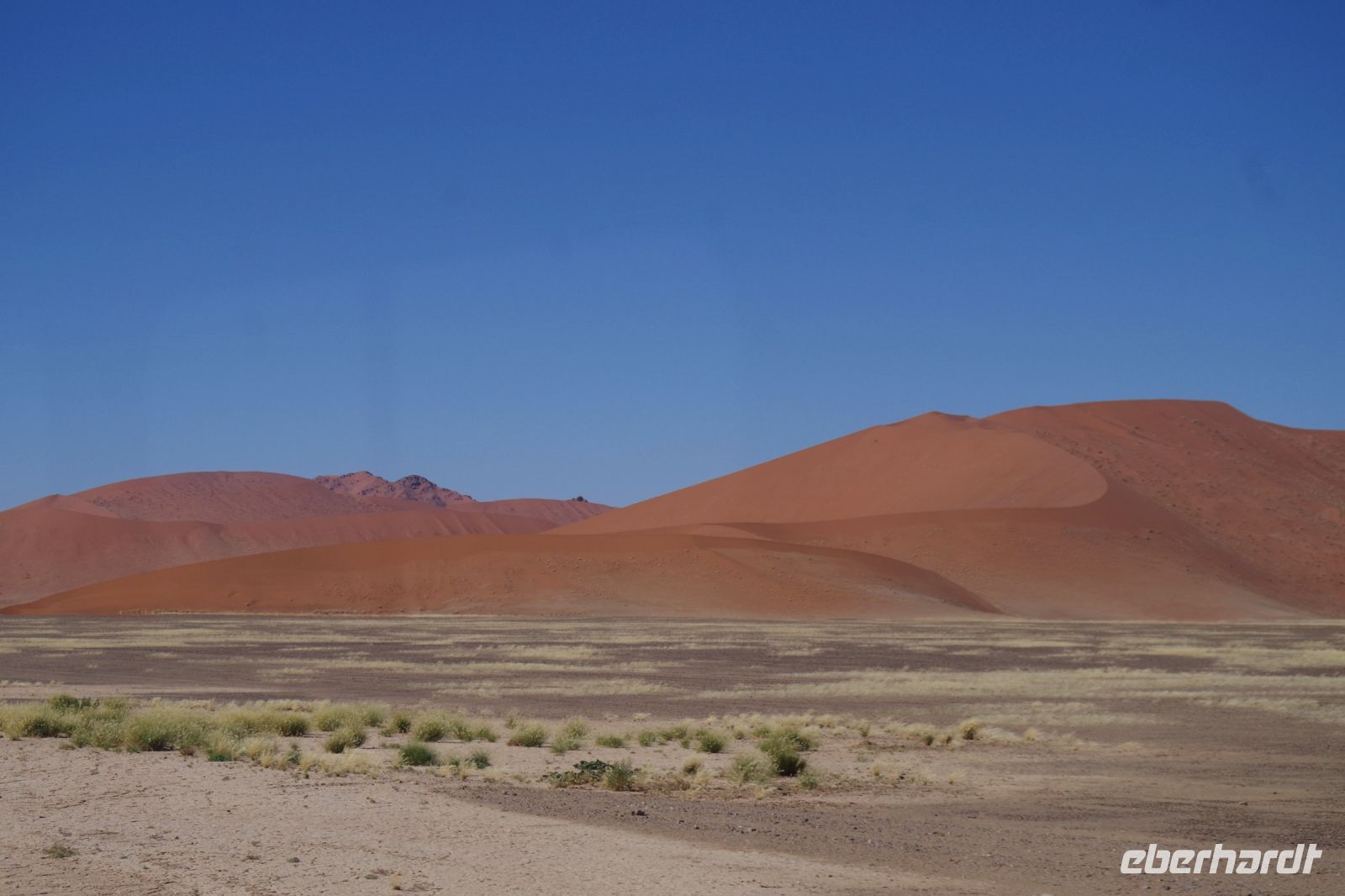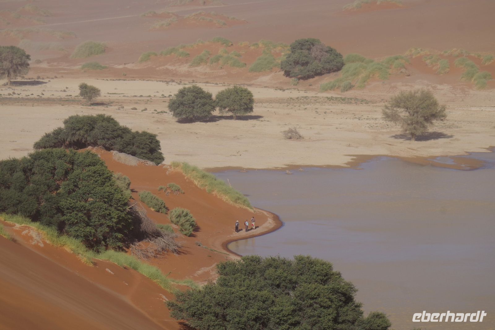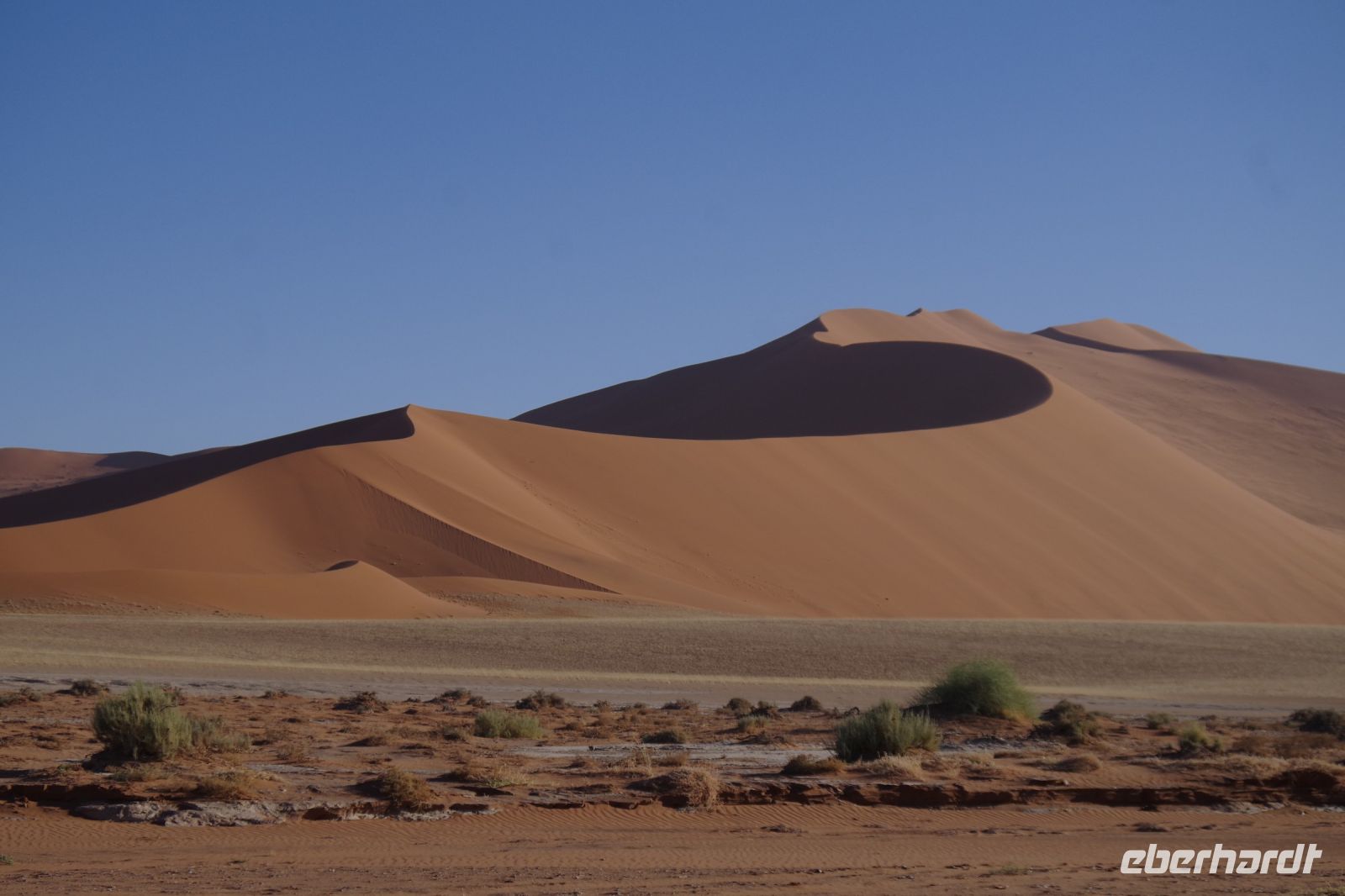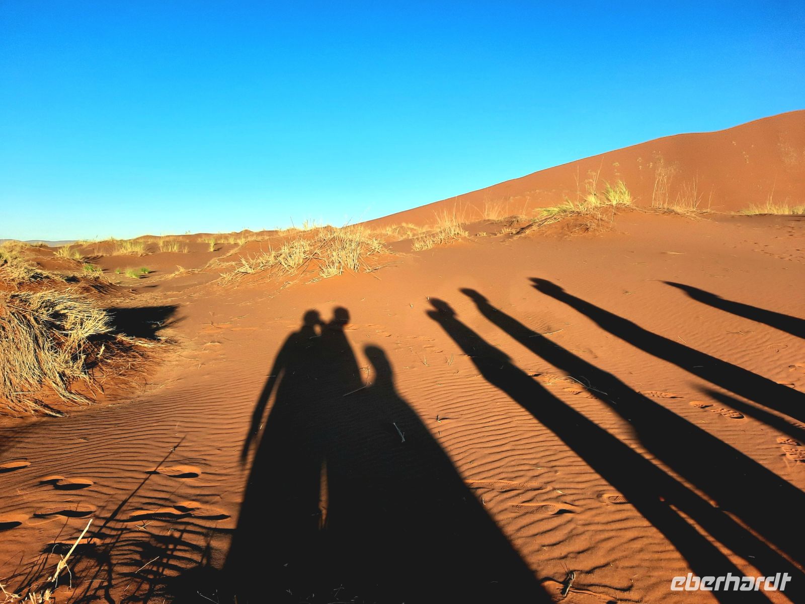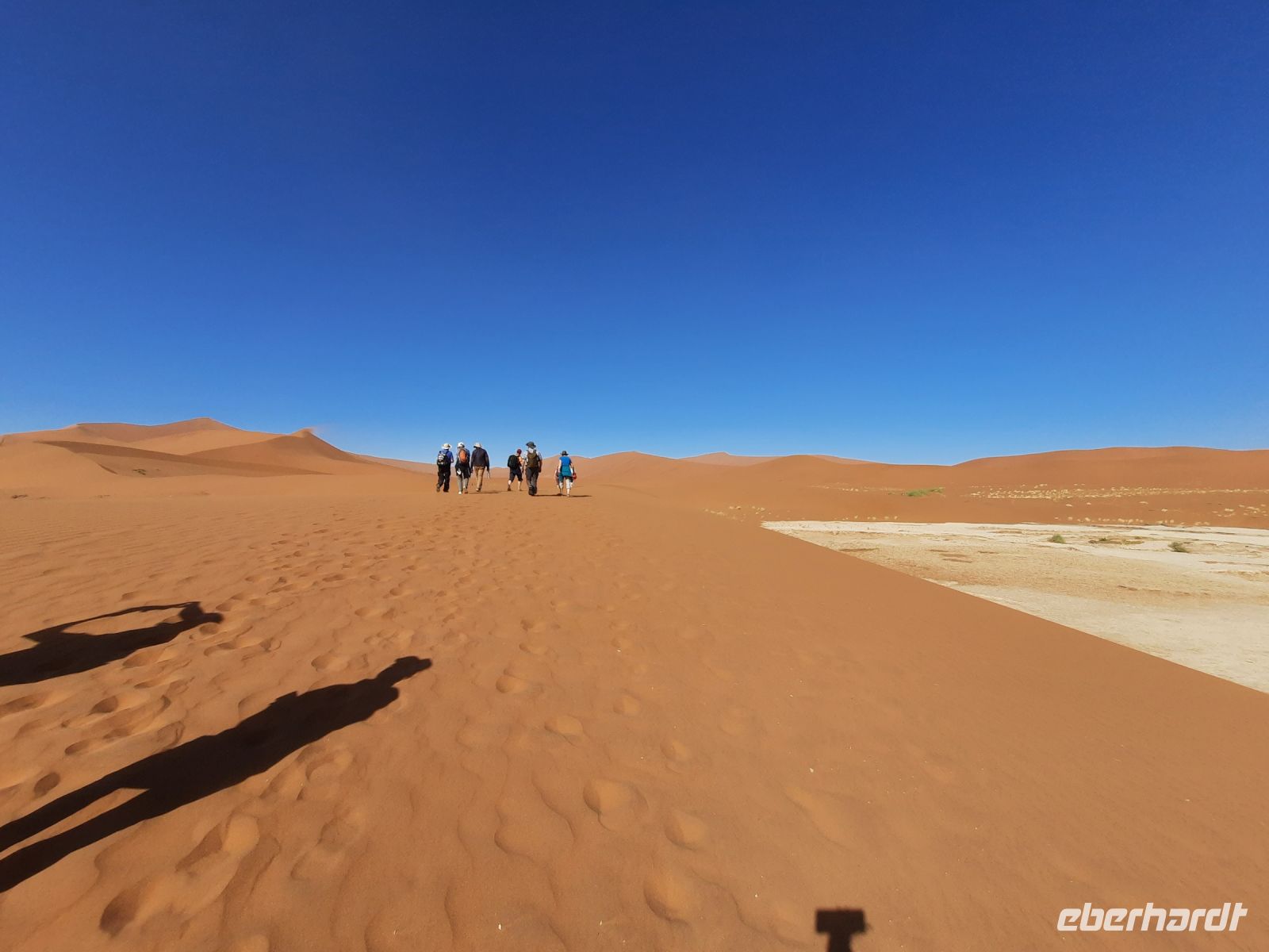 Die Lodge liegt relativ nah am Eingang des Nationalparks und so konnten wir doch etwas länger schlafen als in anderen Lodges und in unserer Lodge frühstücken. Die Tore öffnen bei Sonnenaufgang. Noch sind wenige Touristen im Land unterwegs, aber das wird sich hoffentlich bald ändern. Umso schöner für uns. Unterwegs hielten wir an und schauten der Sonne beim Aufstehen zu. Langsam formte sich die Dünenlandschaft. Das Stimmung am kühleren Morgen ist besonders toll - das Farbenspiel einmalig. Klick, Klick, unsere Kameras hatten viel zu tun. Man sah das tiefgrüne Band des Tsauchab Rivier, das sich durch die karge Wüste schlängelte. In der Regenzeit, Anfang diesen Jahres ist das Rivier abgekommen (ist geflossen) und hat das Sossusvlei (Lehmsenke) am Ende mit Wasser gefüllt. Es war alles noch sehr grün und wir sahen erstaunlich viele Tiere unterwegs: Oryxe und Springböcke. Obligatorischer erster Stopp war an Düne 45, wo einige hinauf stiegen. Am 4x4 Parkplatz (Ende der Teerstraße) angekommen, stiegen wir in 4x4-Shuttle um und schlitterten durch das sandige Rivier. Neben 4x4 sind optimaler Reifendruck und entsprechende Fahrkünste erforderlich, um nicht mit Schaufel und Eimerchen im großen Namib-Sandkasten buddeln zu müssen. Der Shuttle brachte uns zum Sossusvlei, zur Lehmsenke, deren Namen der Nationalpark trägt. Wenn der Tsauchab abkommt und genügend Wasser hat (wie während unserer Reise), fließt er bis hier her und füllt die Lehmsenke mit Wasser, das dann hier versickert und verdunstet. Weiter kommt der Fluss nicht, die Dünen versperren ihm den Weg zum ca. 50 km entfernten Atlantik. Sandsturm setzte ein. Gut verhüllt erklommen wir die SossusDüne, die weiter zur Big Mama führt. Die Lehmsenke war gut mit Waser gefüllt, wie ein kleiner See sah sie aus. Ringsum alles grüne, auch die grünen Nara-Büsche mit ihren kleinen, Melonen ähnlichen Früchten (nur die weiblichen tragen Früchte). Die endemische, geschützte Pflanze wächst nur da, wo ihre Wurzeln Grundwasser erreichen. Oryx & Co verspeisen die Früchte gern und auch die Namas nutzen die Heilkraft der Melone. Danach gings es zum Boxenstopp Dead Vlei. Von den schattigen Kameldornbäumen läuft man ca. 30 min, am besten auf den harten Lehmplatten, die sich bilden. Durch Wind und Klima verändern sich diese ständig, wie auch die Dünen. Also stiefelten wir los. Das Dead Vlei ist das Fotomotiv der Namib! Man muss sich mal vorstellen, dass es an dieser Stelle, vor Millionen Jahren, unendlich viel Wasser gab. Und heute: Die von hohen Sanddünen umschlossene Lehmsenke trocken und karg: alte, abgestorbene Kameldornbäume; harter, weißer Lehmboden und ringsherum das rote Dünenmeer. Darauf ein Schluck Wasser! Schatten fanden wir erst wieder, als wir am Parkplatz unterm großen Kameldornbaum auf unseren Shuttle warteten.