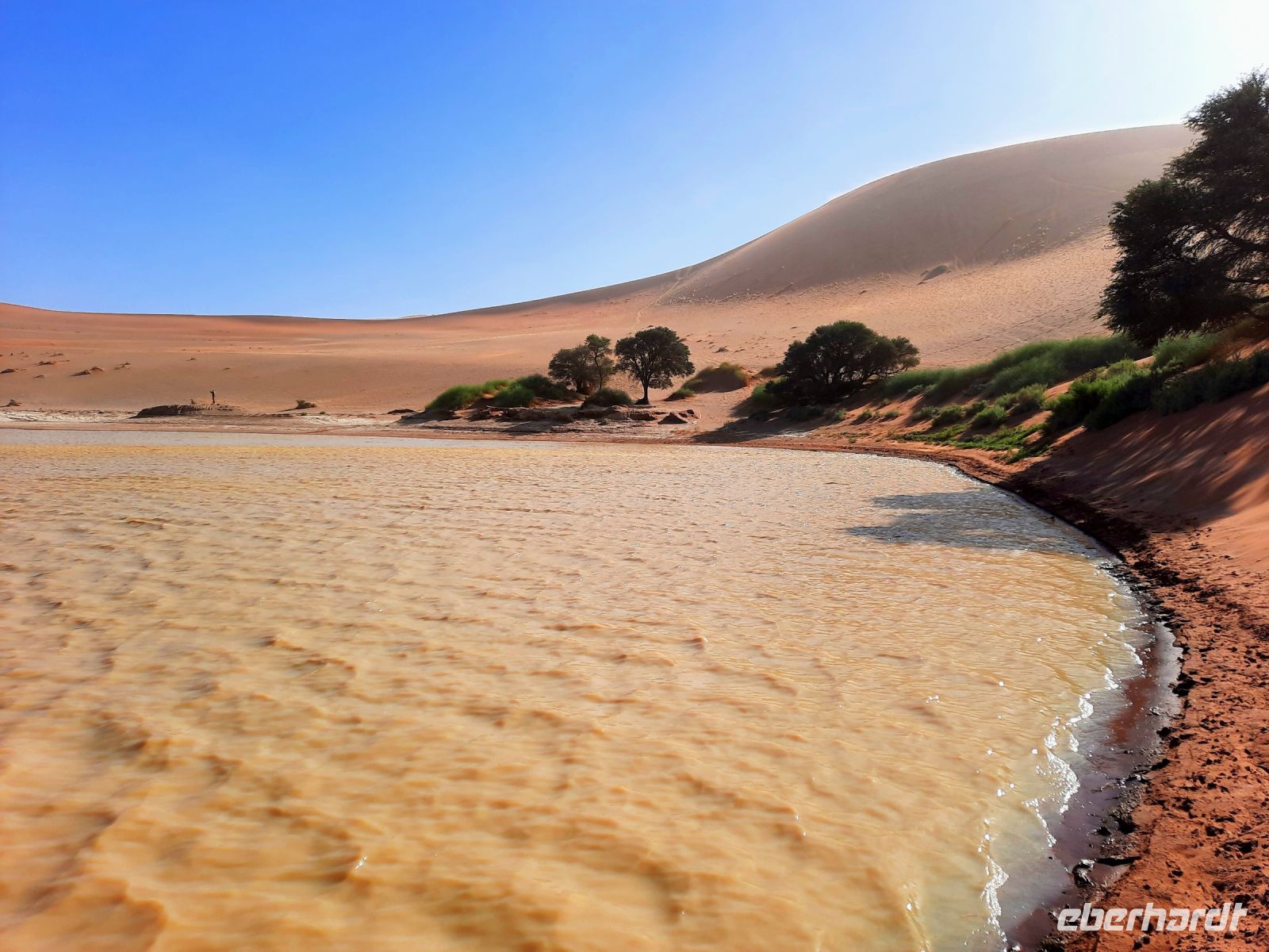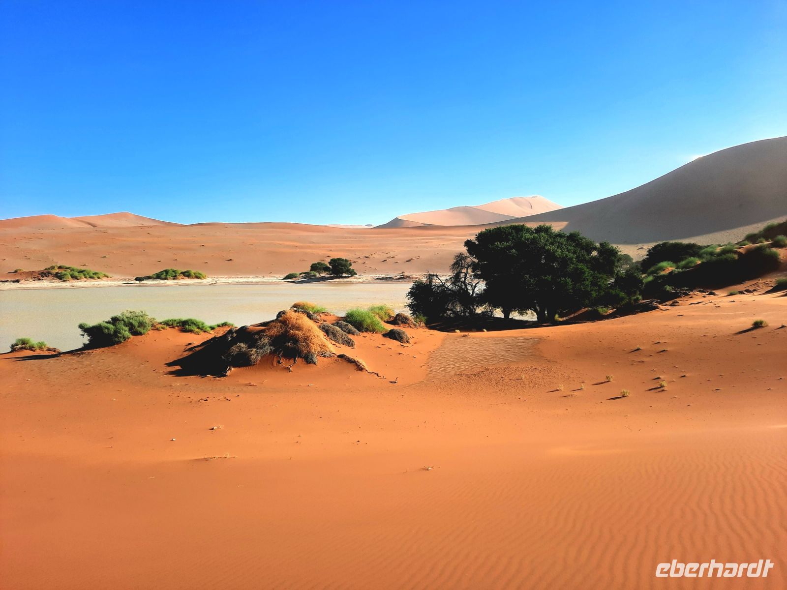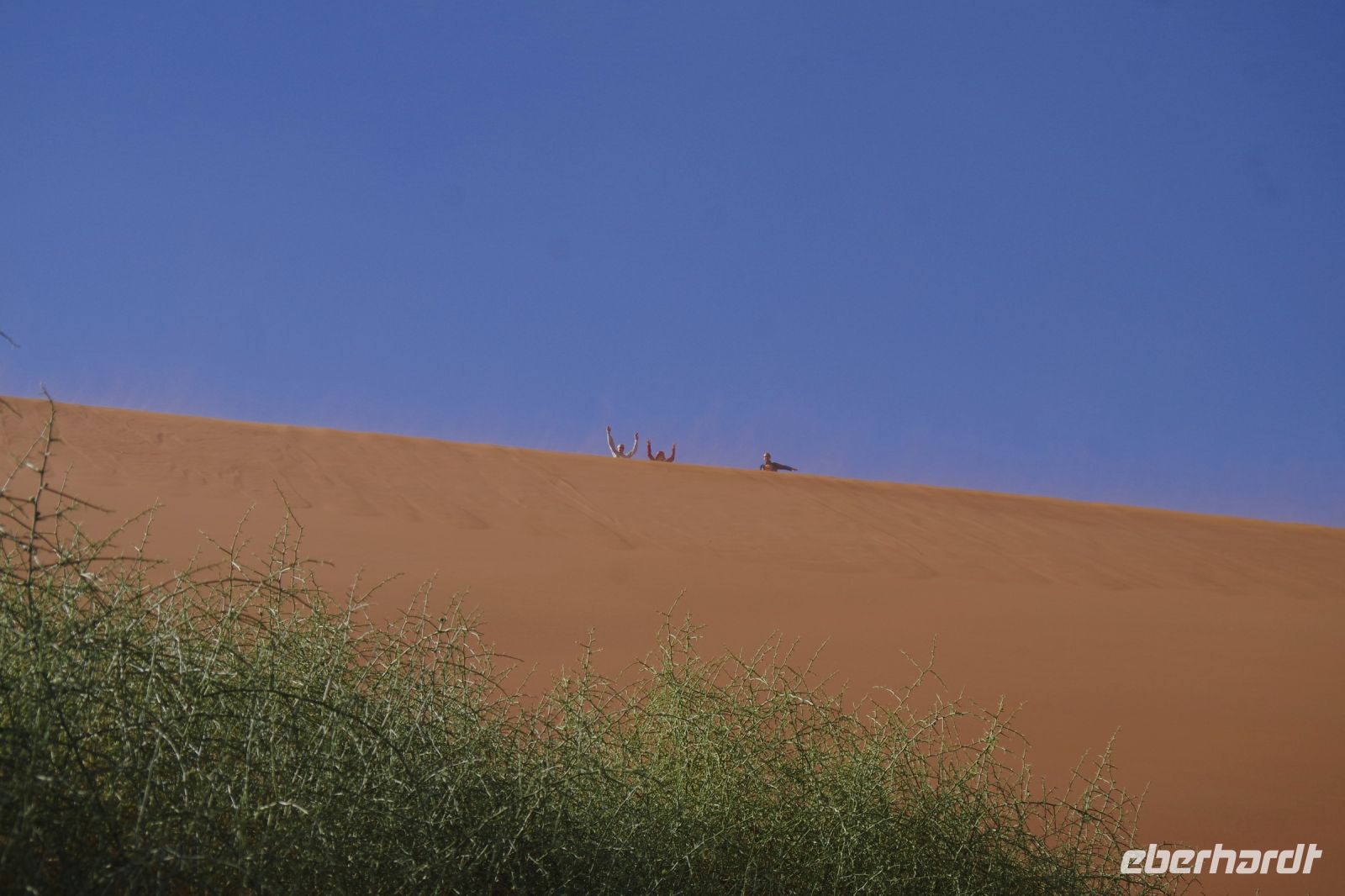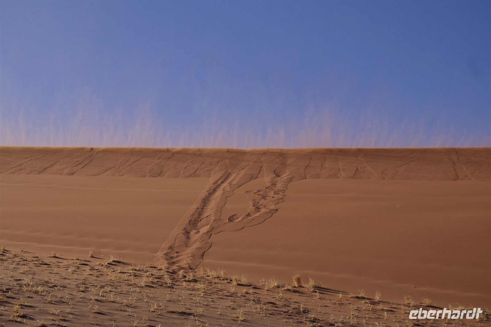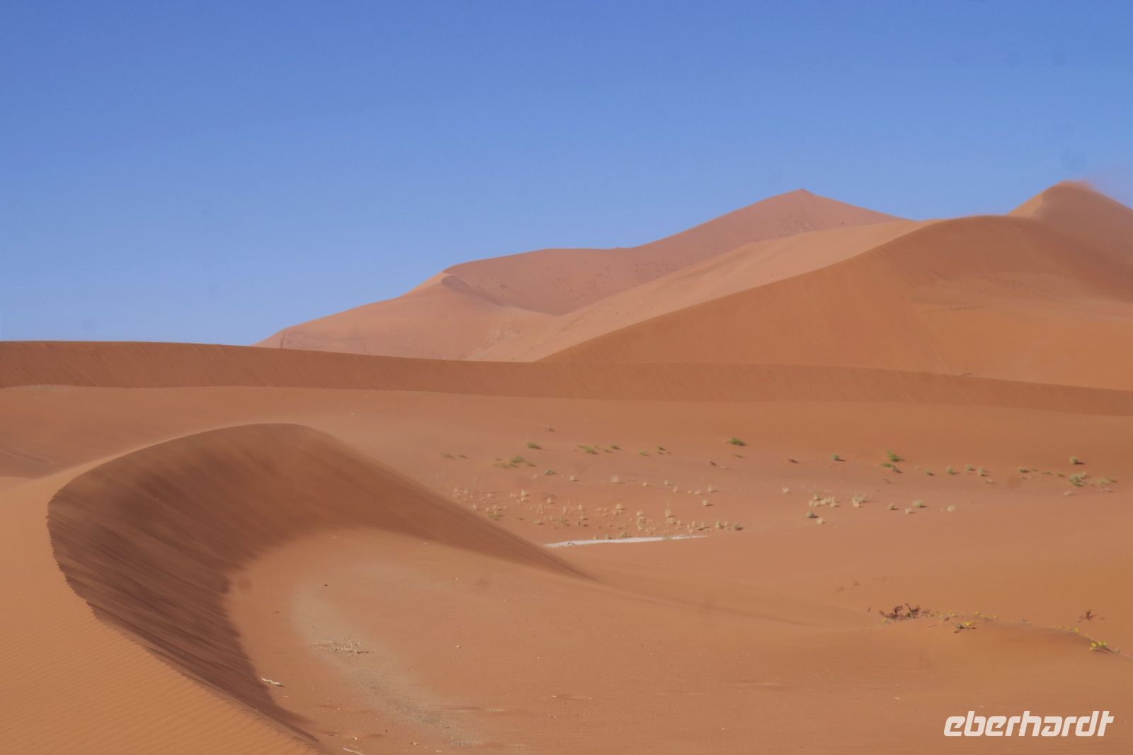 Die Lodge liegt relativ nah am Eingang des Nationalparks und so konnten wir doch etwas länger schlafen als in anderen Lodges und in unserer Lodge frühstücken. Die Tore öffnen bei Sonnenaufgang. Noch sind wenige Touristen im Land unterwegs, aber das wird sich hoffentlich bald ändern. Umso schöner für uns. Unterwegs hielten wir an und schauten der Sonne beim Aufstehen zu. Langsam formte sich die Dünenlandschaft. Das Stimmung am kühleren Morgen ist besonders toll - das Farbenspiel einmalig. Klick, Klick, unsere Kameras hatten viel zu tun. Man sah das tiefgrüne Band des Tsauchab Rivier, das sich durch die karge Wüste schlängelte. In der Regenzeit, Anfang diesen Jahres ist das Rivier abgekommen (ist geflossen) und hat das Sossusvlei (Lehmsenke) am Ende mit Wasser gefüllt. Es war alles noch sehr grün und wir sahen erstaunlich viele Tiere unterwegs: Oryxe und Springböcke. Obligatorischer erster Stopp war an Düne 45, wo einige hinauf stiegen. Am 4x4 Parkplatz (Ende der Teerstraße) angekommen, stiegen wir in 4x4-Shuttle um und schlitterten durch das sandige Rivier. Neben 4x4 sind optimaler Reifendruck und entsprechende Fahrkünste erforderlich, um nicht mit Schaufel und Eimerchen im großen Namib-Sandkasten buddeln zu müssen. Der Shuttle brachte uns zum Sossusvlei, zur Lehmsenke, deren Namen der Nationalpark trägt. Wenn der Tsauchab abkommt und genügend Wasser hat (wie während unserer Reise), fließt er bis hier her und füllt die Lehmsenke mit Wasser, das dann hier versickert und verdunstet. Weiter kommt der Fluss nicht, die Dünen versperren ihm den Weg zum ca. 50 km entfernten Atlantik. Sandsturm setzte ein. Gut verhüllt erklommen wir die SossusDüne, die weiter zur Big Mama führt. Die Lehmsenke war gut mit Waser gefüllt, wie ein kleiner See sah sie aus. Ringsum alles grüne, auch die grünen Nara-Büsche mit ihren kleinen, Melonen ähnlichen Früchten (nur die weiblichen tragen Früchte). Die endemische, geschützte Pflanze wächst nur da, wo ihre Wurzeln Grundwasser erreichen. Oryx & Co verspeisen die Früchte gern und auch die Namas nutzen die Heilkraft der Melone. Danach gings es zum Boxenstopp Dead Vlei. Von den schattigen Kameldornbäumen läuft man ca. 30 min, am besten auf den harten Lehmplatten, die sich bilden. Durch Wind und Klima verändern sich diese ständig, wie auch die Dünen. Also stiefelten wir los. Das Dead Vlei ist das Fotomotiv der Namib! Man muss sich mal vorstellen, dass es an dieser Stelle, vor Millionen Jahren, unendlich viel Wasser gab. Und heute: Die von hohen Sanddünen umschlossene Lehmsenke trocken und karg: alte, abgestorbene Kameldornbäume; harter, weißer Lehmboden und ringsherum das rote Dünenmeer. Darauf ein Schluck Wasser! Schatten fanden wir erst wieder, als wir am Parkplatz unterm großen Kameldornbaum auf unseren Shuttle warteten.