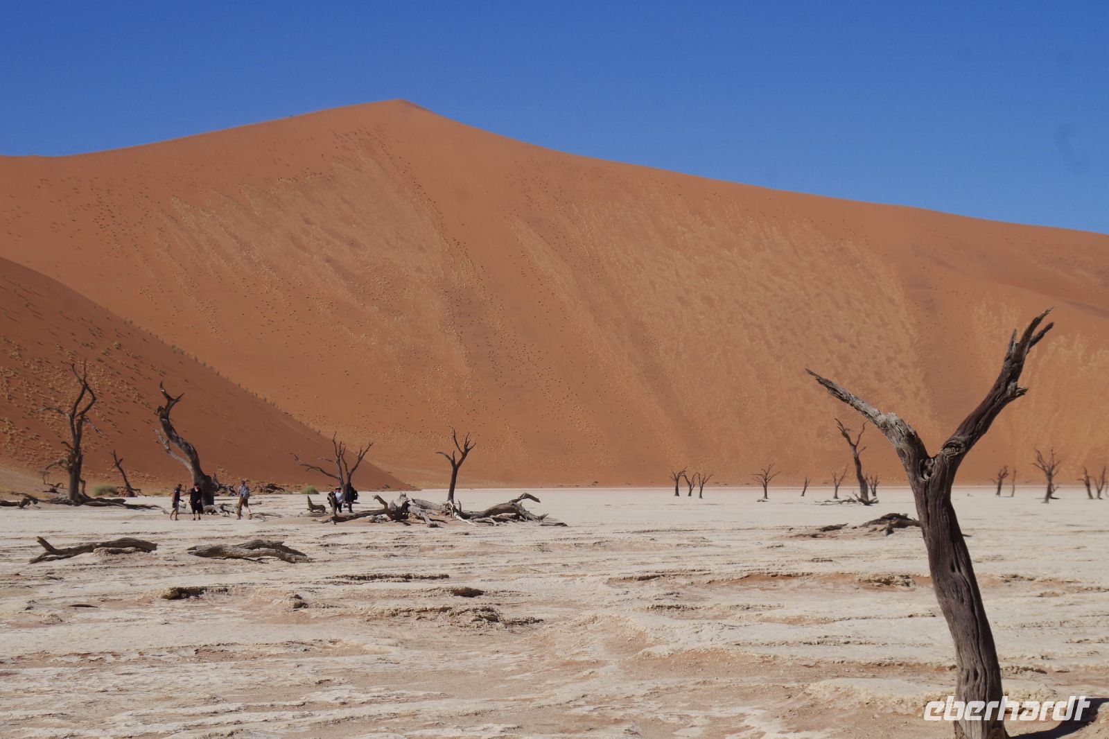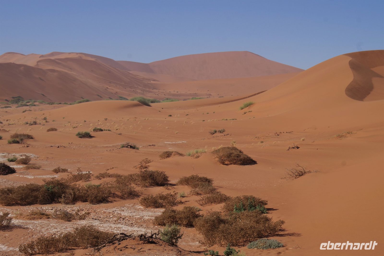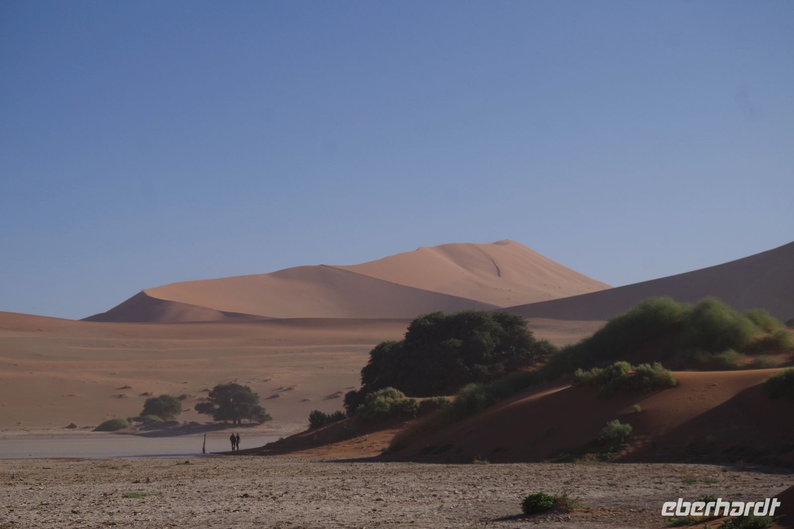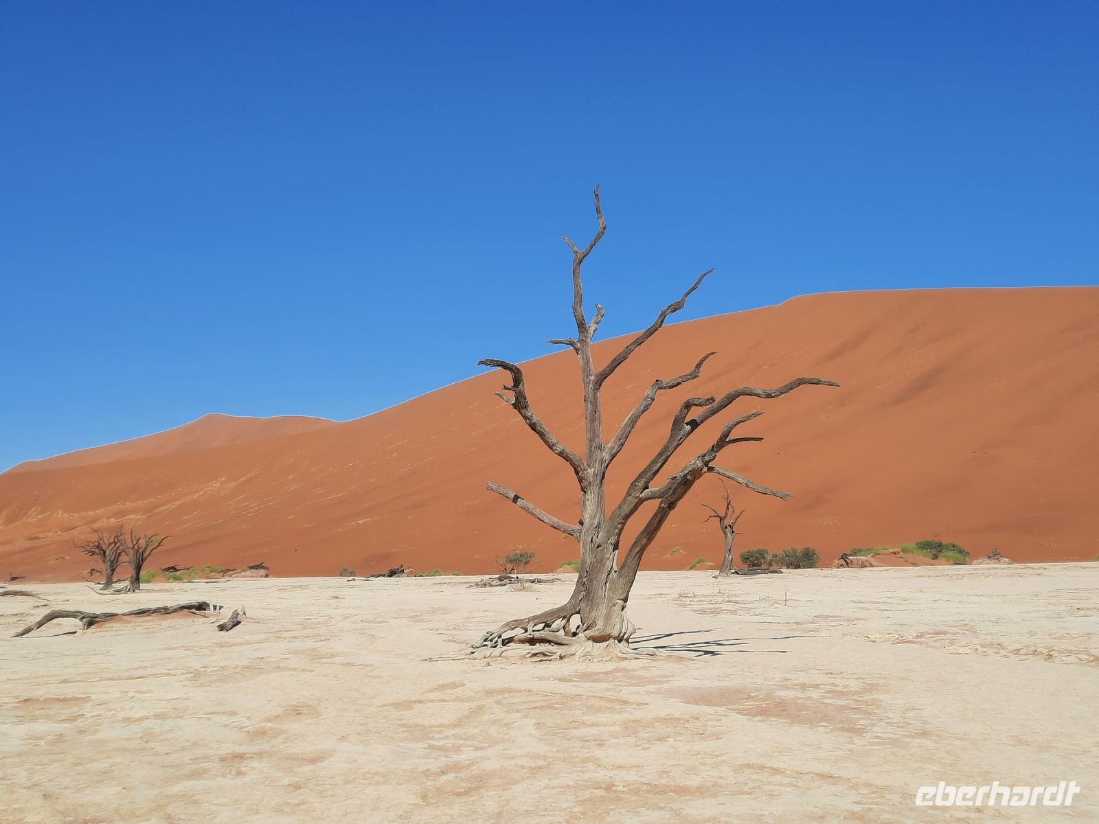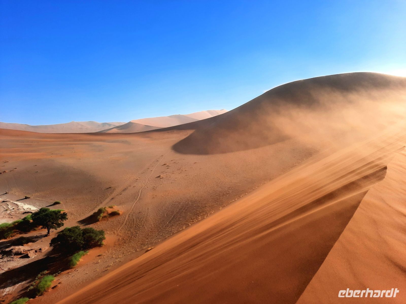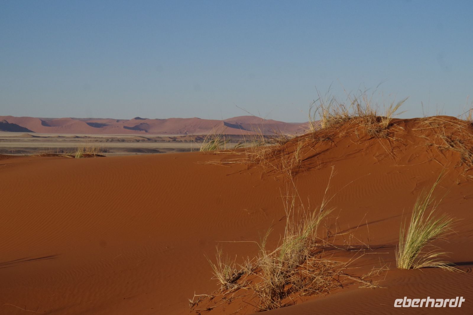 Die Lodge liegt relativ nah am Eingang des Nationalparks und so konnten wir doch etwas länger schlafen als in anderen Lodges und in unserer Lodge frühstücken. Die Tore öffnen bei Sonnenaufgang. Noch sind wenige Touristen im Land unterwegs, aber das wird sich hoffentlich bald ändern. Umso schöner für uns. Unterwegs hielten wir an und schauten der Sonne beim Aufstehen zu. Langsam formte sich die Dünenlandschaft. Das Stimmung am kühleren Morgen ist besonders toll - das Farbenspiel einmalig. Klick, Klick, unsere Kameras hatten viel zu tun. Man sah das tiefgrüne Band des Tsauchab Rivier, das sich durch die karge Wüste schlängelte. In der Regenzeit, Anfang diesen Jahres ist das Rivier abgekommen (ist geflossen) und hat das Sossusvlei (Lehmsenke) am Ende mit Wasser gefüllt. Es war alles noch sehr grün und wir sahen erstaunlich viele Tiere unterwegs: Oryxe und Springböcke. Obligatorischer erster Stopp war an Düne 45, wo einige hinauf stiegen. Am 4x4 Parkplatz (Ende der Teerstraße) angekommen, stiegen wir in 4x4-Shuttle um und schlitterten durch das sandige Rivier. Neben 4x4 sind optimaler Reifendruck und entsprechende Fahrkünste erforderlich, um nicht mit Schaufel und Eimerchen im großen Namib-Sandkasten buddeln zu müssen. Der Shuttle brachte uns zum Sossusvlei, zur Lehmsenke, deren Namen der Nationalpark trägt. Wenn der Tsauchab abkommt und genügend Wasser hat (wie während unserer Reise), fließt er bis hier her und füllt die Lehmsenke mit Wasser, das dann hier versickert und verdunstet. Weiter kommt der Fluss nicht, die Dünen versperren ihm den Weg zum ca. 50 km entfernten Atlantik. Sandsturm setzte ein. Gut verhüllt erklommen wir die SossusDüne, die weiter zur Big Mama führt. Die Lehmsenke war gut mit Waser gefüllt, wie ein kleiner See sah sie aus. Ringsum alles grüne, auch die grünen Nara-Büsche mit ihren kleinen, Melonen ähnlichen Früchten (nur die weiblichen tragen Früchte). Die endemische, geschützte Pflanze wächst nur da, wo ihre Wurzeln Grundwasser erreichen. Oryx & Co verspeisen die Früchte gern und auch die Namas nutzen die Heilkraft der Melone. Danach gings es zum Boxenstopp Dead Vlei. Von den schattigen Kameldornbäumen läuft man ca. 30 min, am besten auf den harten Lehmplatten, die sich bilden. Durch Wind und Klima verändern sich diese ständig, wie auch die Dünen. Also stiefelten wir los. Das Dead Vlei ist das Fotomotiv der Namib! Man muss sich mal vorstellen, dass es an dieser Stelle, vor Millionen Jahren, unendlich viel Wasser gab. Und heute: Die von hohen Sanddünen umschlossene Lehmsenke trocken und karg: alte, abgestorbene Kameldornbäume; harter, weißer Lehmboden und ringsherum das rote Dünenmeer. Darauf ein Schluck Wasser! Schatten fanden wir erst wieder, als wir am Parkplatz unterm großen Kameldornbaum auf unseren Shuttle warteten.