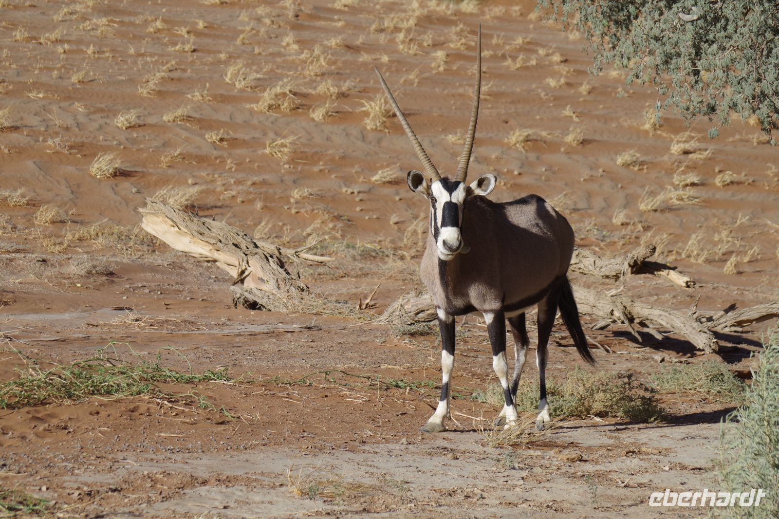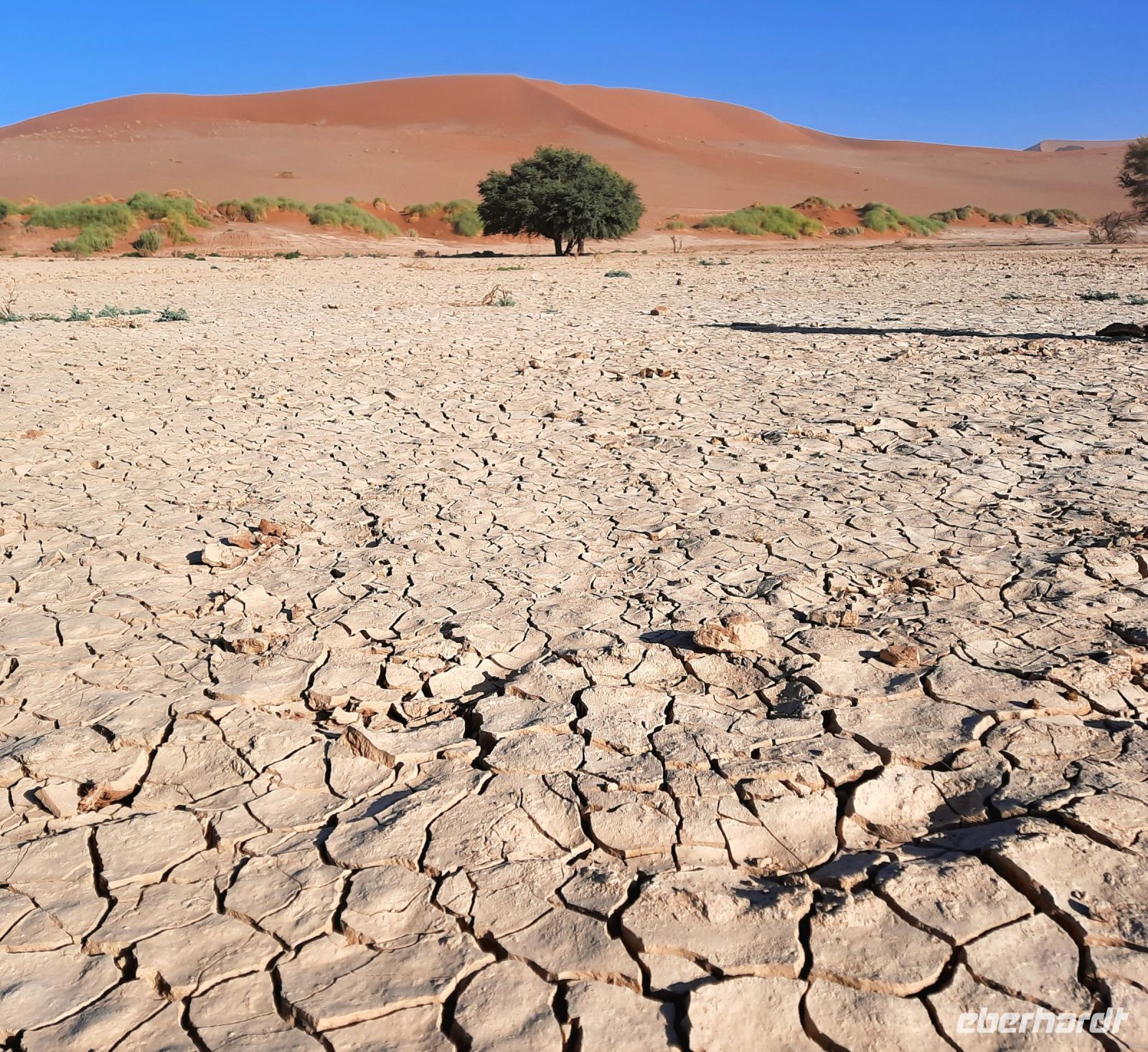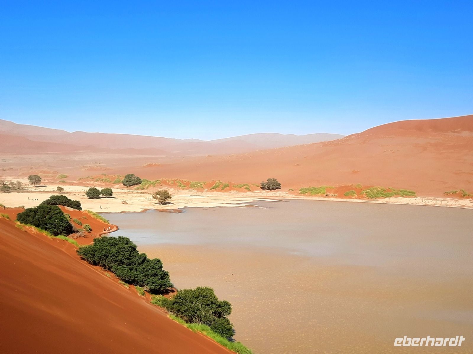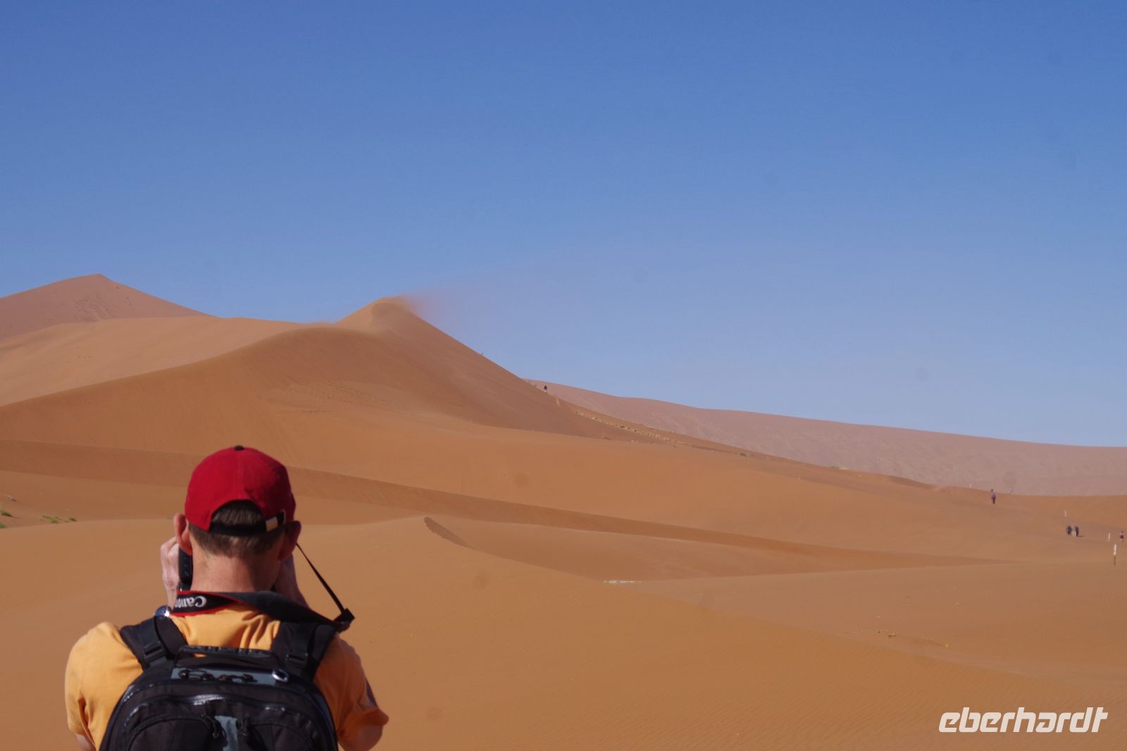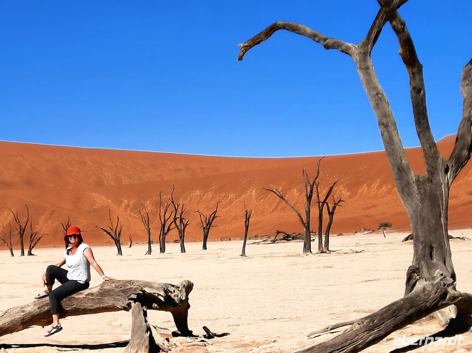 Die Lodge liegt relativ nah am Eingang des Nationalparks und so konnten wir doch etwas länger schlafen als in anderen Lodges und in unserer Lodge frühstücken. Die Tore öffnen bei Sonnenaufgang. Noch sind wenige Touristen im Land unterwegs, aber das wird sich hoffentlich bald ändern. Umso schöner für uns. Unterwegs hielten wir an und schauten der Sonne beim Aufstehen zu. Langsam formte sich die Dünenlandschaft. Das Stimmung am kühleren Morgen ist besonders toll - das Farbenspiel einmalig. Klick, Klick, unsere Kameras hatten viel zu tun. Man sah das tiefgrüne Band des Tsauchab Rivier, das sich durch die karge Wüste schlängelte. In der Regenzeit, Anfang diesen Jahres ist das Rivier abgekommen (ist geflossen) und hat das Sossusvlei (Lehmsenke) am Ende mit Wasser gefüllt. Es war alles noch sehr grün und wir sahen erstaunlich viele Tiere unterwegs: Oryxe und Springböcke. Obligatorischer erster Stopp war an Düne 45, wo einige hinauf stiegen. Am 4x4 Parkplatz (Ende der Teerstraße) angekommen, stiegen wir in 4x4-Shuttle um und schlitterten durch das sandige Rivier. Neben 4x4 sind optimaler Reifendruck und entsprechende Fahrkünste erforderlich, um nicht mit Schaufel und Eimerchen im großen Namib-Sandkasten buddeln zu müssen. Der Shuttle brachte uns zum Sossusvlei, zur Lehmsenke, deren Namen der Nationalpark trägt. Wenn der Tsauchab abkommt und genügend Wasser hat (wie während unserer Reise), fließt er bis hier her und füllt die Lehmsenke mit Wasser, das dann hier versickert und verdunstet. Weiter kommt der Fluss nicht, die Dünen versperren ihm den Weg zum ca. 50 km entfernten Atlantik. Sandsturm setzte ein. Gut verhüllt erklommen wir die SossusDüne, die weiter zur Big Mama führt. Die Lehmsenke war gut mit Waser gefüllt, wie ein kleiner See sah sie aus. Ringsum alles grüne, auch die grünen Nara-Büsche mit ihren kleinen, Melonen ähnlichen Früchten (nur die weiblichen tragen Früchte). Die endemische, geschützte Pflanze wächst nur da, wo ihre Wurzeln Grundwasser erreichen. Oryx & Co verspeisen die Früchte gern und auch die Namas nutzen die Heilkraft der Melone. Danach gings es zum Boxenstopp Dead Vlei. Von den schattigen Kameldornbäumen läuft man ca. 30 min, am besten auf den harten Lehmplatten, die sich bilden. Durch Wind und Klima verändern sich diese ständig, wie auch die Dünen. Also stiefelten wir los. Das Dead Vlei ist das Fotomotiv der Namib! Man muss sich mal vorstellen, dass es an dieser Stelle, vor Millionen Jahren, unendlich viel Wasser gab. Und heute: Die von hohen Sanddünen umschlossene Lehmsenke trocken und karg: alte, abgestorbene Kameldornbäume; harter, weißer Lehmboden und ringsherum das rote Dünenmeer. Darauf ein Schluck Wasser! Schatten fanden wir erst wieder, als wir am Parkplatz unterm großen Kameldornbaum auf unseren Shuttle warteten.