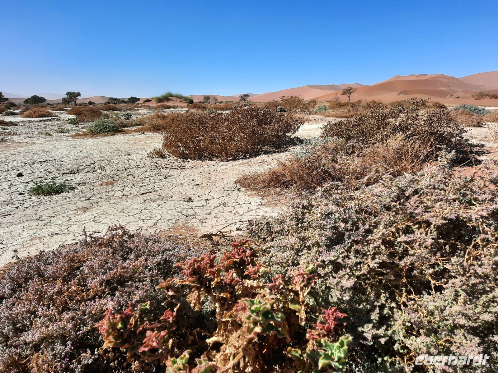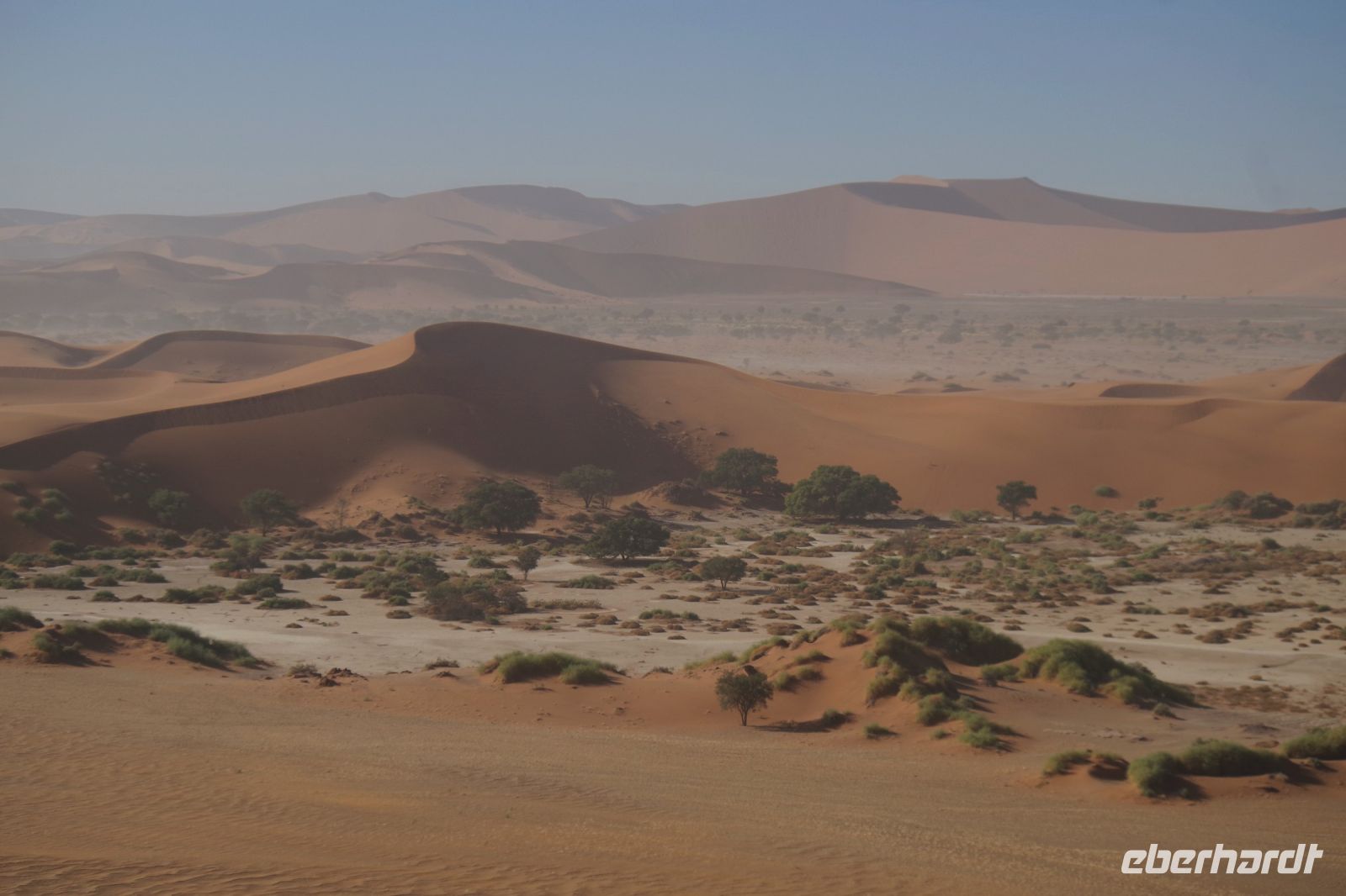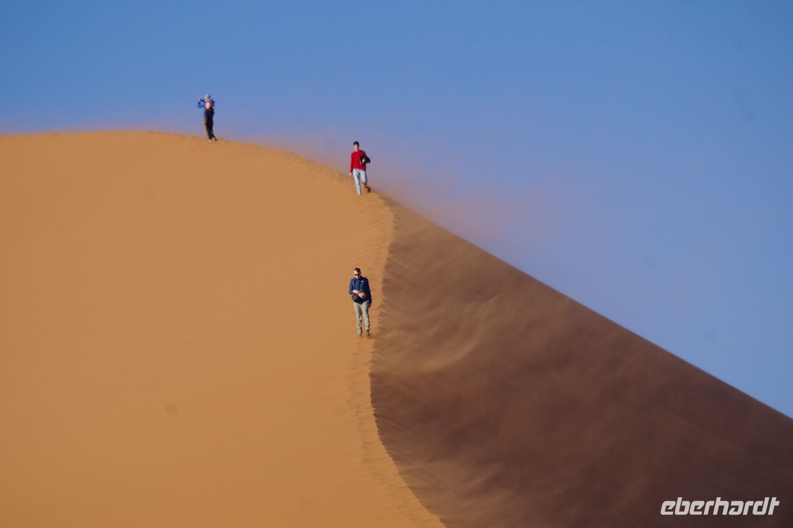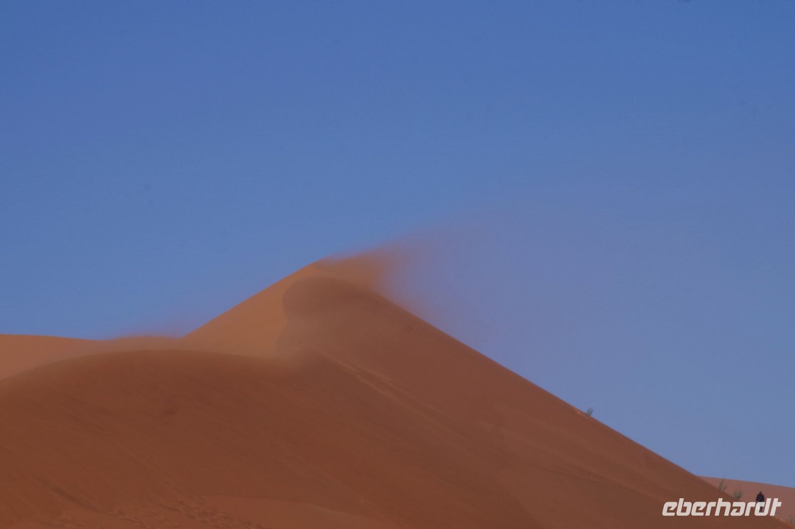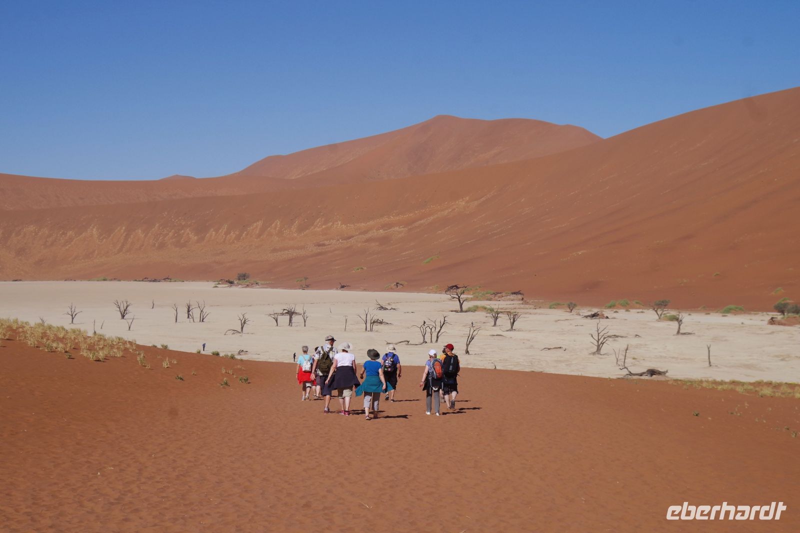 Die Lodge liegt relativ nah am Eingang des Nationalparks und so konnten wir doch etwas länger schlafen als in anderen Lodges und in unserer Lodge frühstücken. Die Tore öffnen bei Sonnenaufgang. Noch sind wenige Touristen im Land unterwegs, aber das wird sich hoffentlich bald ändern. Umso schöner für uns. Unterwegs hielten wir an und schauten der Sonne beim Aufstehen zu. Langsam formte sich die Dünenlandschaft. Das Stimmung am kühleren Morgen ist besonders toll - das Farbenspiel einmalig. Klick, Klick, unsere Kameras hatten viel zu tun. Man sah das tiefgrüne Band des Tsauchab Rivier, das sich durch die karge Wüste schlängelte. In der Regenzeit, Anfang diesen Jahres ist das Rivier abgekommen (ist geflossen) und hat das Sossusvlei (Lehmsenke) am Ende mit Wasser gefüllt. Es war alles noch sehr grün und wir sahen erstaunlich viele Tiere unterwegs: Oryxe und Springböcke. Obligatorischer erster Stopp war an Düne 45, wo einige hinauf stiegen. Am 4x4 Parkplatz (Ende der Teerstraße) angekommen, stiegen wir in 4x4-Shuttle um und schlitterten durch das sandige Rivier. Neben 4x4 sind optimaler Reifendruck und entsprechende Fahrkünste erforderlich, um nicht mit Schaufel und Eimerchen im großen Namib-Sandkasten buddeln zu müssen. Der Shuttle brachte uns zum Sossusvlei, zur Lehmsenke, deren Namen der Nationalpark trägt. Wenn der Tsauchab abkommt und genügend Wasser hat (wie während unserer Reise), fließt er bis hier her und füllt die Lehmsenke mit Wasser, das dann hier versickert und verdunstet. Weiter kommt der Fluss nicht, die Dünen versperren ihm den Weg zum ca. 50 km entfernten Atlantik. Sandsturm setzte ein. Gut verhüllt erklommen wir die SossusDüne, die weiter zur Big Mama führt. Die Lehmsenke war gut mit Waser gefüllt, wie ein kleiner See sah sie aus. Ringsum alles grüne, auch die grünen Nara-Büsche mit ihren kleinen, Melonen ähnlichen Früchten (nur die weiblichen tragen Früchte). Die endemische, geschützte Pflanze wächst nur da, wo ihre Wurzeln Grundwasser erreichen. Oryx & Co verspeisen die Früchte gern und auch die Namas nutzen die Heilkraft der Melone. Danach gings es zum Boxenstopp Dead Vlei. Von den schattigen Kameldornbäumen läuft man ca. 30 min, am besten auf den harten Lehmplatten, die sich bilden. Durch Wind und Klima verändern sich diese ständig, wie auch die Dünen. Also stiefelten wir los. Das Dead Vlei ist das Fotomotiv der Namib! Man muss sich mal vorstellen, dass es an dieser Stelle, vor Millionen Jahren, unendlich viel Wasser gab. Und heute: Die von hohen Sanddünen umschlossene Lehmsenke trocken und karg: alte, abgestorbene Kameldornbäume; harter, weißer Lehmboden und ringsherum das rote Dünenmeer. Darauf ein Schluck Wasser! Schatten fanden wir erst wieder, als wir am Parkplatz unterm großen Kameldornbaum auf unseren Shuttle warteten.