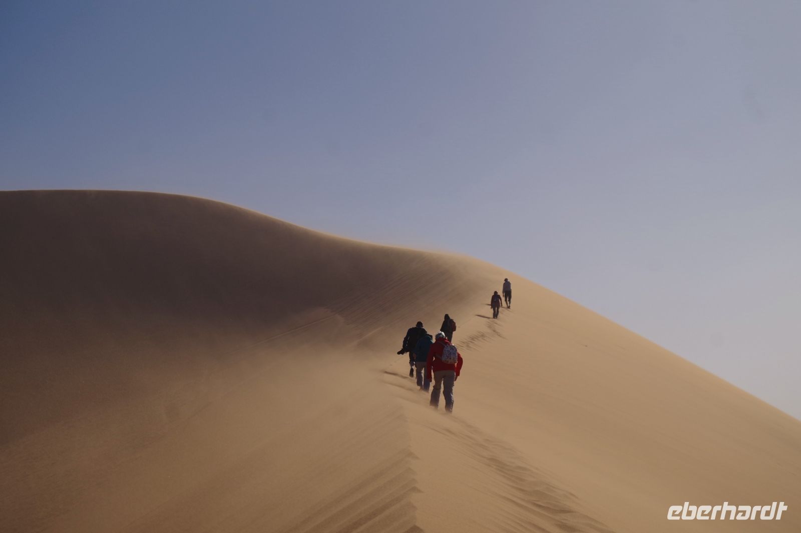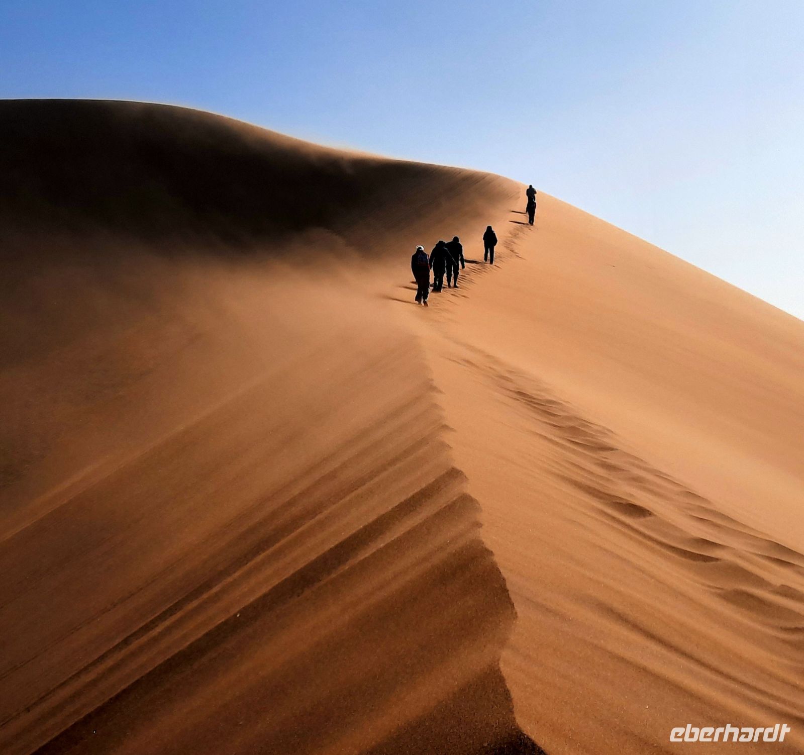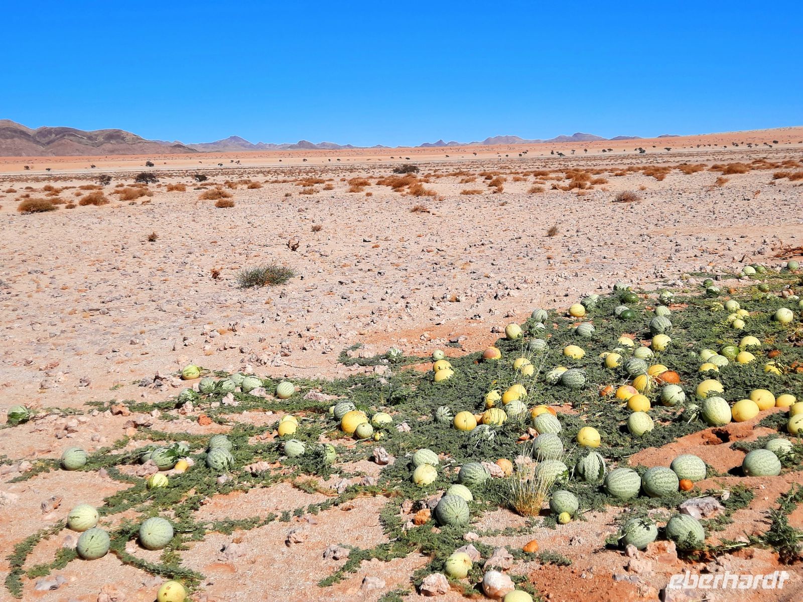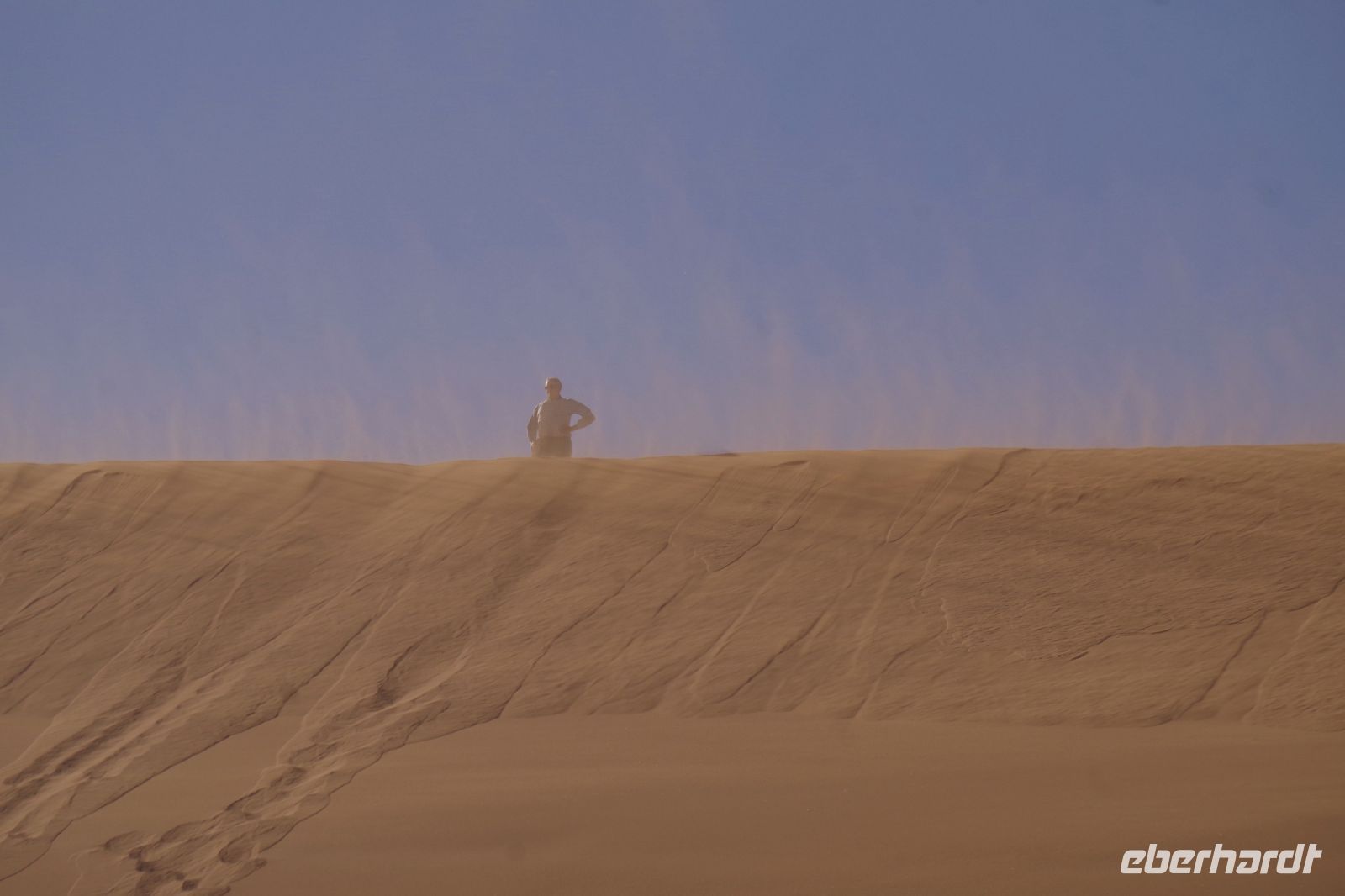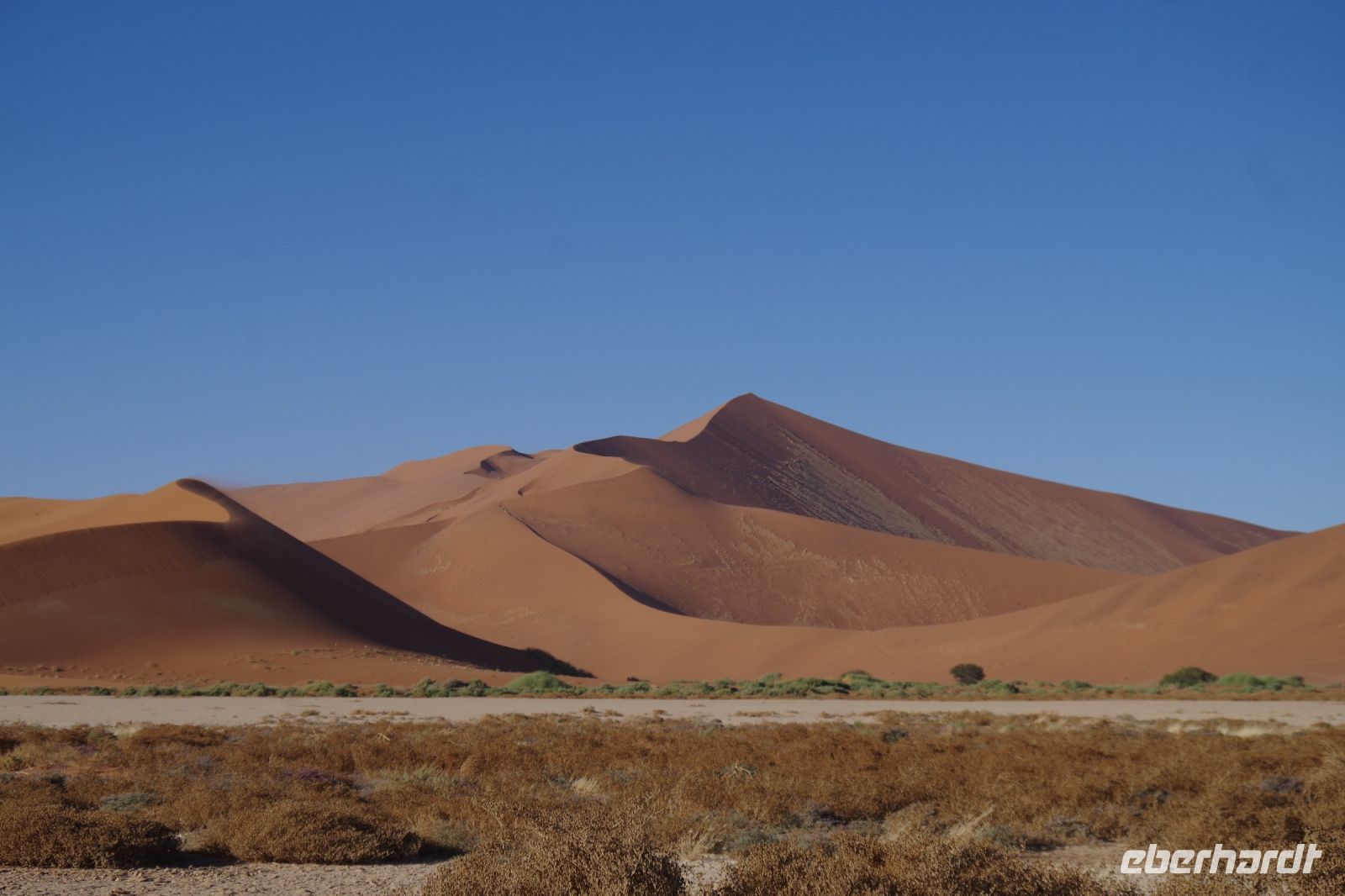 Die Lodge liegt relativ nah am Eingang des Nationalparks und so konnten wir doch etwas länger schlafen als in anderen Lodges und in unserer Lodge frühstücken. Die Tore öffnen bei Sonnenaufgang. Noch sind wenige Touristen im Land unterwegs, aber das wird sich hoffentlich bald ändern. Umso schöner für uns. Unterwegs hielten wir an und schauten der Sonne beim Aufstehen zu. Langsam formte sich die Dünenlandschaft. Das Stimmung am kühleren Morgen ist besonders toll - das Farbenspiel einmalig. Klick, Klick, unsere Kameras hatten viel zu tun. Man sah das tiefgrüne Band des Tsauchab Rivier, das sich durch die karge Wüste schlängelte. In der Regenzeit, Anfang diesen Jahres ist das Rivier abgekommen (ist geflossen) und hat das Sossusvlei (Lehmsenke) am Ende mit Wasser gefüllt. Es war alles noch sehr grün und wir sahen erstaunlich viele Tiere unterwegs: Oryxe und Springböcke. Obligatorischer erster Stopp war an Düne 45, wo einige hinauf stiegen. Am 4x4 Parkplatz (Ende der Teerstraße) angekommen, stiegen wir in 4x4-Shuttle um und schlitterten durch das sandige Rivier. Neben 4x4 sind optimaler Reifendruck und entsprechende Fahrkünste erforderlich, um nicht mit Schaufel und Eimerchen im großen Namib-Sandkasten buddeln zu müssen. Der Shuttle brachte uns zum Sossusvlei, zur Lehmsenke, deren Namen der Nationalpark trägt. Wenn der Tsauchab abkommt und genügend Wasser hat (wie während unserer Reise), fließt er bis hier her und füllt die Lehmsenke mit Wasser, das dann hier versickert und verdunstet. Weiter kommt der Fluss nicht, die Dünen versperren ihm den Weg zum ca. 50 km entfernten Atlantik. Sandsturm setzte ein. Gut verhüllt erklommen wir die SossusDüne, die weiter zur Big Mama führt. Die Lehmsenke war gut mit Waser gefüllt, wie ein kleiner See sah sie aus. Ringsum alles grüne, auch die grünen Nara-Büsche mit ihren kleinen, Melonen ähnlichen Früchten (nur die weiblichen tragen Früchte). Die endemische, geschützte Pflanze wächst nur da, wo ihre Wurzeln Grundwasser erreichen. Oryx & Co verspeisen die Früchte gern und auch die Namas nutzen die Heilkraft der Melone. Danach gings es zum Boxenstopp Dead Vlei. Von den schattigen Kameldornbäumen läuft man ca. 30 min, am besten auf den harten Lehmplatten, die sich bilden. Durch Wind und Klima verändern sich diese ständig, wie auch die Dünen. Also stiefelten wir los. Das Dead Vlei ist das Fotomotiv der Namib! Man muss sich mal vorstellen, dass es an dieser Stelle, vor Millionen Jahren, unendlich viel Wasser gab. Und heute: Die von hohen Sanddünen umschlossene Lehmsenke trocken und karg: alte, abgestorbene Kameldornbäume; harter, weißer Lehmboden und ringsherum das rote Dünenmeer. Darauf ein Schluck Wasser! Schatten fanden wir erst wieder, als wir am Parkplatz unterm großen Kameldornbaum auf unseren Shuttle warteten.