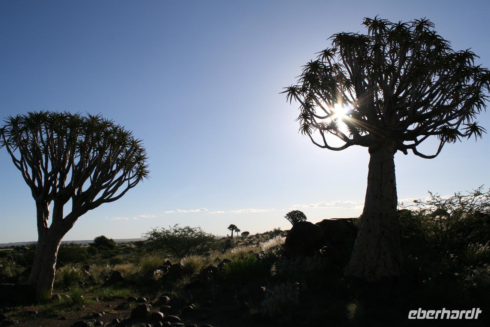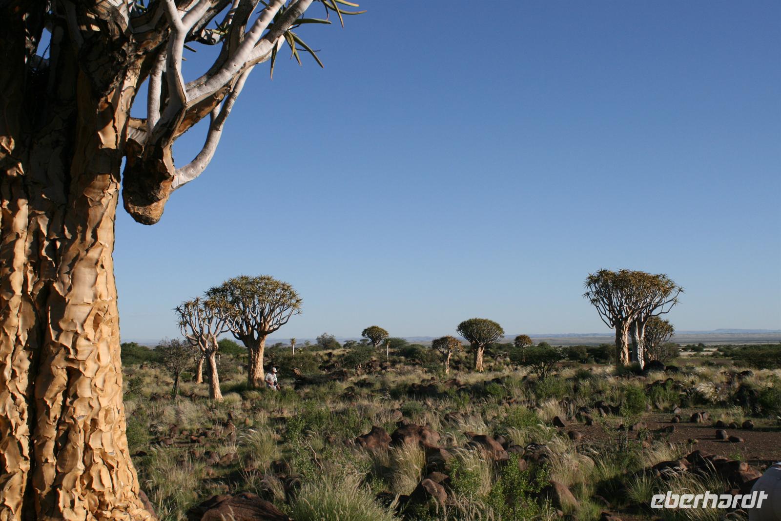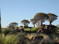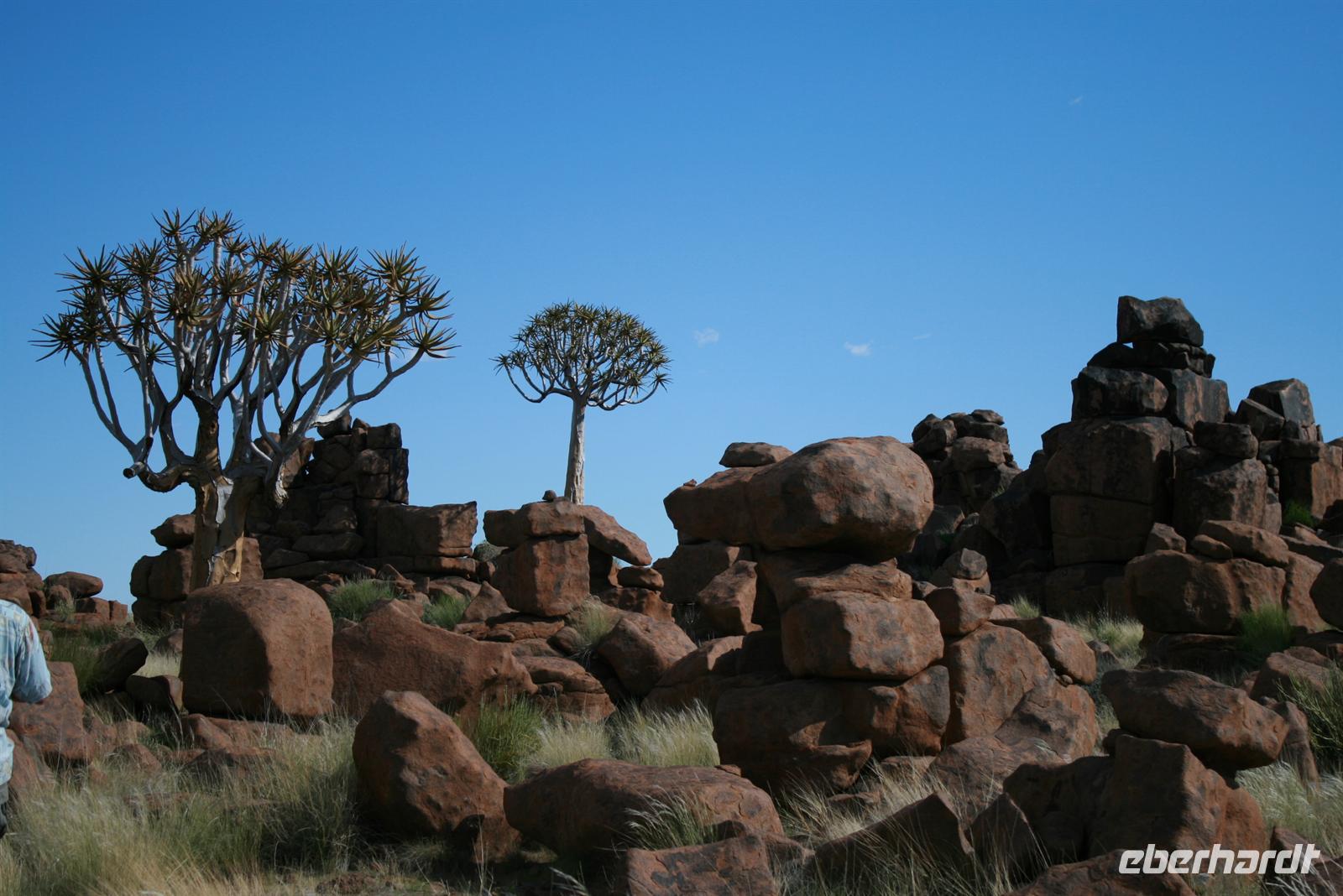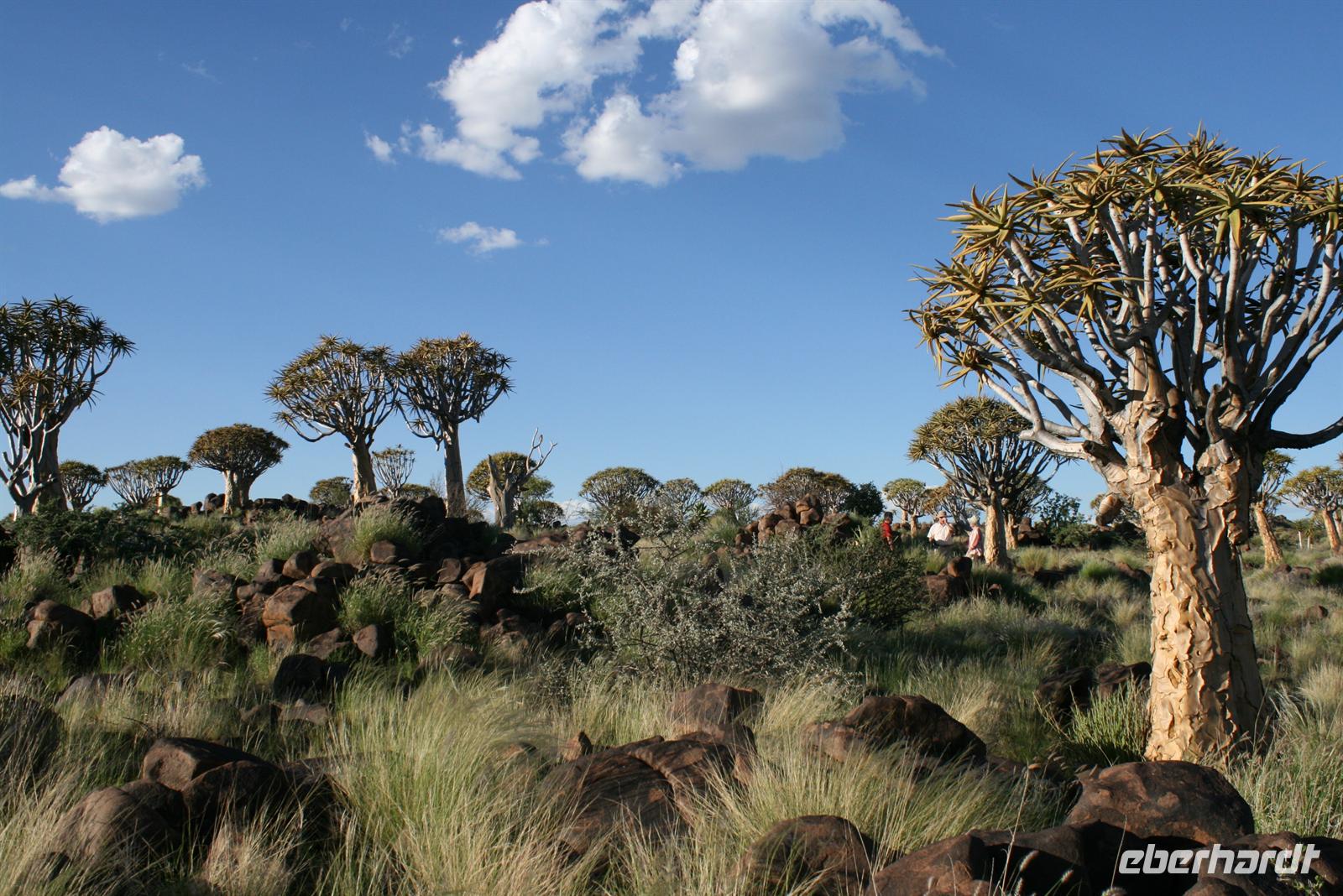 Von unserer gemütlichen Lodge fuhren wir weiter in Richtung Süden. Kilometerweit durch die Savanne mit Kameldornakazien, Gräsern und Sträuchern - also durch die Kalahari. Jetzt meint man die Kalahari, das zweitgrößte Trockengebiet Namibias, die große Sandwüste - was hat das mit grünen Gräsern und Akazien zu tun. In den letzten Jahren ist hier viel Regen gefallen, der die karge Landschaft ergrünen lies. Nur die Kilometerlangen rostroten Sanddünen über die wir fahren erinnern an eine Wüste. Es müssen an die 30 Stück gewesen sein über die wir gefahren sind, quasi eine natürliche Achterbahn in der Kalahari. Gegen Mittag erreichten wir Keetmanshoop, das ehemalige Missionsdorf des Deutschen Keetman, wo wir in der Central Lodge unsere Zimmer bezogen. Gleich nachdem wir eingecheckt hatten spazierten wir durch die Straßen des kleinen Ortes, wo auch heute noch das „Kaiserliche Postamt" zu finden ist. Am Nachmittag fuhren wir auf den Spielplatz - auf den „Spielplatz der Giganten". Der enorme Temperaturunterschied zwischen Tag und Nacht sprengte die Felsen auf und formte so über Jahrtausende bizzare Formationen die aussehen, als ob hier jemand mit Bauklötzen gespielt hätte. Nach einem kurzen Spaziergang fuhren wir zur „Quivertree Lodge", eine kleine Farm am Rande des Köcherbaumwaldes. Glücklicherweise waren wir zur richtigen Zeit am richtigen Ort und durften bei der Fütterung der Raubtiere dabei sein. Das Motto „Mittendrin statt nur dabei" war hier Programm. Wir folgten der Besitzerin der Farm, die einen Eimer frische Innereien vor sich her trug, in das Gehege der Geparde. Doch kein Gepard in Sicht..."Quikita, Lala, Lulu (oder so ähnlich) Kommt, kommt" schrie die Besitzerin immer wieder - bis in der Ferne etwas angesaust kam. Drei Geparden sprinteten in unsere Richtung, um sich Frischfleisch (das aus dem Eimer - wir blieben verschont) zu hohlen. Eine ganze Weile konnten wir den Tieren hautnah beim fressen zusehen - ohne Gitter, live und in Farbe. Ein Erlebnis das wir nie vergessen werden. Nach dem großen Fressen spazierten wir einige Meter zu den Köcherbäumen. Die Aloe Art erstaunte mit seiner besonderen Art in den Himmel zu ragen. Leider dauerte es noch zu lange bis das Untergehen der Sonne den Bäumen ein besonderes Erscheinen verleiht. In der Lodge durften wir am Abend von der Karte wählen und uns mit Strauß, Springbock und Co. den Bauch voll schlagen. Die Gesangseinlage des Küchenpersonals zauberte, dann vorm Schlafen gehen noch allen ein Lächeln aufs Gesicht.
