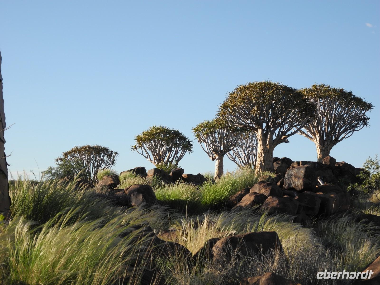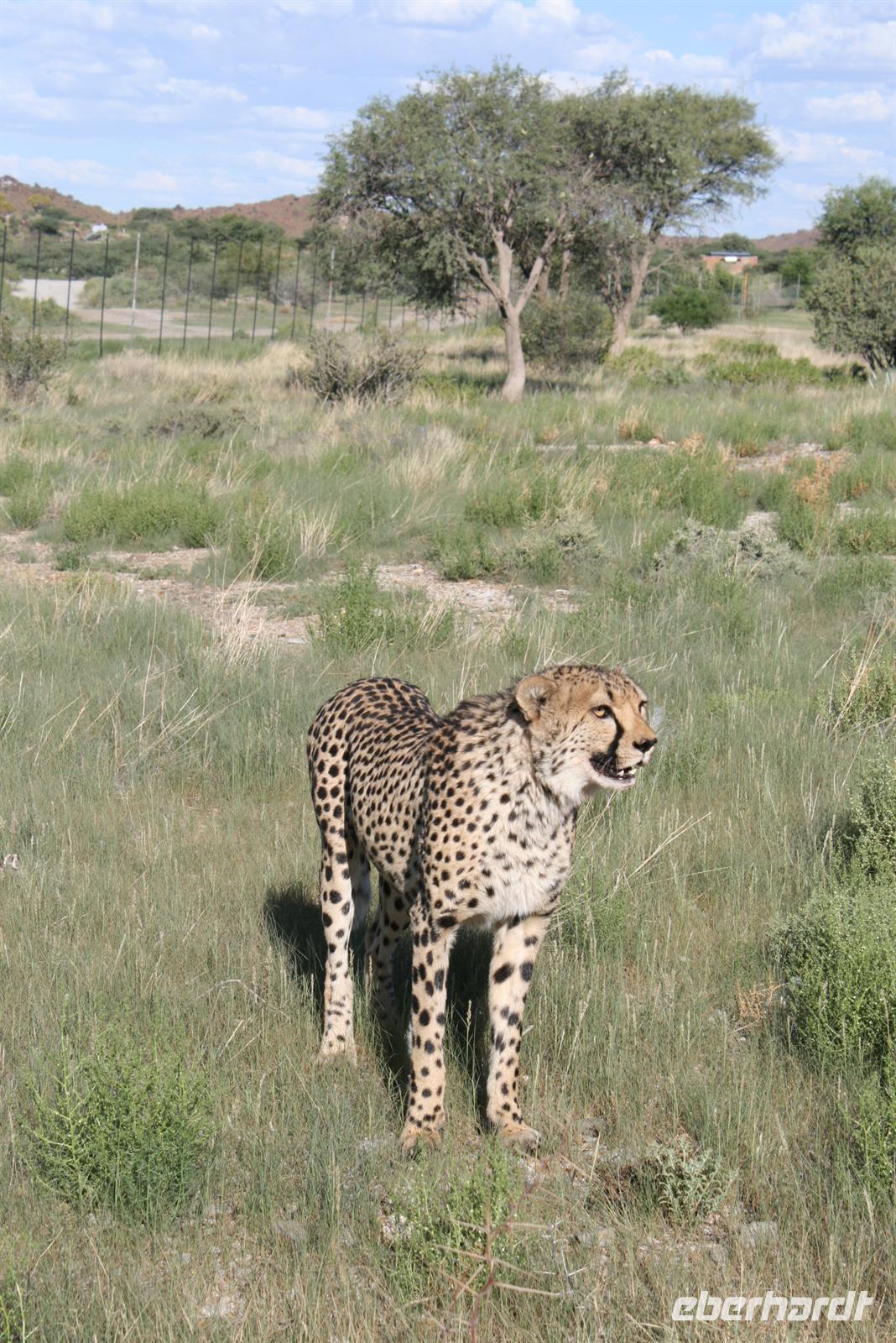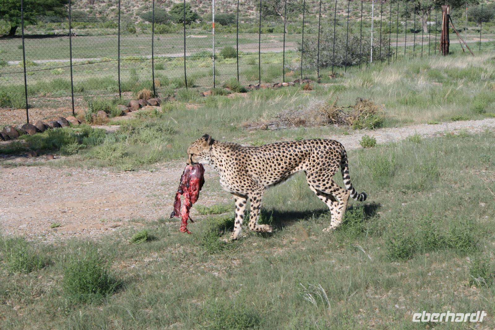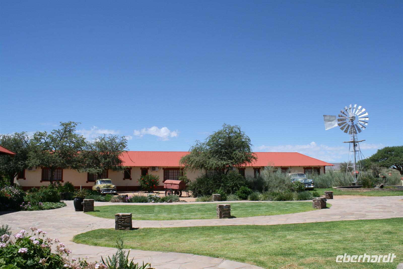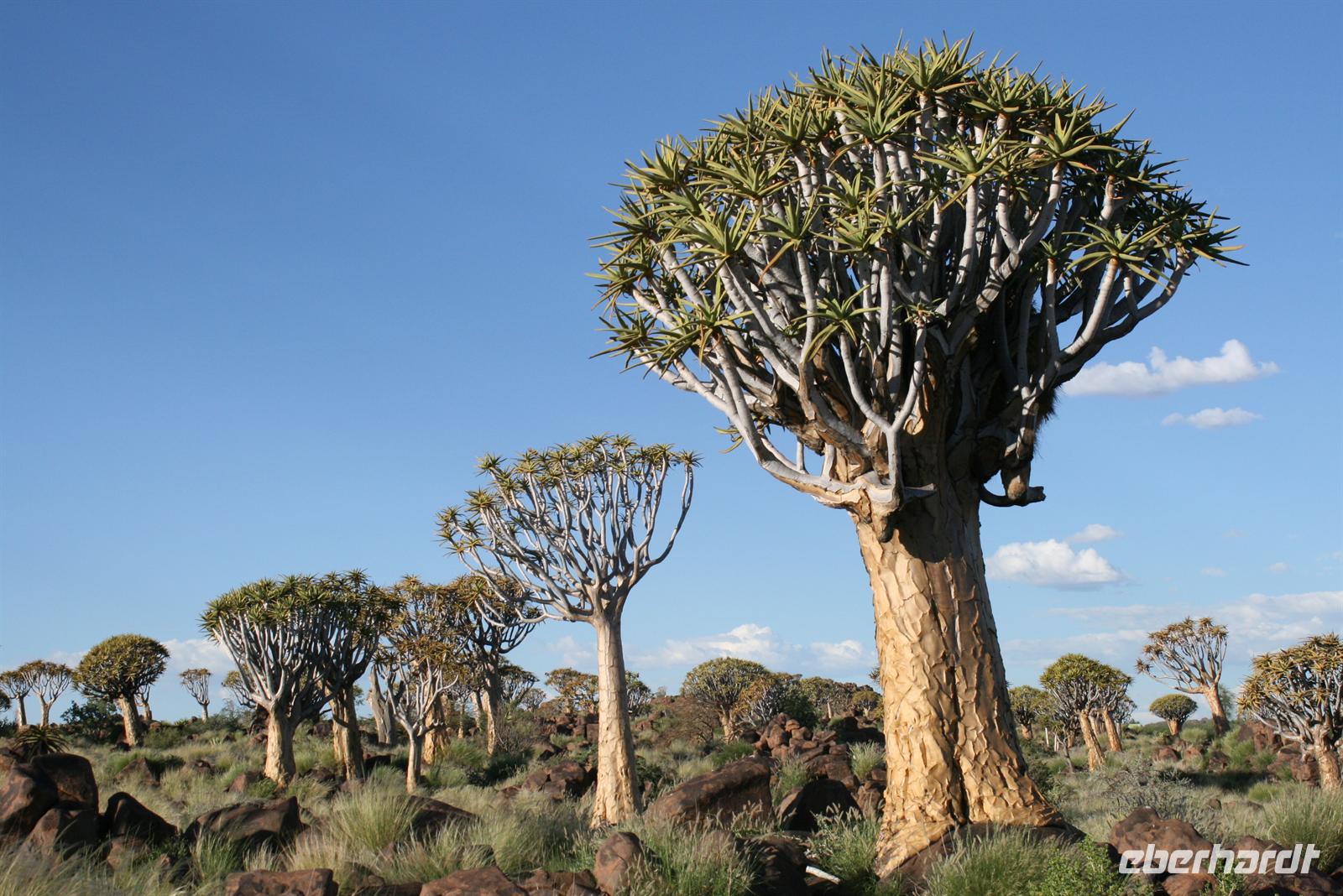 Von unserer gemütlichen Lodge fuhren wir weiter in Richtung Süden. Kilometerweit durch die Savanne mit Kameldornakazien, Gräsern und Sträuchern - also durch die Kalahari. Jetzt meint man die Kalahari, das zweitgrößte Trockengebiet Namibias, die große Sandwüste - was hat das mit grünen Gräsern und Akazien zu tun. In den letzten Jahren ist hier viel Regen gefallen, der die karge Landschaft ergrünen lies. Nur die Kilometerlangen rostroten Sanddünen über die wir fahren erinnern an eine Wüste. Es müssen an die 30 Stück gewesen sein über die wir gefahren sind, quasi eine natürliche Achterbahn in der Kalahari. Gegen Mittag erreichten wir Keetmanshoop, das ehemalige Missionsdorf des Deutschen Keetman, wo wir in der Central Lodge unsere Zimmer bezogen. Gleich nachdem wir eingecheckt hatten spazierten wir durch die Straßen des kleinen Ortes, wo auch heute noch das „Kaiserliche Postamt" zu finden ist. Am Nachmittag fuhren wir auf den Spielplatz - auf den „Spielplatz der Giganten". Der enorme Temperaturunterschied zwischen Tag und Nacht sprengte die Felsen auf und formte so über Jahrtausende bizzare Formationen die aussehen, als ob hier jemand mit Bauklötzen gespielt hätte. Nach einem kurzen Spaziergang fuhren wir zur „Quivertree Lodge", eine kleine Farm am Rande des Köcherbaumwaldes. Glücklicherweise waren wir zur richtigen Zeit am richtigen Ort und durften bei der Fütterung der Raubtiere dabei sein. Das Motto „Mittendrin statt nur dabei" war hier Programm. Wir folgten der Besitzerin der Farm, die einen Eimer frische Innereien vor sich her trug, in das Gehege der Geparde. Doch kein Gepard in Sicht..."Quikita, Lala, Lulu (oder so ähnlich) Kommt, kommt" schrie die Besitzerin immer wieder - bis in der Ferne etwas angesaust kam. Drei Geparden sprinteten in unsere Richtung, um sich Frischfleisch (das aus dem Eimer - wir blieben verschont) zu hohlen. Eine ganze Weile konnten wir den Tieren hautnah beim fressen zusehen - ohne Gitter, live und in Farbe. Ein Erlebnis das wir nie vergessen werden. Nach dem großen Fressen spazierten wir einige Meter zu den Köcherbäumen. Die Aloe Art erstaunte mit seiner besonderen Art in den Himmel zu ragen. Leider dauerte es noch zu lange bis das Untergehen der Sonne den Bäumen ein besonderes Erscheinen verleiht. In der Lodge durften wir am Abend von der Karte wählen und uns mit Strauß, Springbock und Co. den Bauch voll schlagen. Die Gesangseinlage des Küchenpersonals zauberte, dann vorm Schlafen gehen noch allen ein Lächeln aufs Gesicht.