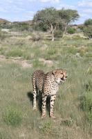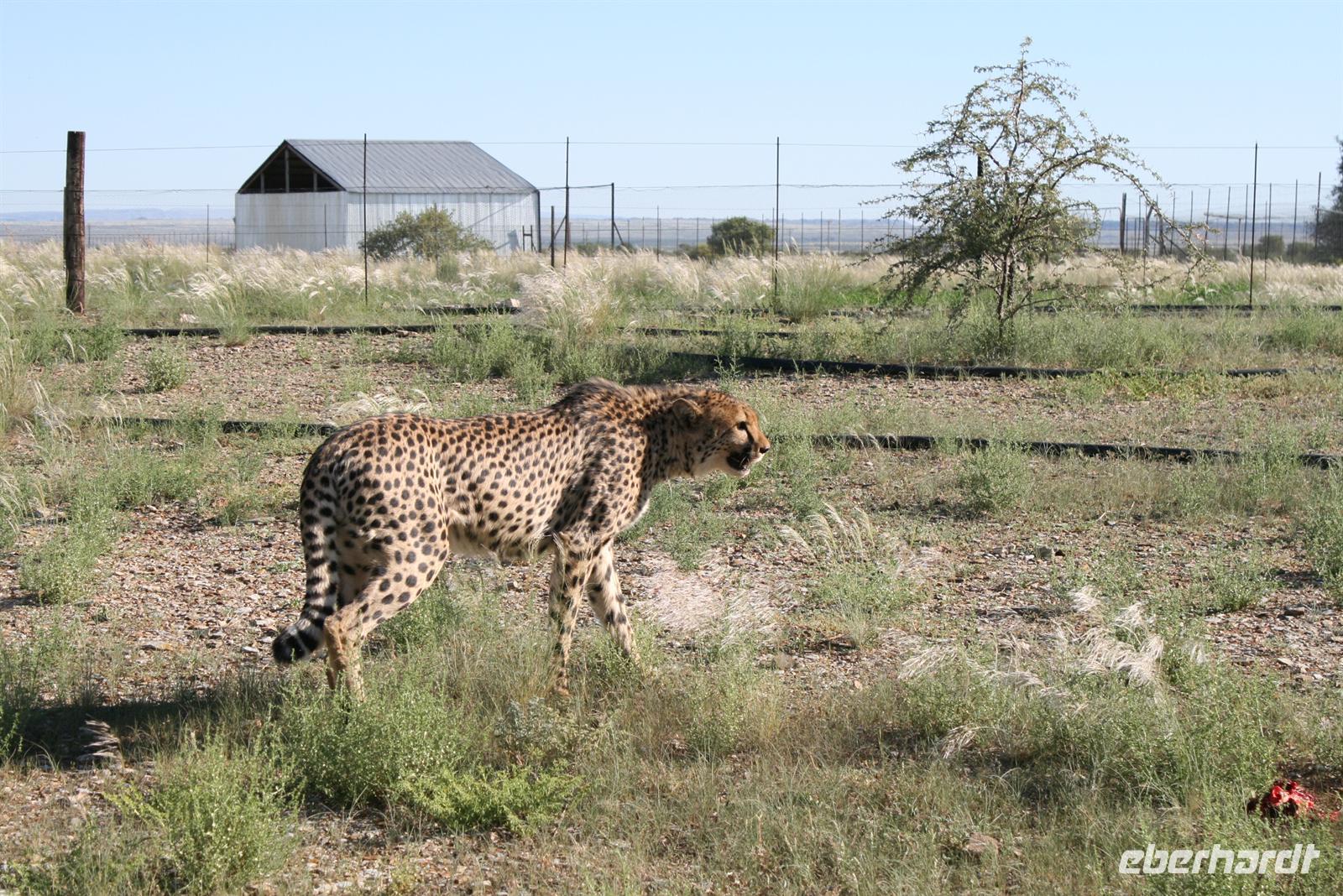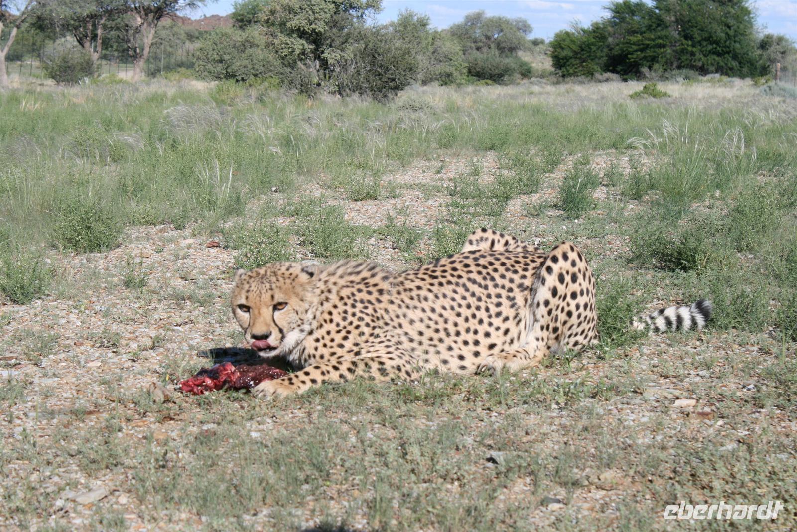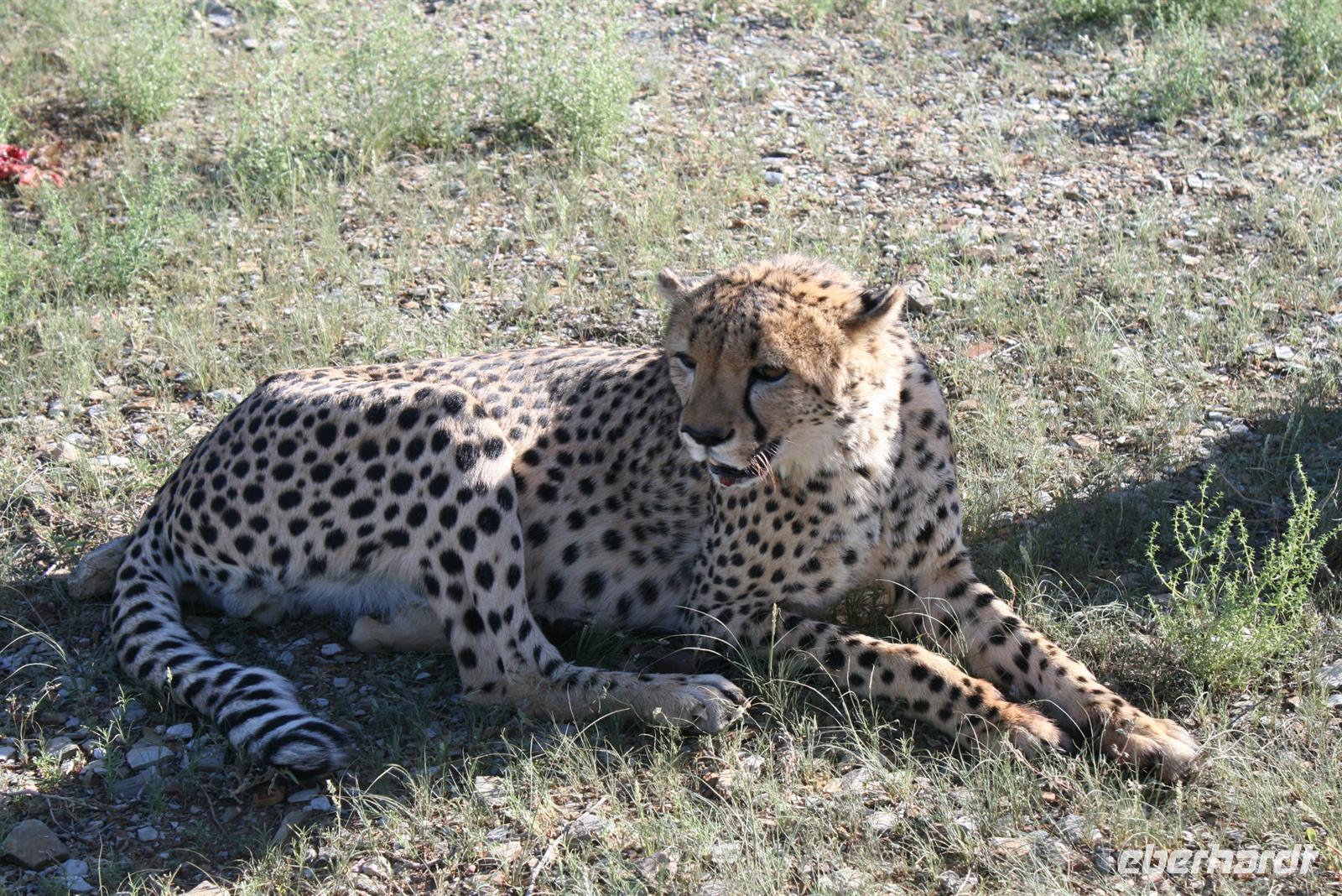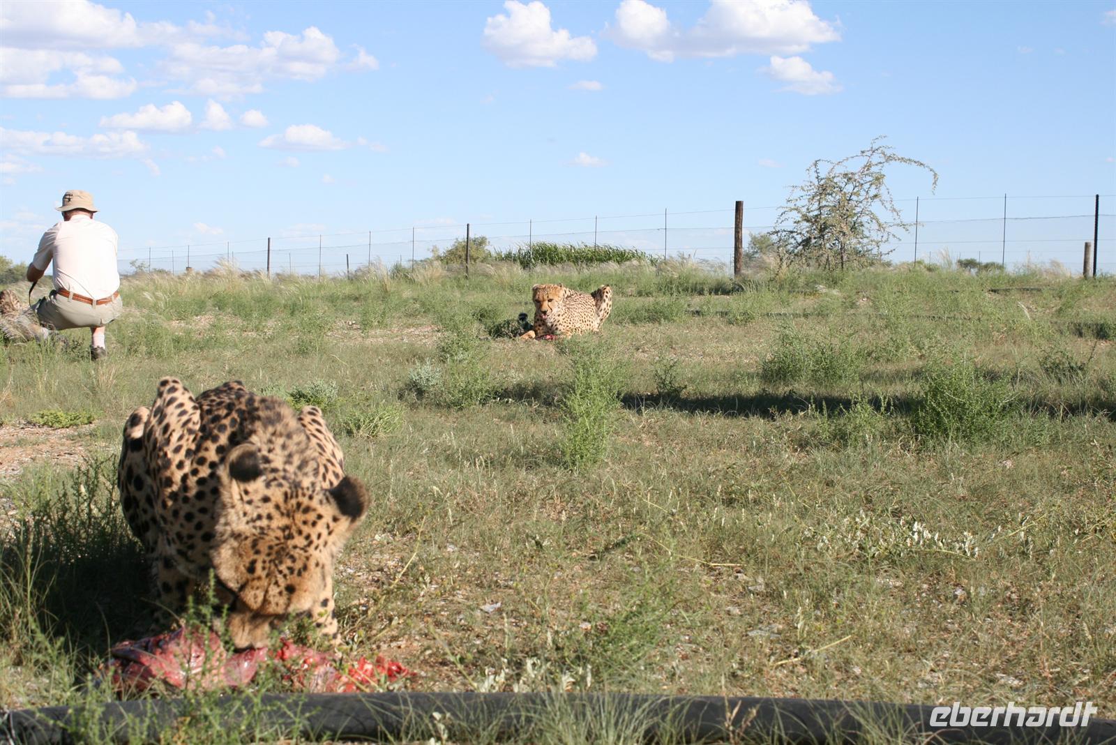 Von unserer gemütlichen Lodge fuhren wir weiter in Richtung Süden. Kilometerweit durch die Savanne mit Kameldornakazien, Gräsern und Sträuchern - also durch die Kalahari. Jetzt meint man die Kalahari, das zweitgrößte Trockengebiet Namibias, die große Sandwüste - was hat das mit grünen Gräsern und Akazien zu tun. In den letzten Jahren ist hier viel Regen gefallen, der die karge Landschaft ergrünen lies. Nur die Kilometerlangen rostroten Sanddünen über die wir fahren erinnern an eine Wüste. Es müssen an die 30 Stück gewesen sein über die wir gefahren sind, quasi eine natürliche Achterbahn in der Kalahari. Gegen Mittag erreichten wir Keetmanshoop, das ehemalige Missionsdorf des Deutschen Keetman, wo wir in der Central Lodge unsere Zimmer bezogen. Gleich nachdem wir eingecheckt hatten spazierten wir durch die Straßen des kleinen Ortes, wo auch heute noch das „Kaiserliche Postamt" zu finden ist. Am Nachmittag fuhren wir auf den Spielplatz - auf den „Spielplatz der Giganten". Der enorme Temperaturunterschied zwischen Tag und Nacht sprengte die Felsen auf und formte so über Jahrtausende bizzare Formationen die aussehen, als ob hier jemand mit Bauklötzen gespielt hätte. Nach einem kurzen Spaziergang fuhren wir zur „Quivertree Lodge", eine kleine Farm am Rande des Köcherbaumwaldes. Glücklicherweise waren wir zur richtigen Zeit am richtigen Ort und durften bei der Fütterung der Raubtiere dabei sein. Das Motto „Mittendrin statt nur dabei" war hier Programm. Wir folgten der Besitzerin der Farm, die einen Eimer frische Innereien vor sich her trug, in das Gehege der Geparde. Doch kein Gepard in Sicht..."Quikita, Lala, Lulu (oder so ähnlich) Kommt, kommt" schrie die Besitzerin immer wieder - bis in der Ferne etwas angesaust kam. Drei Geparden sprinteten in unsere Richtung, um sich Frischfleisch (das aus dem Eimer - wir blieben verschont) zu hohlen. Eine ganze Weile konnten wir den Tieren hautnah beim fressen zusehen - ohne Gitter, live und in Farbe. Ein Erlebnis das wir nie vergessen werden. Nach dem großen Fressen spazierten wir einige Meter zu den Köcherbäumen. Die Aloe Art erstaunte mit seiner besonderen Art in den Himmel zu ragen. Leider dauerte es noch zu lange bis das Untergehen der Sonne den Bäumen ein besonderes Erscheinen verleiht. In der Lodge durften wir am Abend von der Karte wählen und uns mit Strauß, Springbock und Co. den Bauch voll schlagen. Die Gesangseinlage des Küchenpersonals zauberte, dann vorm Schlafen gehen noch allen ein Lächeln aufs Gesicht.