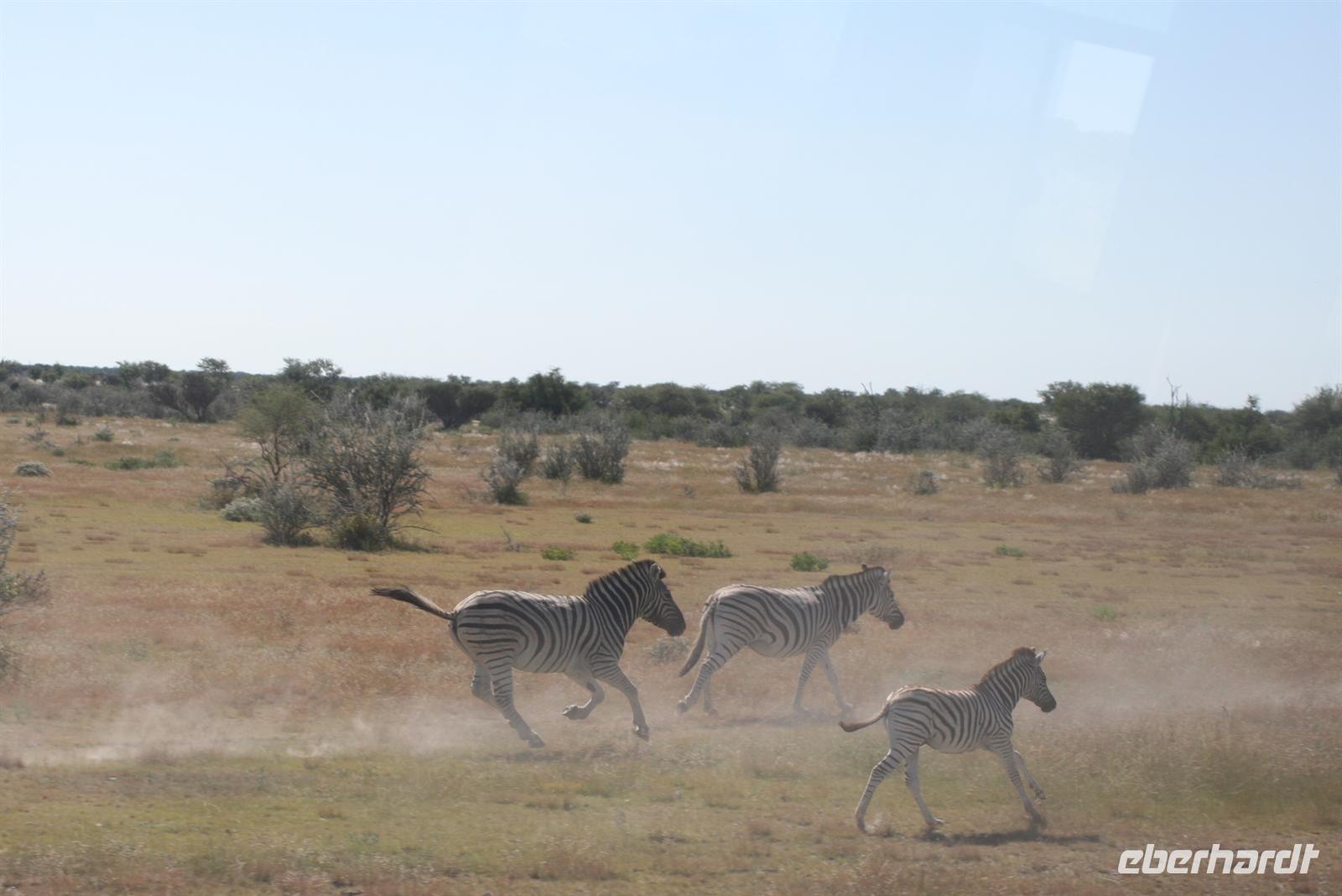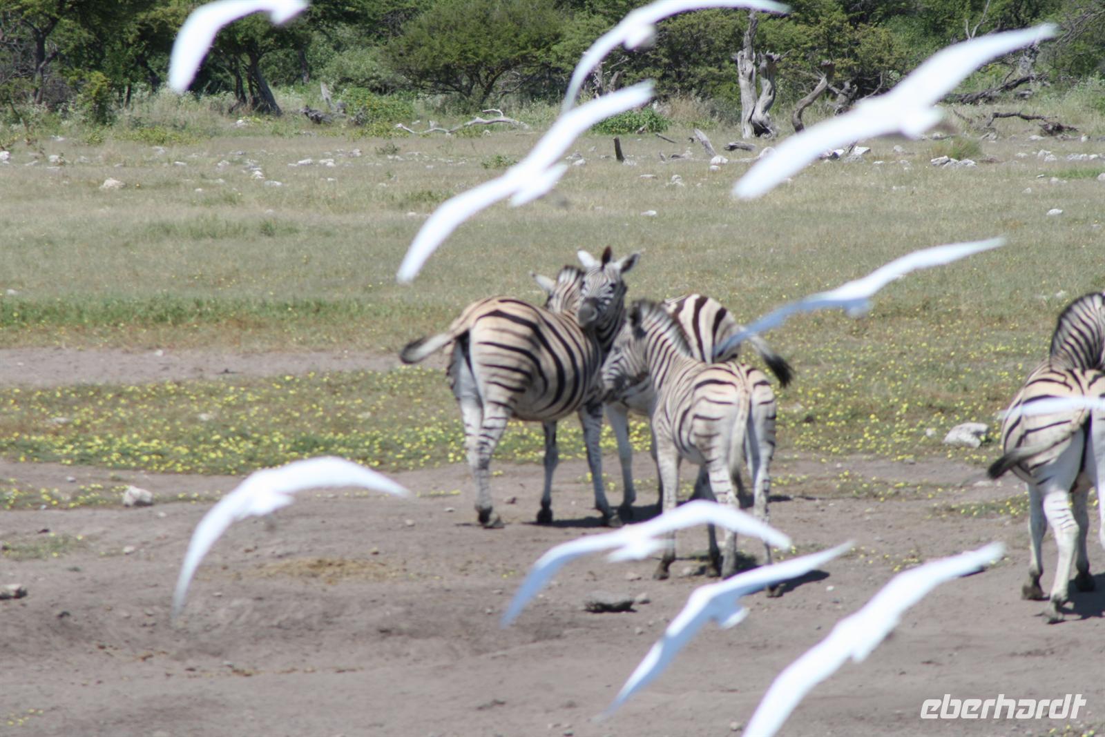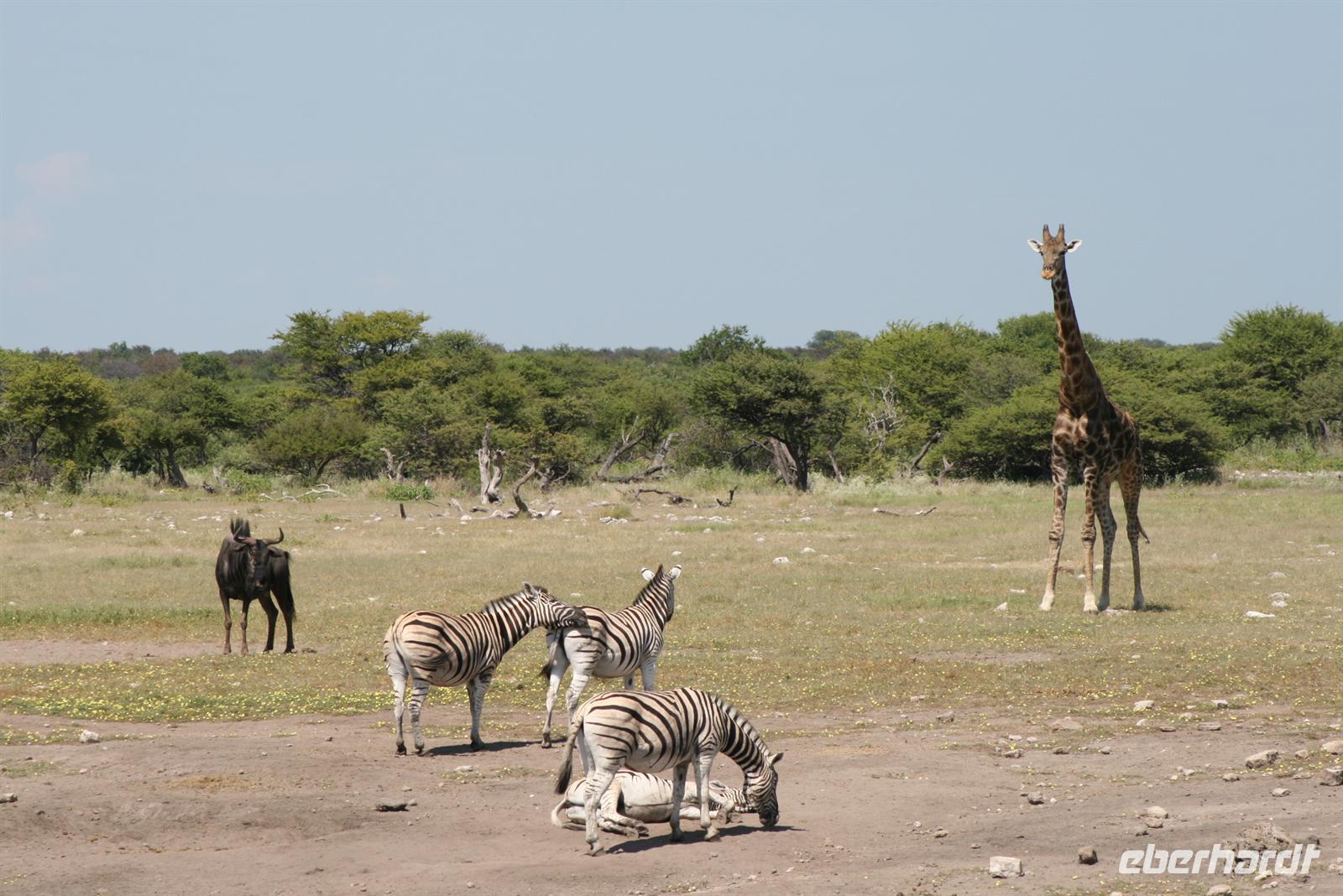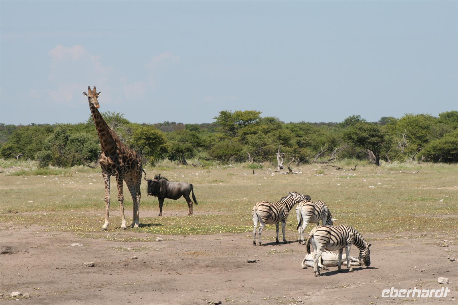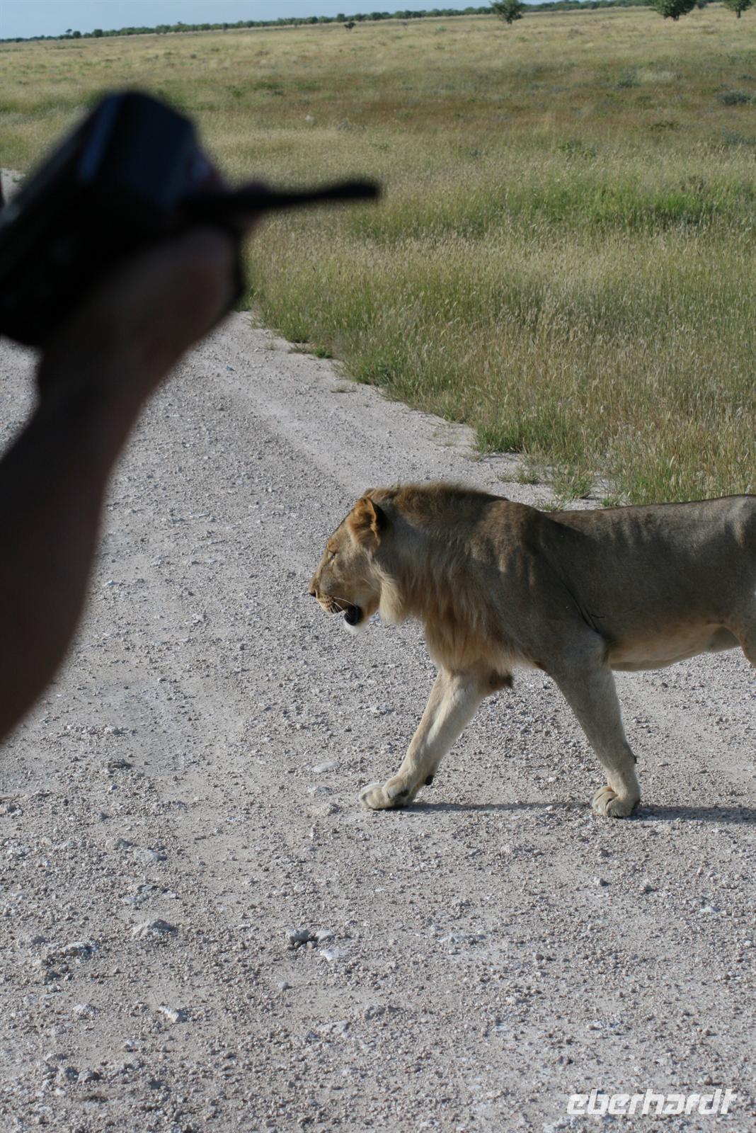 Vor Sonnenaufgang brachen wir auf um auf die Pirsch zu gehen. Der Etosha Nationalpark öffnet uns seine Pforten um sieben Uhr morgens. Schon nach wenigen Kilometern entdecken wir schöne Vögel wie Sekretäre und Oryxantilopen neben unserer Fahrbahn. Dann schrie es auf „Löwen! Das sind doch Löwen!" fünf prachtvolle Löwen stolzieren direkt auf uns zu um sich vor unserer Nase niederließen und anschließend die Straße querten. Sie streiften weiter Richtung Horizont als sie plötzlich kehrt machten um sich wieder direkt vor dem Reisebus zu platzieren. Eine kleine Schlammpfütze diente als kühle Erfrischung bei der Hitze. Ein spektakuläres Erlebnis, das bis dahin eines der Höhepunkte darbot. Es dauerte nicht allzulange als uns auch noch ein Spitzmaulnashorn über den Weg lief. Nach den aufregenden Begegnungen ruhten wir uns zur Mittagszeit in der Lodge, an die ein Wasserloch grenzt, aus. Am Wasserloch ging es quirlig her - Zebras über Zebras die sich am Wasser tummelten. Auch unsere Weiterfahrt bot einiges: Zebras, Zebras, Zebras, Zebras, Zebras, Zebras, Gnu Zebras, Zebras, Zebras, Zebras, Zebras, Zebras, Springbok, Zebras, Zebras, Zebras, Zebras, Zebras, Zebras ... Als wir am frühen Abend den Park Richtung Toshari Lodge verlassen, störten wir ein paar Giraffen beim Abendessen. Unser Abendessen fand an diesem Tag im Garten der Lodge als Grillabend statt.