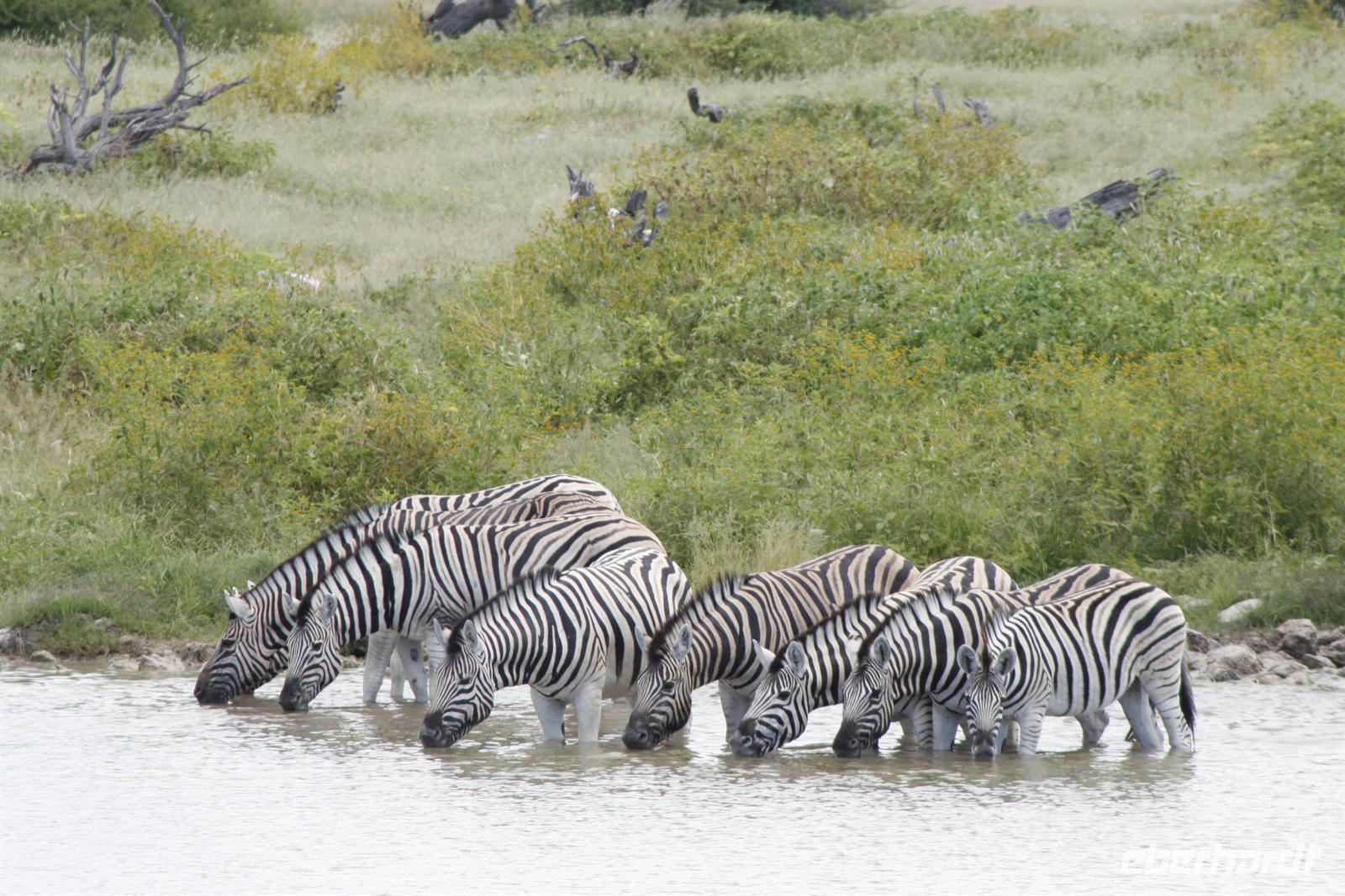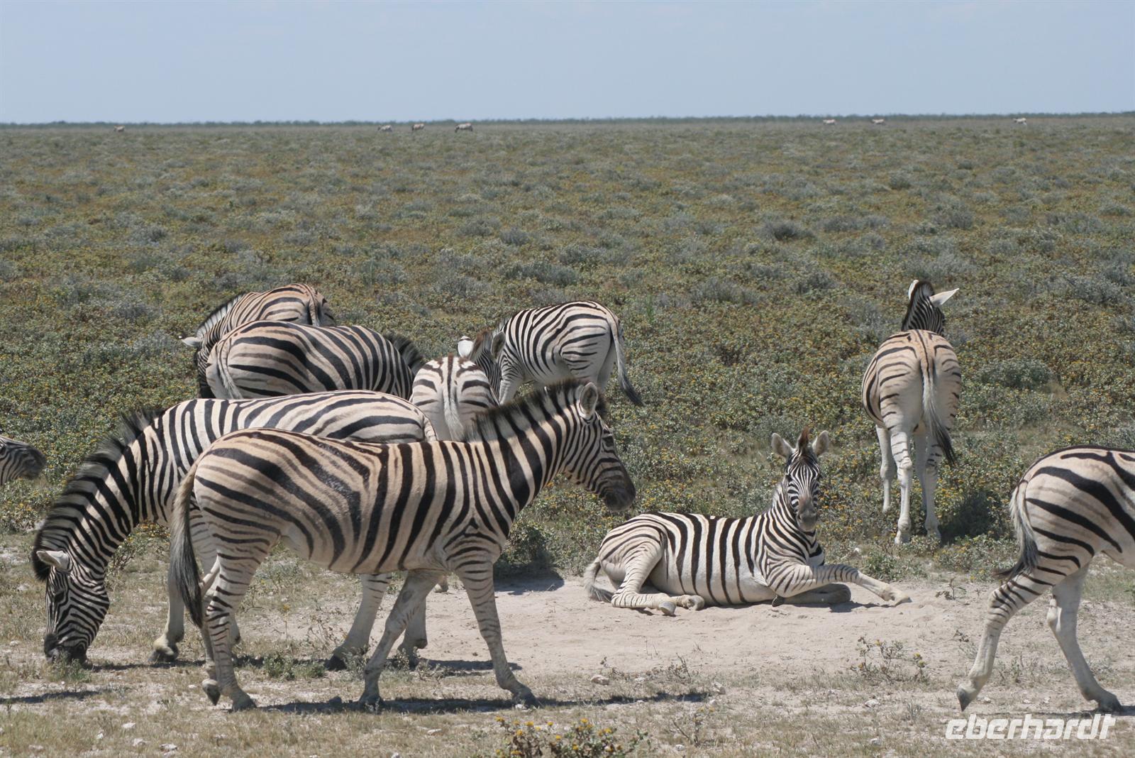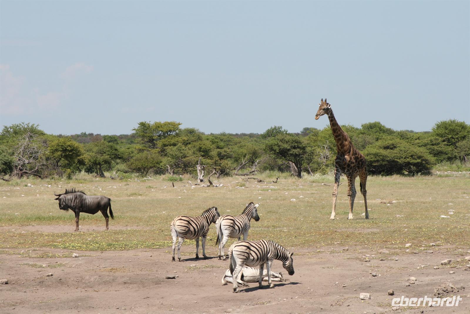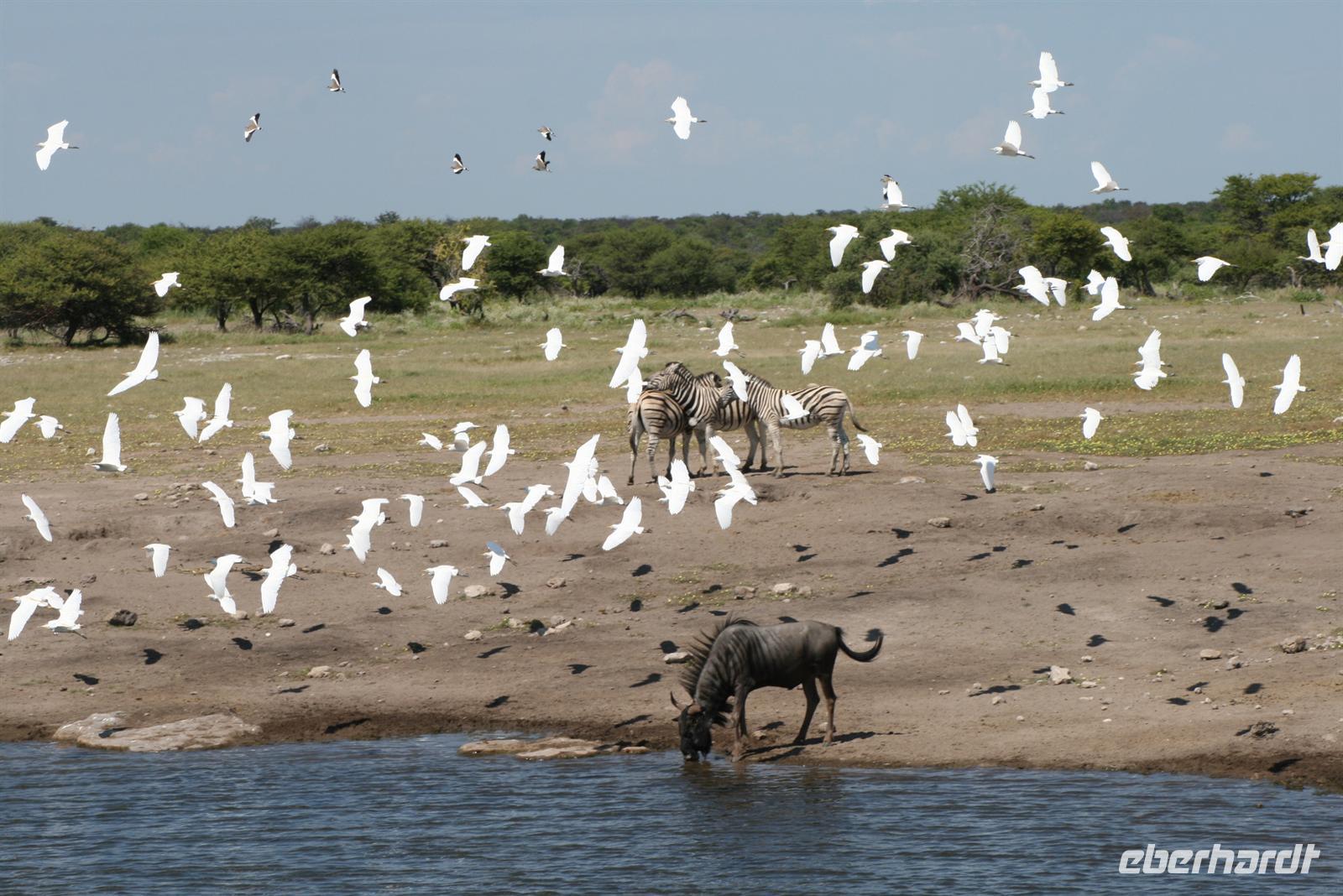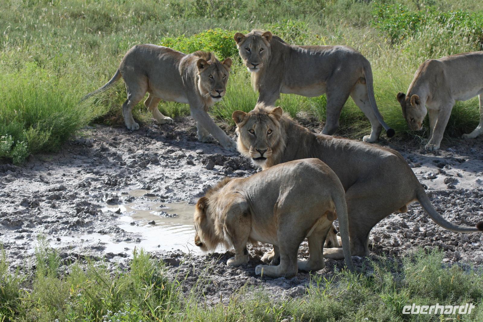 Vor Sonnenaufgang brachen wir auf um auf die Pirsch zu gehen. Der Etosha Nationalpark öffnet uns seine Pforten um sieben Uhr morgens. Schon nach wenigen Kilometern entdecken wir schöne Vögel wie Sekretäre und Oryxantilopen neben unserer Fahrbahn. Dann schrie es auf „Löwen! Das sind doch Löwen!" fünf prachtvolle Löwen stolzieren direkt auf uns zu um sich vor unserer Nase niederließen und anschließend die Straße querten. Sie streiften weiter Richtung Horizont als sie plötzlich kehrt machten um sich wieder direkt vor dem Reisebus zu platzieren. Eine kleine Schlammpfütze diente als kühle Erfrischung bei der Hitze. Ein spektakuläres Erlebnis, das bis dahin eines der Höhepunkte darbot. Es dauerte nicht allzulange als uns auch noch ein Spitzmaulnashorn über den Weg lief. Nach den aufregenden Begegnungen ruhten wir uns zur Mittagszeit in der Lodge, an die ein Wasserloch grenzt, aus. Am Wasserloch ging es quirlig her - Zebras über Zebras die sich am Wasser tummelten. Auch unsere Weiterfahrt bot einiges: Zebras, Zebras, Zebras, Zebras, Zebras, Zebras, Gnu Zebras, Zebras, Zebras, Zebras, Zebras, Zebras, Springbok, Zebras, Zebras, Zebras, Zebras, Zebras, Zebras ... Als wir am frühen Abend den Park Richtung Toshari Lodge verlassen, störten wir ein paar Giraffen beim Abendessen. Unser Abendessen fand an diesem Tag im Garten der Lodge als Grillabend statt.