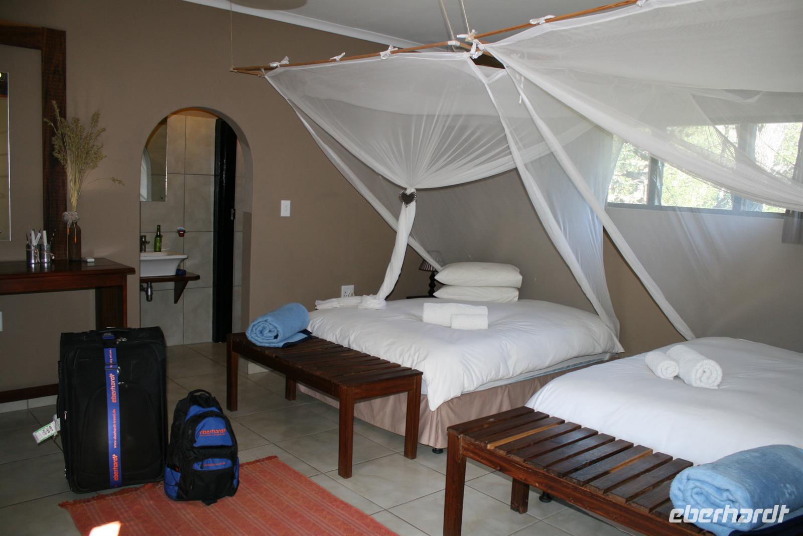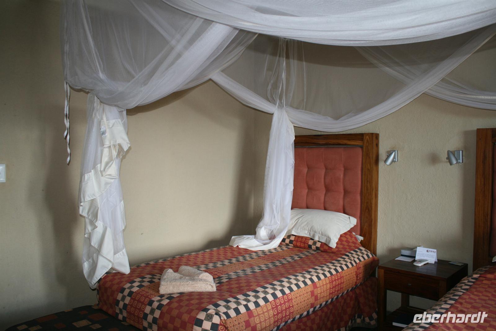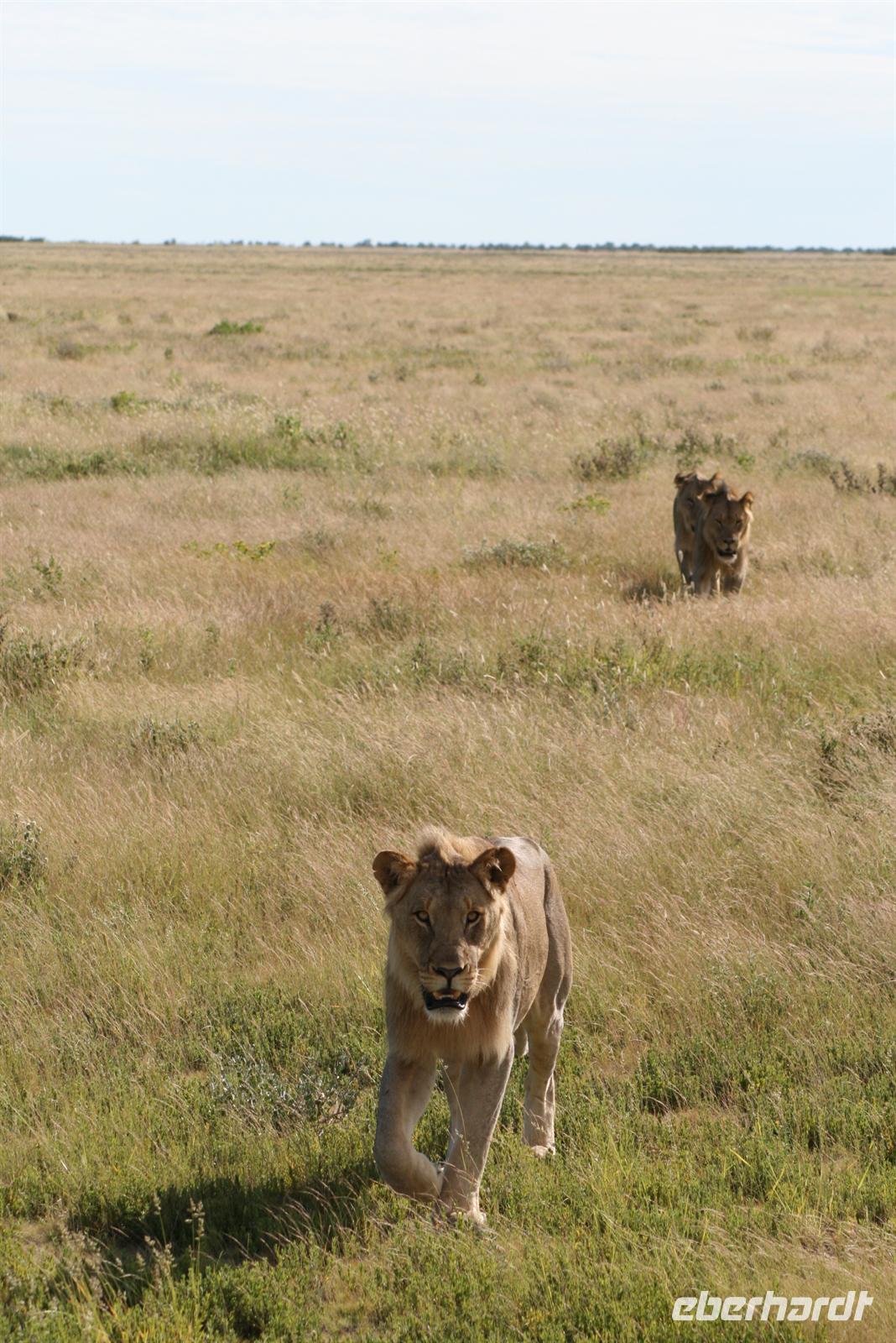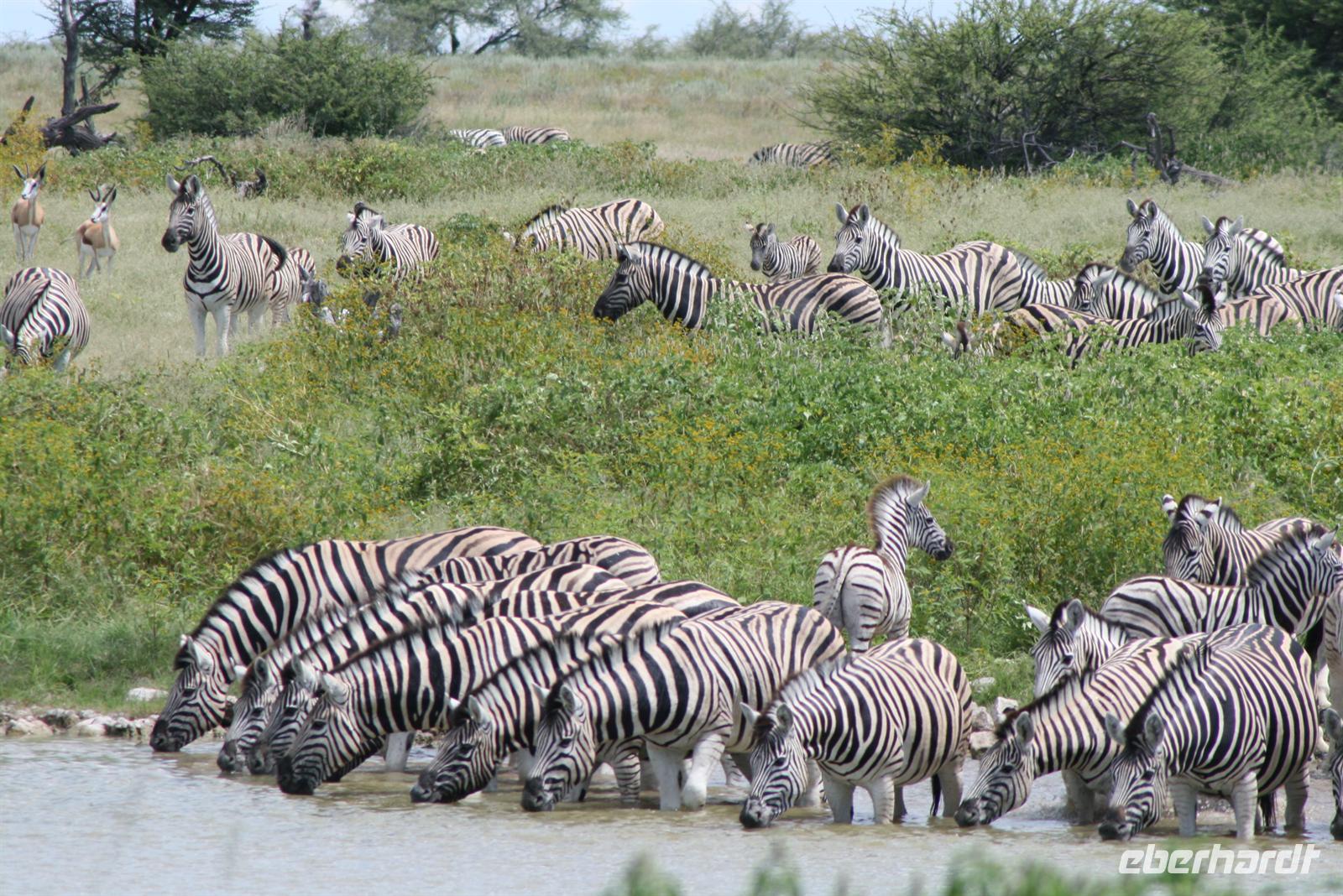 Vor Sonnenaufgang brachen wir auf um auf die Pirsch zu gehen. Der Etosha Nationalpark öffnet uns seine Pforten um sieben Uhr morgens. Schon nach wenigen Kilometern entdecken wir schöne Vögel wie Sekretäre und Oryxantilopen neben unserer Fahrbahn. Dann schrie es auf „Löwen! Das sind doch Löwen!" fünf prachtvolle Löwen stolzieren direkt auf uns zu um sich vor unserer Nase niederließen und anschließend die Straße querten. Sie streiften weiter Richtung Horizont als sie plötzlich kehrt machten um sich wieder direkt vor dem Reisebus zu platzieren. Eine kleine Schlammpfütze diente als kühle Erfrischung bei der Hitze. Ein spektakuläres Erlebnis, das bis dahin eines der Höhepunkte darbot. Es dauerte nicht allzulange als uns auch noch ein Spitzmaulnashorn über den Weg lief. Nach den aufregenden Begegnungen ruhten wir uns zur Mittagszeit in der Lodge, an die ein Wasserloch grenzt, aus. Am Wasserloch ging es quirlig her - Zebras über Zebras die sich am Wasser tummelten. Auch unsere Weiterfahrt bot einiges: Zebras, Zebras, Zebras, Zebras, Zebras, Zebras, Gnu Zebras, Zebras, Zebras, Zebras, Zebras, Zebras, Springbok, Zebras, Zebras, Zebras, Zebras, Zebras, Zebras ... Als wir am frühen Abend den Park Richtung Toshari Lodge verlassen, störten wir ein paar Giraffen beim Abendessen. Unser Abendessen fand an diesem Tag im Garten der Lodge als Grillabend statt.