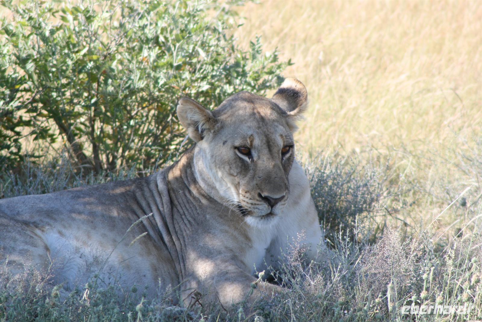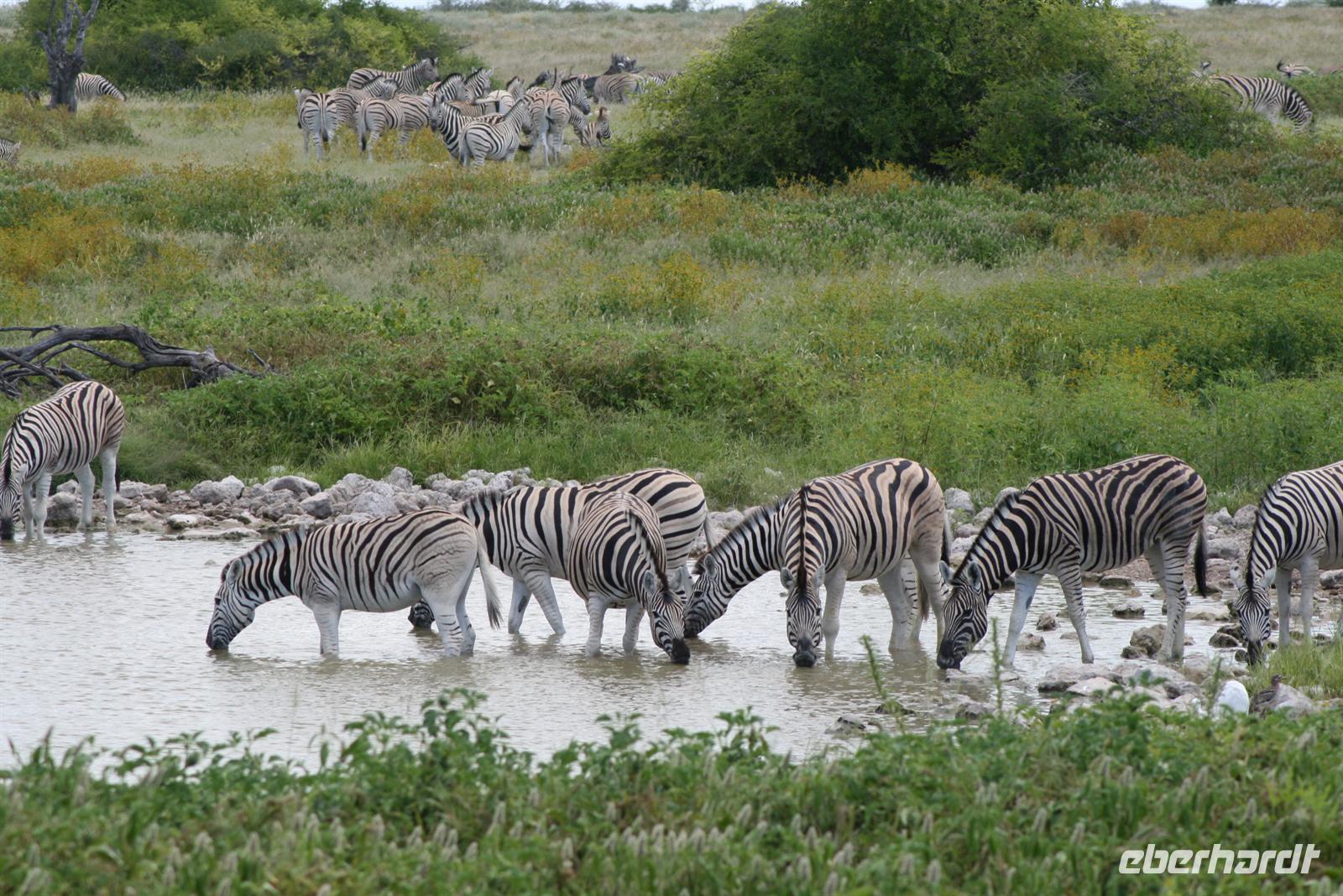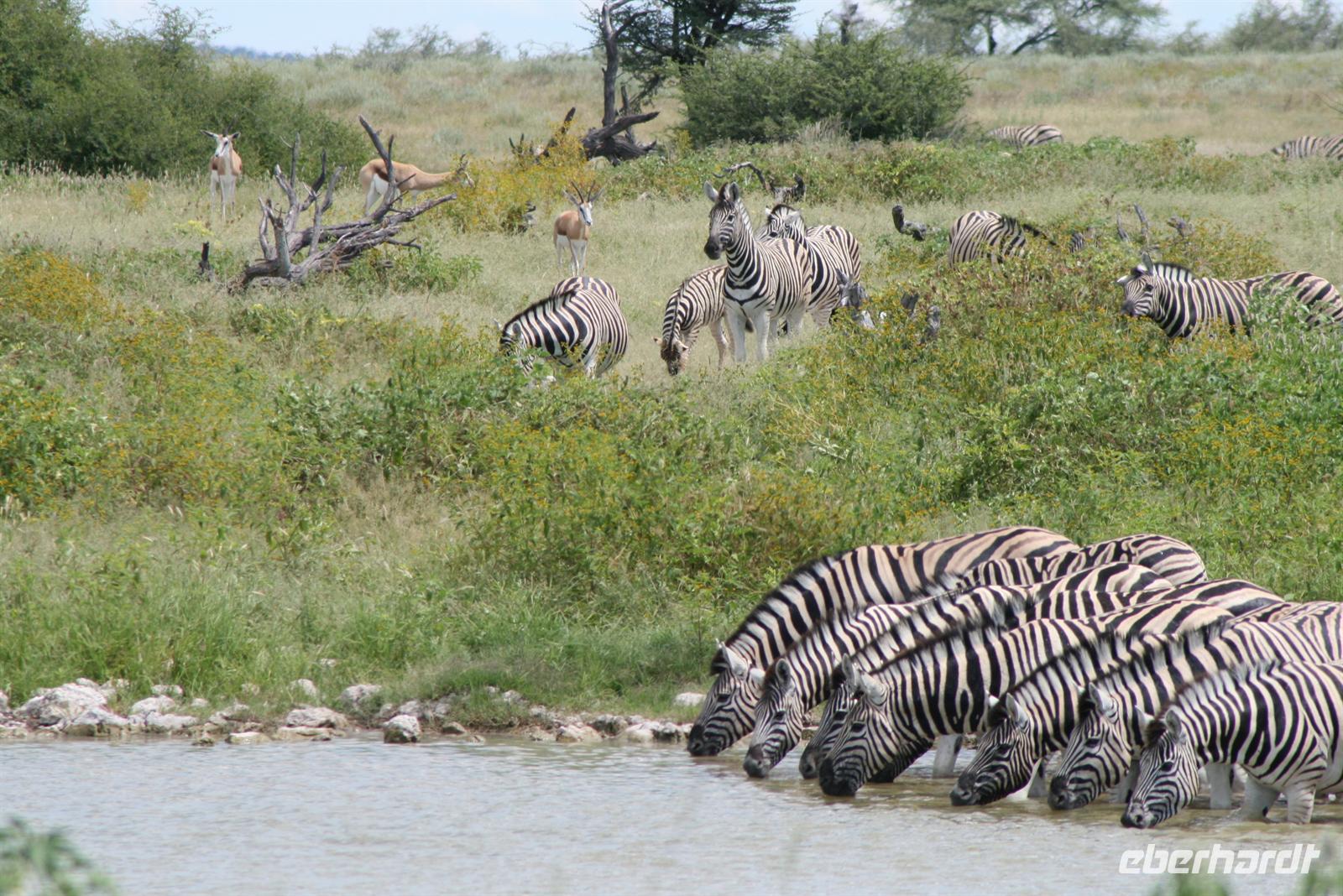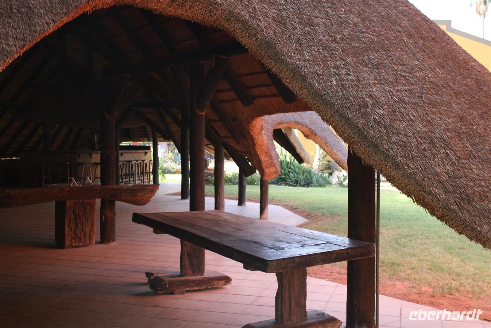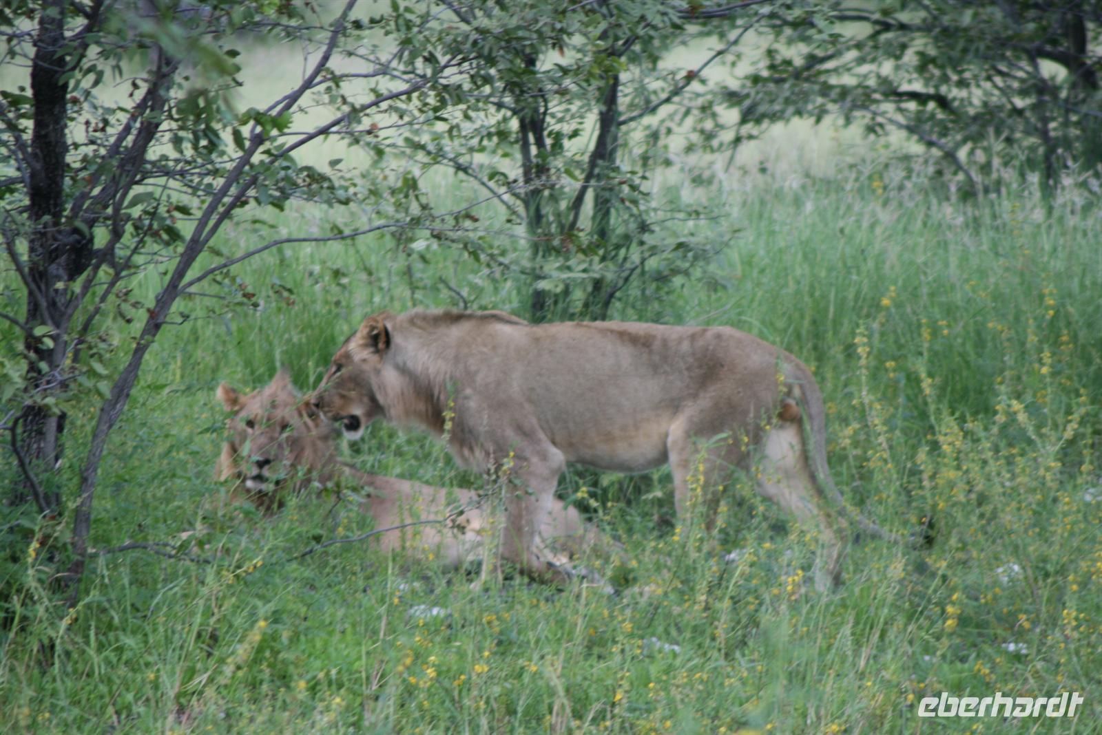 Vor Sonnenaufgang brachen wir auf um auf die Pirsch zu gehen. Der Etosha Nationalpark öffnet uns seine Pforten um sieben Uhr morgens. Schon nach wenigen Kilometern entdecken wir schöne Vögel wie Sekretäre und Oryxantilopen neben unserer Fahrbahn. Dann schrie es auf „Löwen! Das sind doch Löwen!" fünf prachtvolle Löwen stolzieren direkt auf uns zu um sich vor unserer Nase niederließen und anschließend die Straße querten. Sie streiften weiter Richtung Horizont als sie plötzlich kehrt machten um sich wieder direkt vor dem Reisebus zu platzieren. Eine kleine Schlammpfütze diente als kühle Erfrischung bei der Hitze. Ein spektakuläres Erlebnis, das bis dahin eines der Höhepunkte darbot. Es dauerte nicht allzulange als uns auch noch ein Spitzmaulnashorn über den Weg lief. Nach den aufregenden Begegnungen ruhten wir uns zur Mittagszeit in der Lodge, an die ein Wasserloch grenzt, aus. Am Wasserloch ging es quirlig her - Zebras über Zebras die sich am Wasser tummelten. Auch unsere Weiterfahrt bot einiges: Zebras, Zebras, Zebras, Zebras, Zebras, Zebras, Gnu Zebras, Zebras, Zebras, Zebras, Zebras, Zebras, Springbok, Zebras, Zebras, Zebras, Zebras, Zebras, Zebras ... Als wir am frühen Abend den Park Richtung Toshari Lodge verlassen, störten wir ein paar Giraffen beim Abendessen. Unser Abendessen fand an diesem Tag im Garten der Lodge als Grillabend statt.