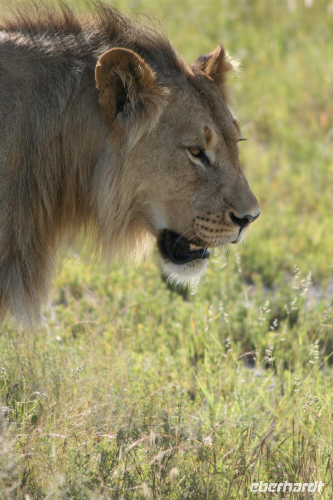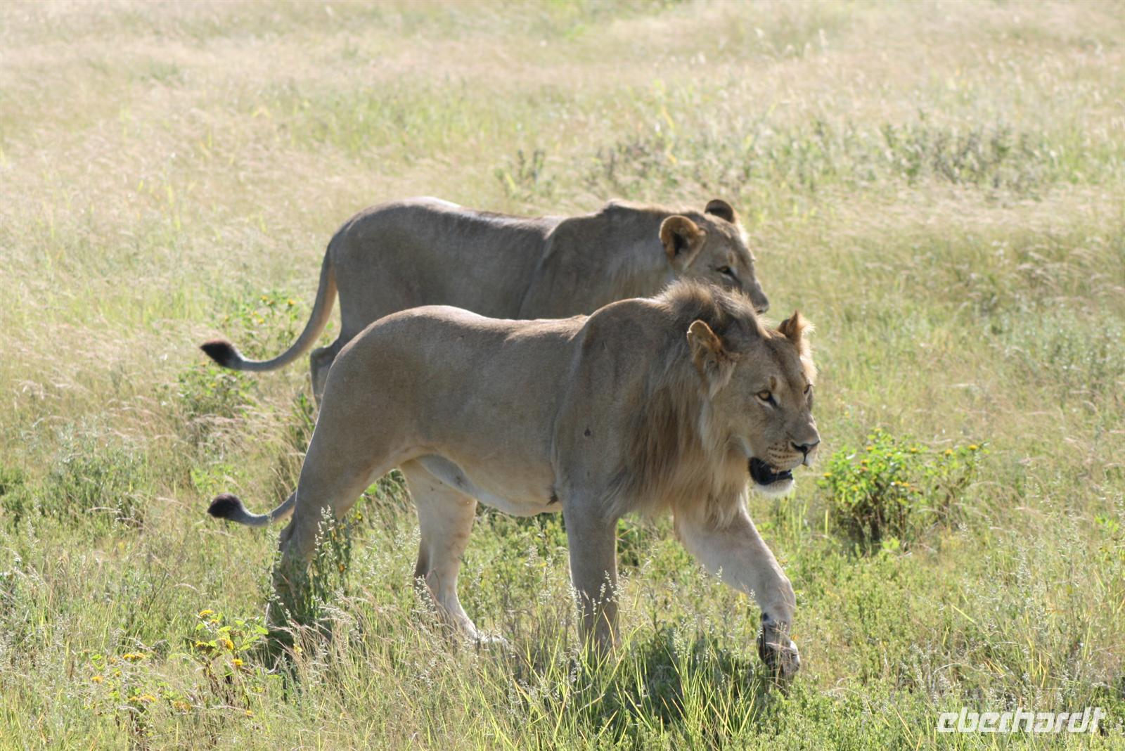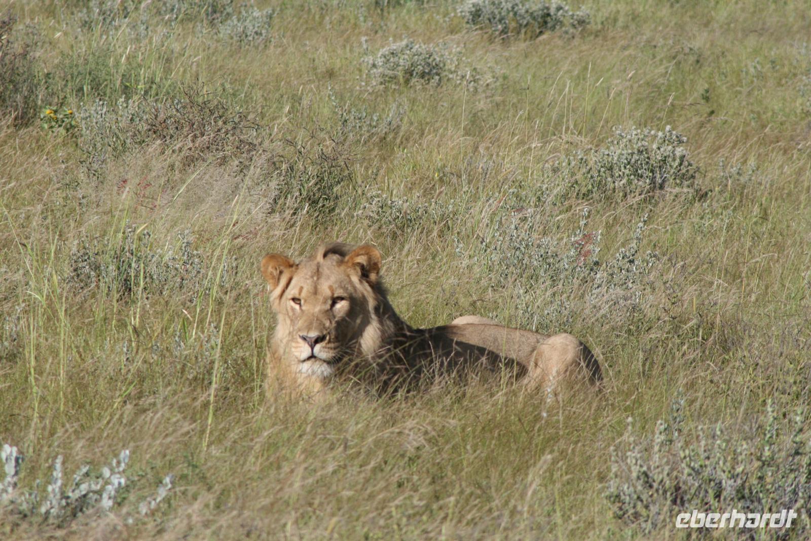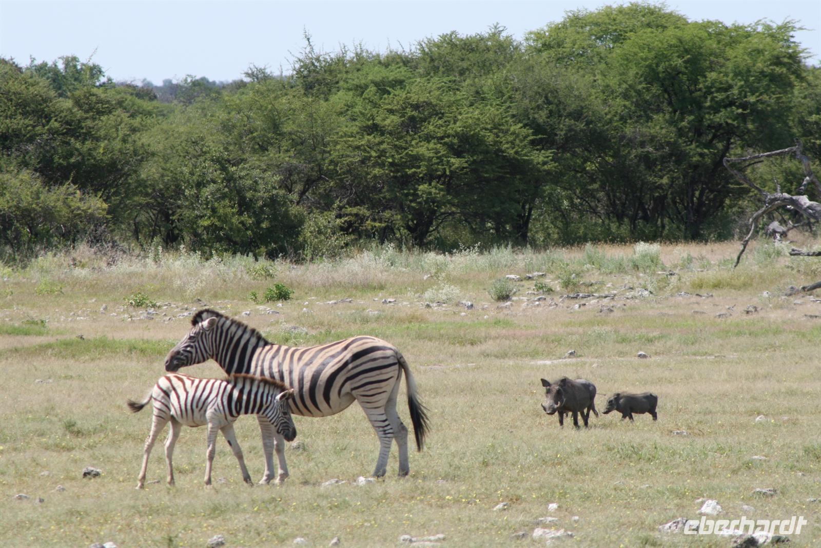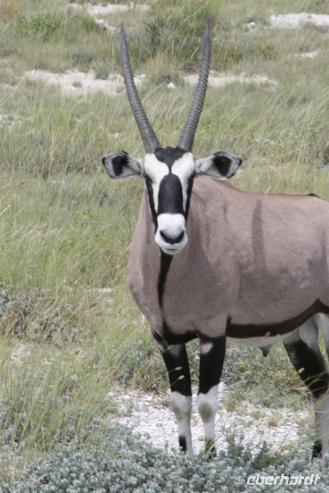 Vor Sonnenaufgang brachen wir auf um auf die Pirsch zu gehen. Der Etosha Nationalpark öffnet uns seine Pforten um sieben Uhr morgens. Schon nach wenigen Kilometern entdecken wir schöne Vögel wie Sekretäre und Oryxantilopen neben unserer Fahrbahn. Dann schrie es auf „Löwen! Das sind doch Löwen!" fünf prachtvolle Löwen stolzieren direkt auf uns zu um sich vor unserer Nase niederließen und anschließend die Straße querten. Sie streiften weiter Richtung Horizont als sie plötzlich kehrt machten um sich wieder direkt vor dem Reisebus zu platzieren. Eine kleine Schlammpfütze diente als kühle Erfrischung bei der Hitze. Ein spektakuläres Erlebnis, das bis dahin eines der Höhepunkte darbot. Es dauerte nicht allzulange als uns auch noch ein Spitzmaulnashorn über den Weg lief. Nach den aufregenden Begegnungen ruhten wir uns zur Mittagszeit in der Lodge, an die ein Wasserloch grenzt, aus. Am Wasserloch ging es quirlig her - Zebras über Zebras die sich am Wasser tummelten. Auch unsere Weiterfahrt bot einiges: Zebras, Zebras, Zebras, Zebras, Zebras, Zebras, Gnu Zebras, Zebras, Zebras, Zebras, Zebras, Zebras, Springbok, Zebras, Zebras, Zebras, Zebras, Zebras, Zebras ... Als wir am frühen Abend den Park Richtung Toshari Lodge verlassen, störten wir ein paar Giraffen beim Abendessen. Unser Abendessen fand an diesem Tag im Garten der Lodge als Grillabend statt.