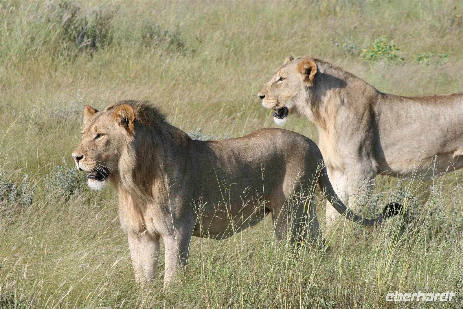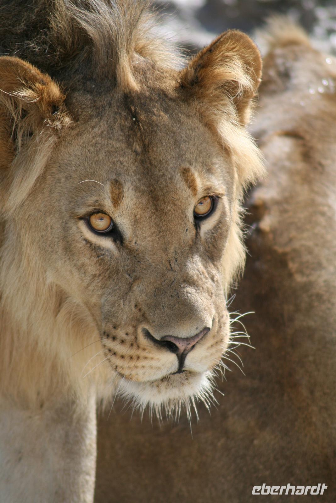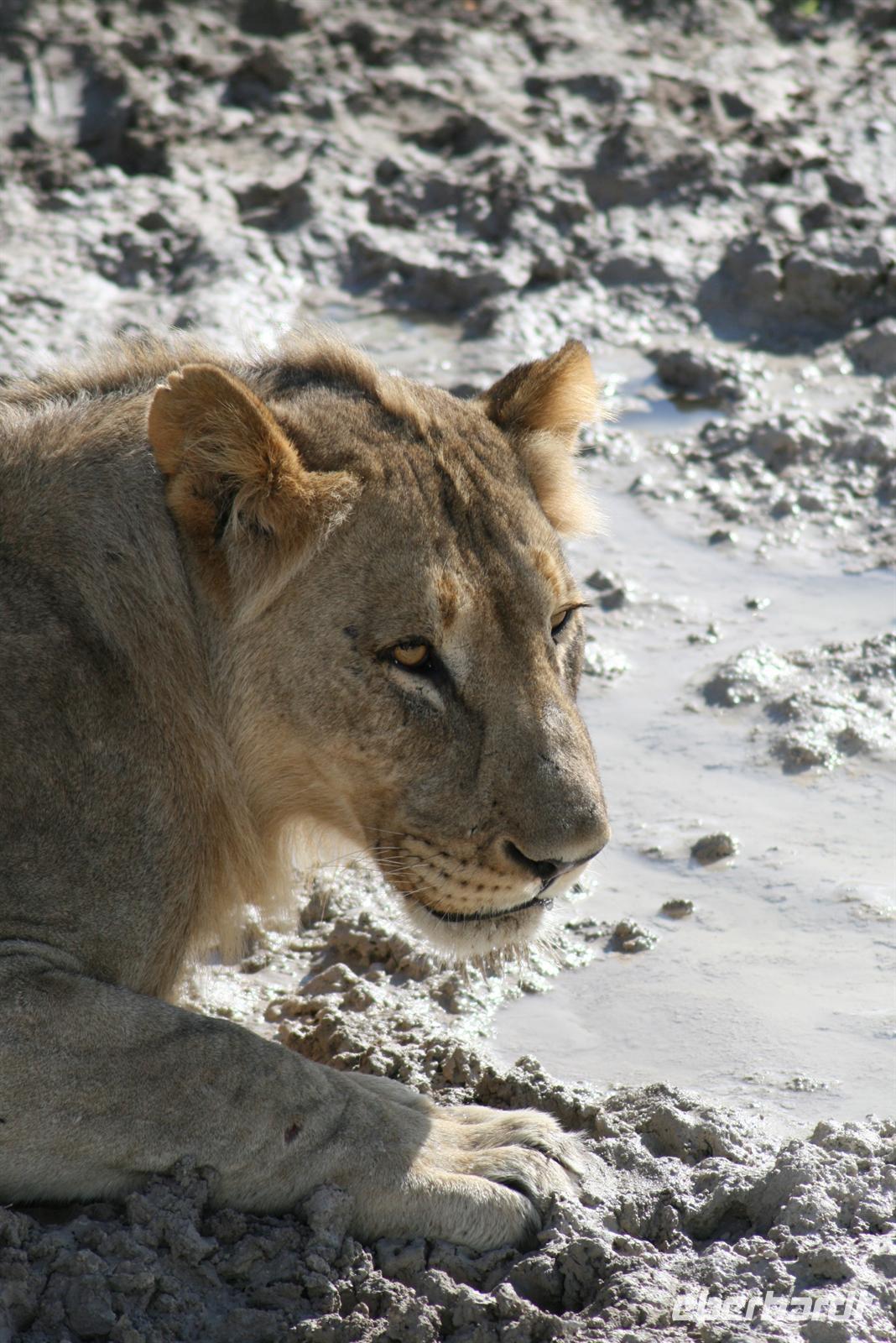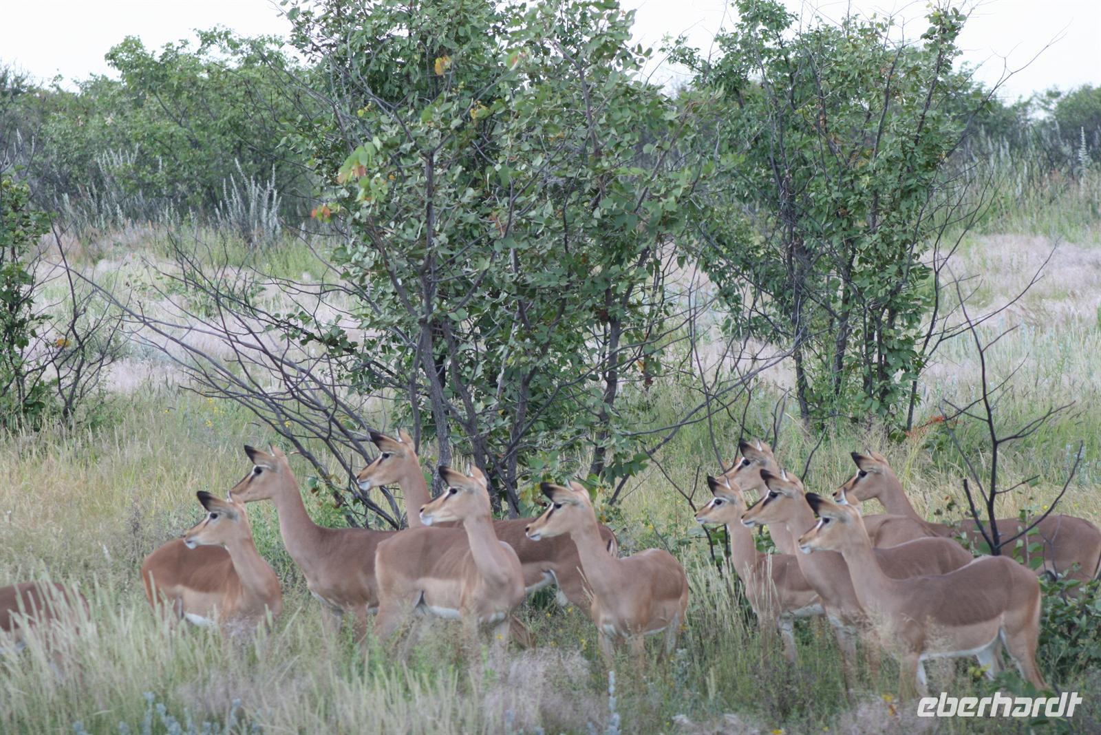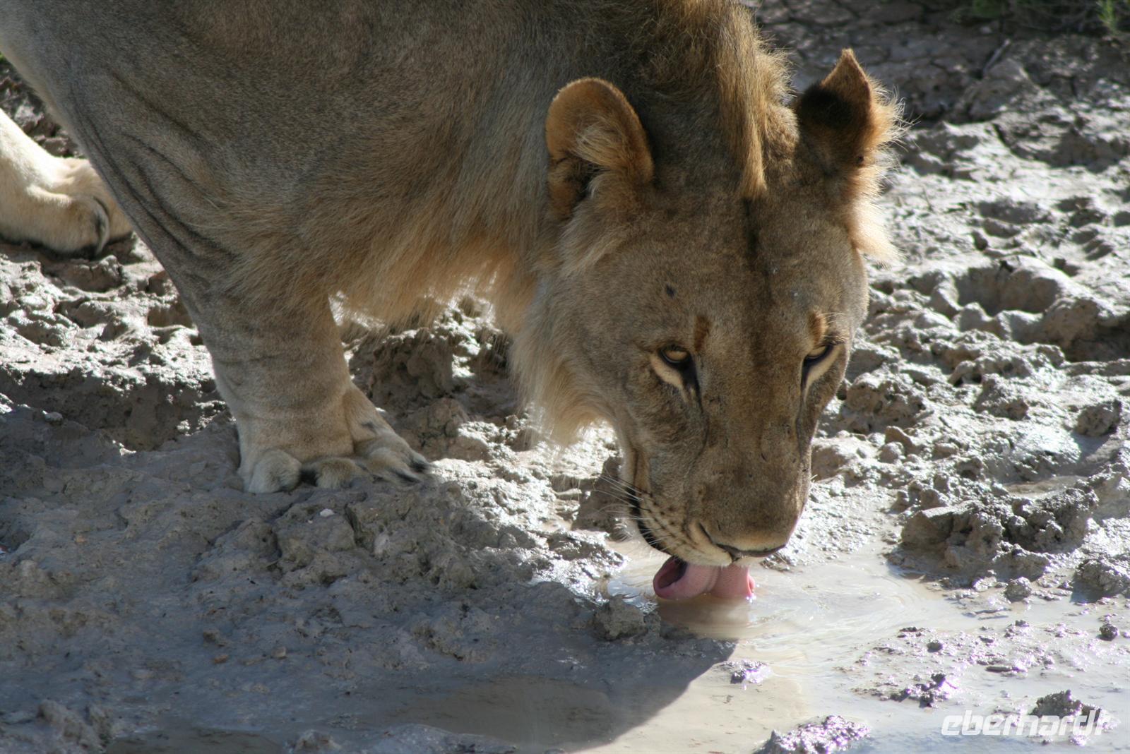 Vor Sonnenaufgang brachen wir auf um auf die Pirsch zu gehen. Der Etosha Nationalpark öffnet uns seine Pforten um sieben Uhr morgens. Schon nach wenigen Kilometern entdecken wir schöne Vögel wie Sekretäre und Oryxantilopen neben unserer Fahrbahn. Dann schrie es auf „Löwen! Das sind doch Löwen!" fünf prachtvolle Löwen stolzieren direkt auf uns zu um sich vor unserer Nase niederließen und anschließend die Straße querten. Sie streiften weiter Richtung Horizont als sie plötzlich kehrt machten um sich wieder direkt vor dem Reisebus zu platzieren. Eine kleine Schlammpfütze diente als kühle Erfrischung bei der Hitze. Ein spektakuläres Erlebnis, das bis dahin eines der Höhepunkte darbot. Es dauerte nicht allzulange als uns auch noch ein Spitzmaulnashorn über den Weg lief. Nach den aufregenden Begegnungen ruhten wir uns zur Mittagszeit in der Lodge, an die ein Wasserloch grenzt, aus. Am Wasserloch ging es quirlig her - Zebras über Zebras die sich am Wasser tummelten. Auch unsere Weiterfahrt bot einiges: Zebras, Zebras, Zebras, Zebras, Zebras, Zebras, Gnu Zebras, Zebras, Zebras, Zebras, Zebras, Zebras, Springbok, Zebras, Zebras, Zebras, Zebras, Zebras, Zebras ... Als wir am frühen Abend den Park Richtung Toshari Lodge verlassen, störten wir ein paar Giraffen beim Abendessen. Unser Abendessen fand an diesem Tag im Garten der Lodge als Grillabend statt.