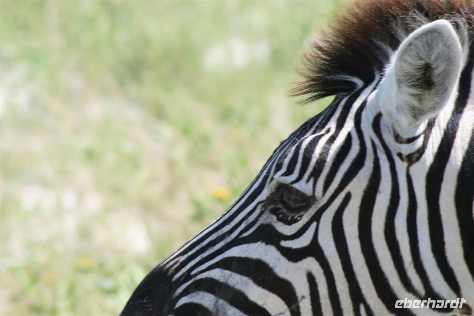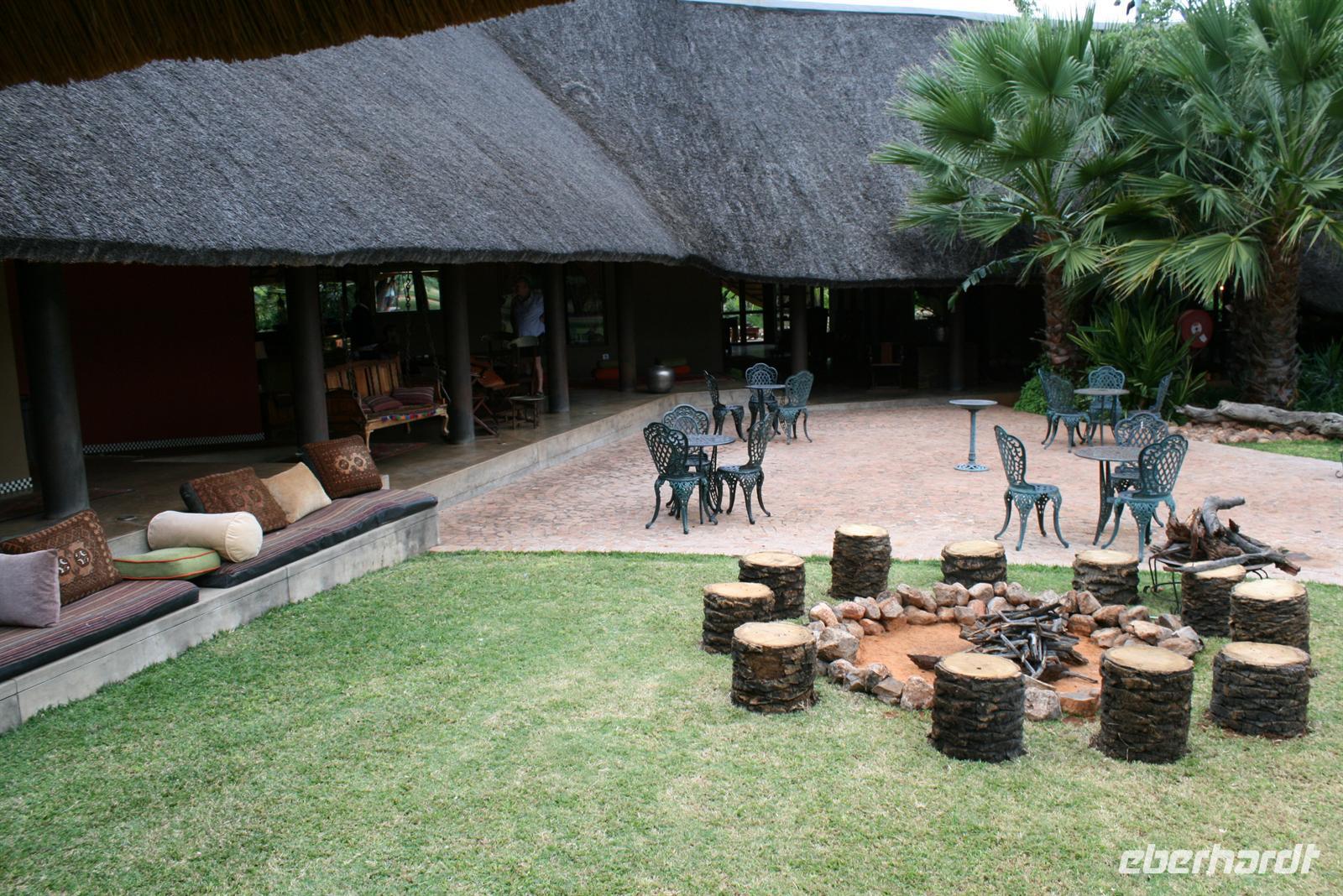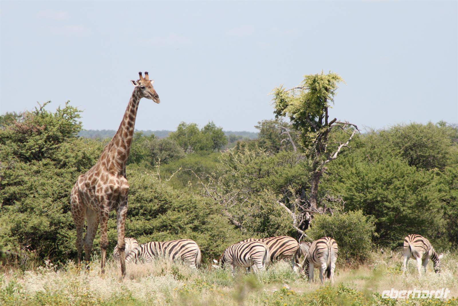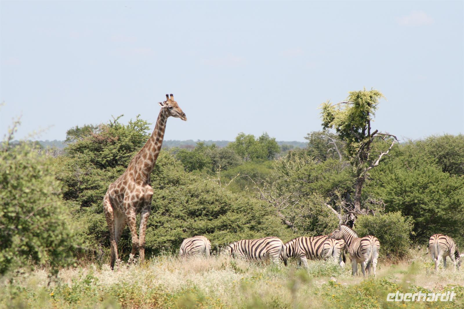 Vor Sonnenaufgang brachen wir auf um auf die Pirsch zu gehen. Der Etosha Nationalpark öffnet uns seine Pforten um sieben Uhr morgens. Schon nach wenigen Kilometern entdecken wir schöne Vögel wie Sekretäre und Oryxantilopen neben unserer Fahrbahn. Dann schrie es auf „Löwen! Das sind doch Löwen!" fünf prachtvolle Löwen stolzieren direkt auf uns zu um sich vor unserer Nase niederließen und anschließend die Straße querten. Sie streiften weiter Richtung Horizont als sie plötzlich kehrt machten um sich wieder direkt vor dem Reisebus zu platzieren. Eine kleine Schlammpfütze diente als kühle Erfrischung bei der Hitze. Ein spektakuläres Erlebnis, das bis dahin eines der Höhepunkte darbot. Es dauerte nicht allzulange als uns auch noch ein Spitzmaulnashorn über den Weg lief. Nach den aufregenden Begegnungen ruhten wir uns zur Mittagszeit in der Lodge, an die ein Wasserloch grenzt, aus. Am Wasserloch ging es quirlig her - Zebras über Zebras die sich am Wasser tummelten. Auch unsere Weiterfahrt bot einiges: Zebras, Zebras, Zebras, Zebras, Zebras, Zebras, Gnu Zebras, Zebras, Zebras, Zebras, Zebras, Zebras, Springbok, Zebras, Zebras, Zebras, Zebras, Zebras, Zebras ... Als wir am frühen Abend den Park Richtung Toshari Lodge verlassen, störten wir ein paar Giraffen beim Abendessen. Unser Abendessen fand an diesem Tag im Garten der Lodge als Grillabend statt.